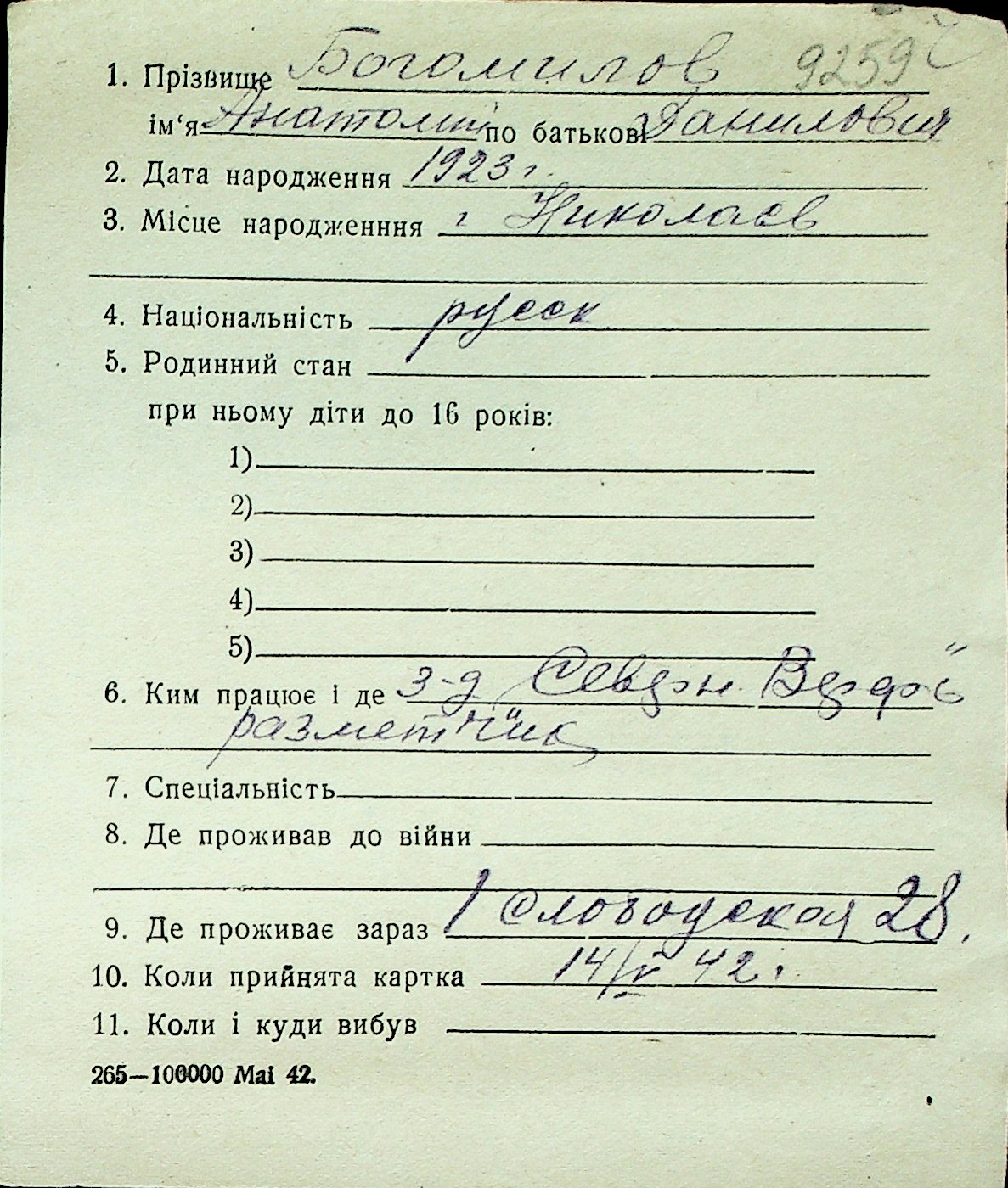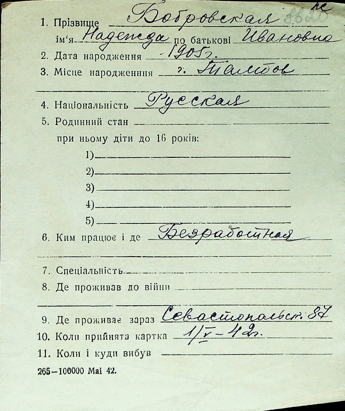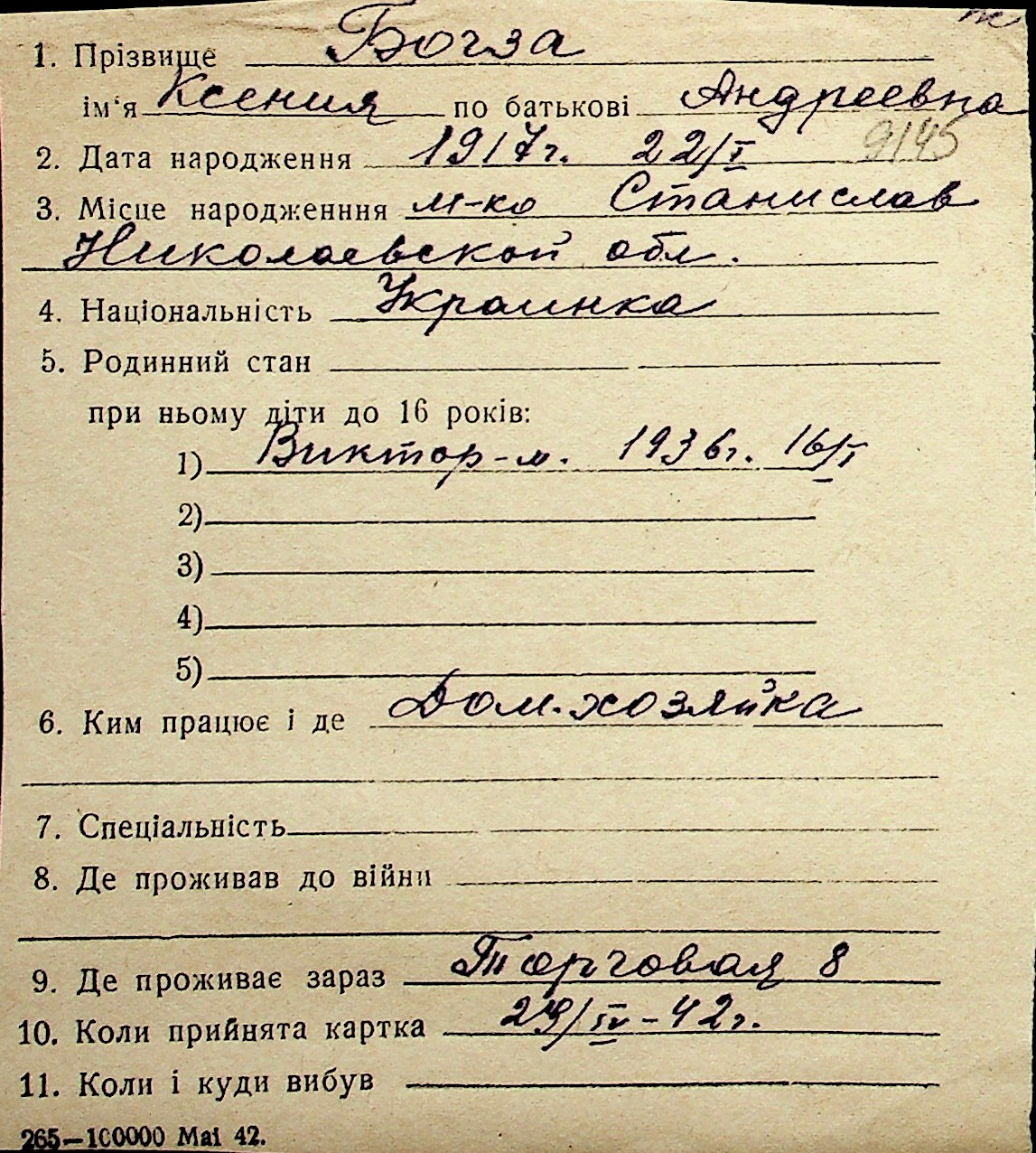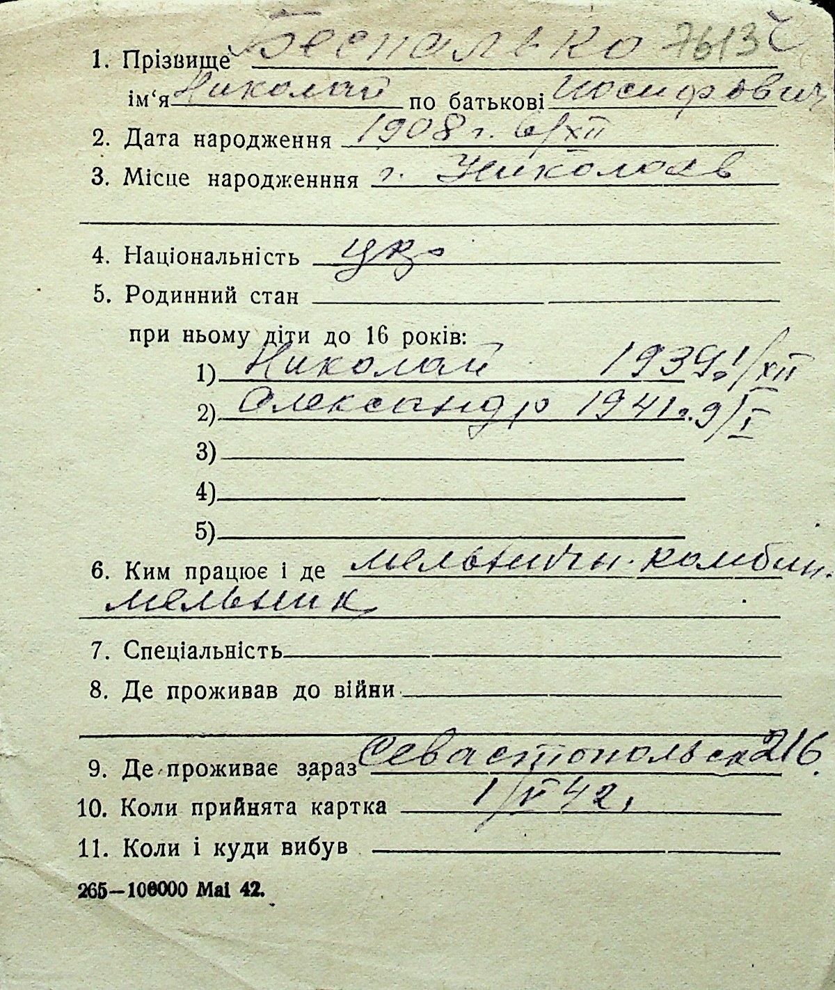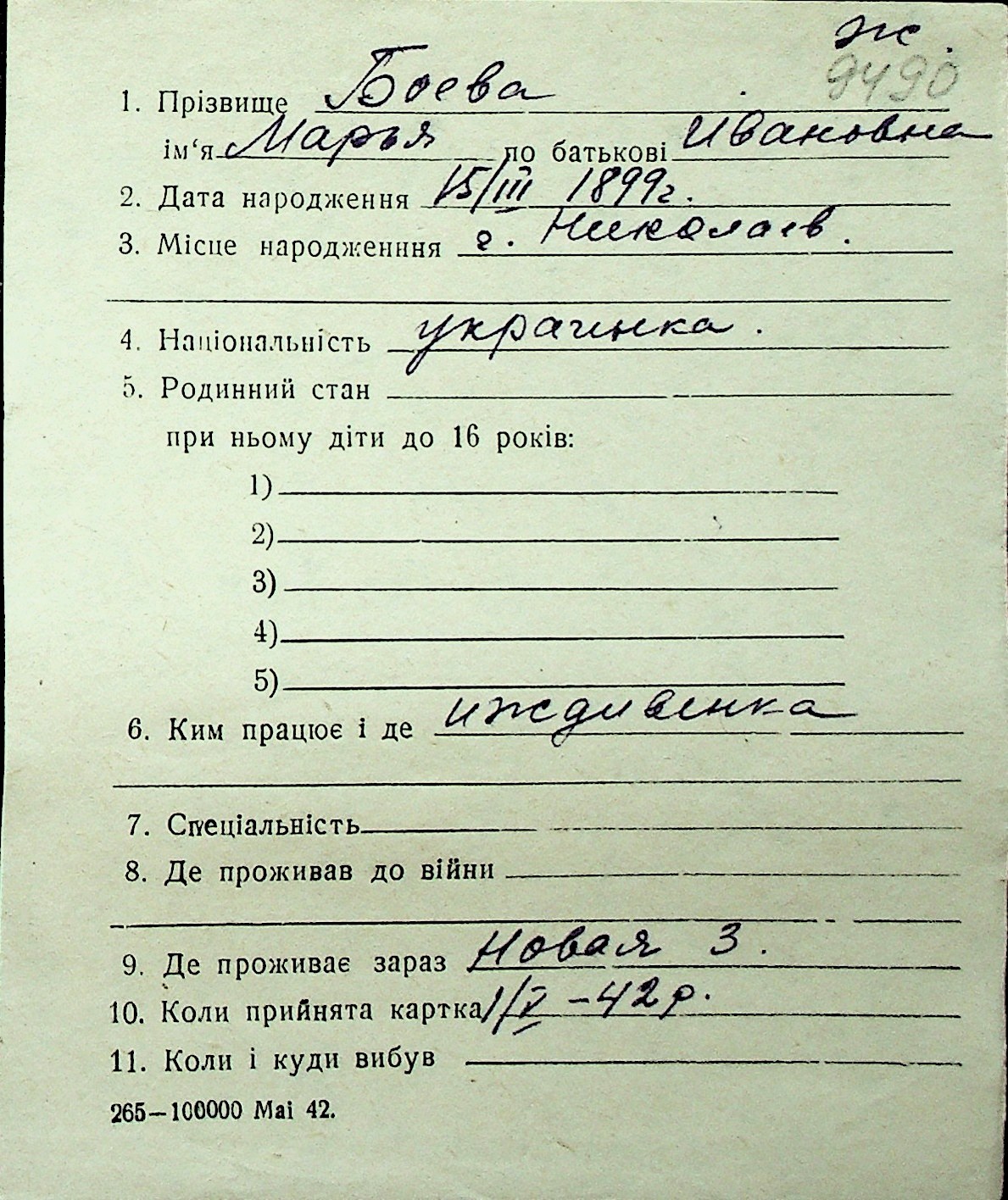 ◦ ◦ Перелік карток на осіб, які мешкали у м. Миколаїв у період окупації 1941–1944 років