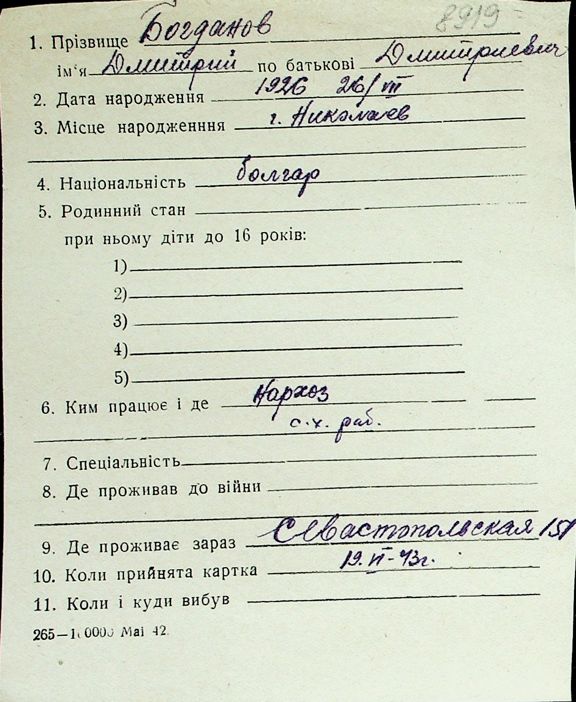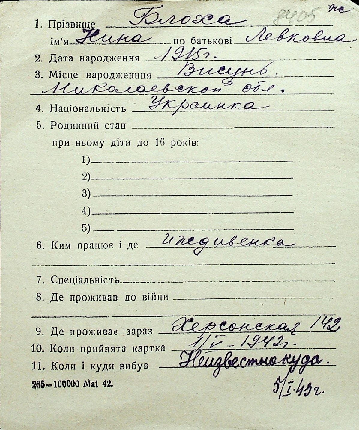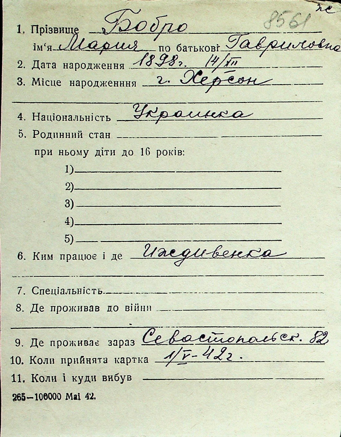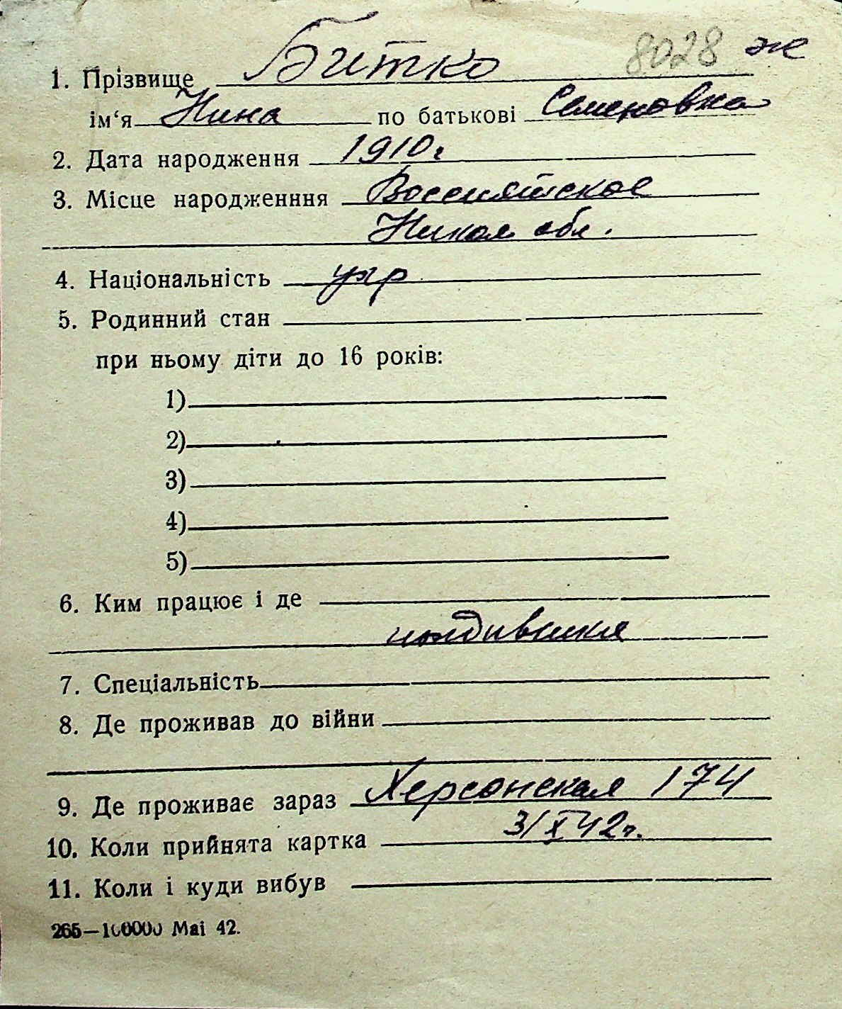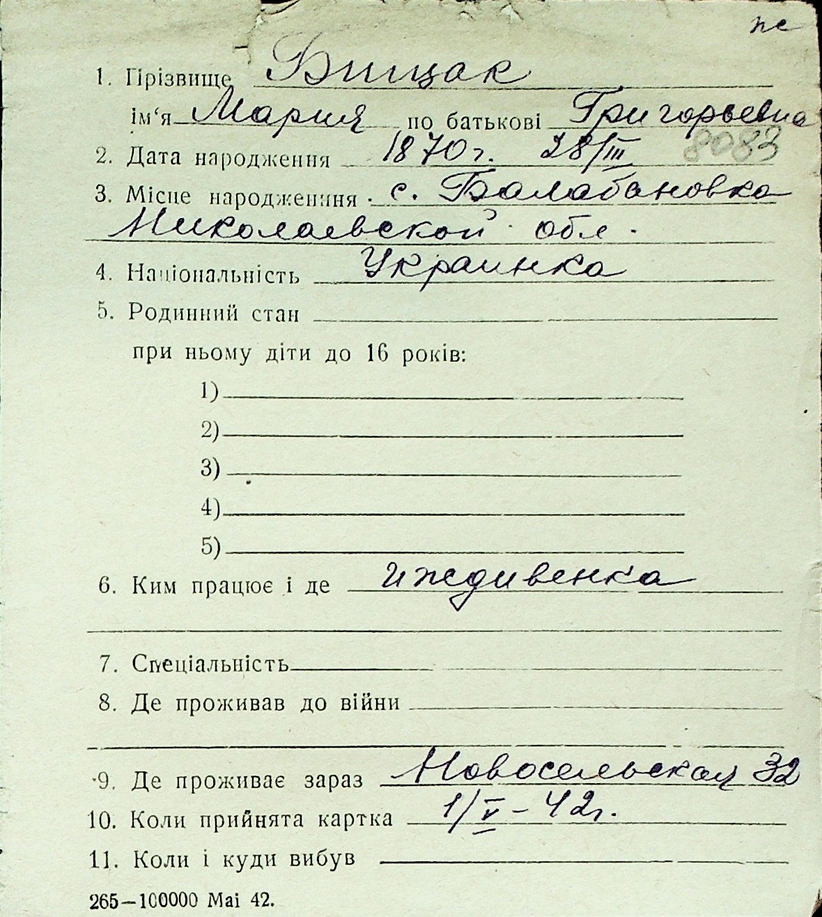 ◦ ◦ Перелік карток на осіб, які мешкали у м. Миколаїв у період окупації 1941–1944 років