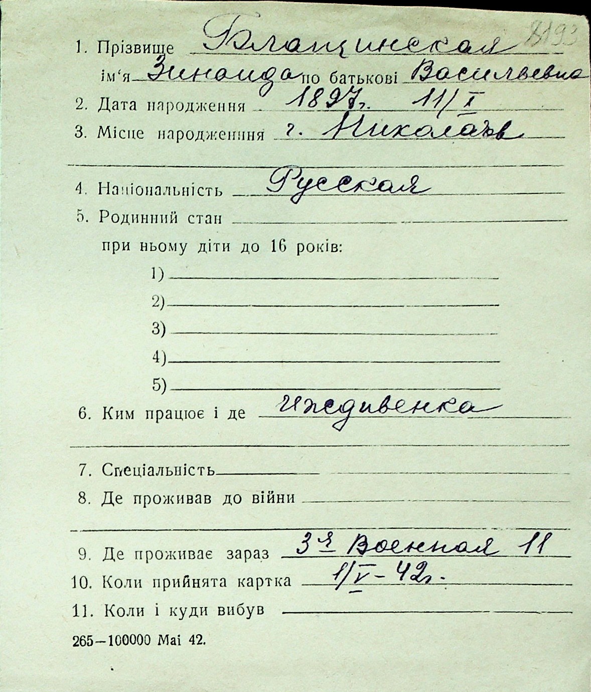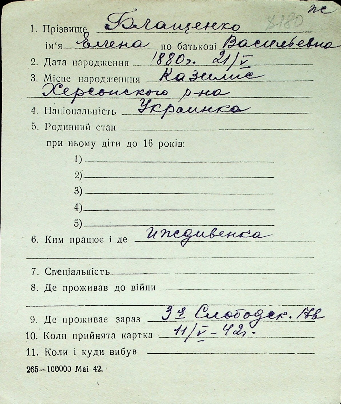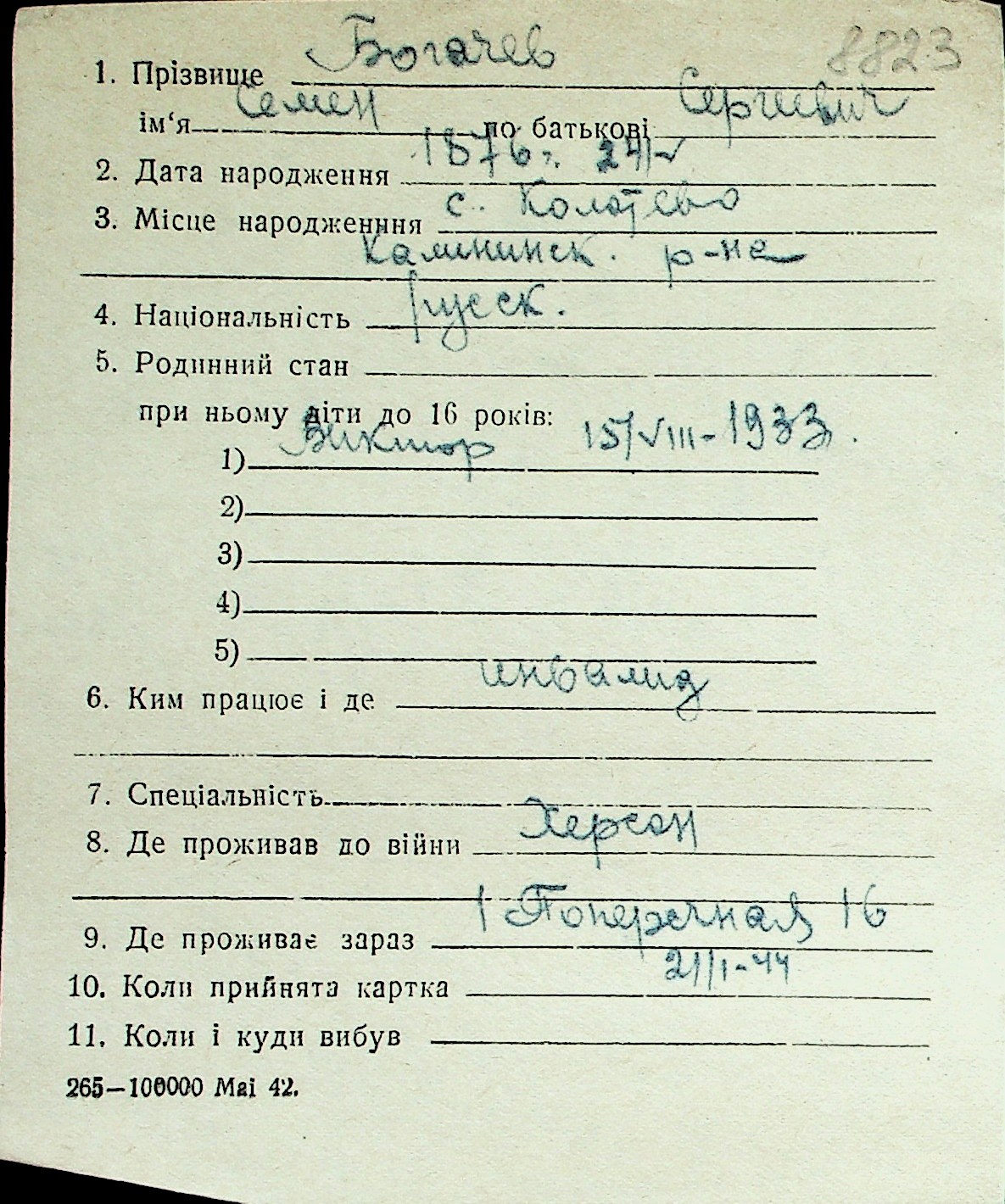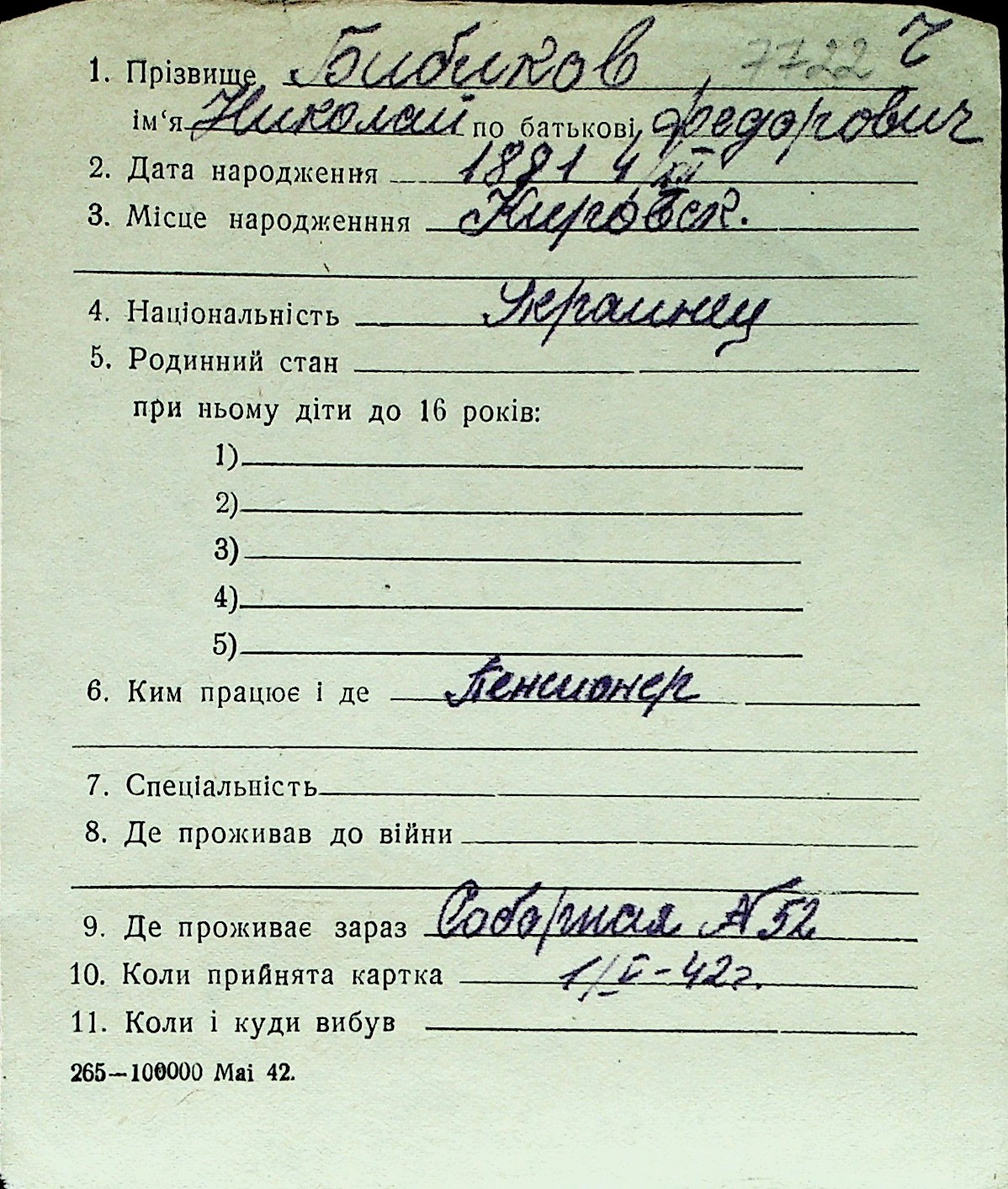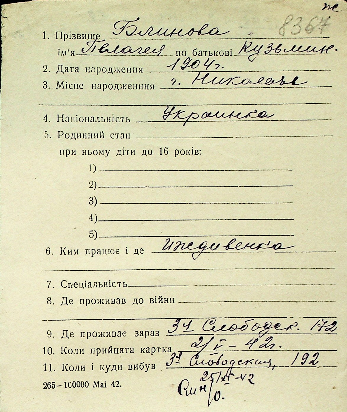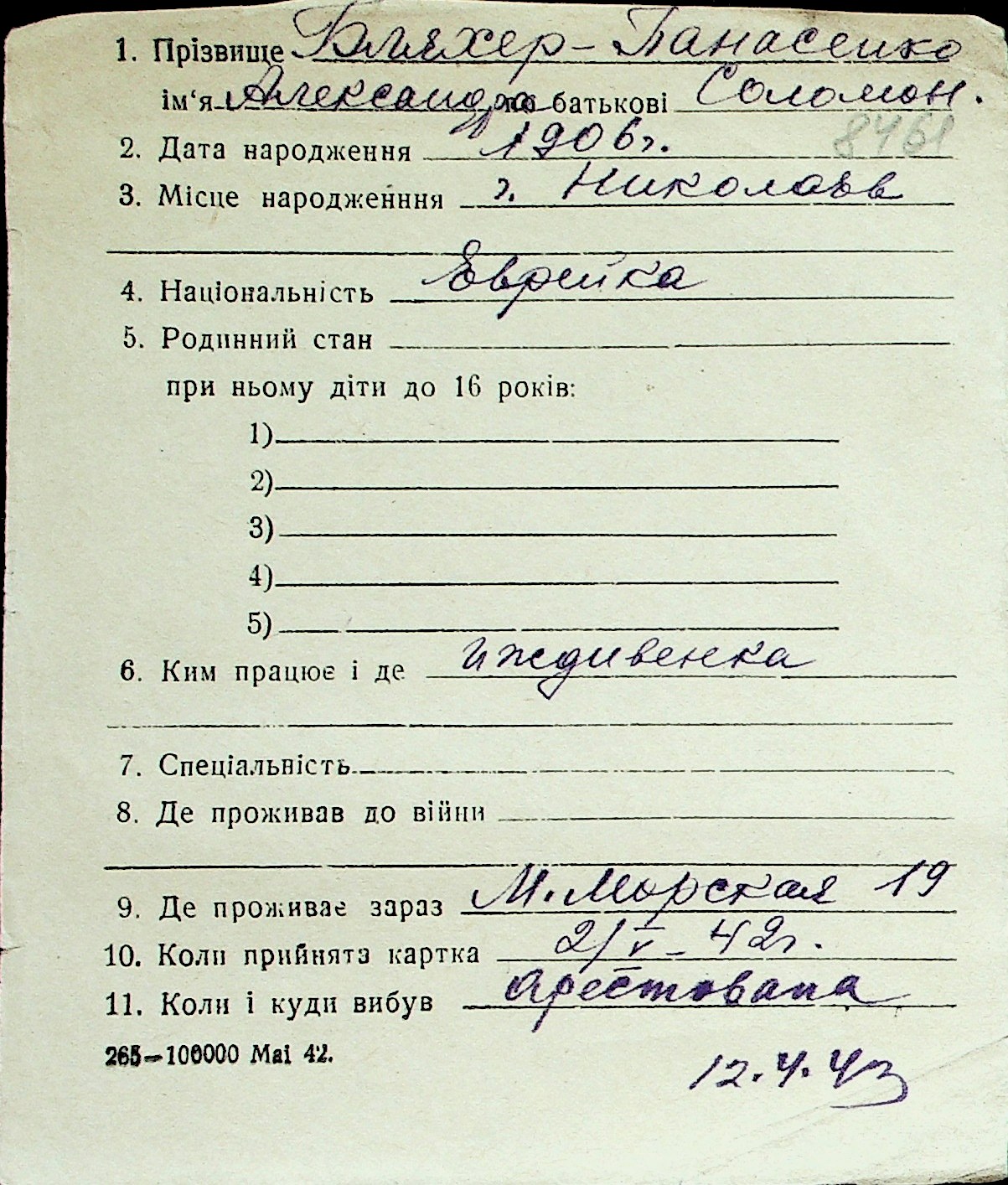 ◦ ◦ Перелік карток на осіб, які мешкали у м. Миколаїв у період окупації 1941–1944 років