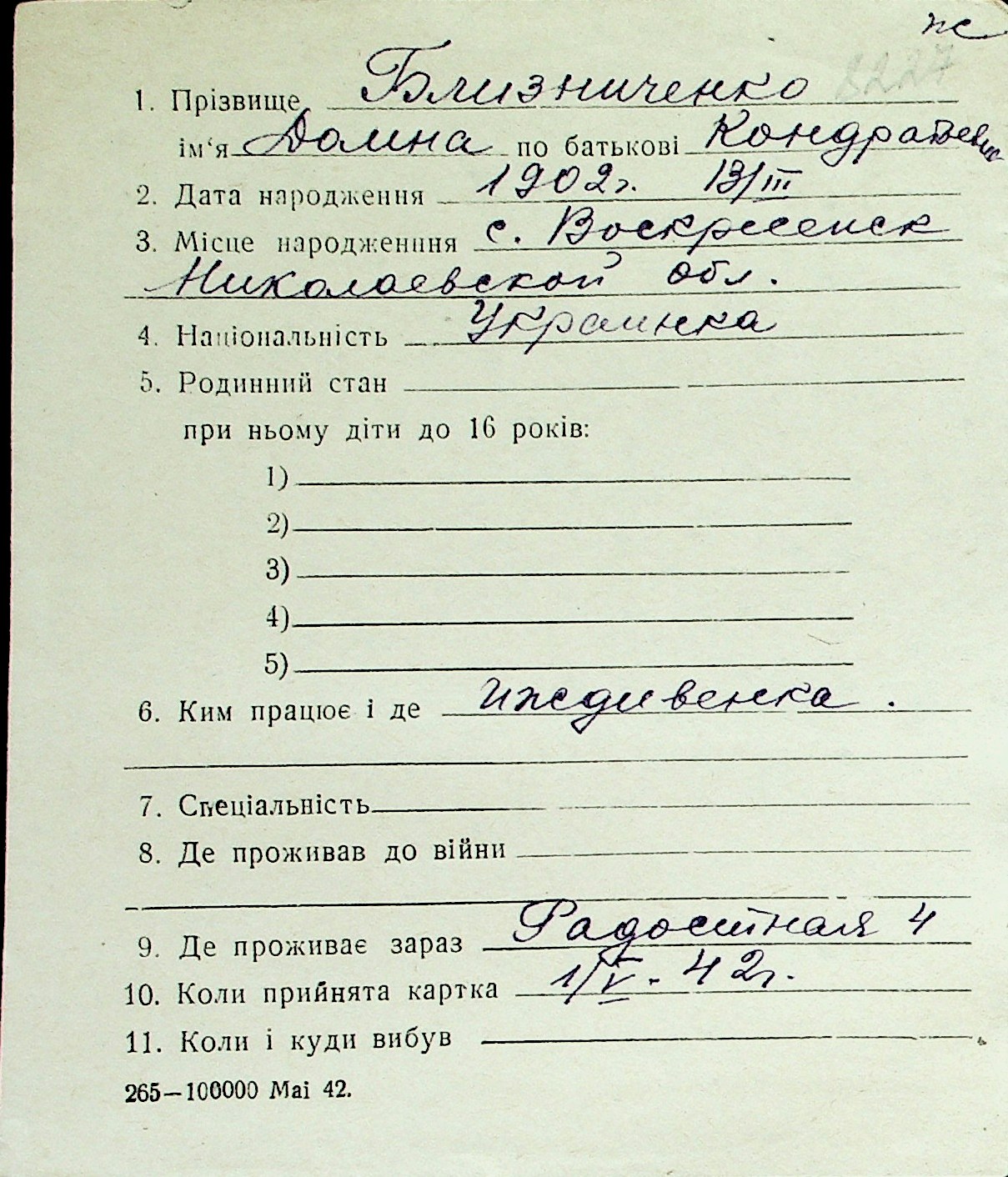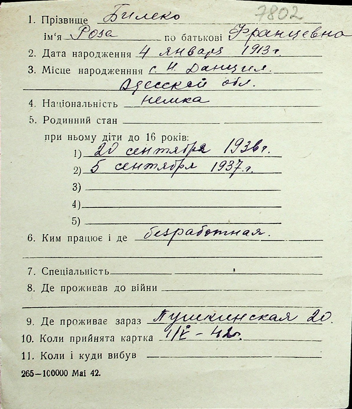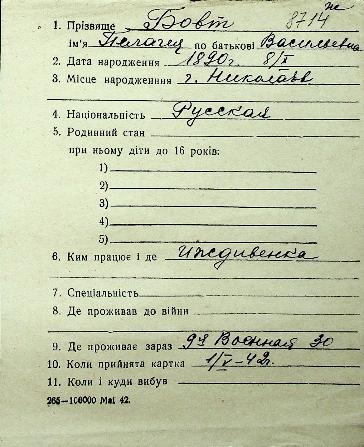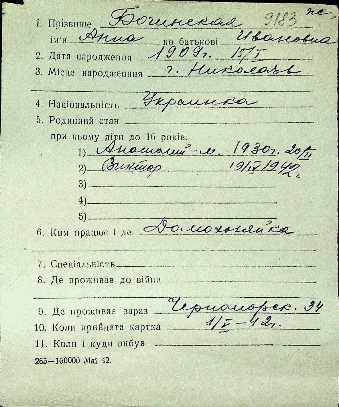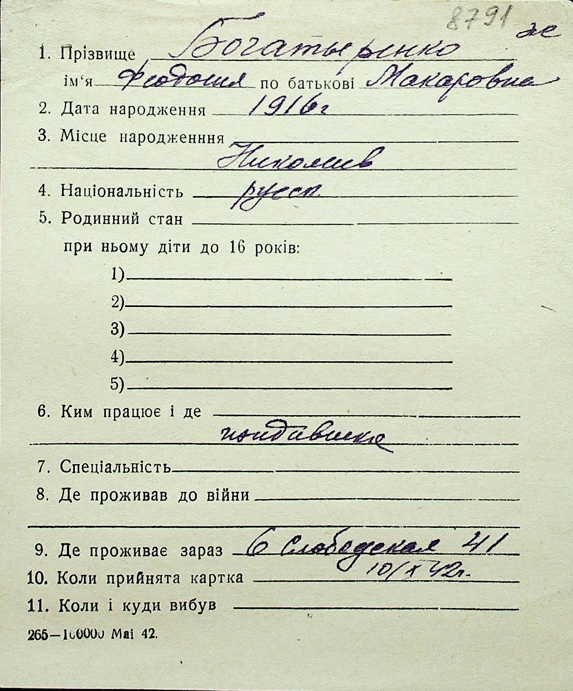 ◦ ◦ Перелік карток на осіб, які мешкали у м. Миколаїв у період окупації 1941–1944 років