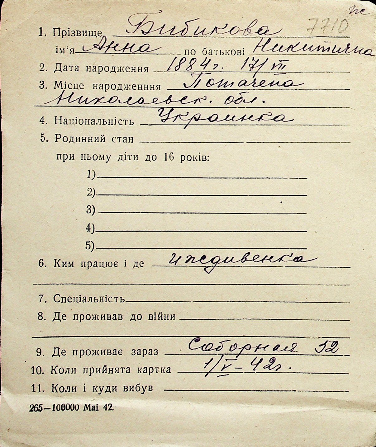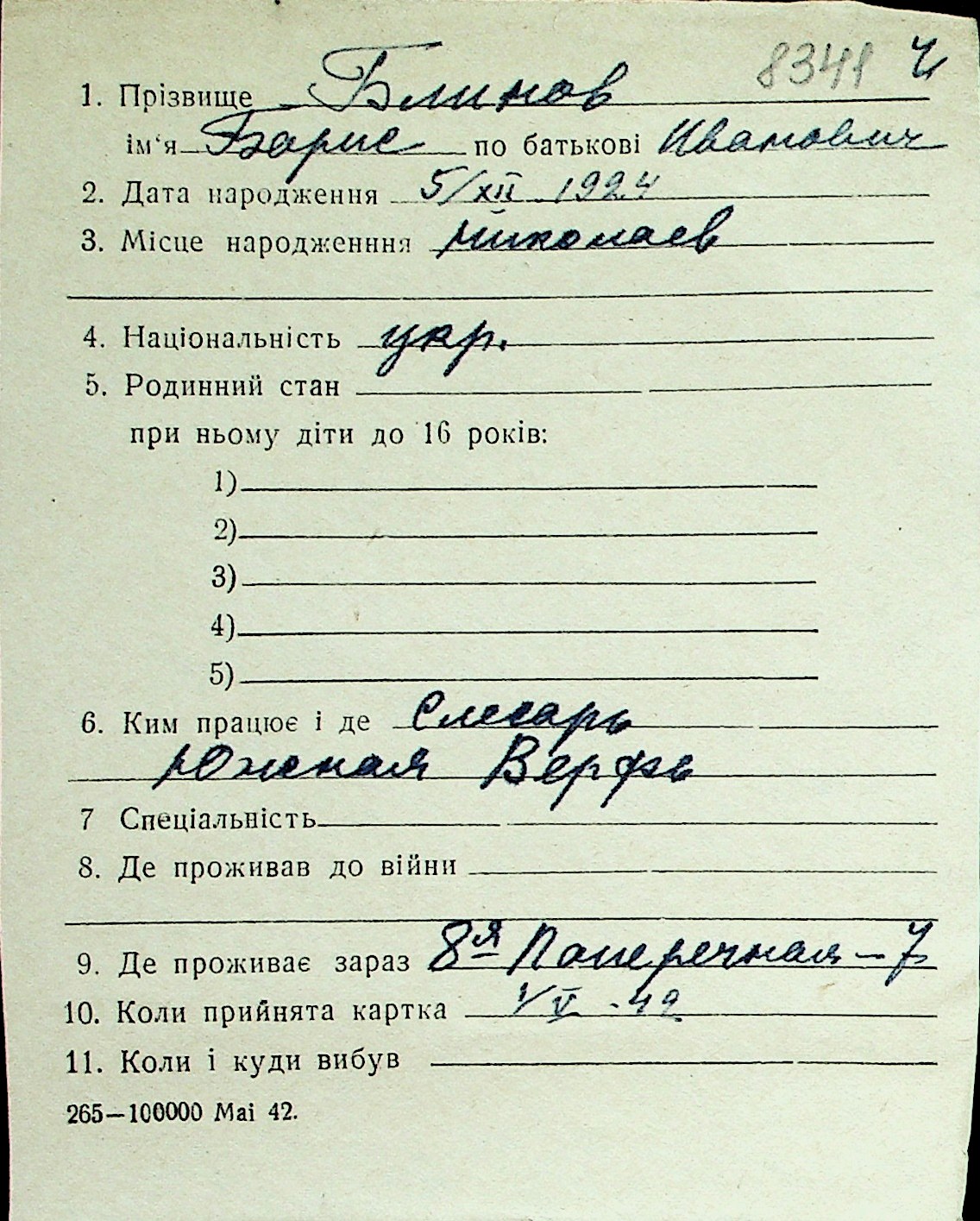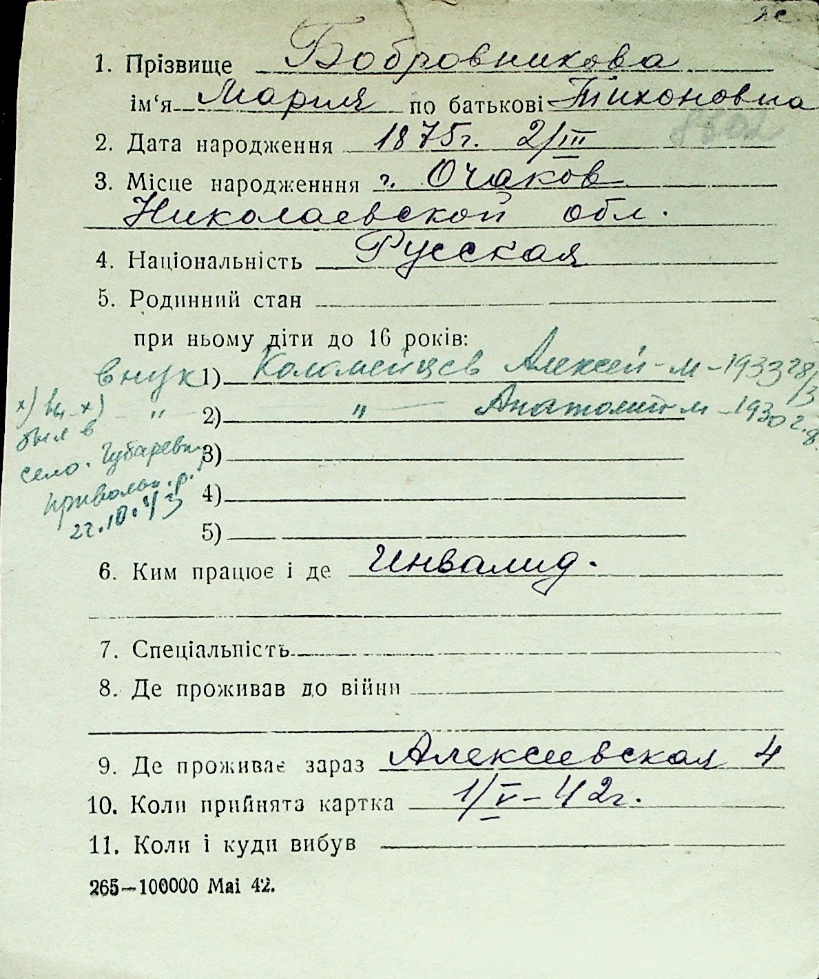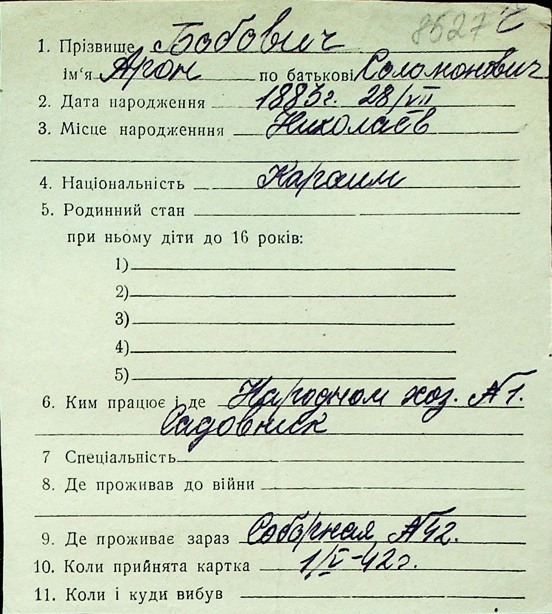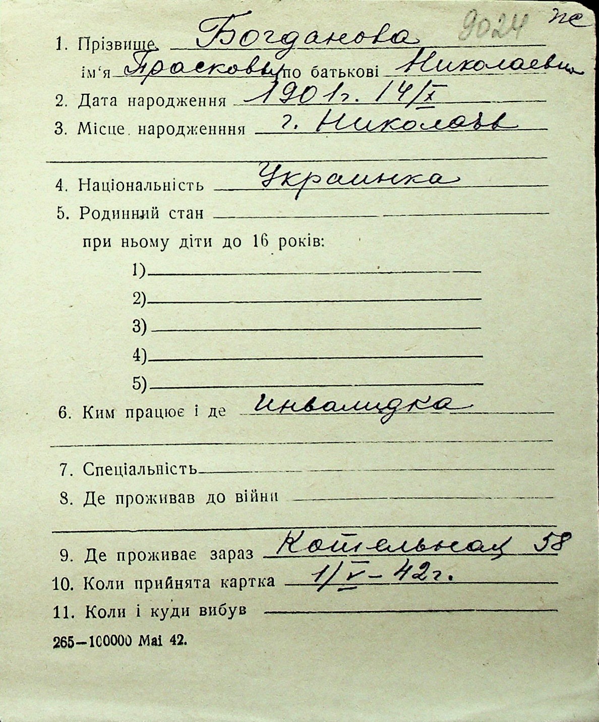 ◦ ◦ Перелік карток на осіб, які мешкали у м. Миколаїв у період окупації 1941–1944 років