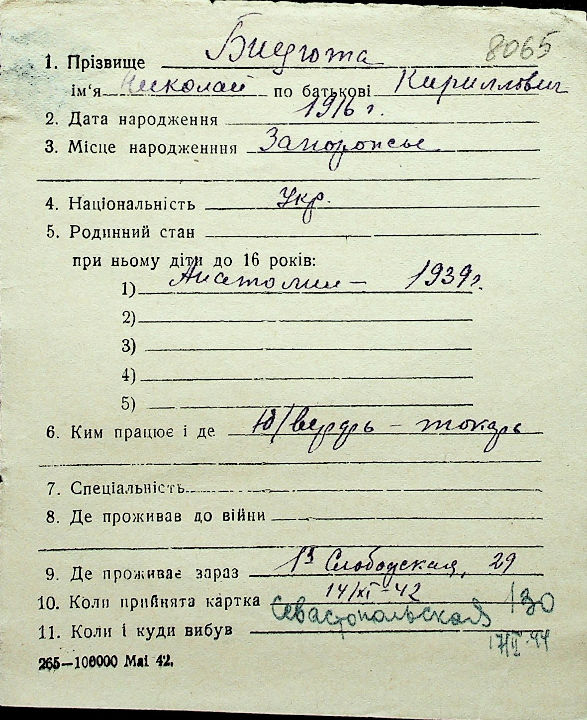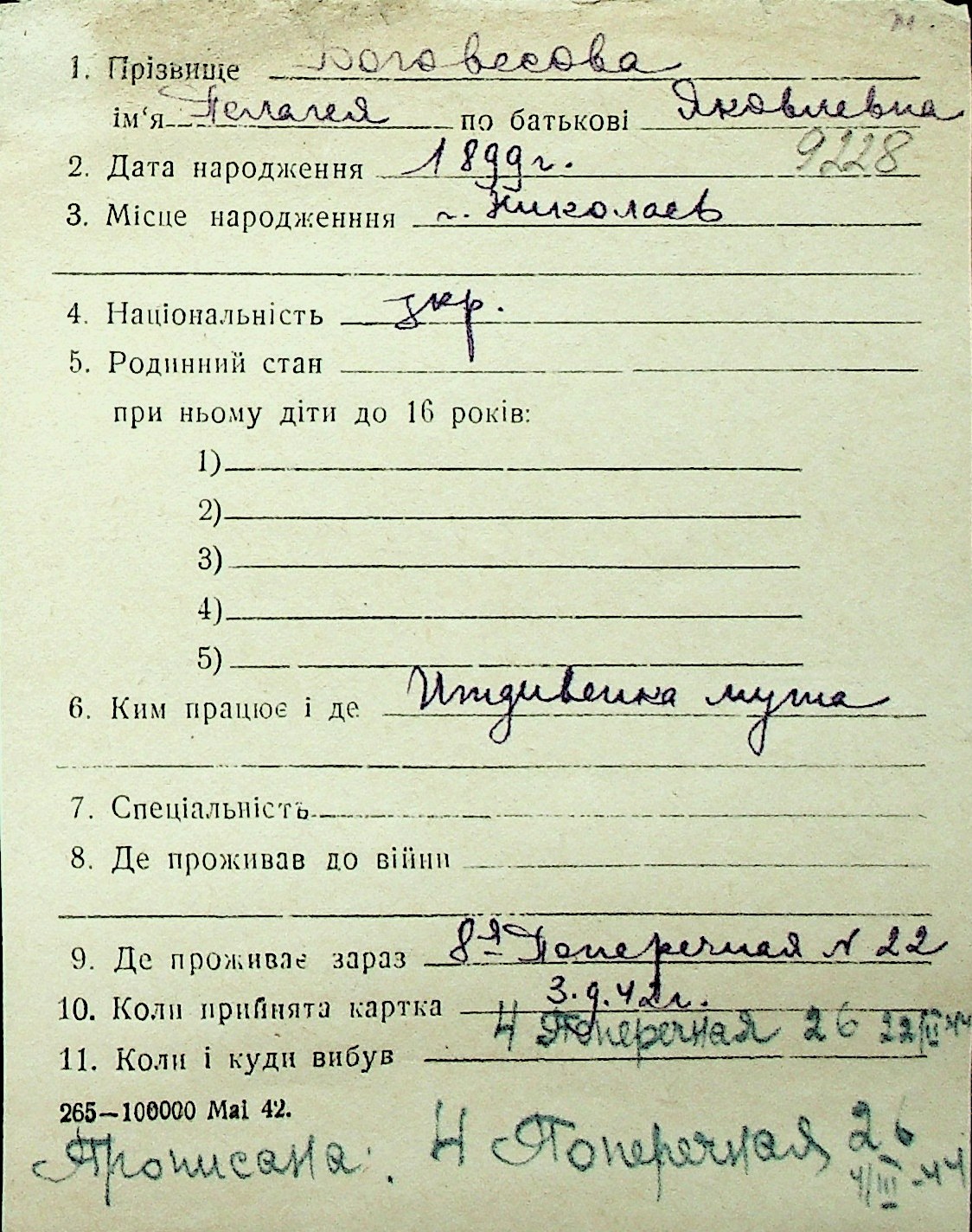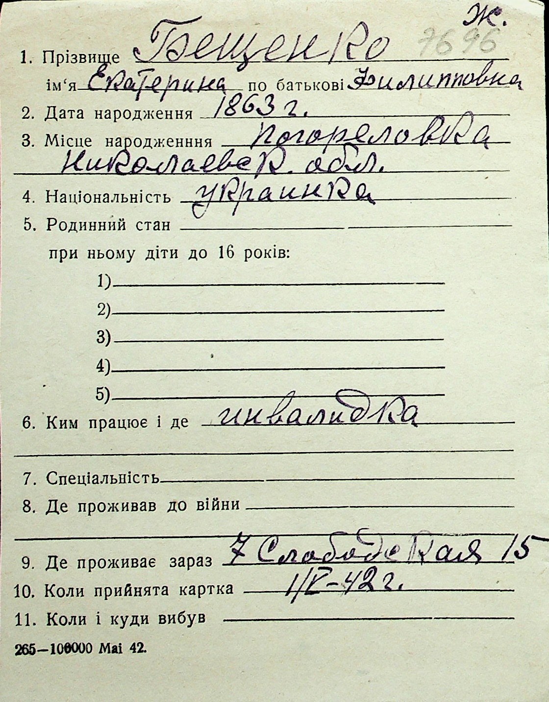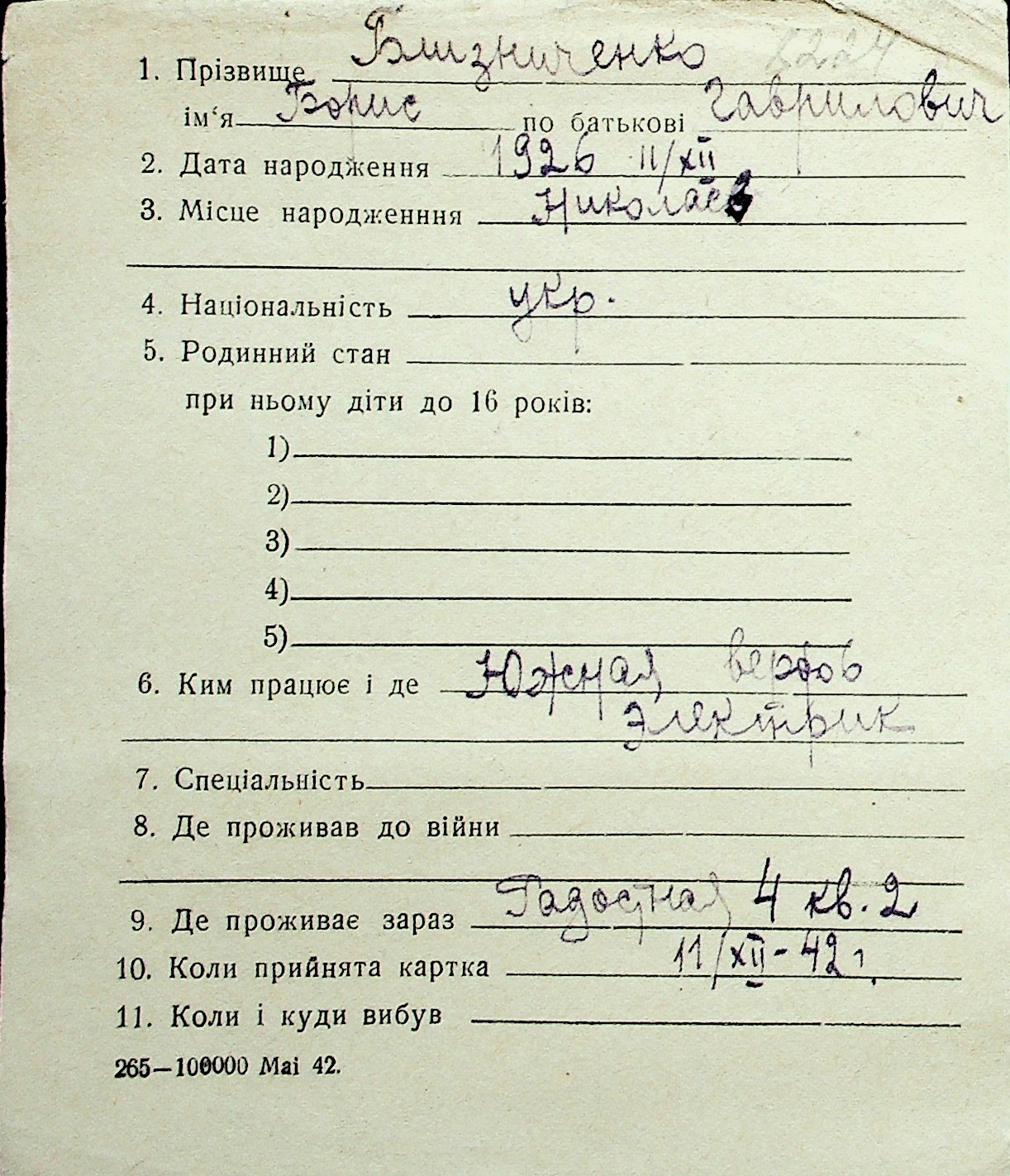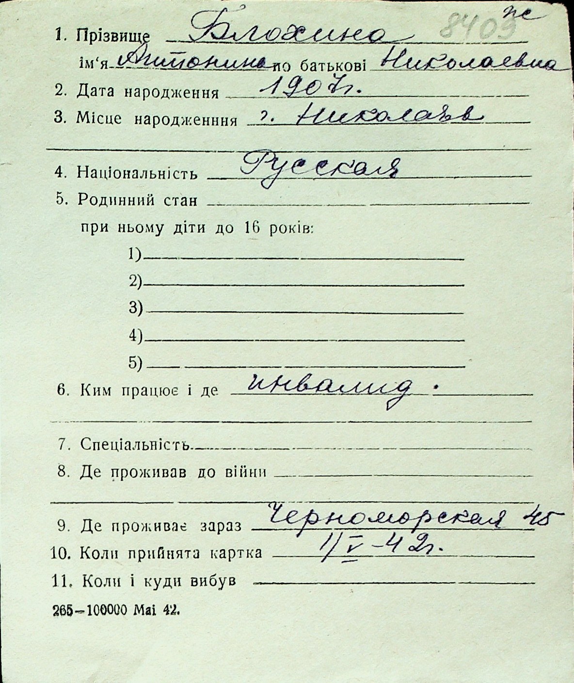 ◦ ◦ Перелік карток на осіб, які мешкали у м. Миколаїв у період окупації 1941–1944 років