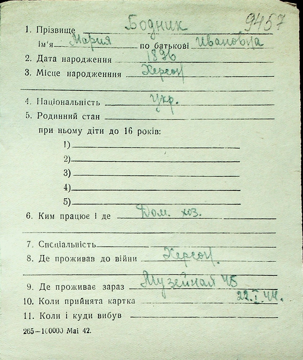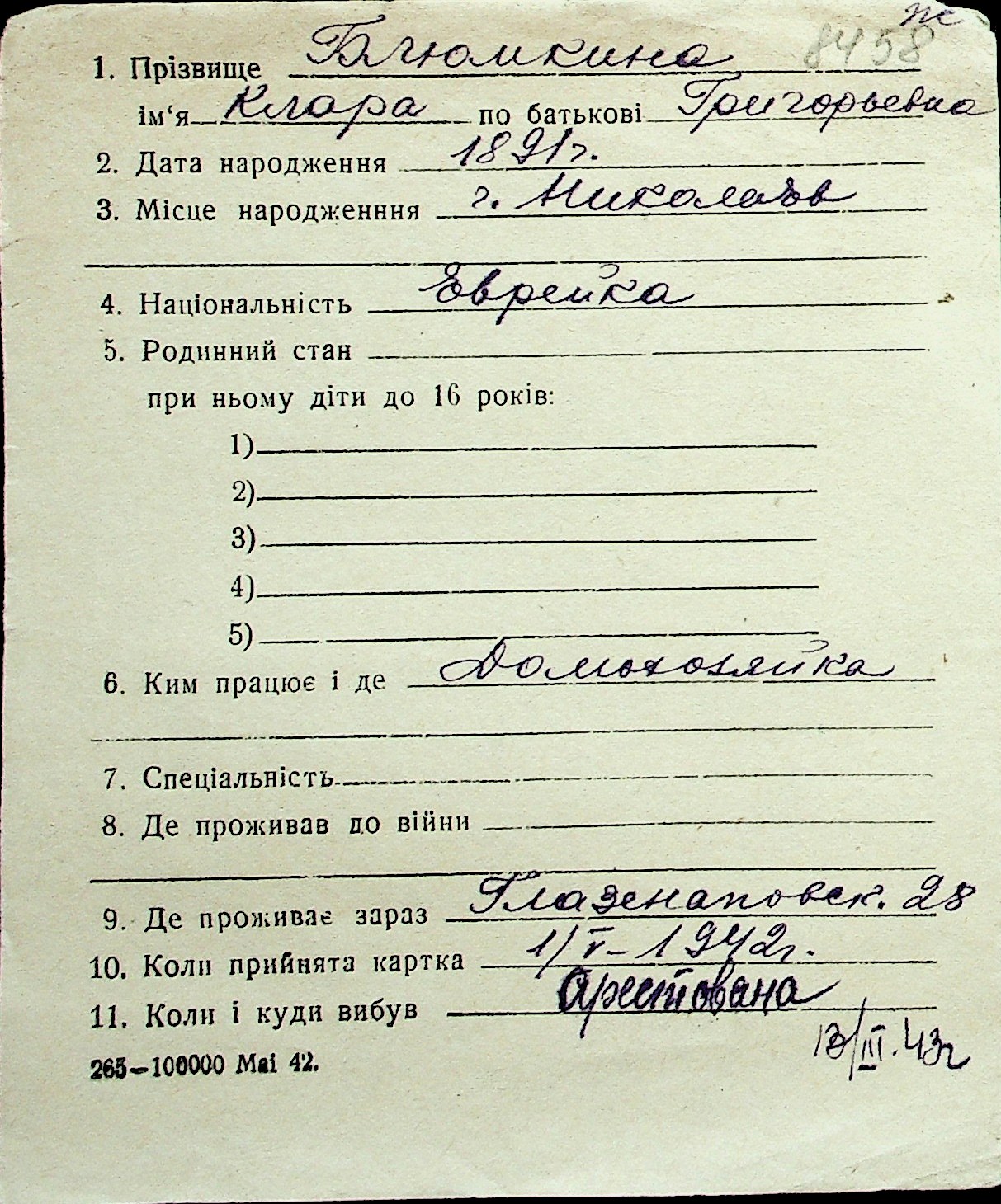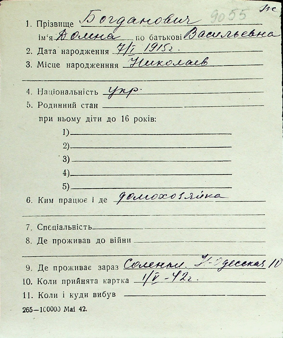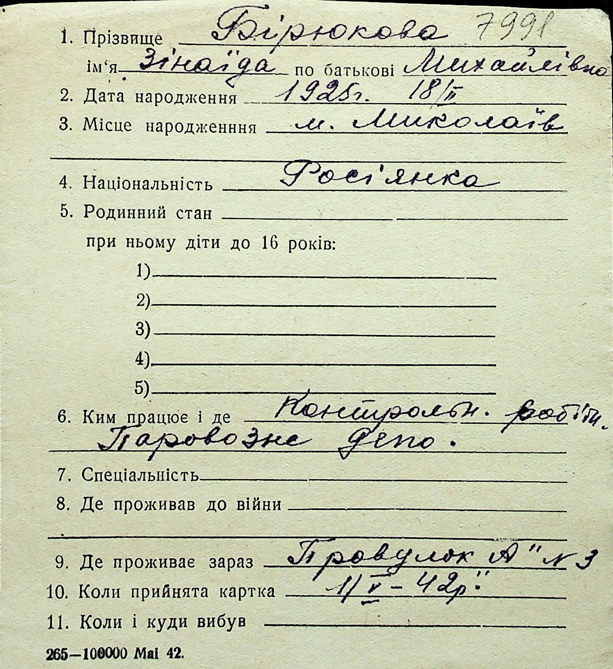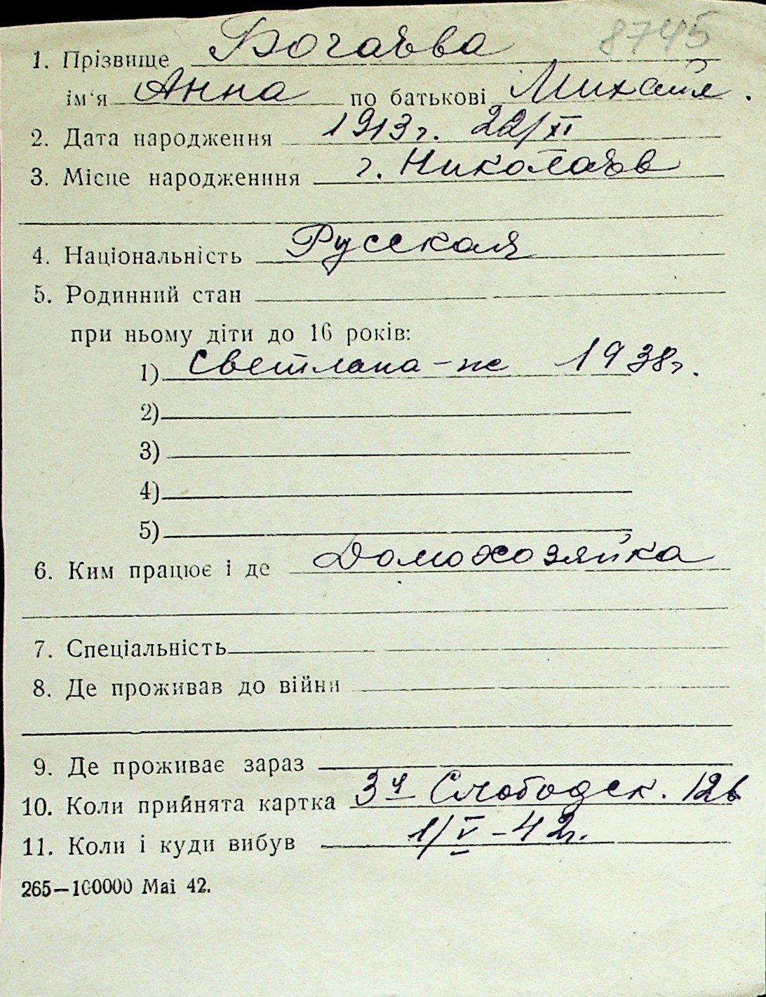 ◦ ◦ Перелік карток на осіб, які мешкали у м. Миколаїв у період окупації 1941–1944 років