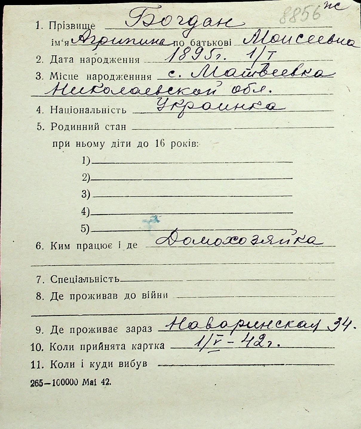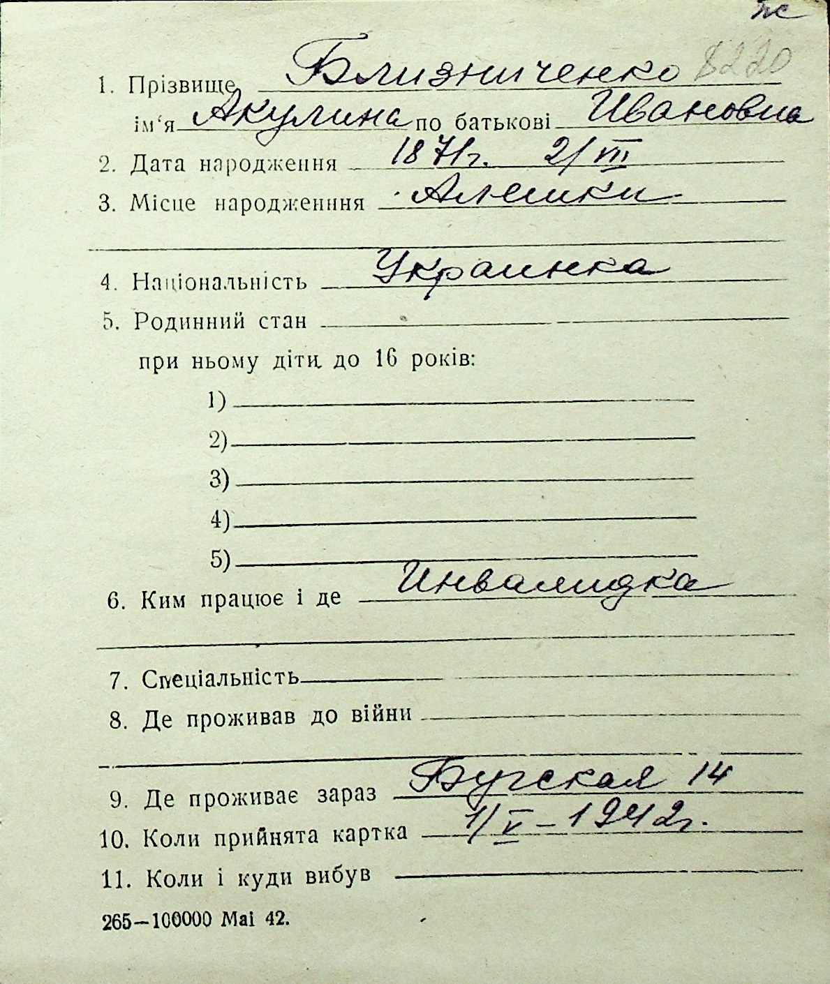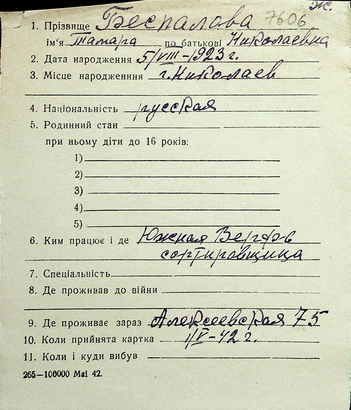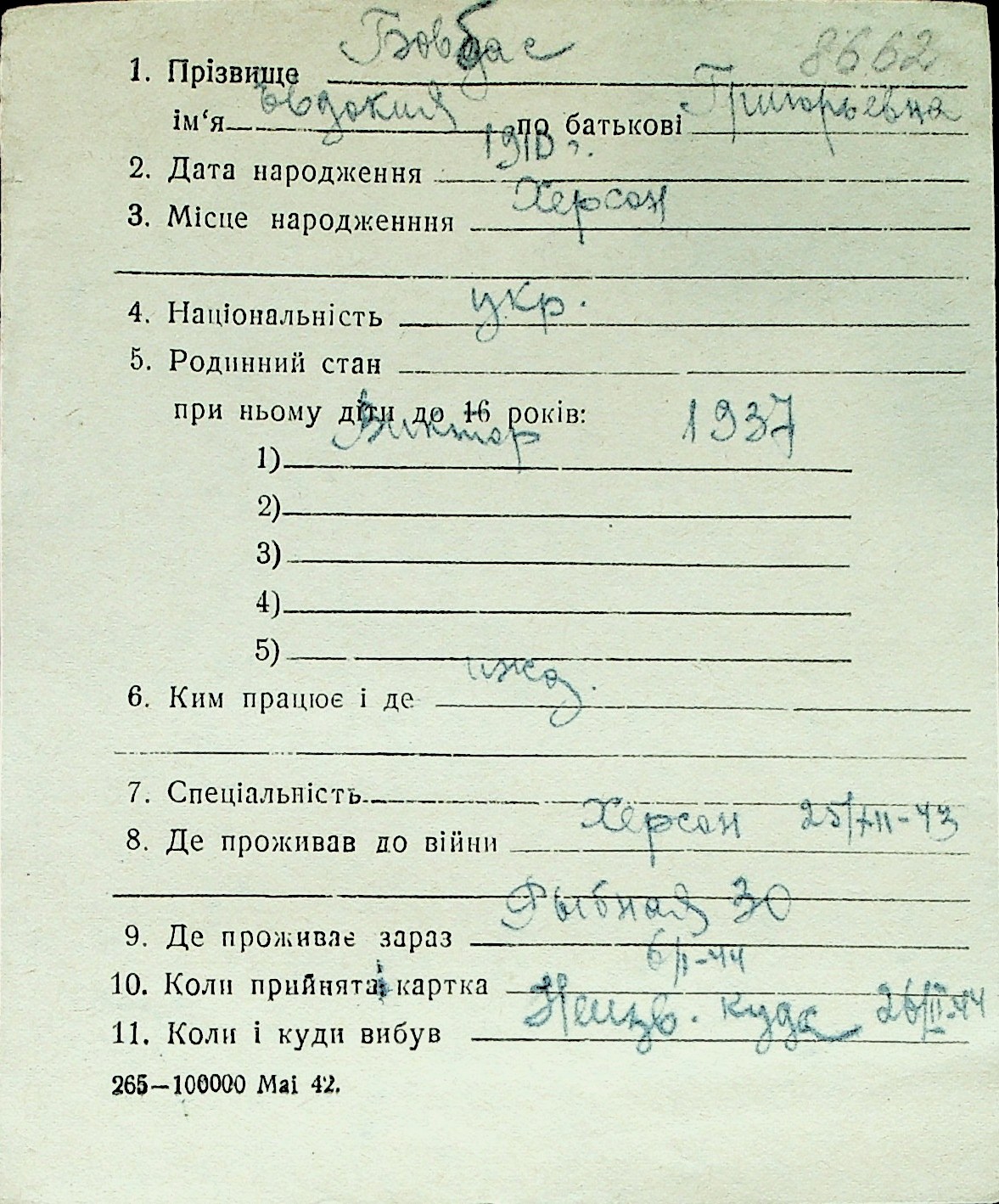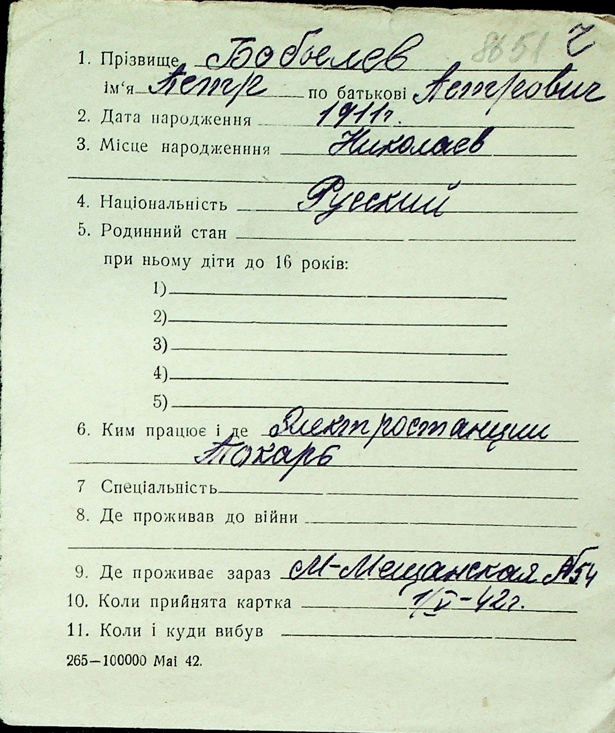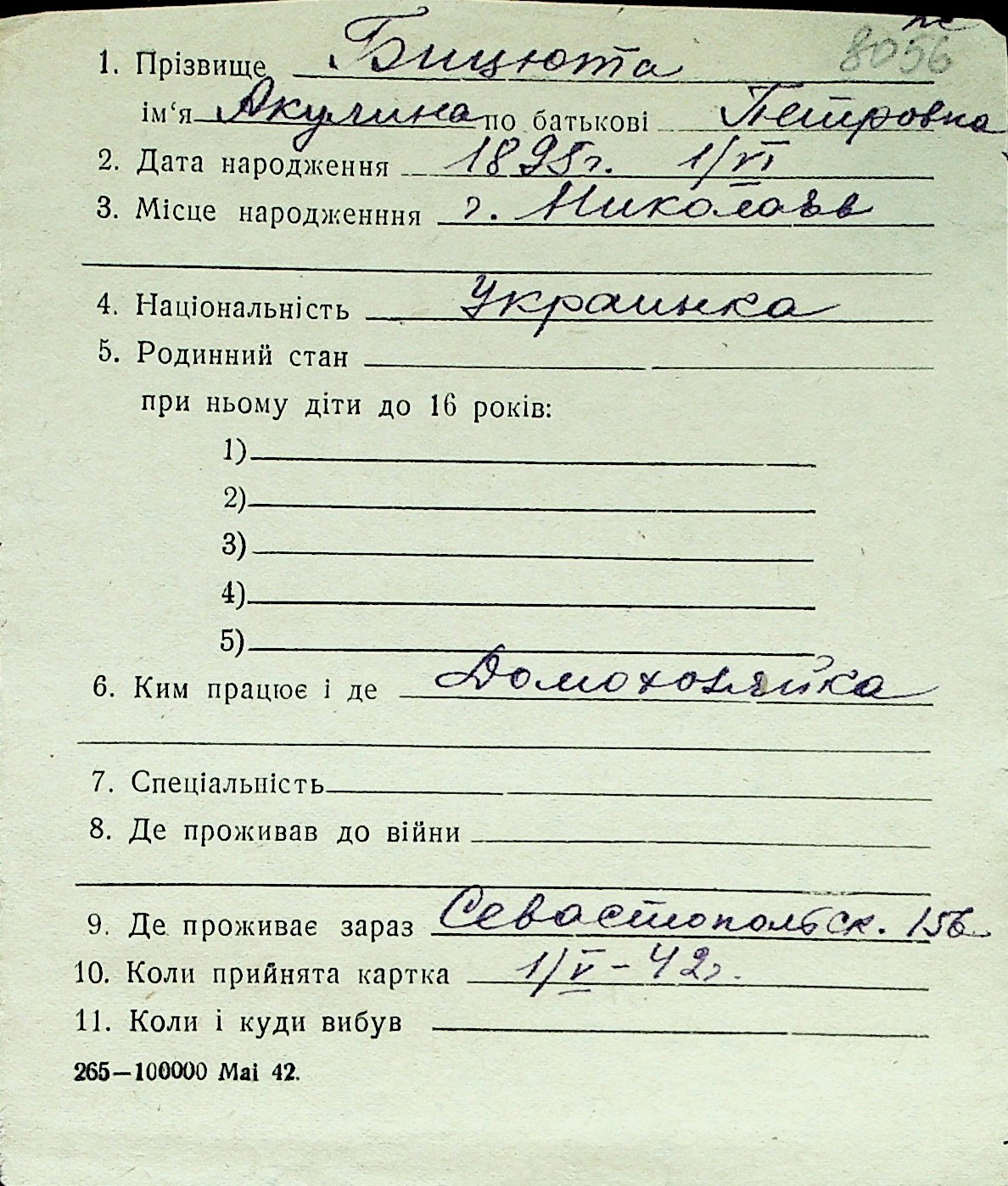 ◦ ◦ Перелік карток на осіб, які мешкали у м. Миколаїв у період окупації 1941–1944 років