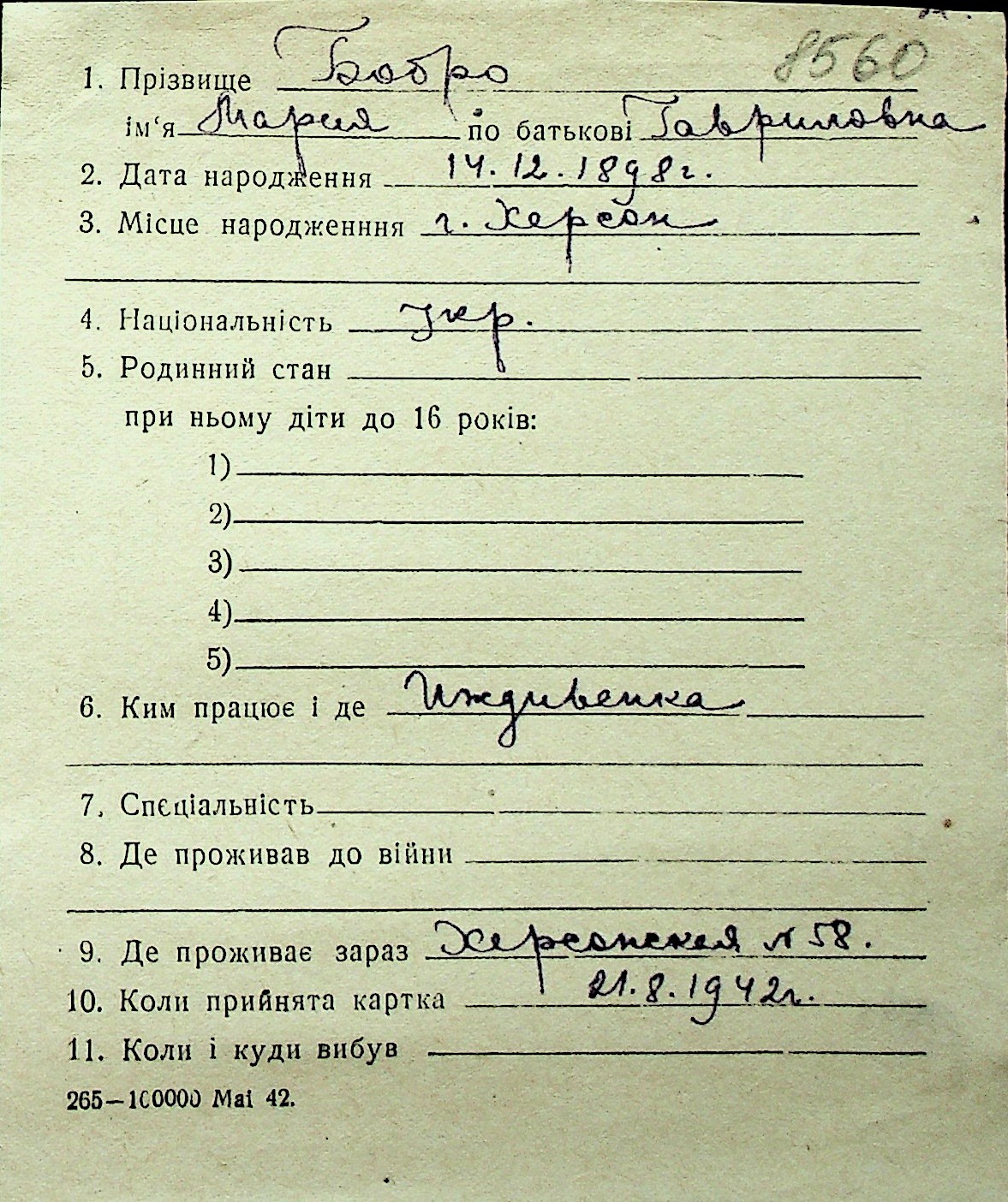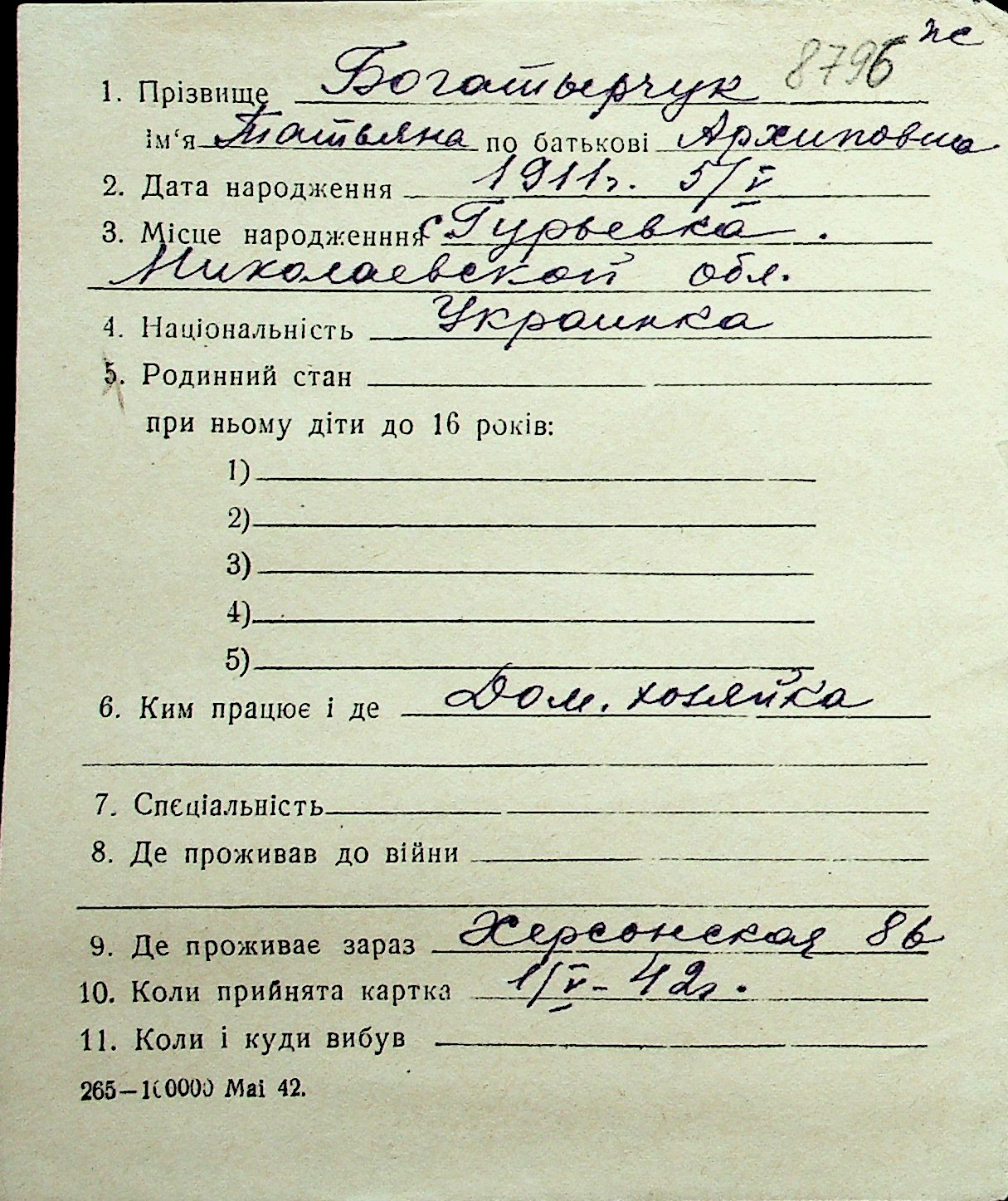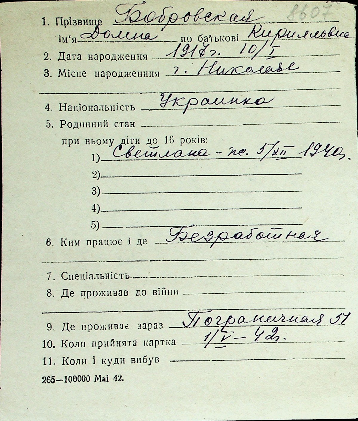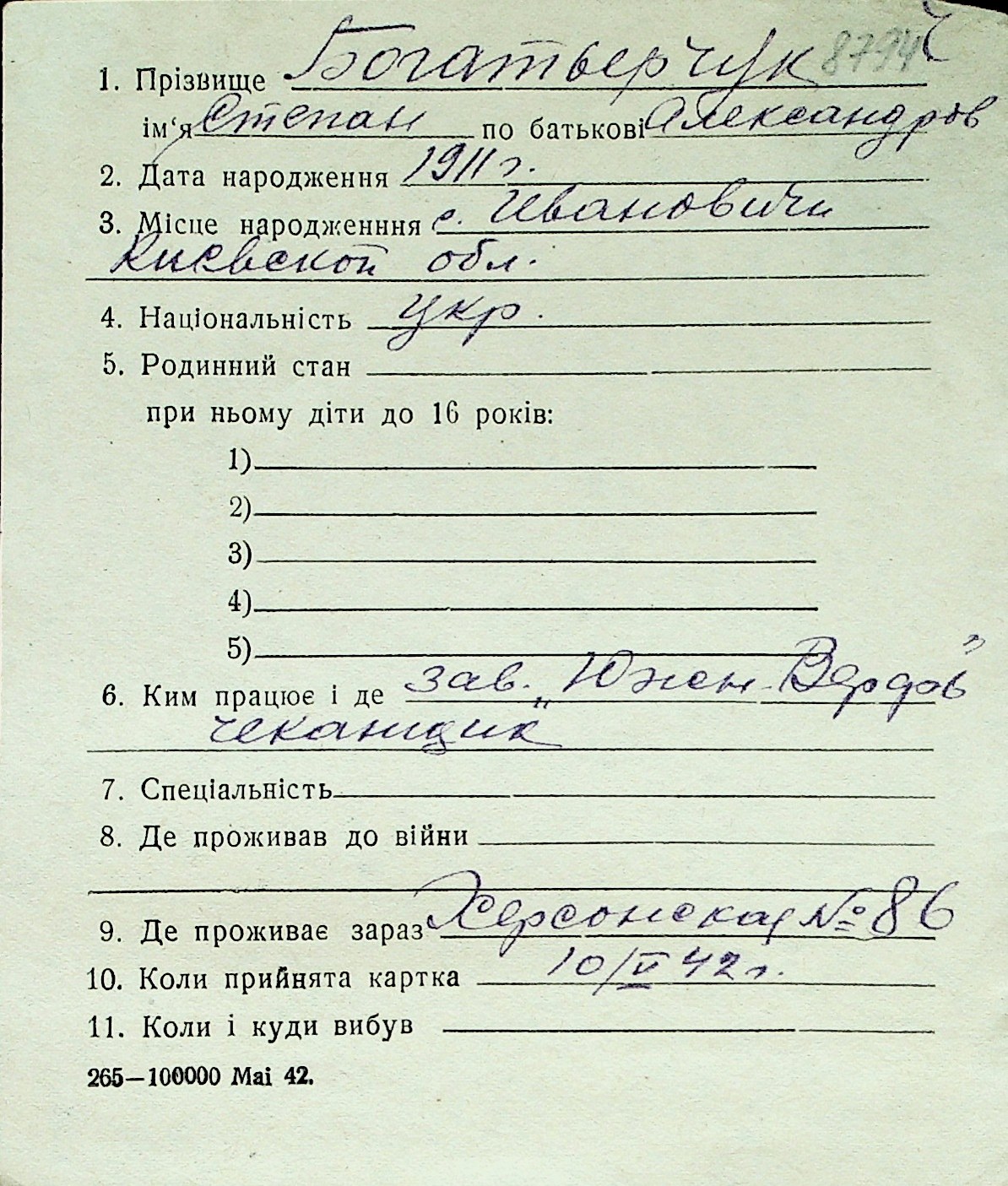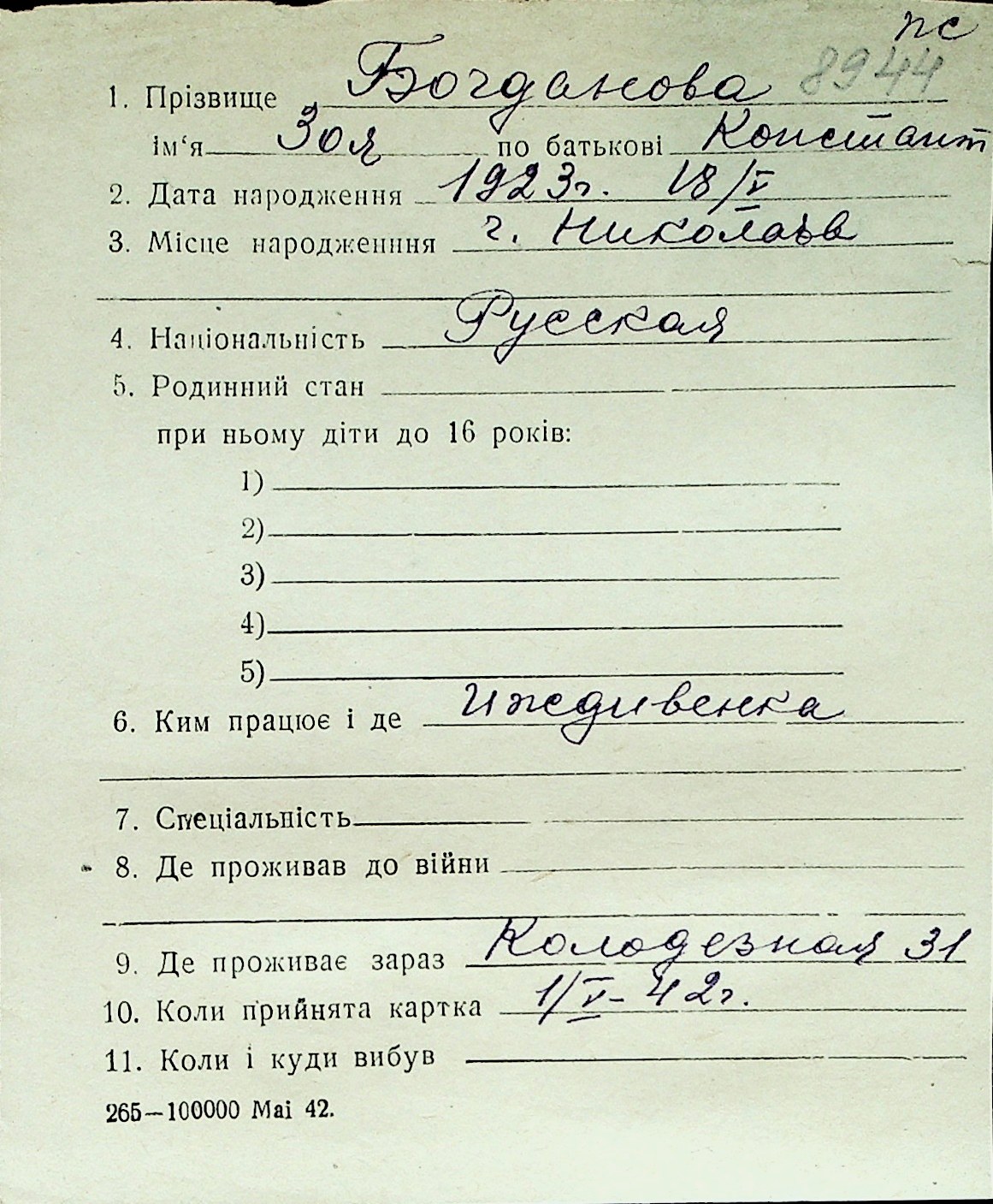 ◦ ◦ Перелік карток на осіб, які мешкали у м. Миколаїв у період окупації 1941–1944 років