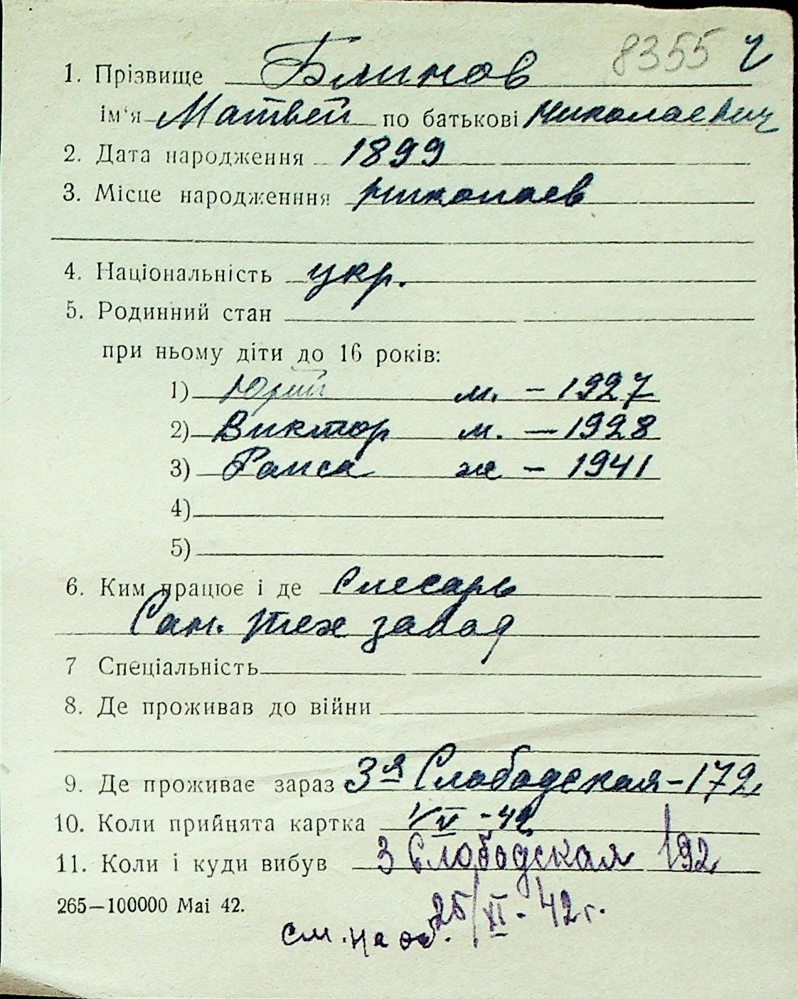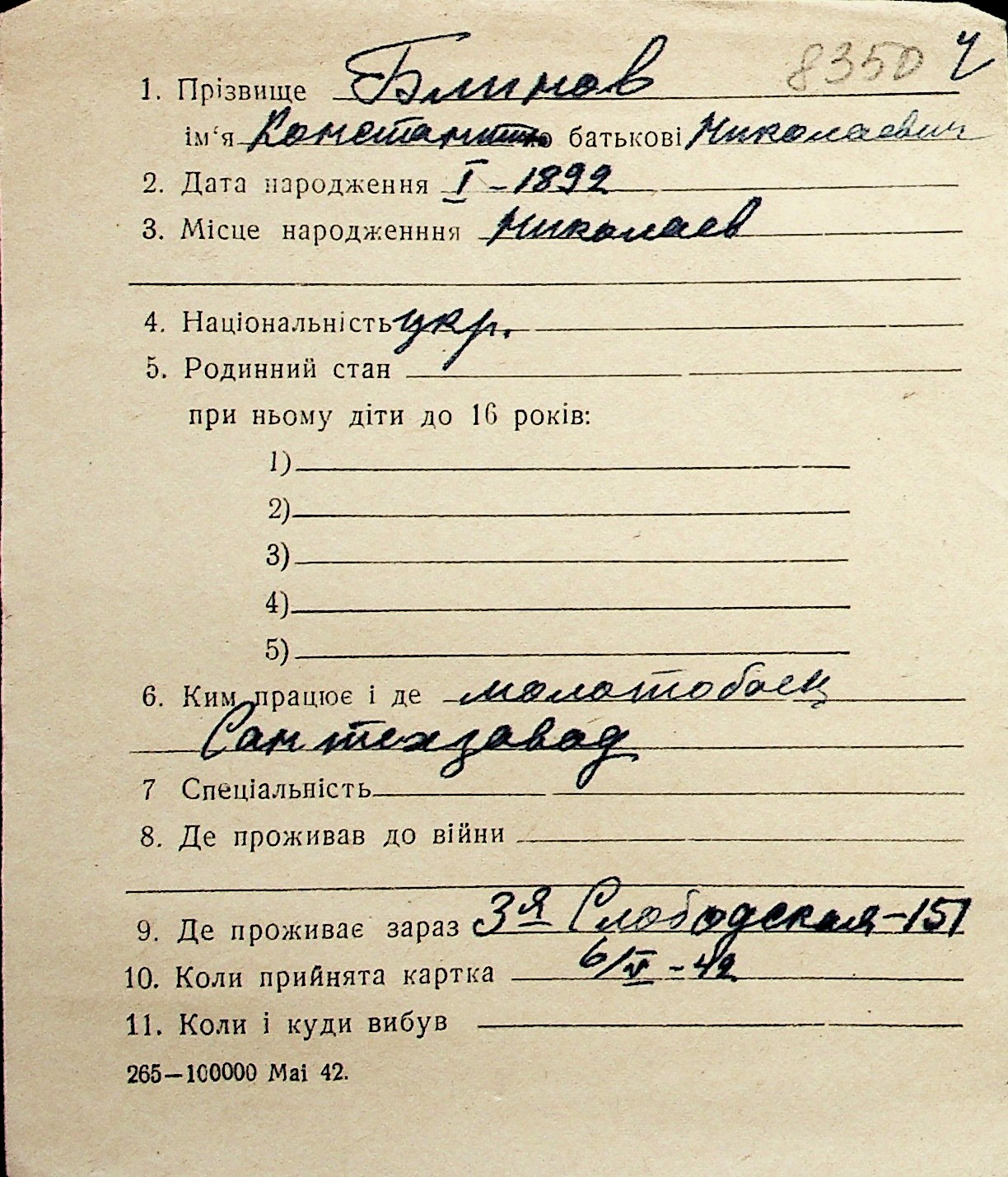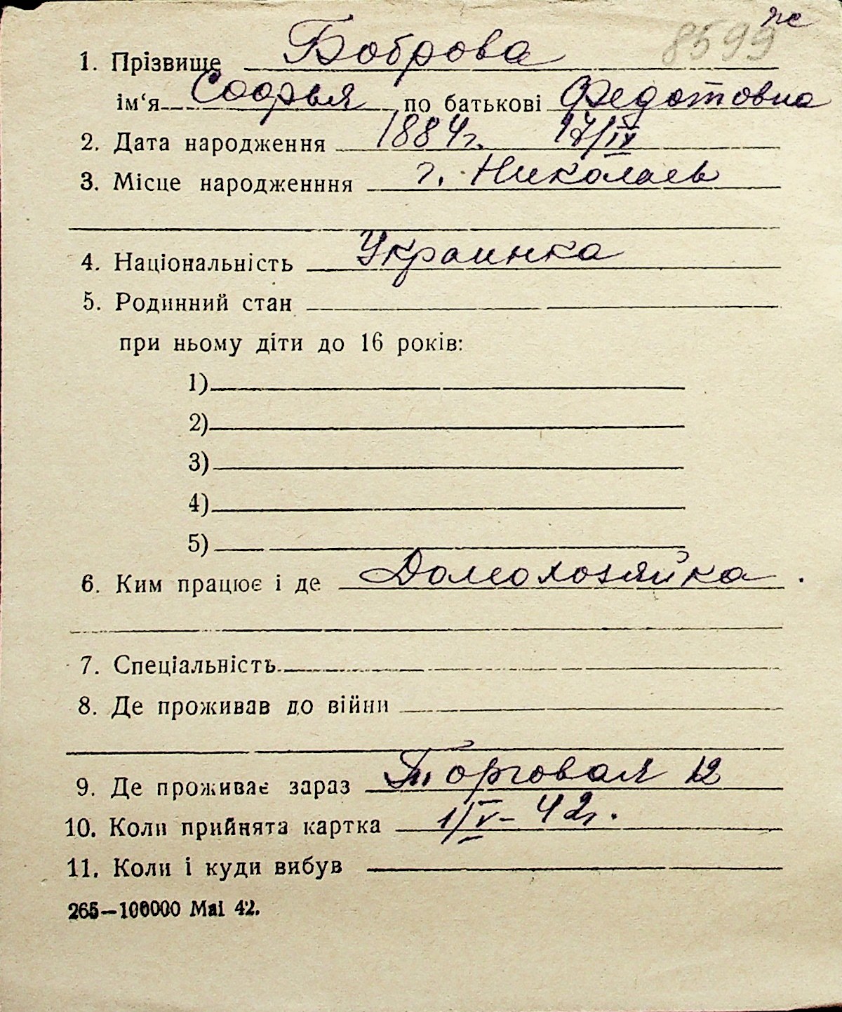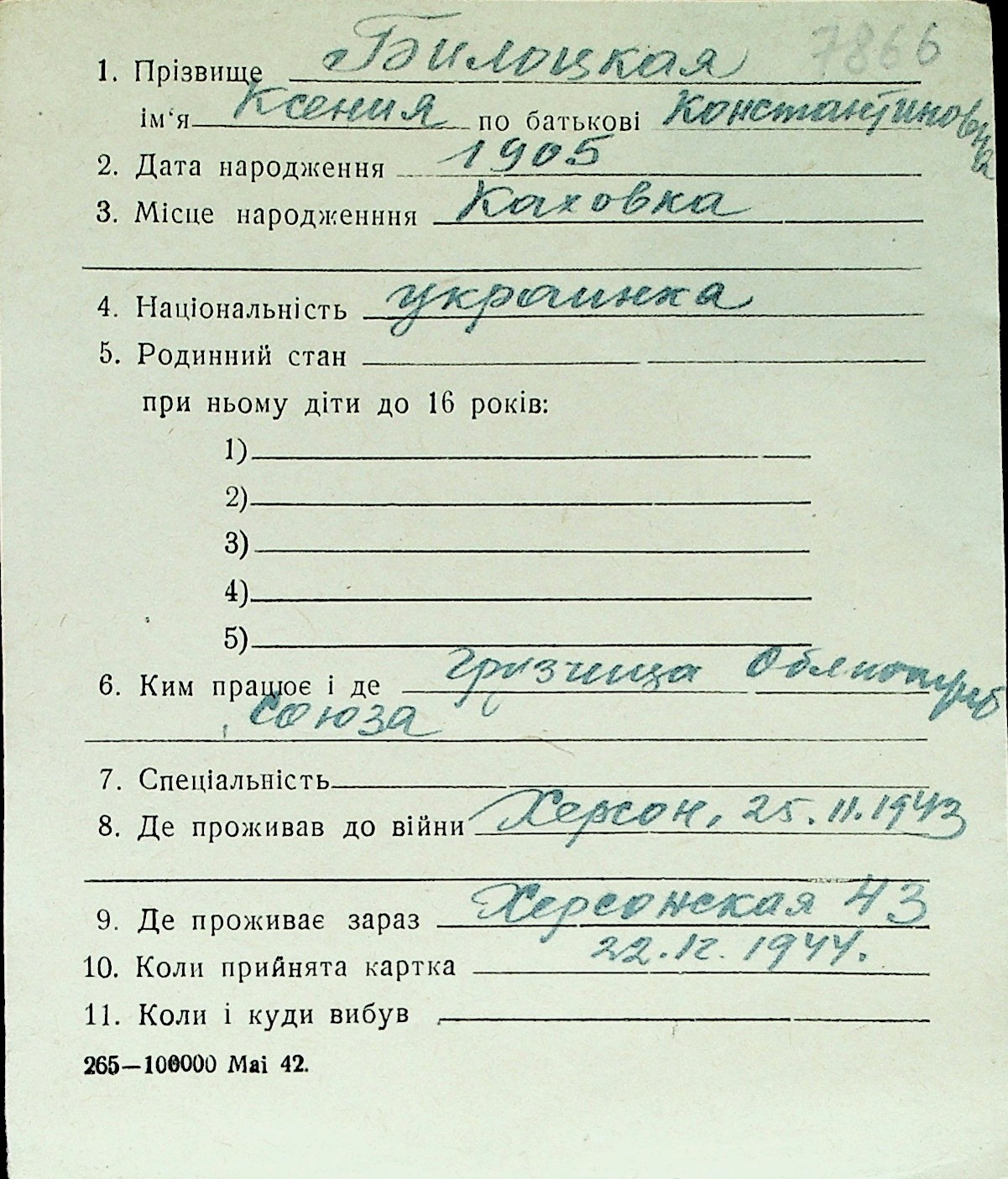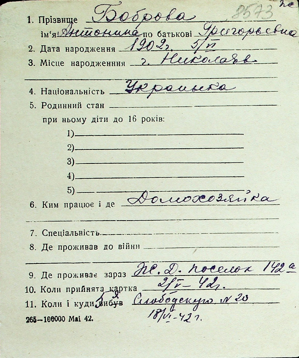 ◦ ◦ Перелік карток на осіб, які мешкали у м. Миколаїв у період окупації 1941–1944 років
