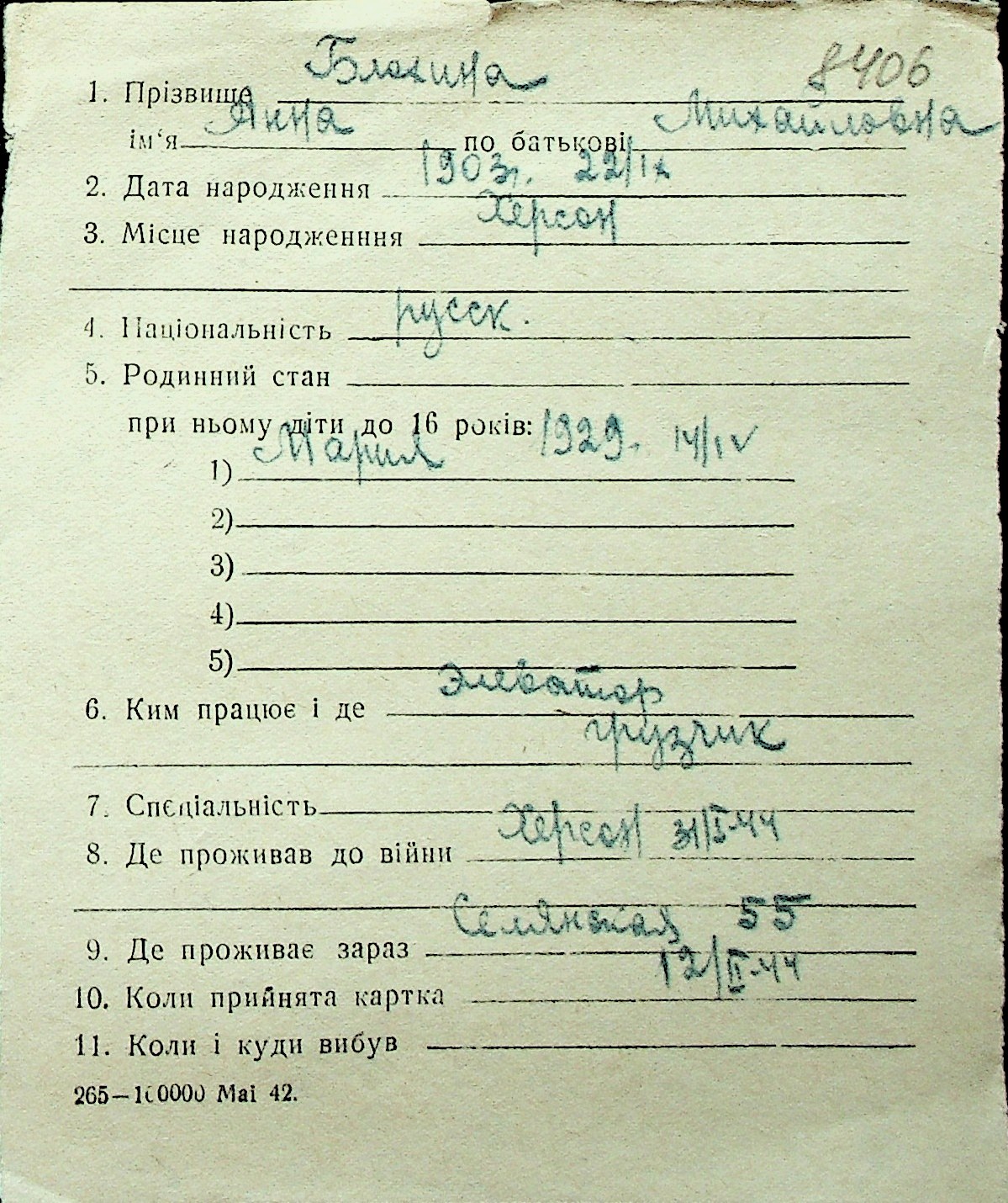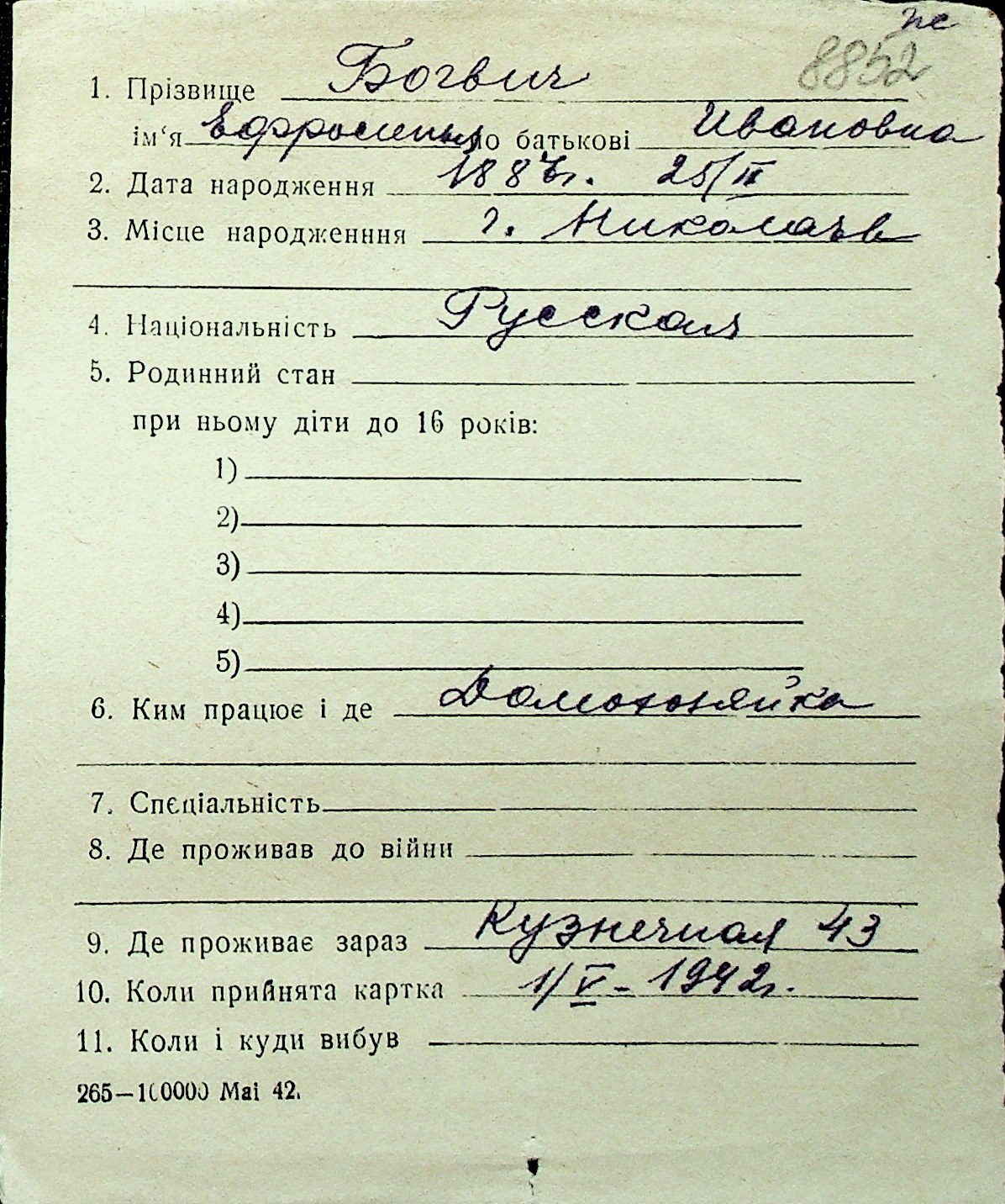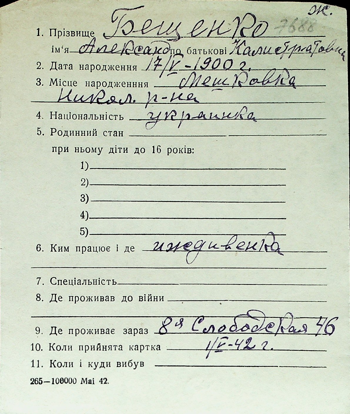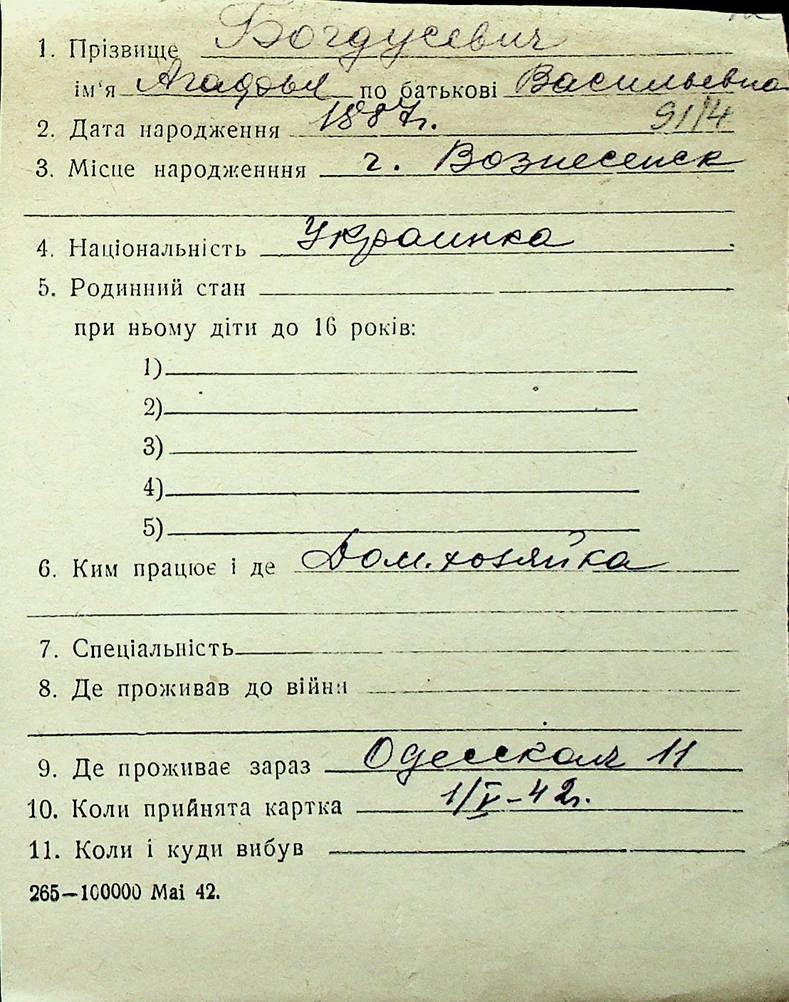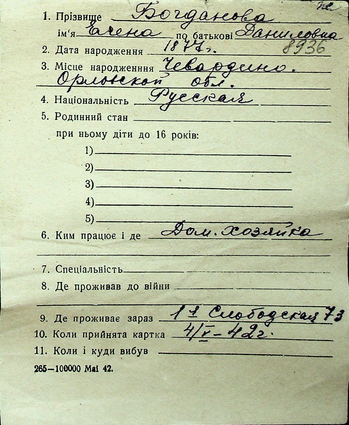 ◦ ◦ Перелік карток на осіб, які мешкали у м. Миколаїв у період окупації 1941–1944 років