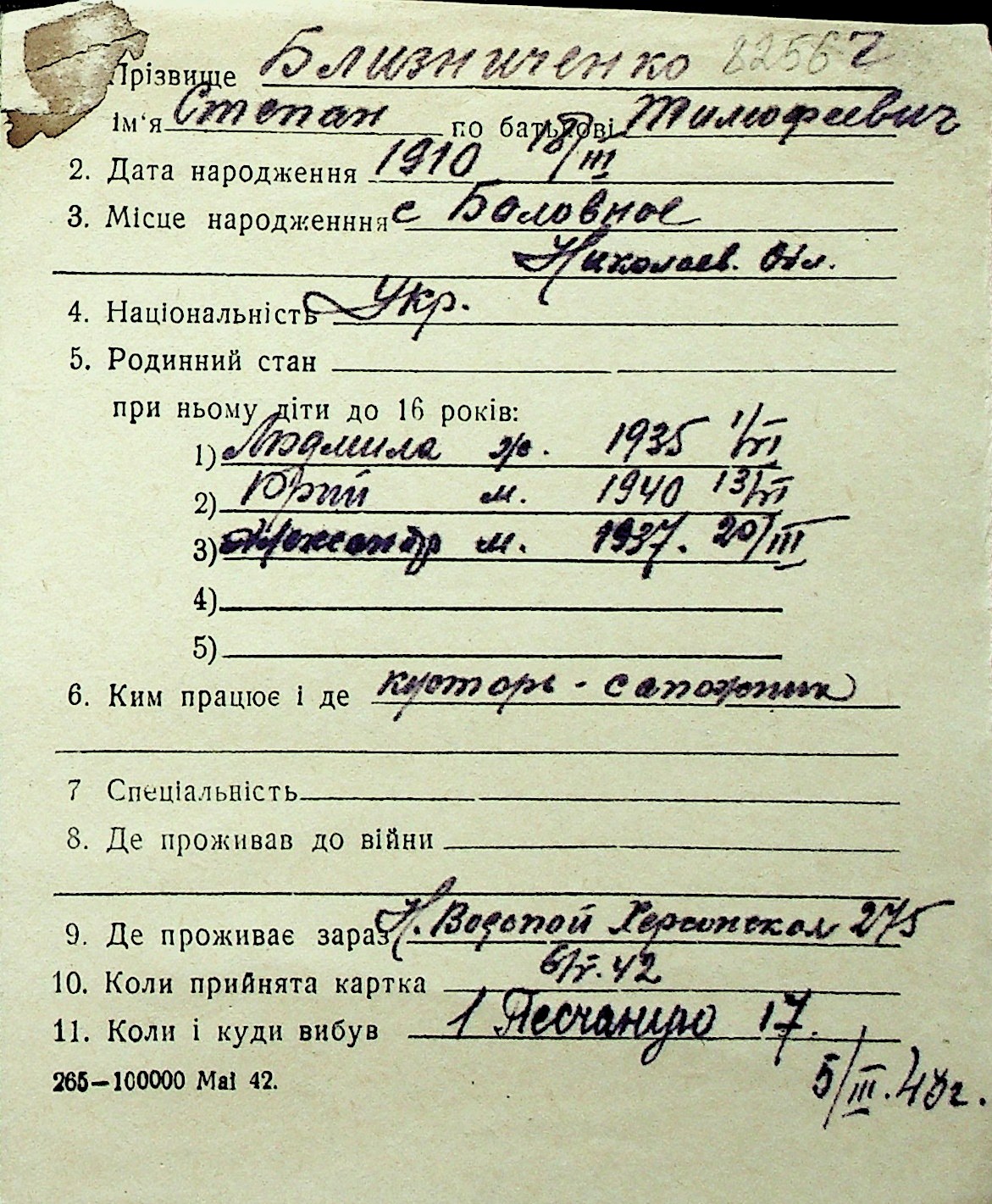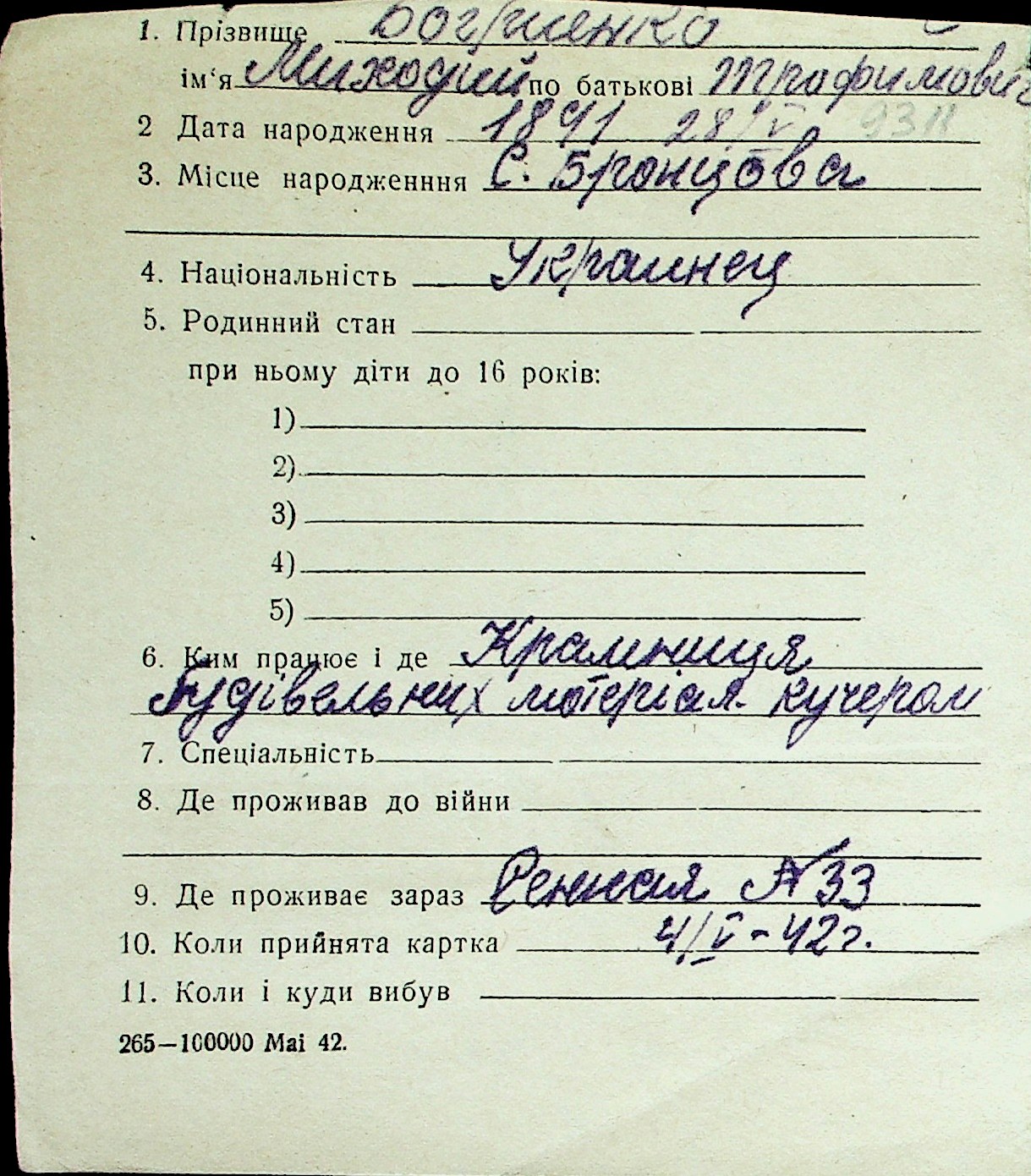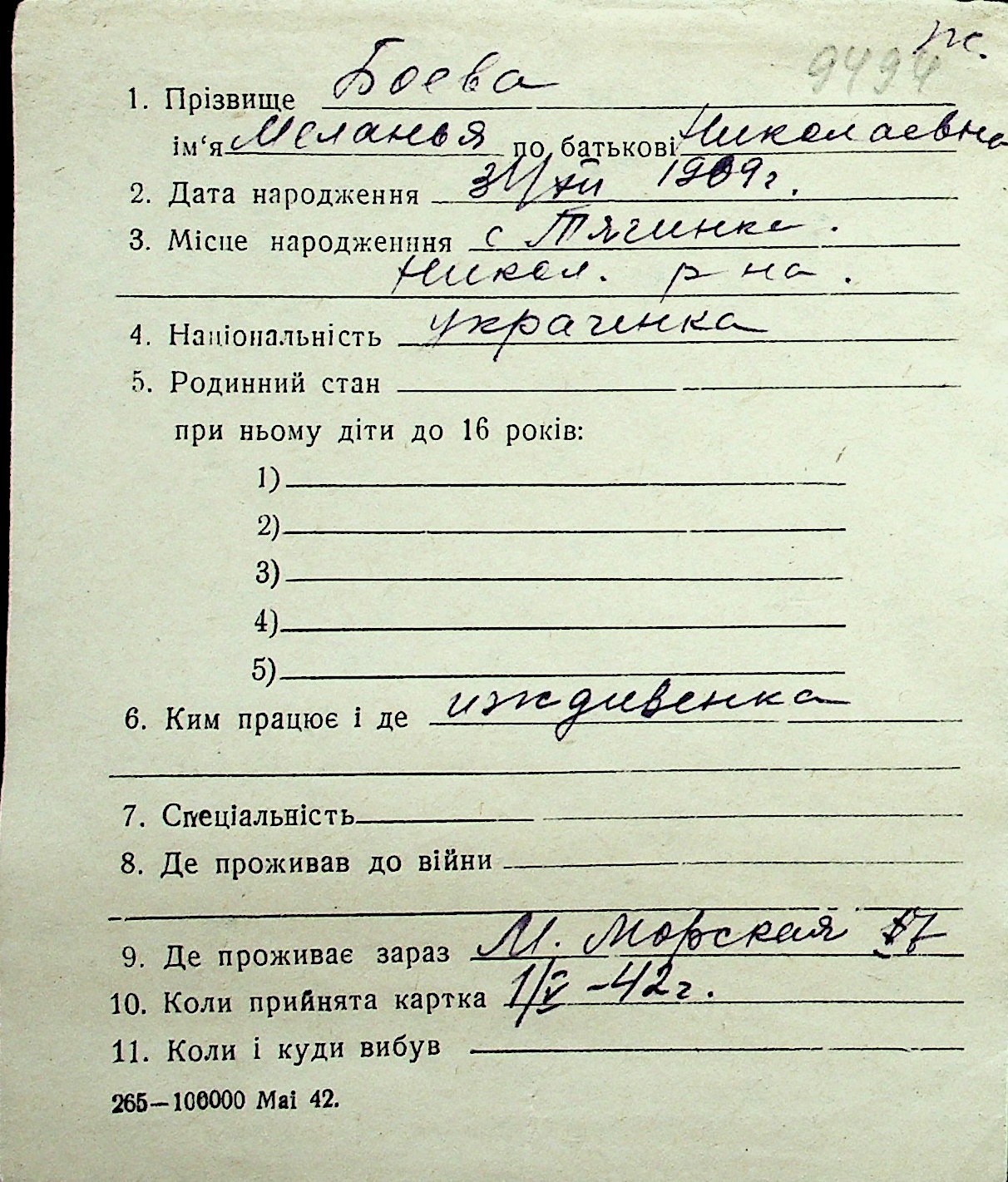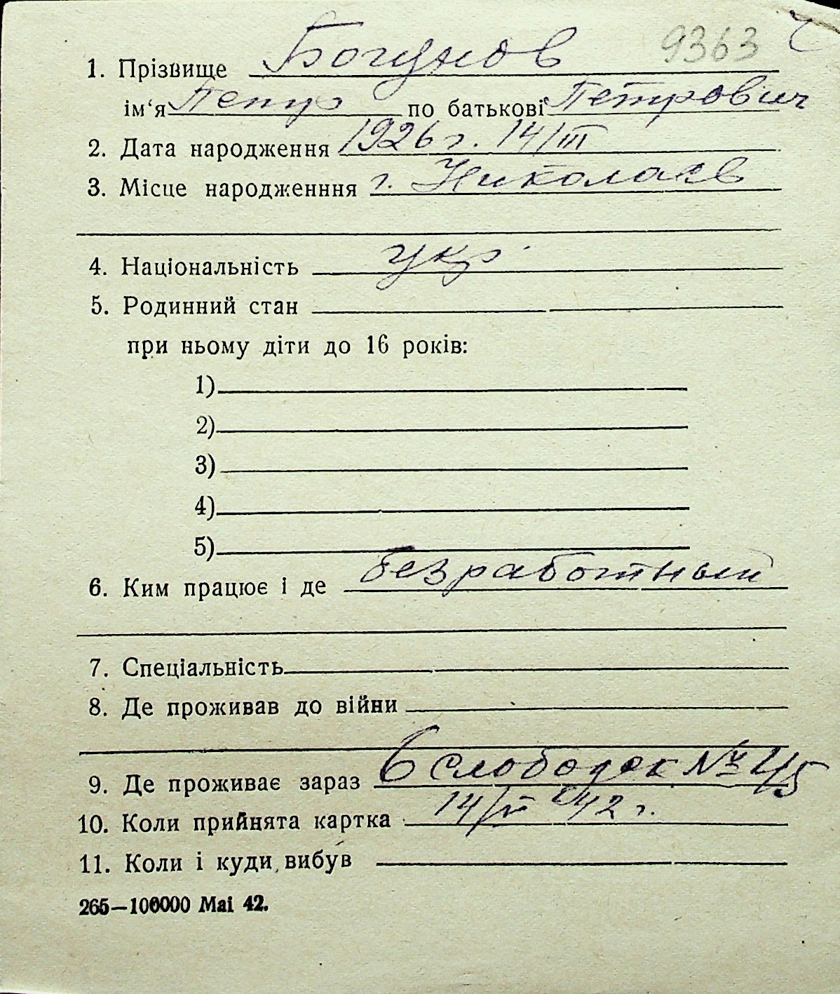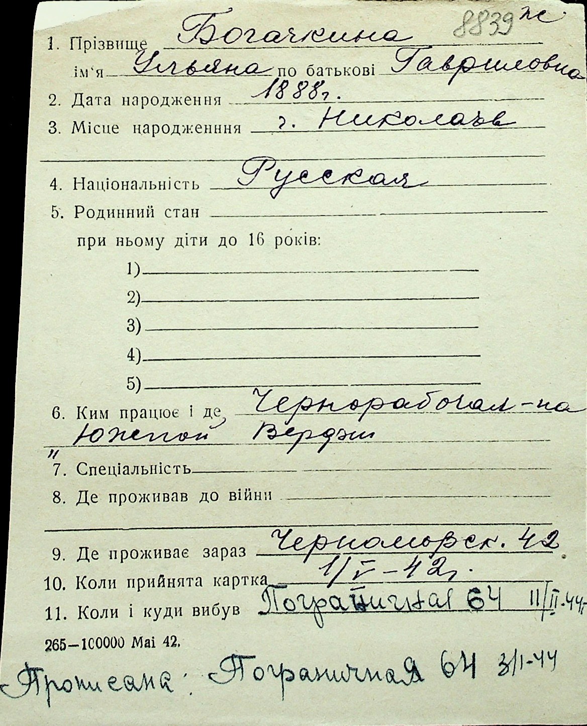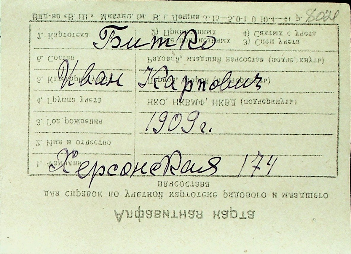 ◦ ◦ Перелік карток на осіб, які мешкали у м. Миколаїв у період окупації 1941–1944 років