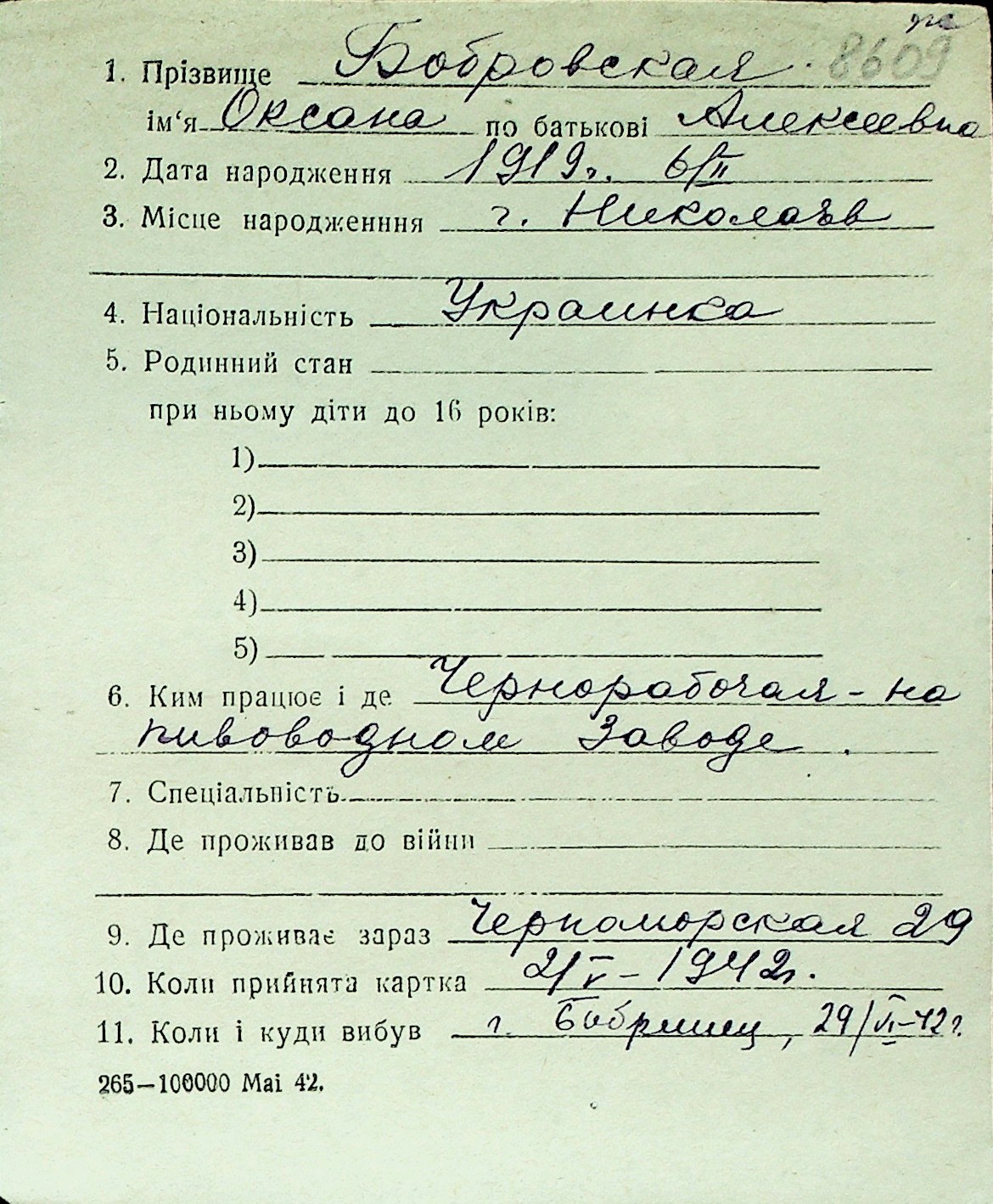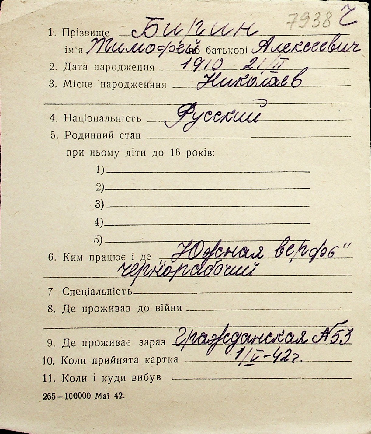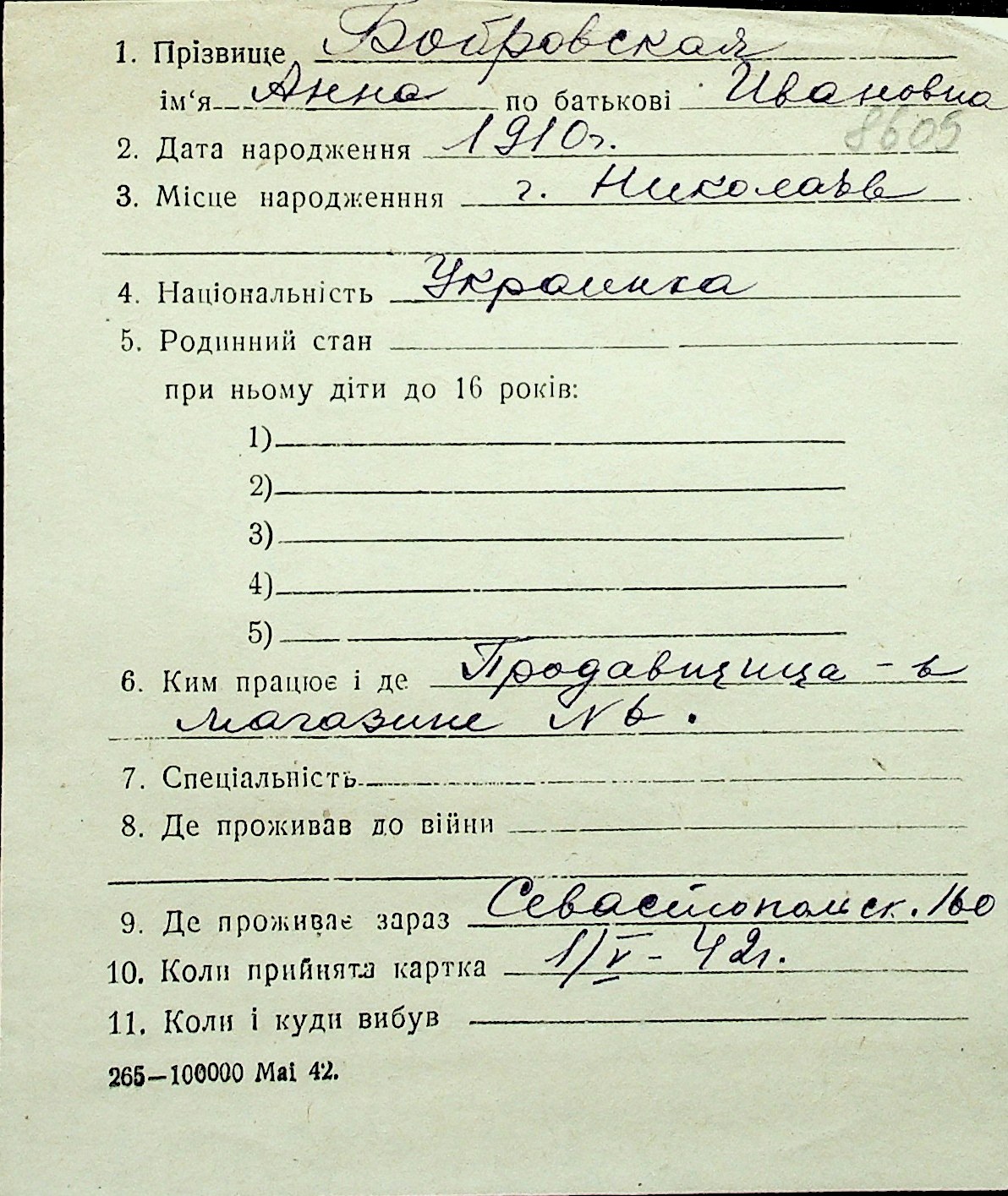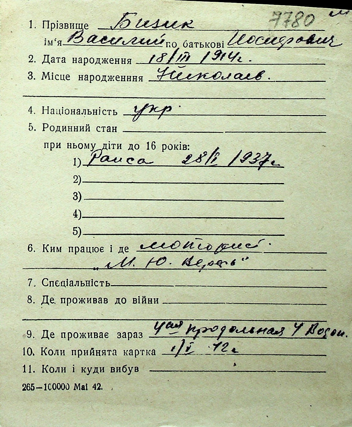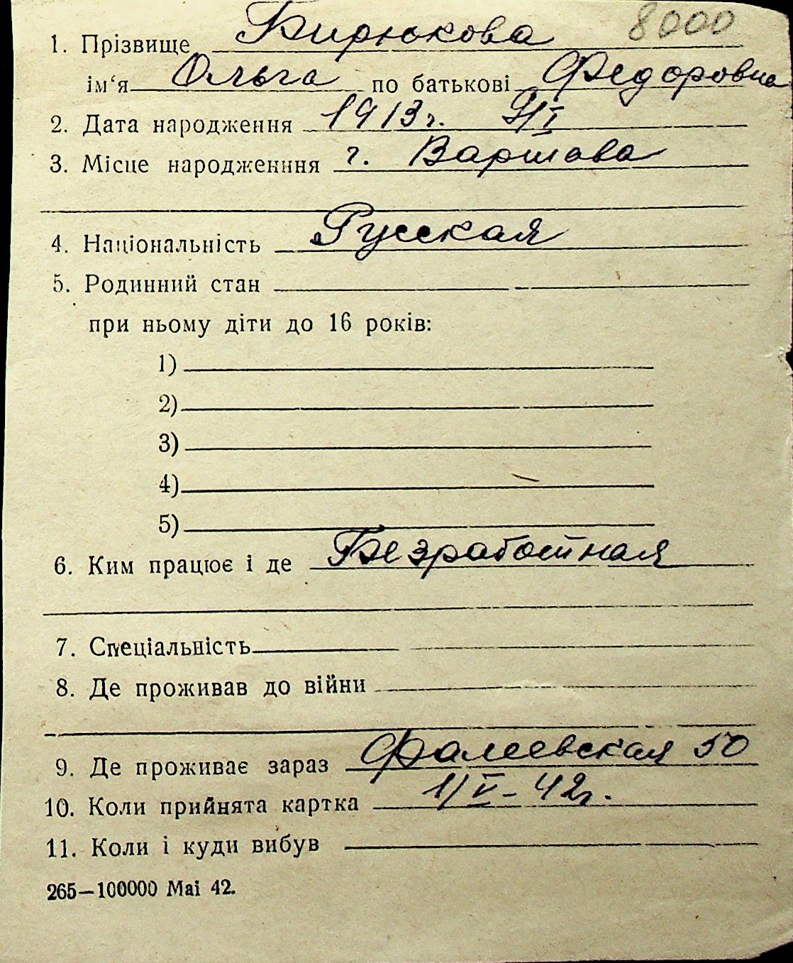 ◦ ◦ Перелік карток на осіб, які мешкали у м. Миколаїв у період окупації 1941–1944 років