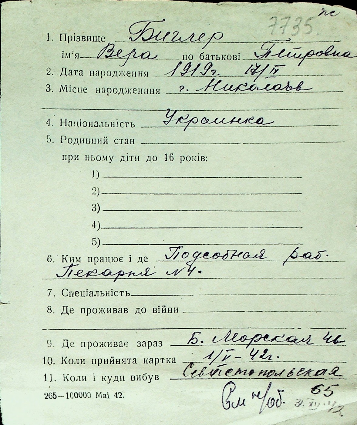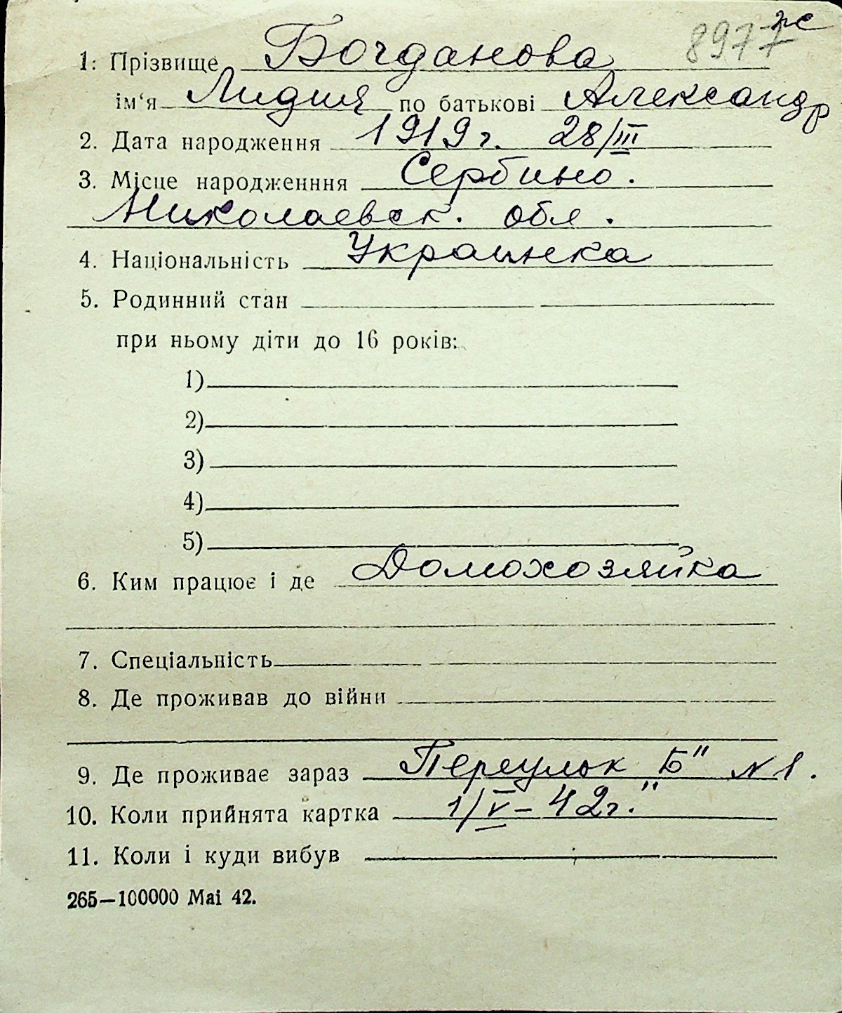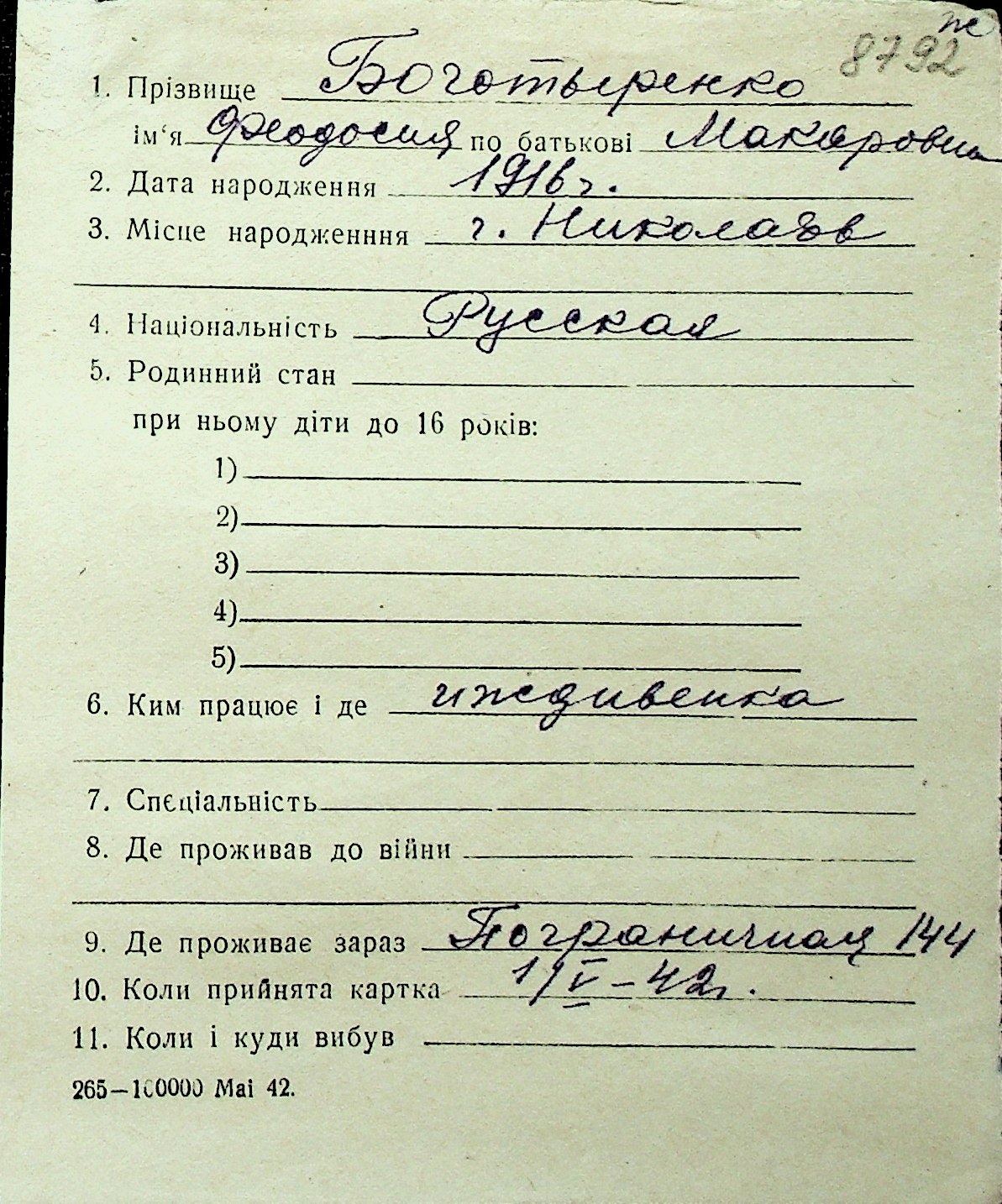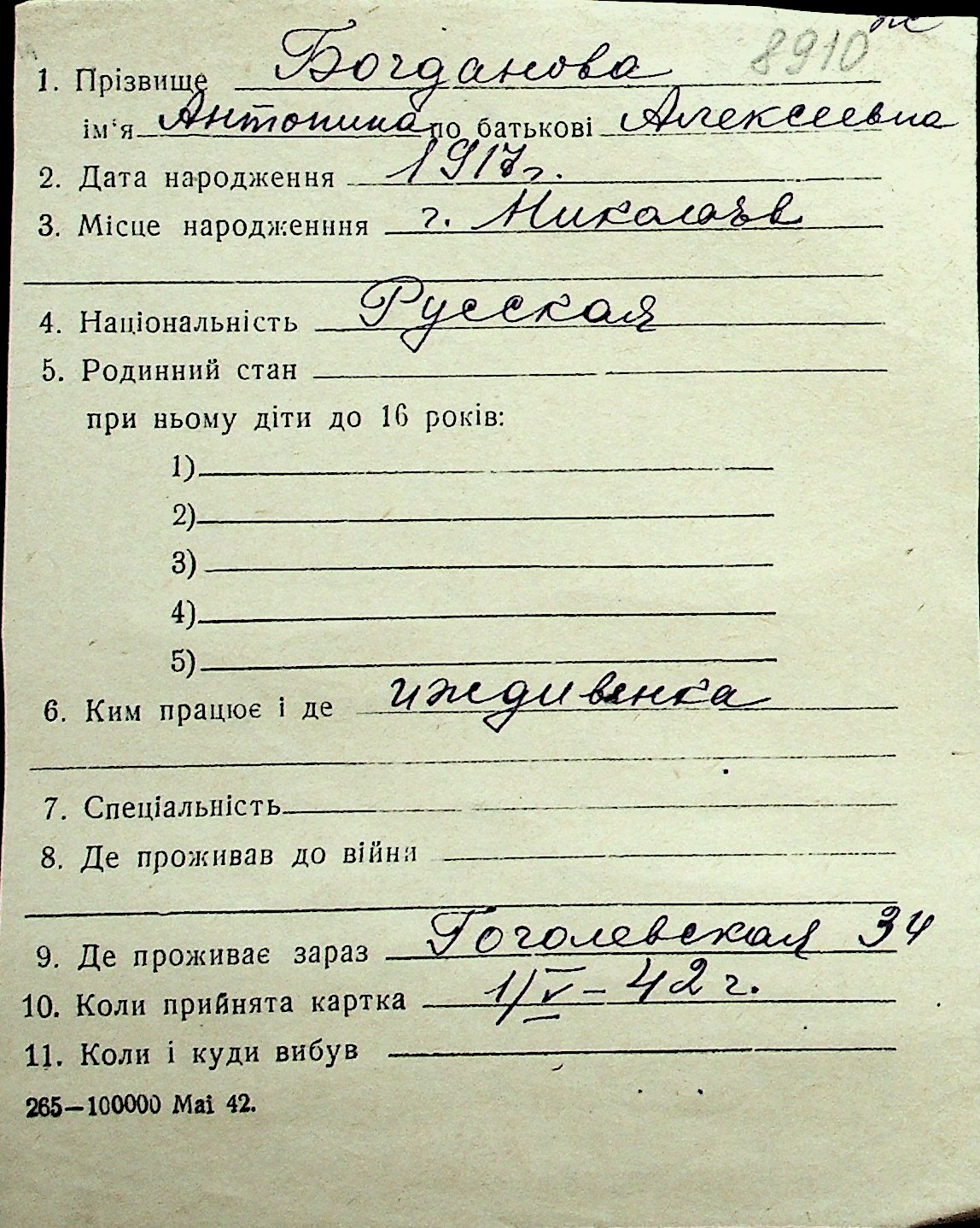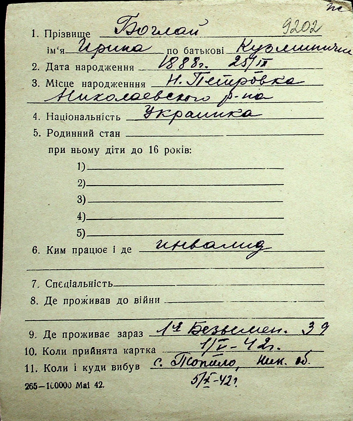 ◦ ◦ Перелік карток на осіб, які мешкали у м. Миколаїв у період окупації 1941–1944 років