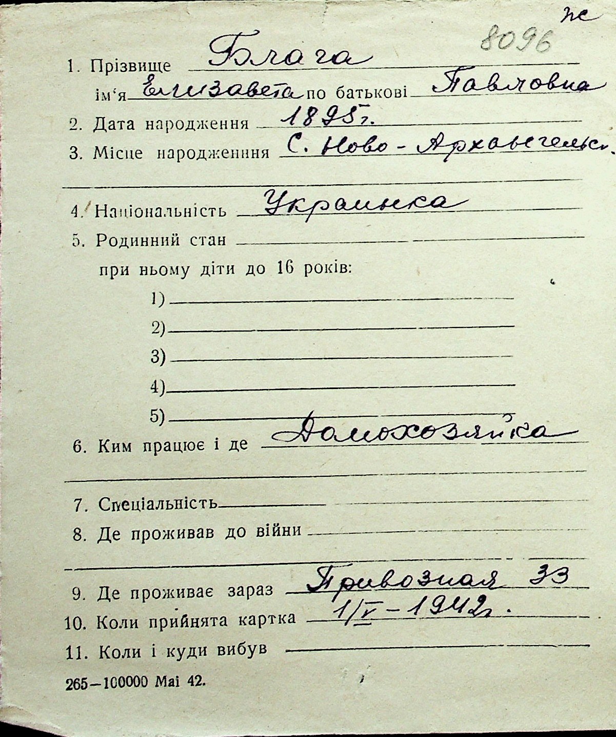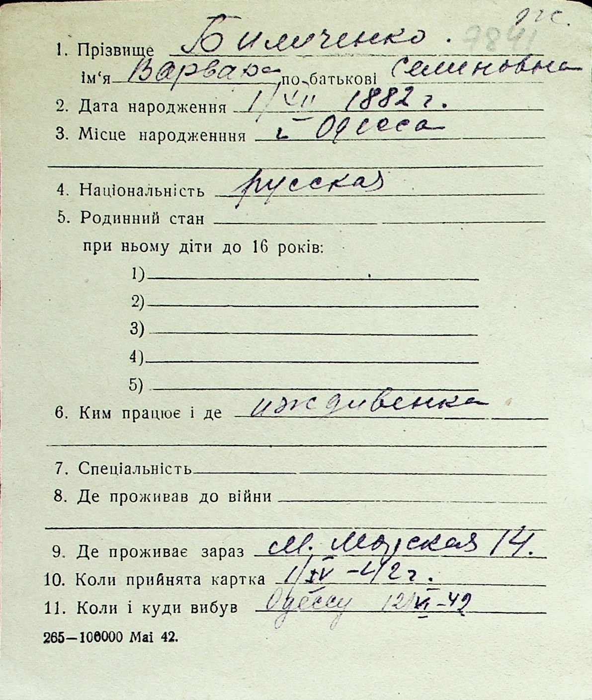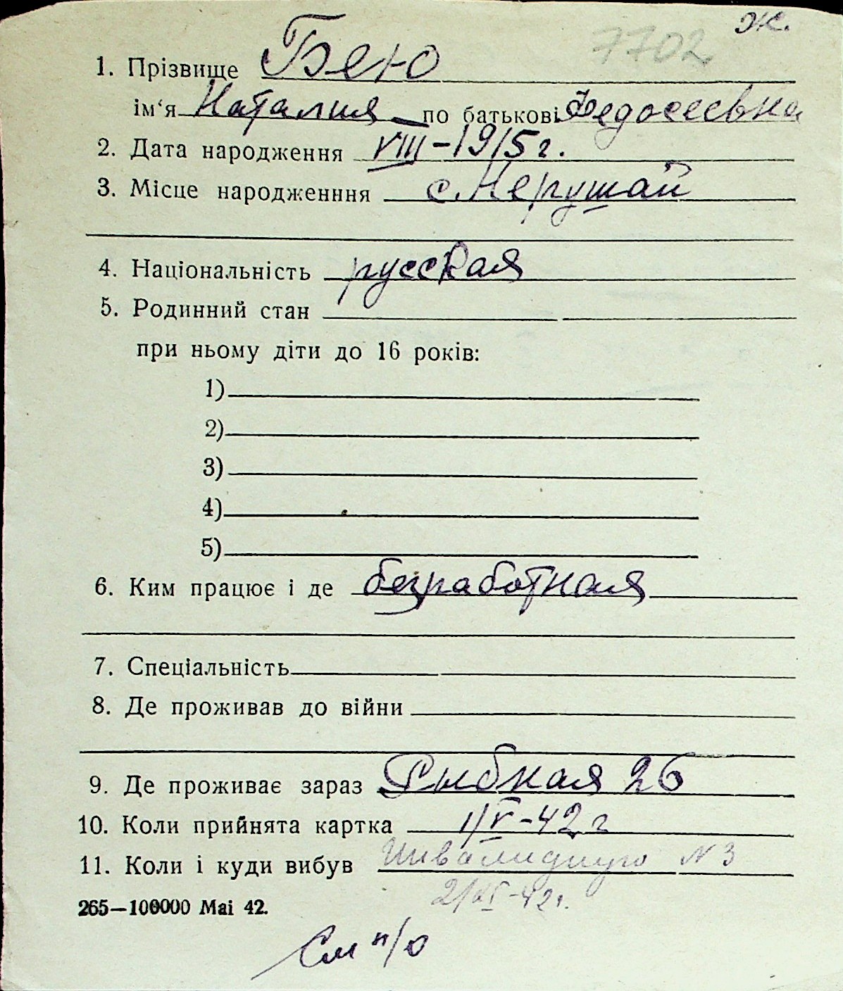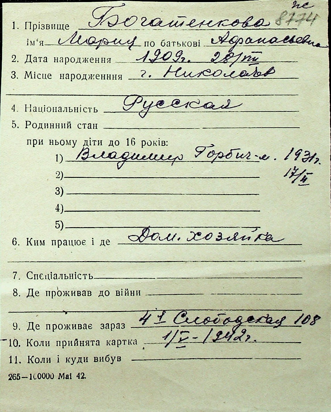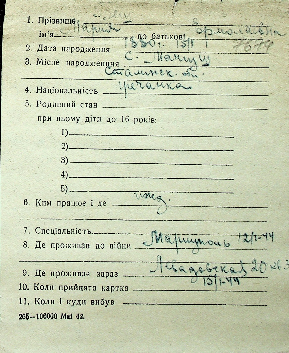◦ ◦ Перелік карток на осіб, які мешкали у м. Миколаїв у період окупації 1941–1944 років