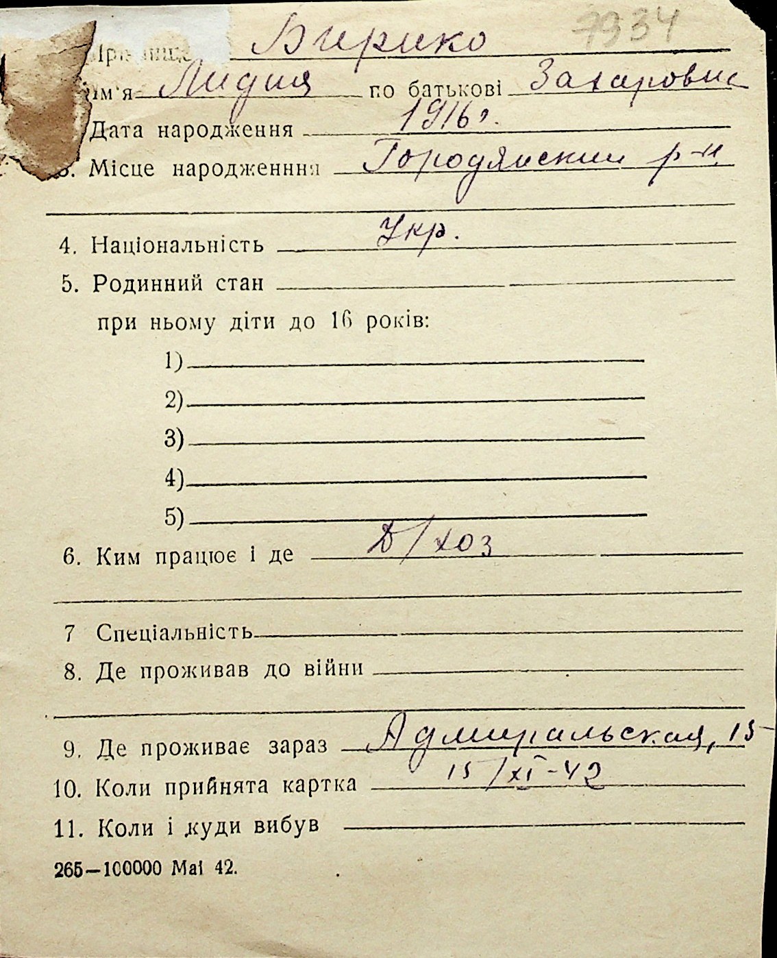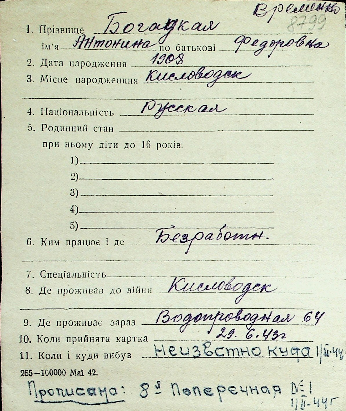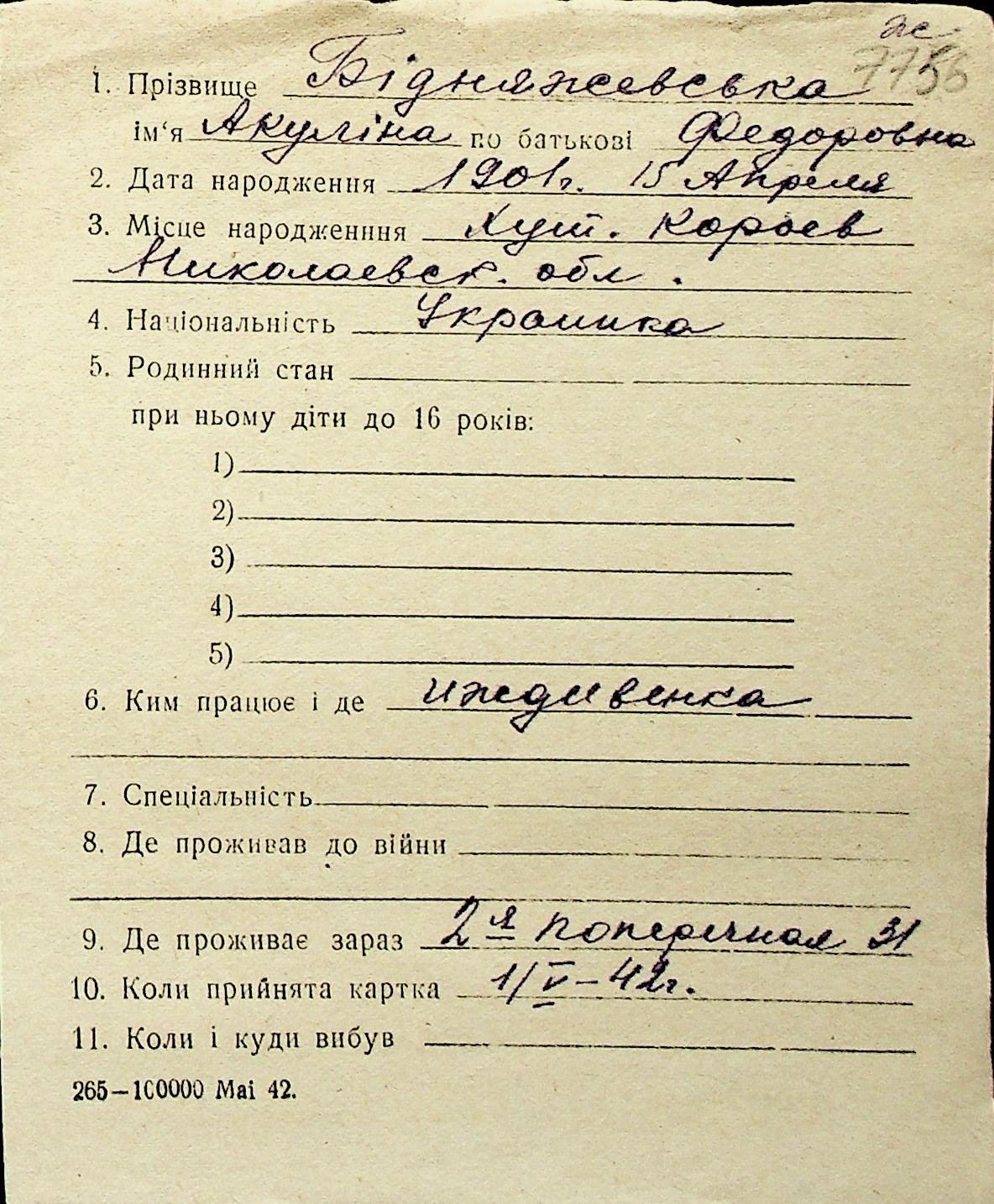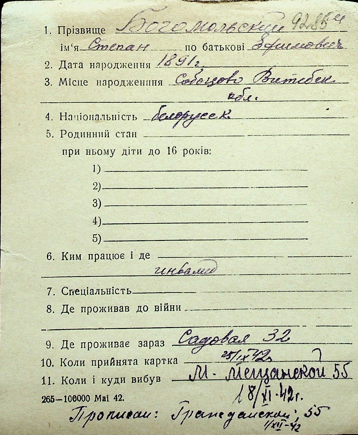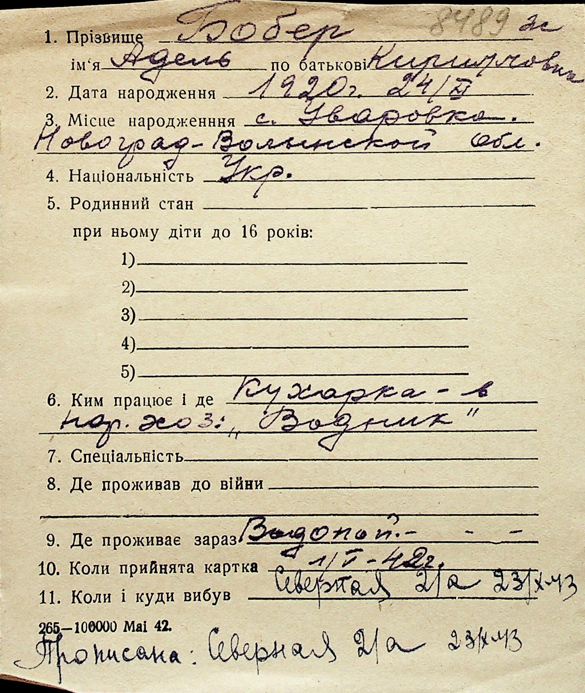 ◦ ◦ Перелік карток на осіб, які мешкали у м. Миколаїв у період окупації 1941–1944 років