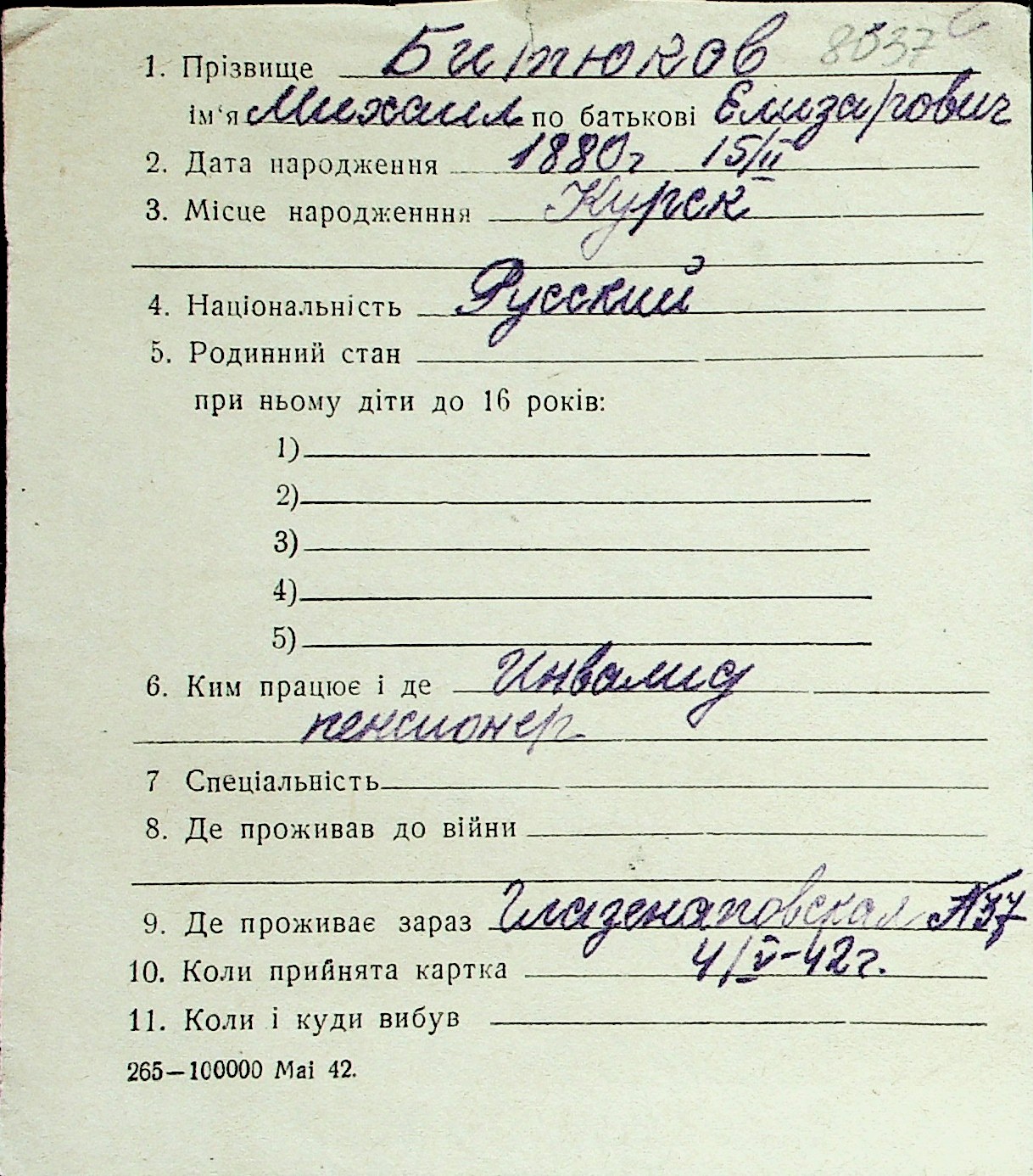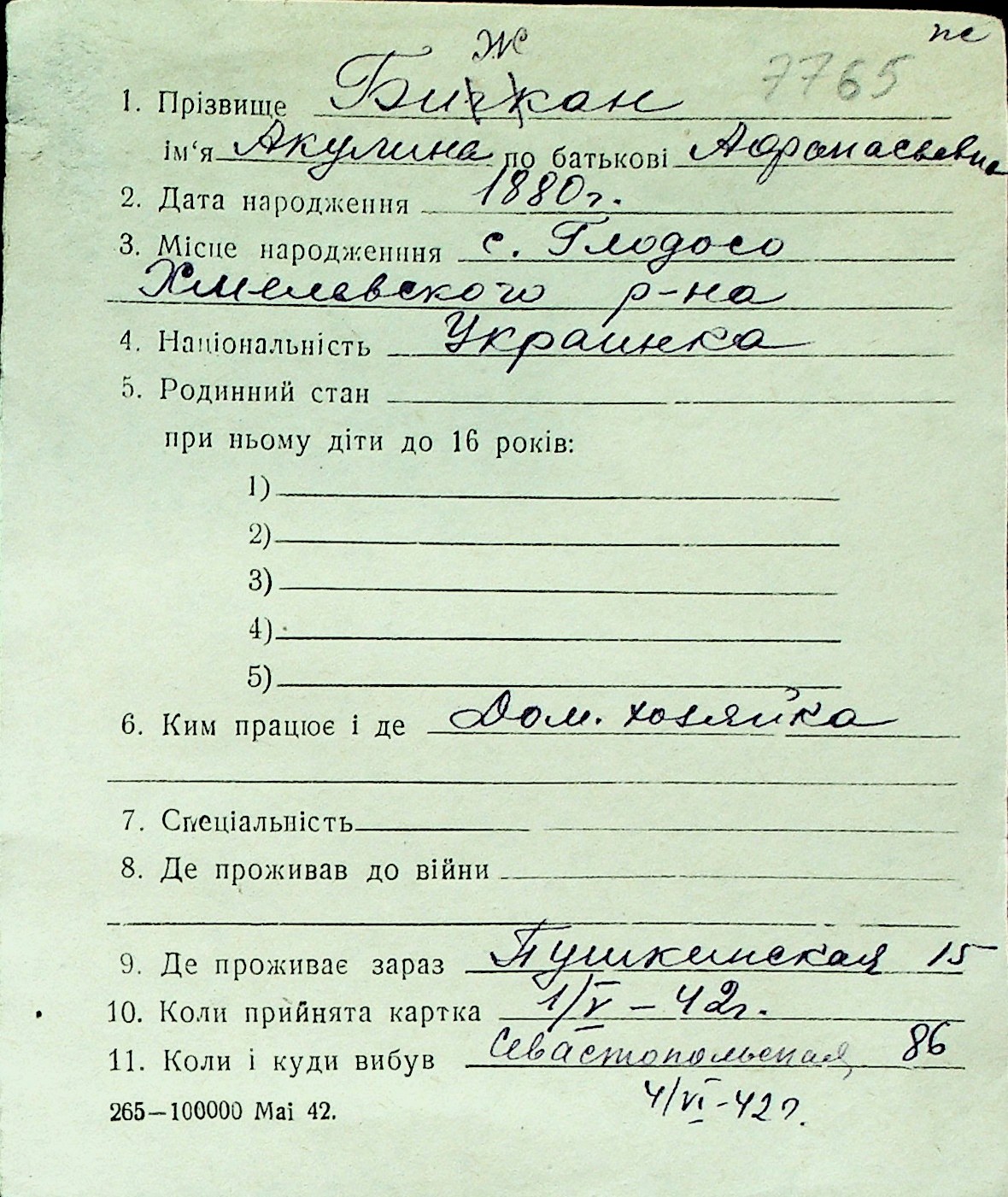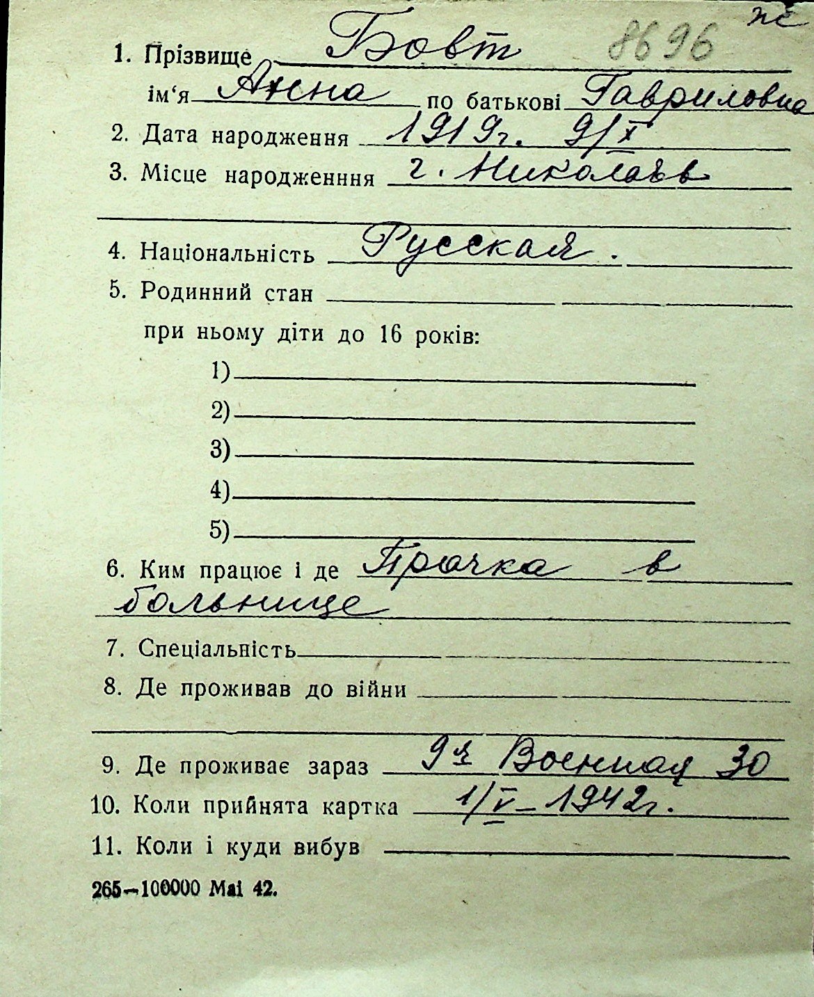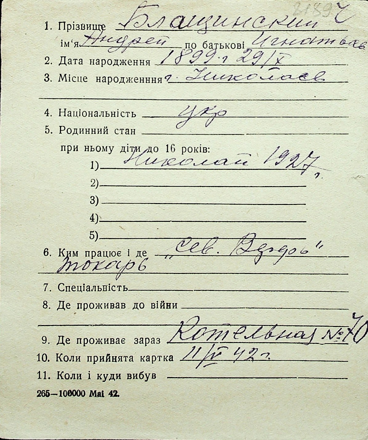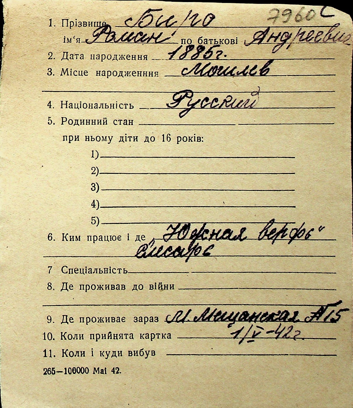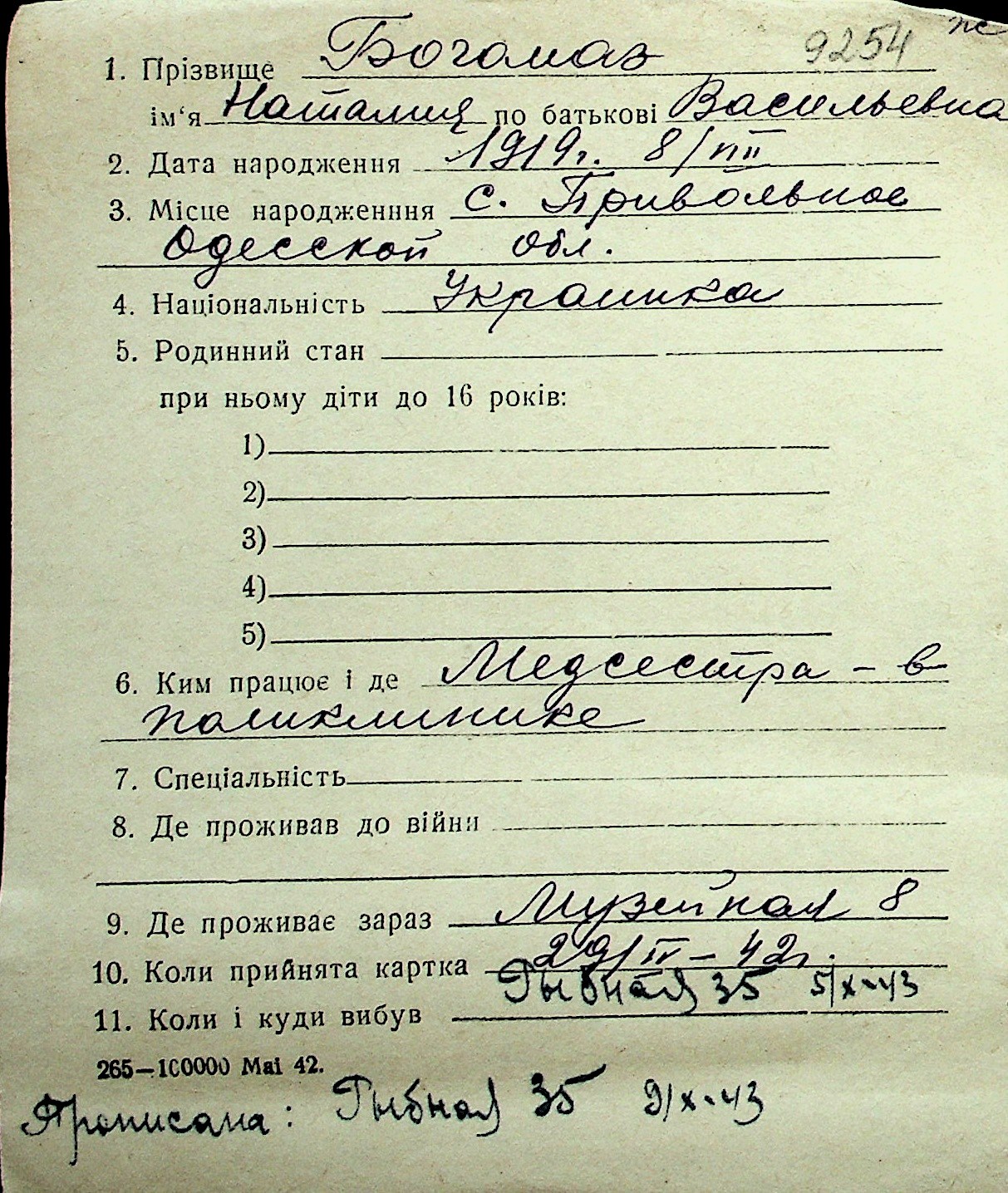 ◦ ◦ Перелік карток на осіб, які мешкали у м. Миколаїв у період окупації 1941–1944 років
