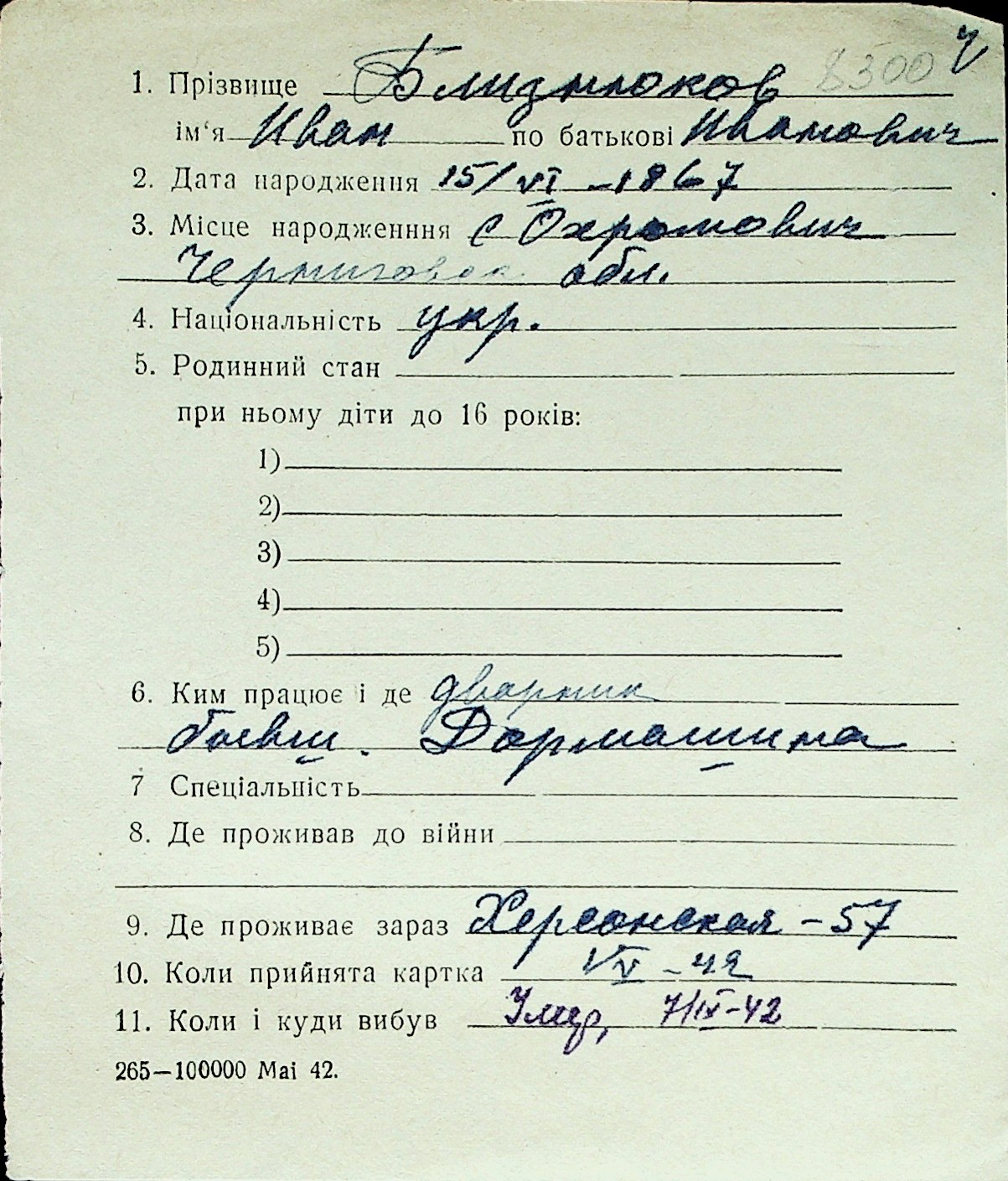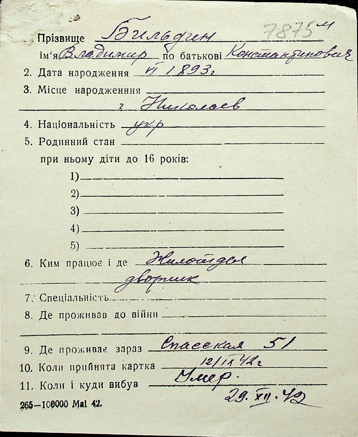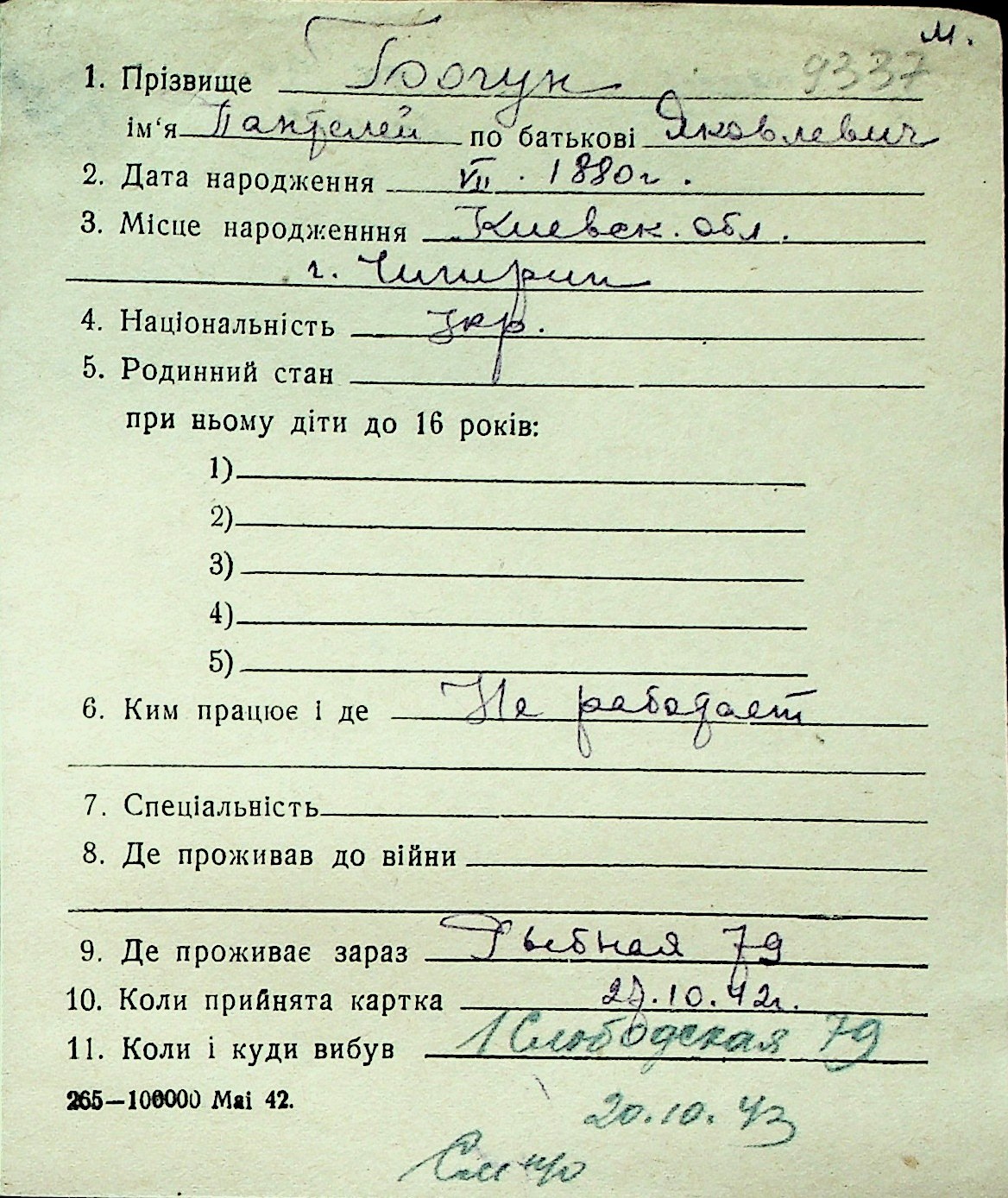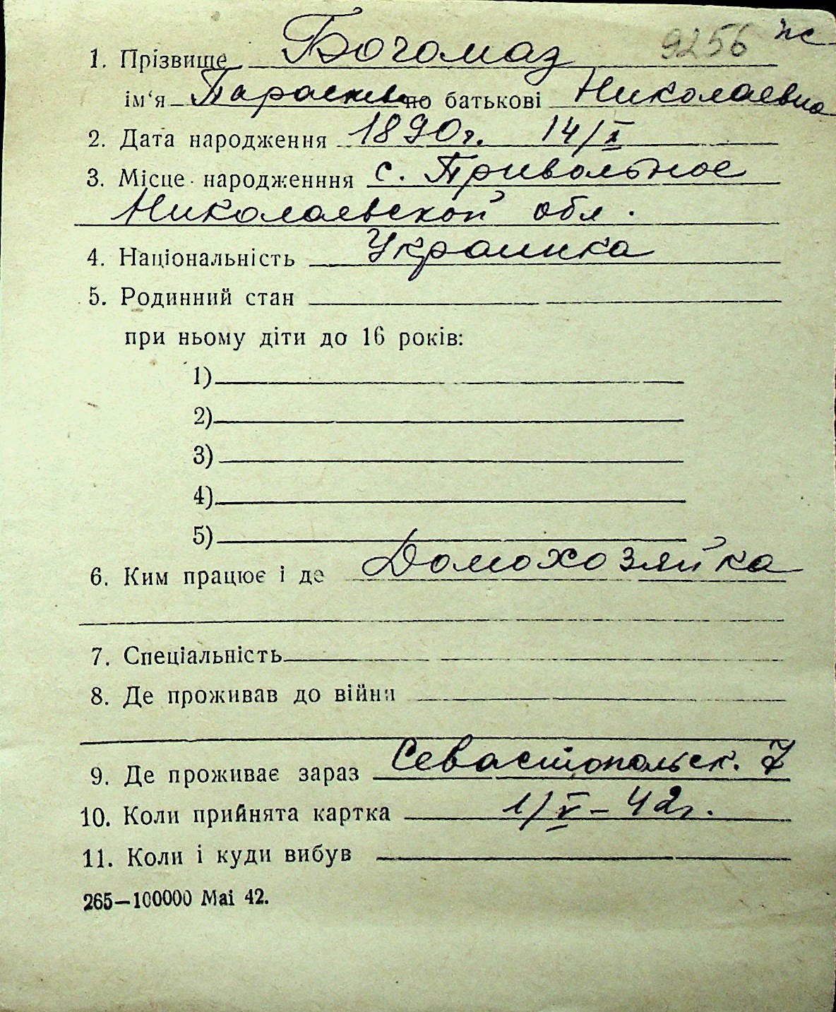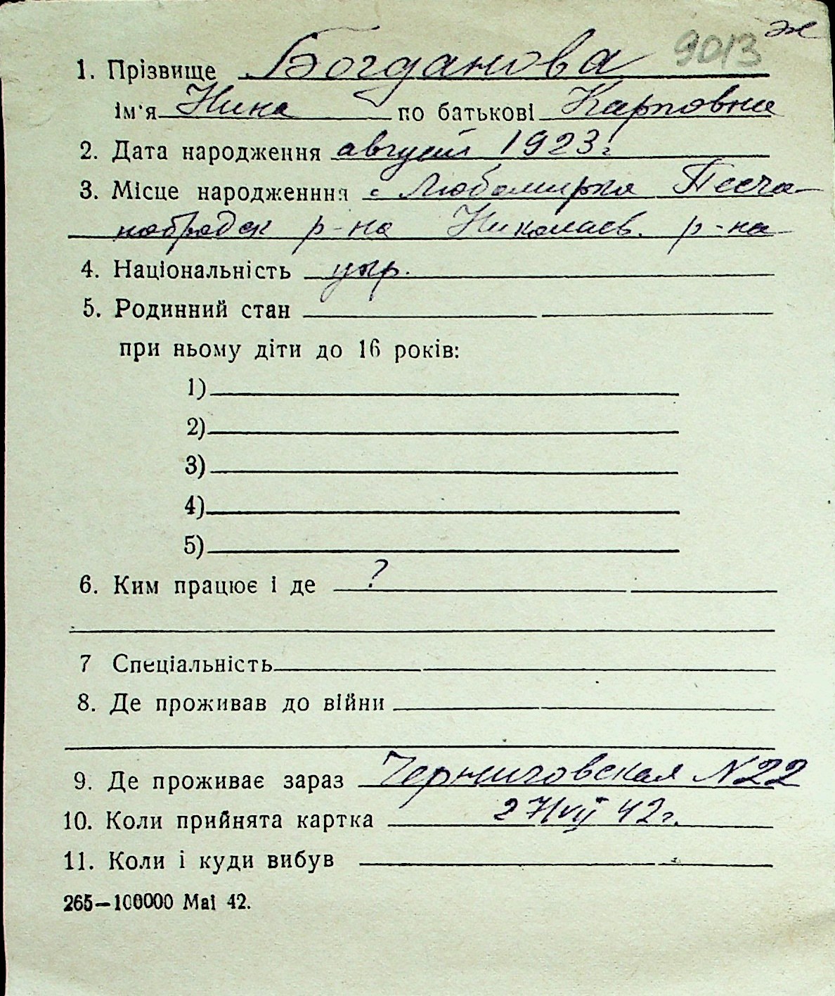 ◦ ◦ Перелік карток на осіб, які мешкали у м. Миколаїв у період окупації 1941–1944 років