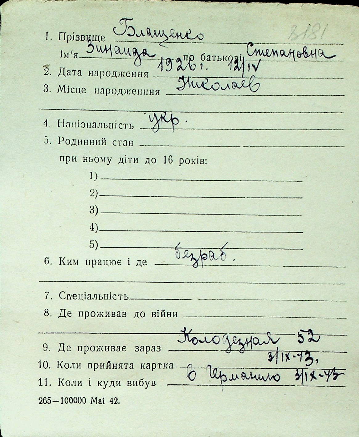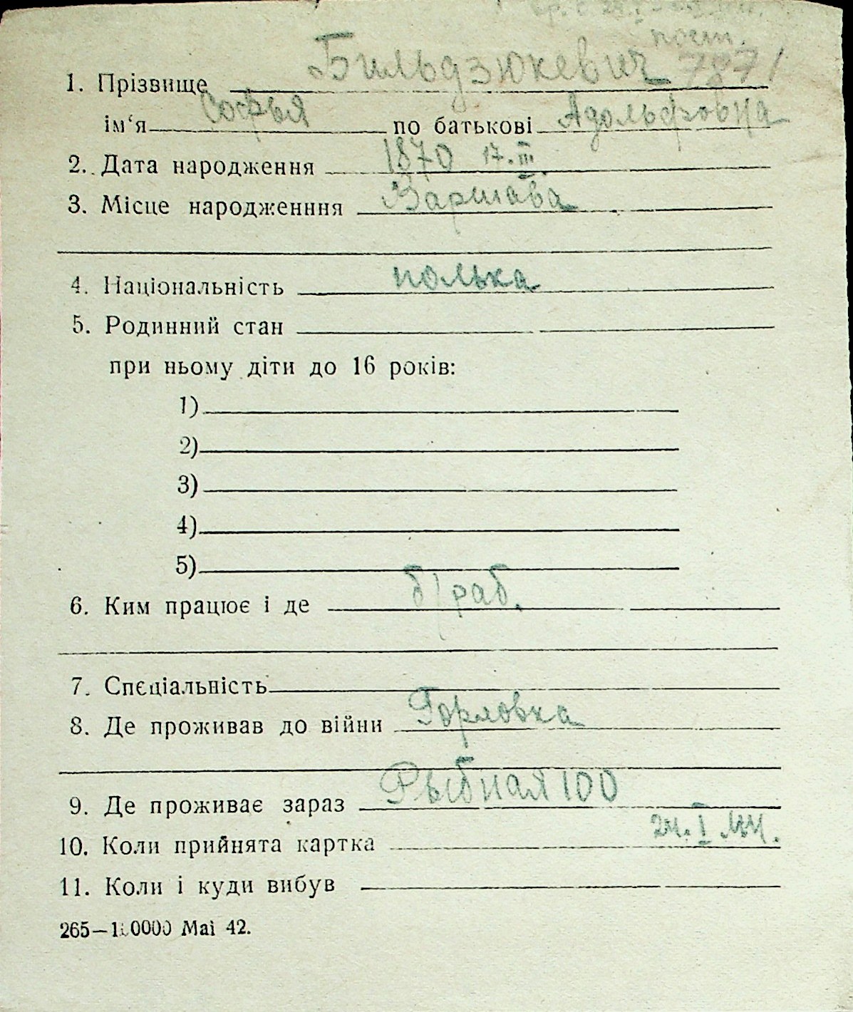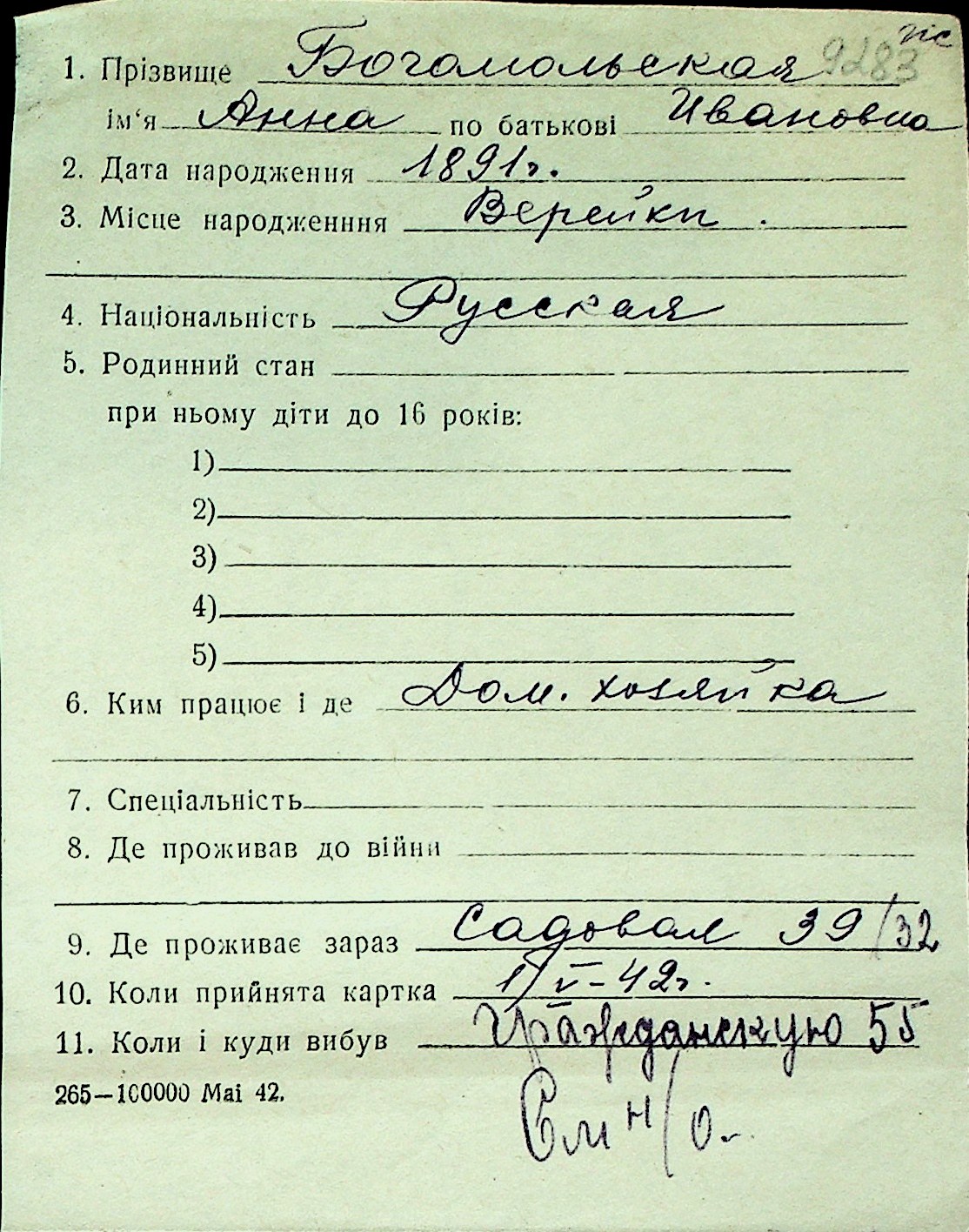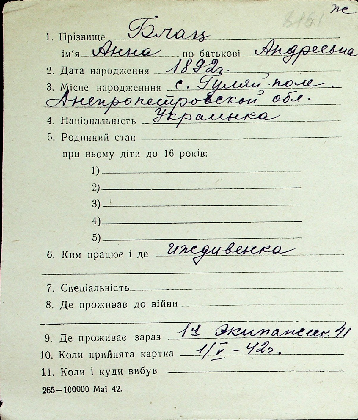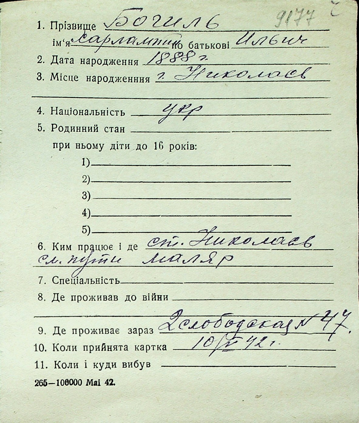 ◦ ◦ Перелік карток на осіб, які мешкали у м. Миколаїв у період окупації 1941–1944 років