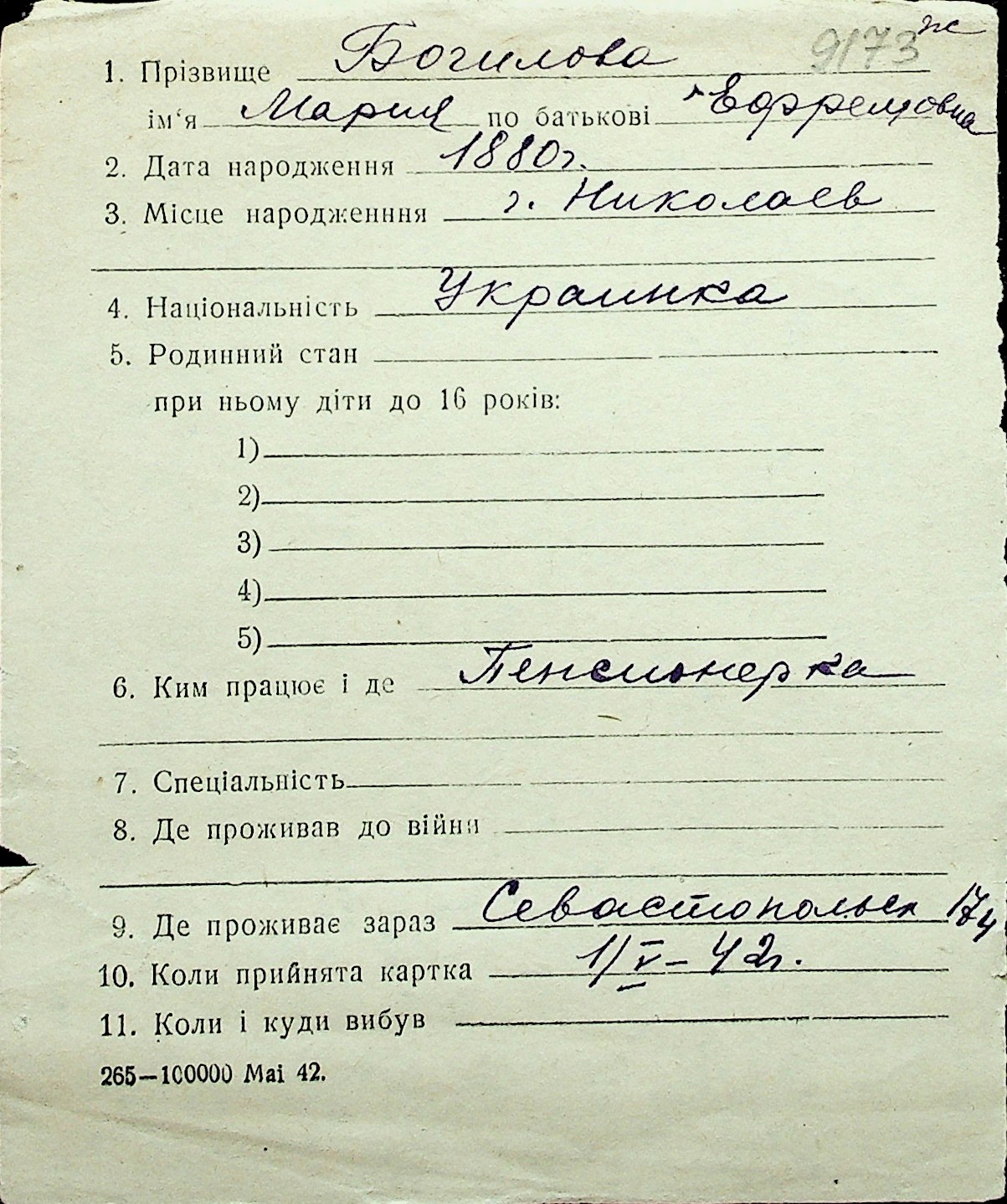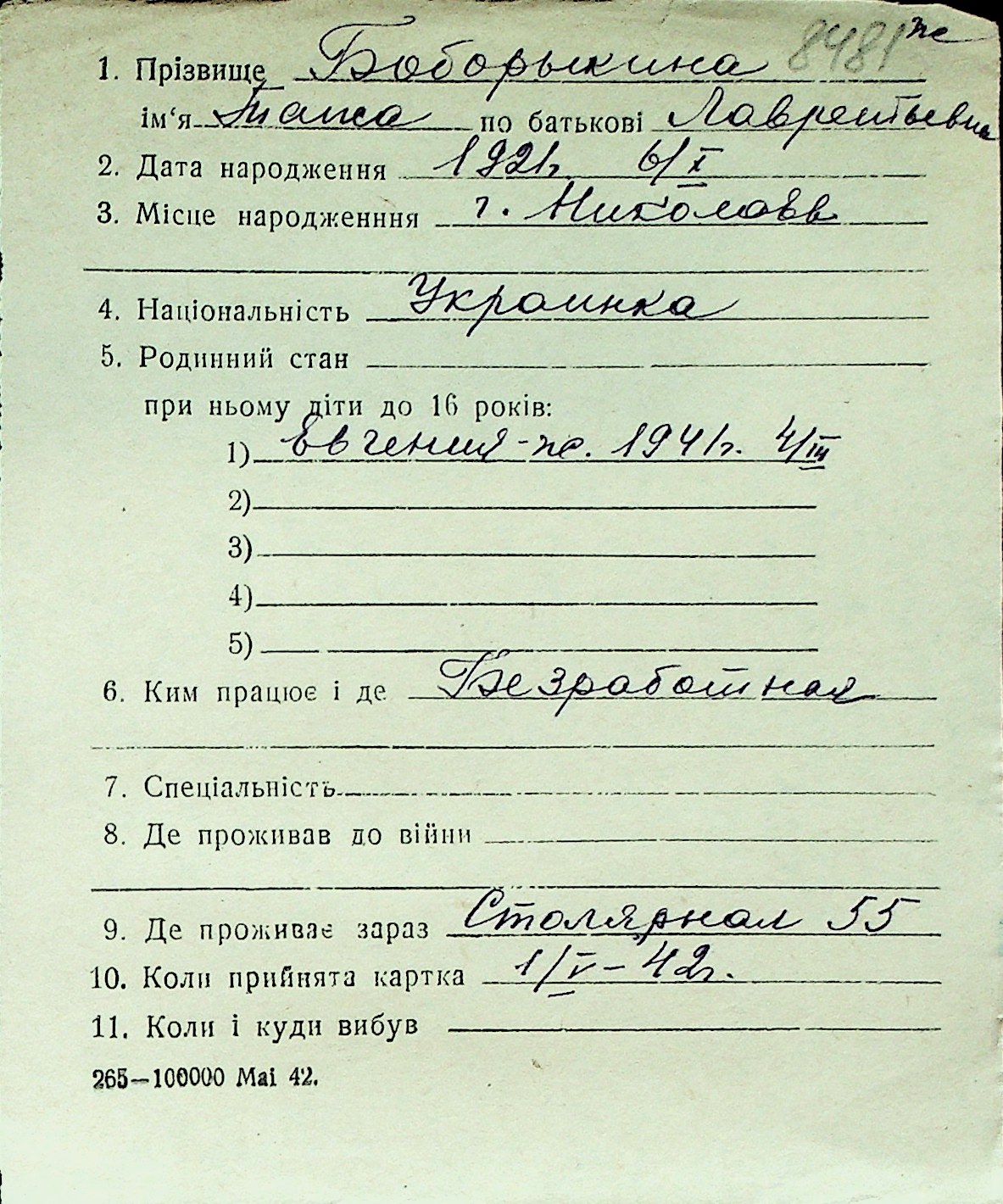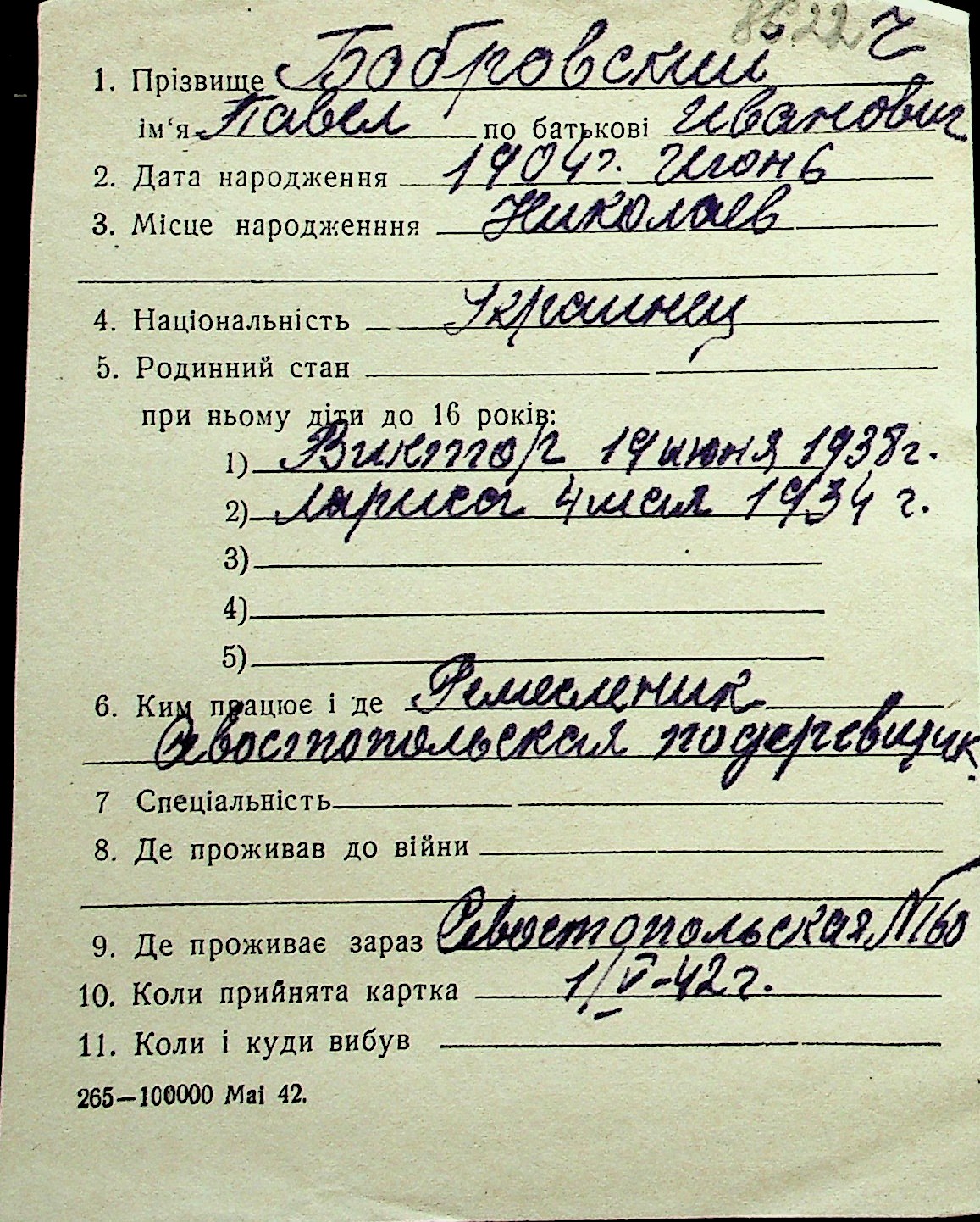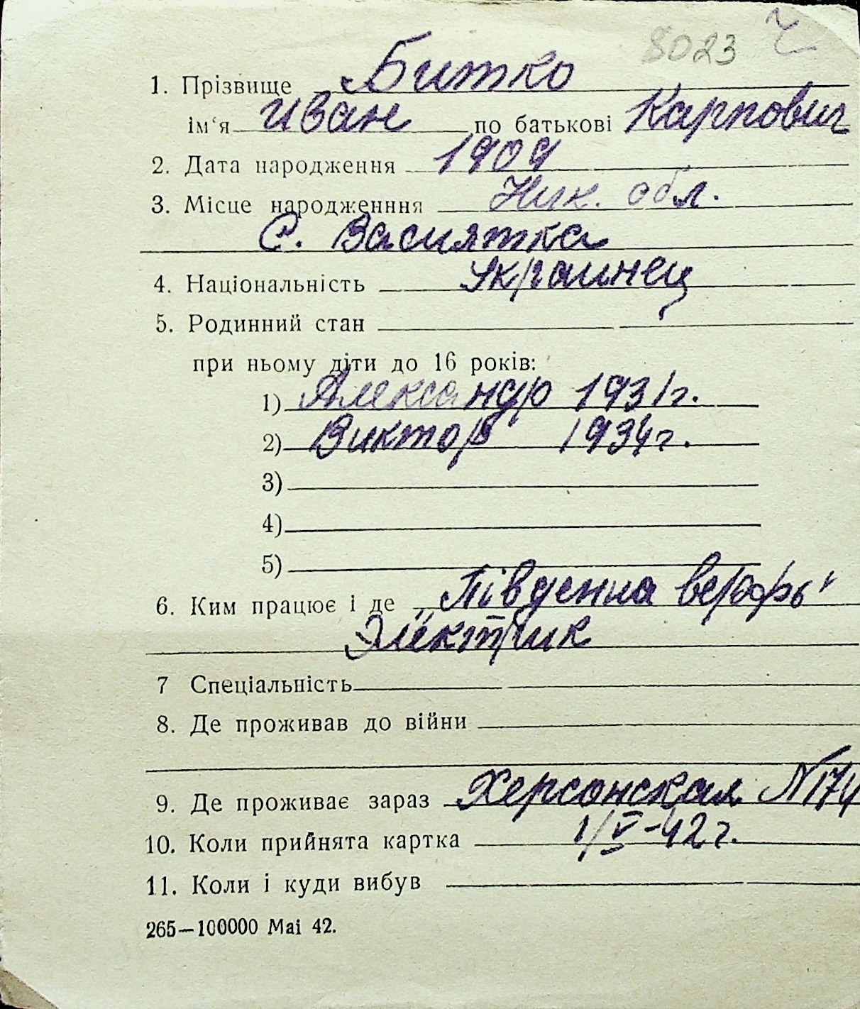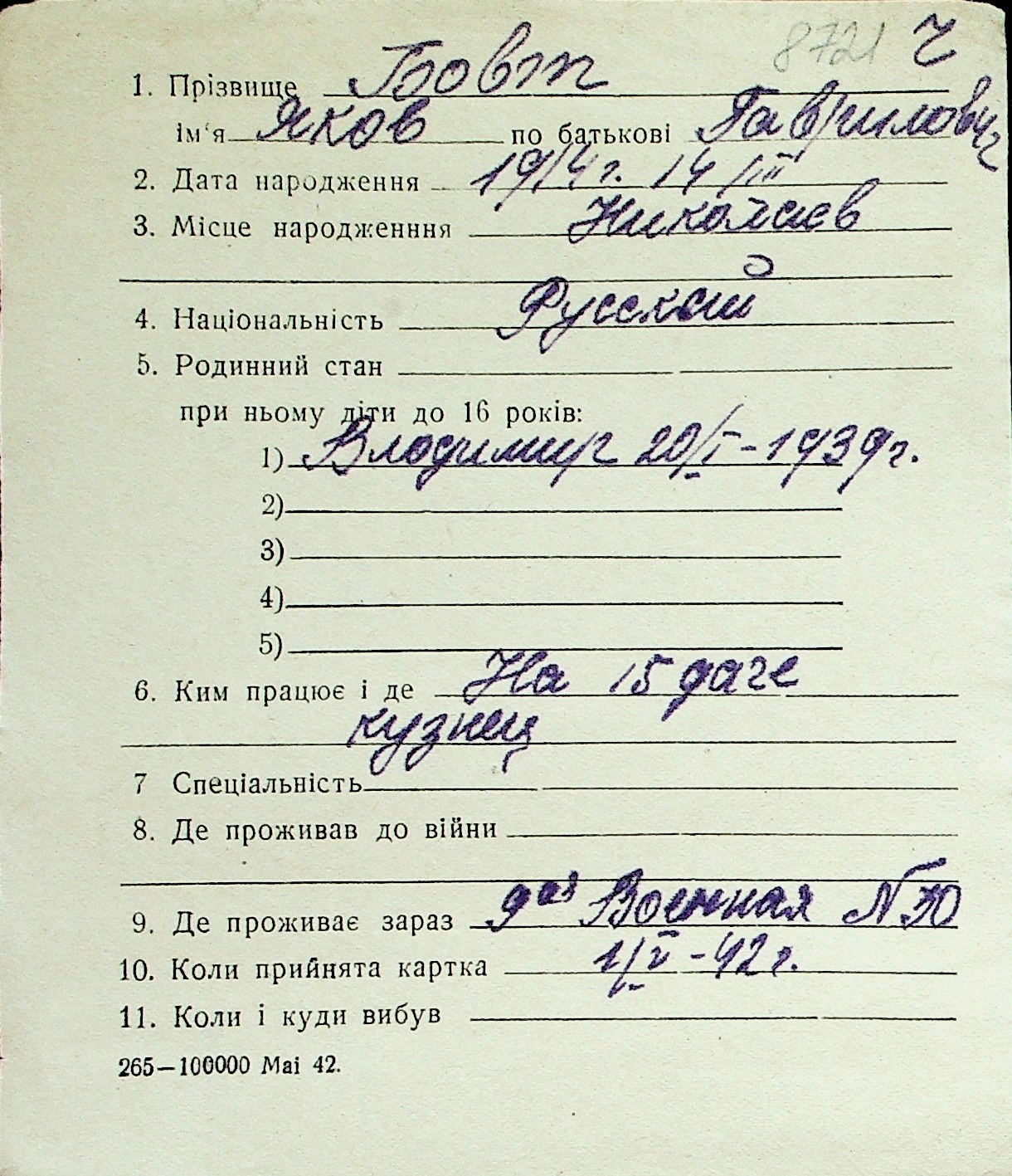 ◦ ◦ Перелік карток на осіб, які мешкали у м. Миколаїв у період окупації 1941–1944 років