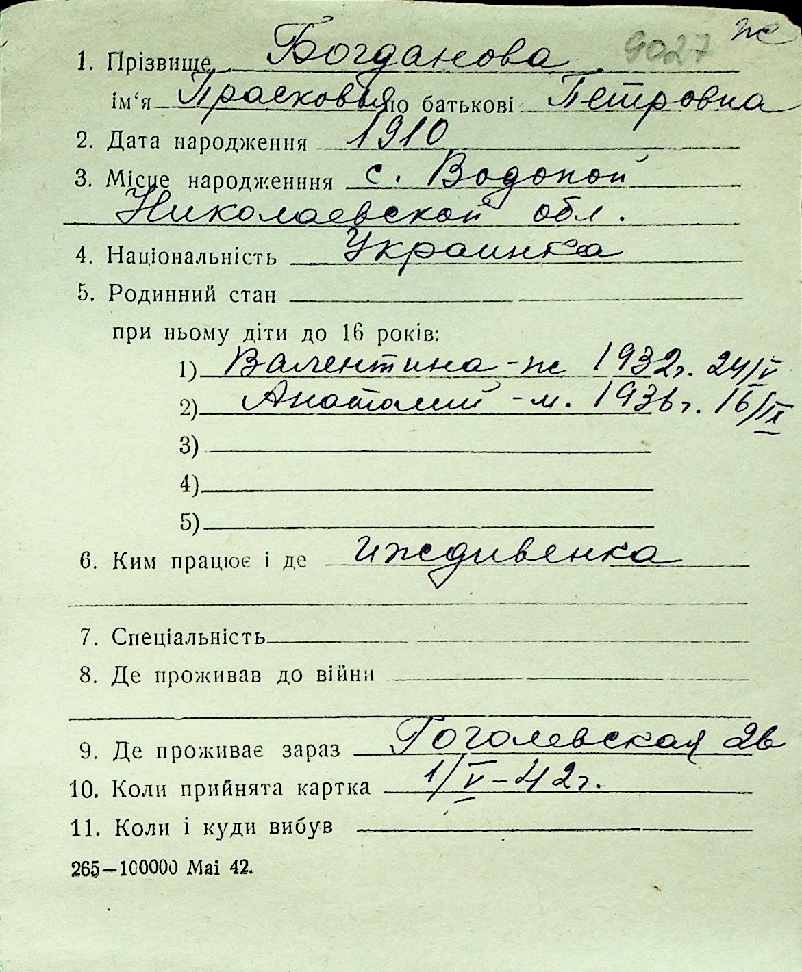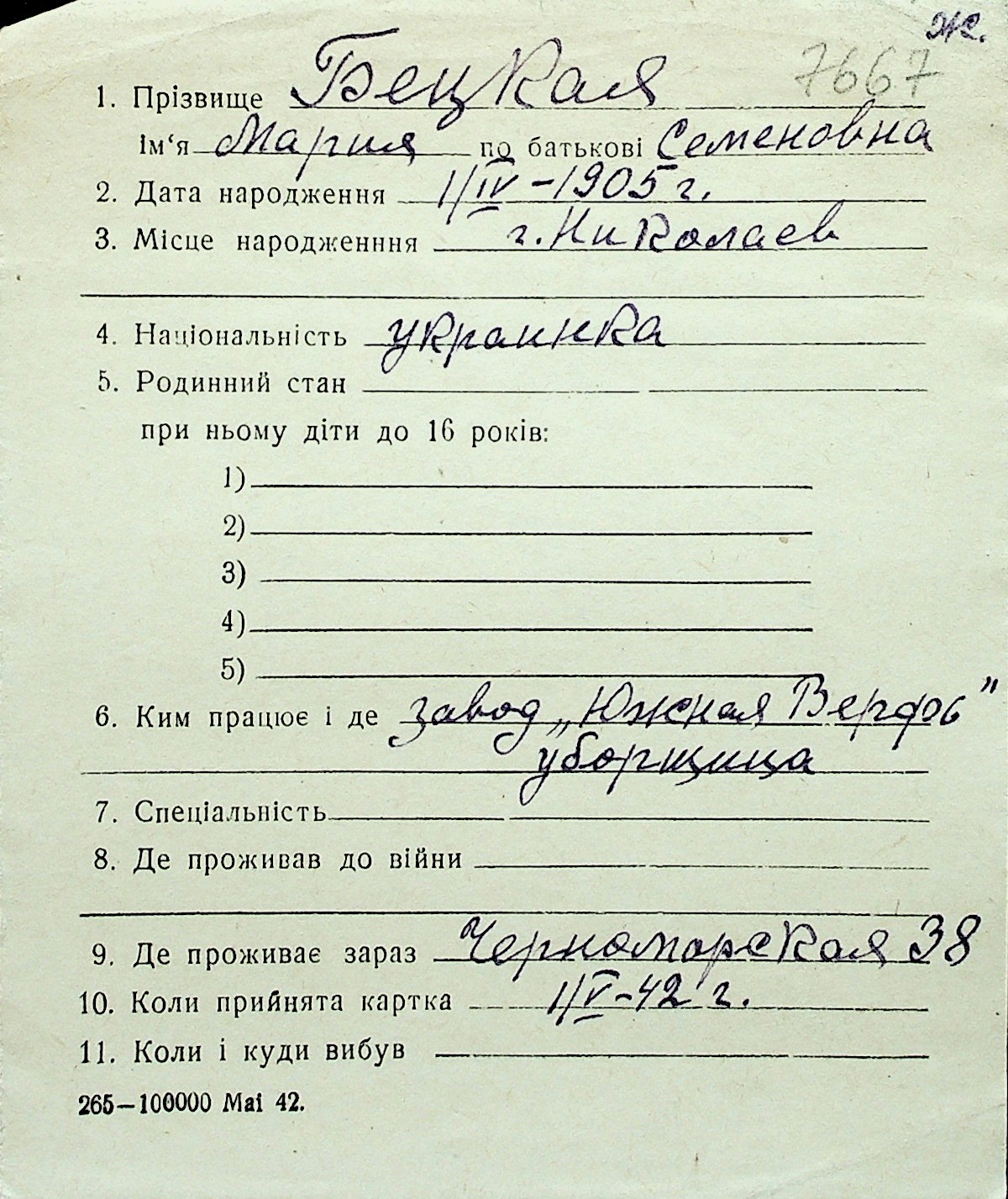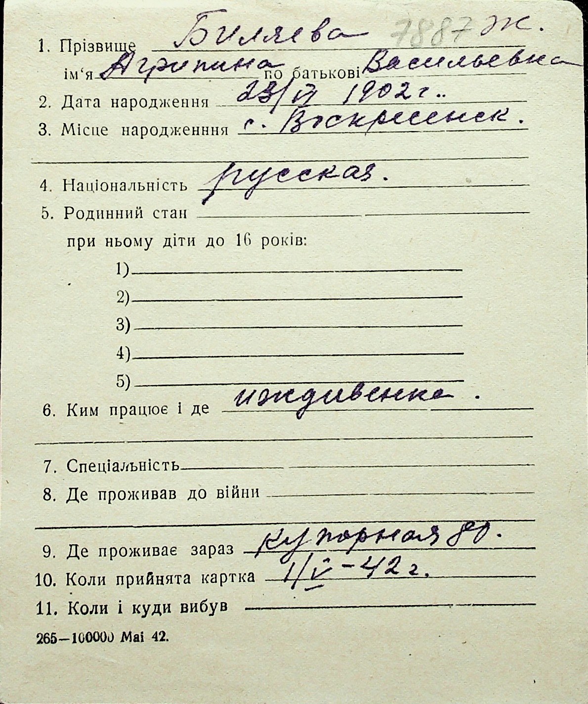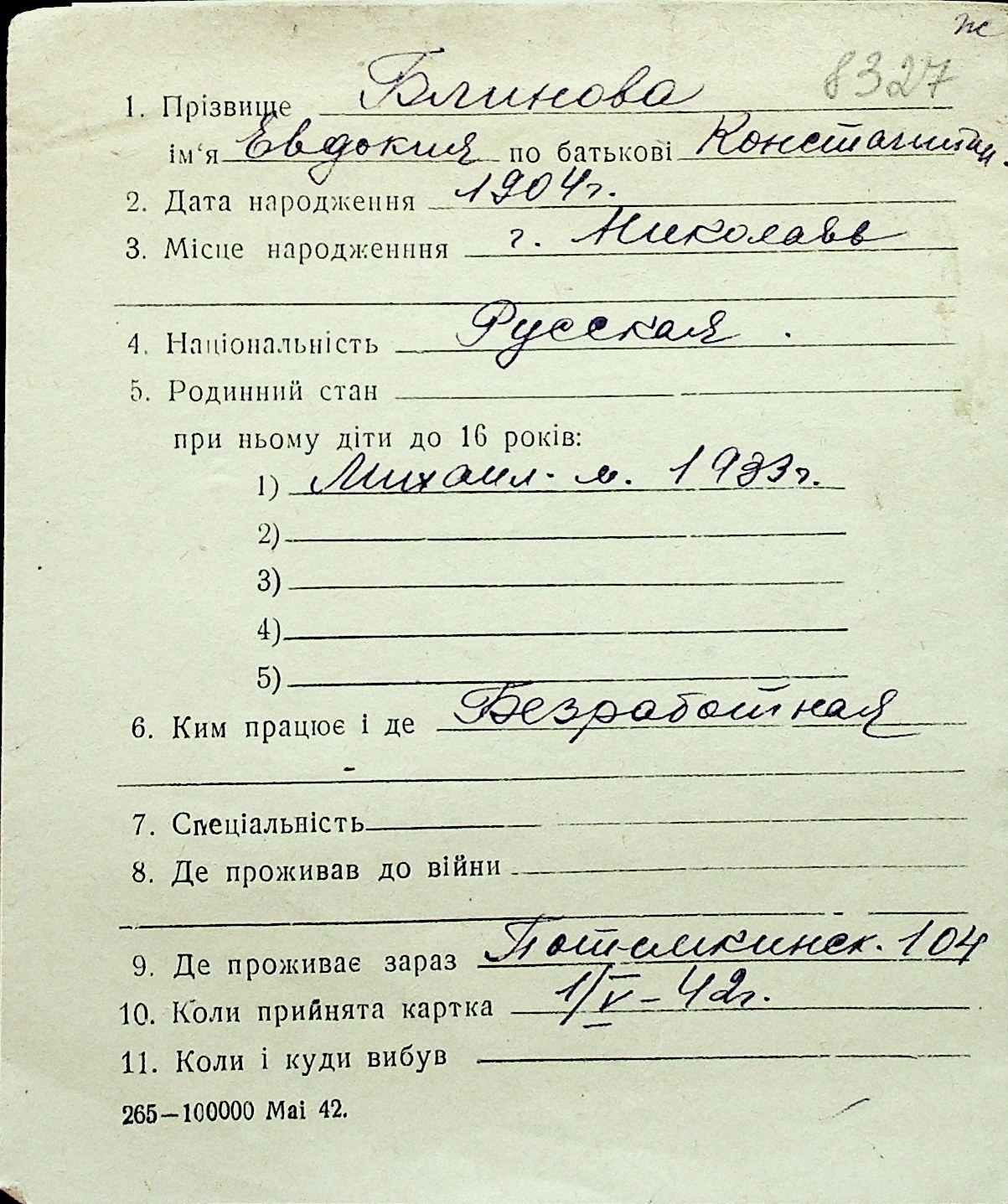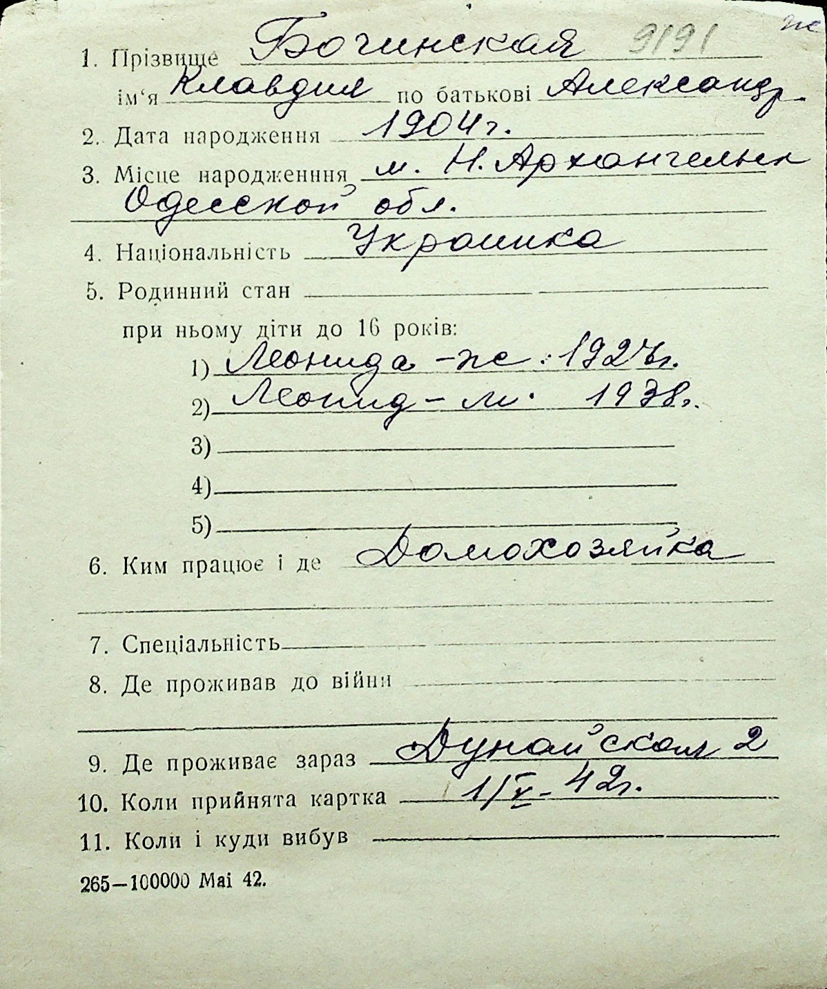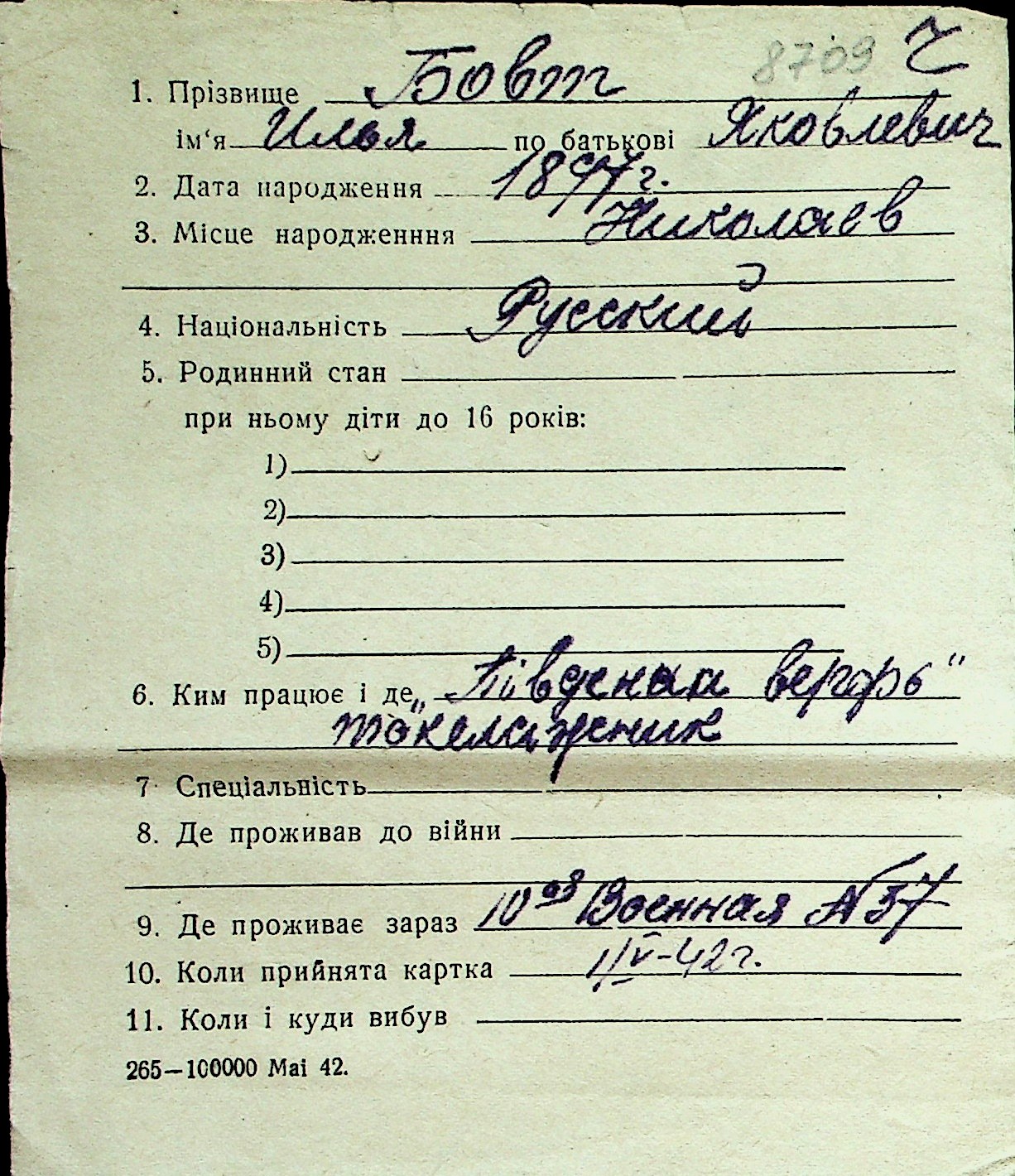 ◦ ◦ Перелік карток на осіб, які мешкали у м. Миколаїв у період окупації 1941–1944 років