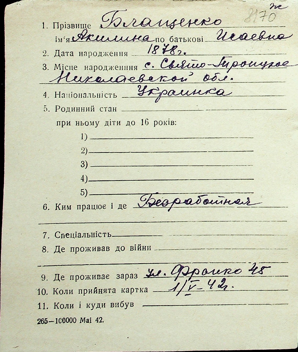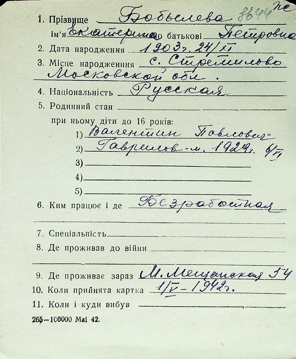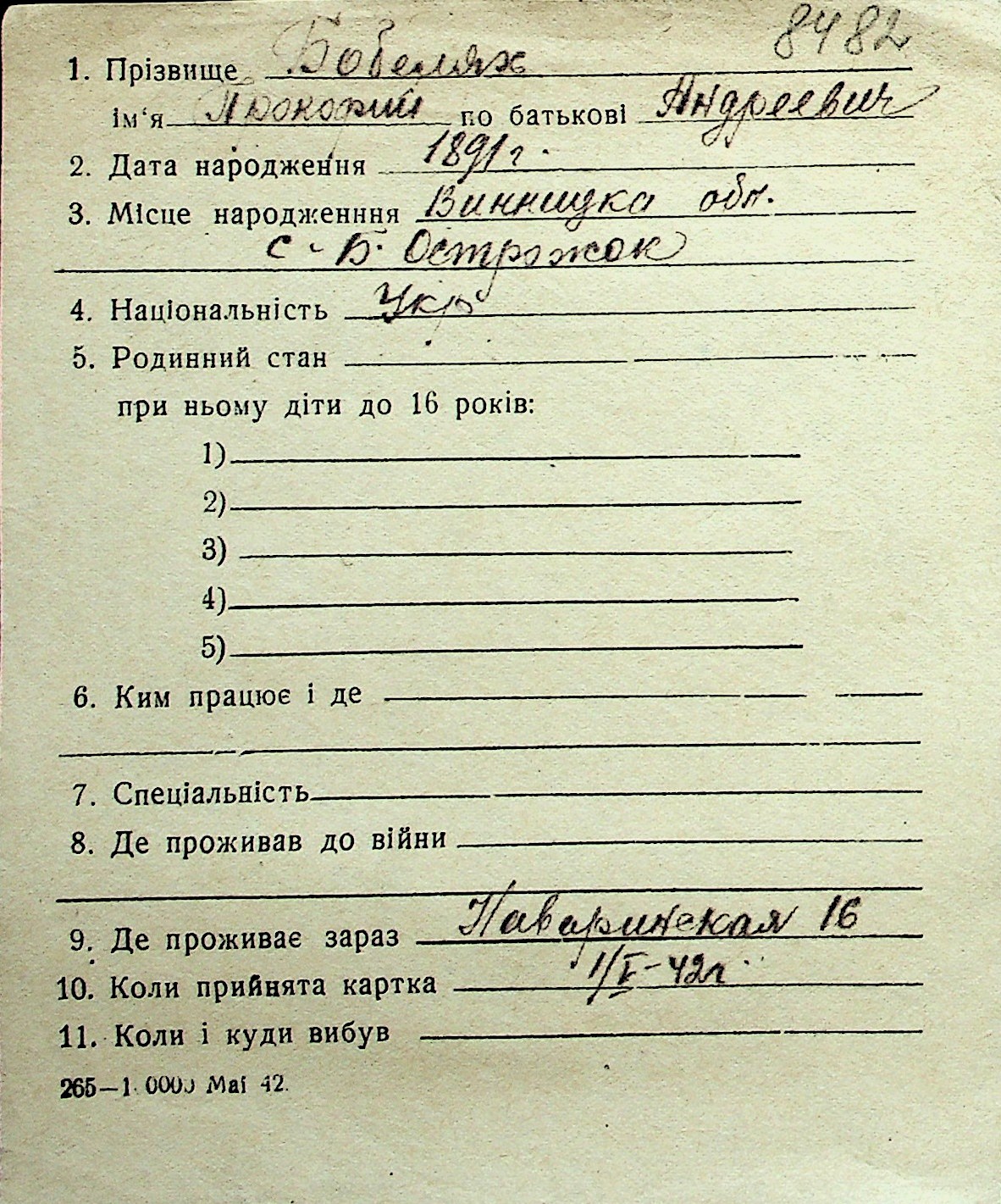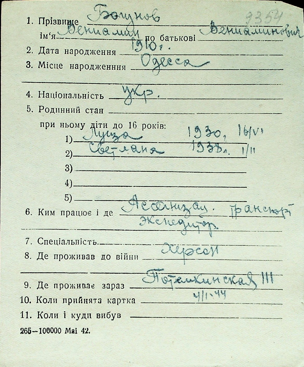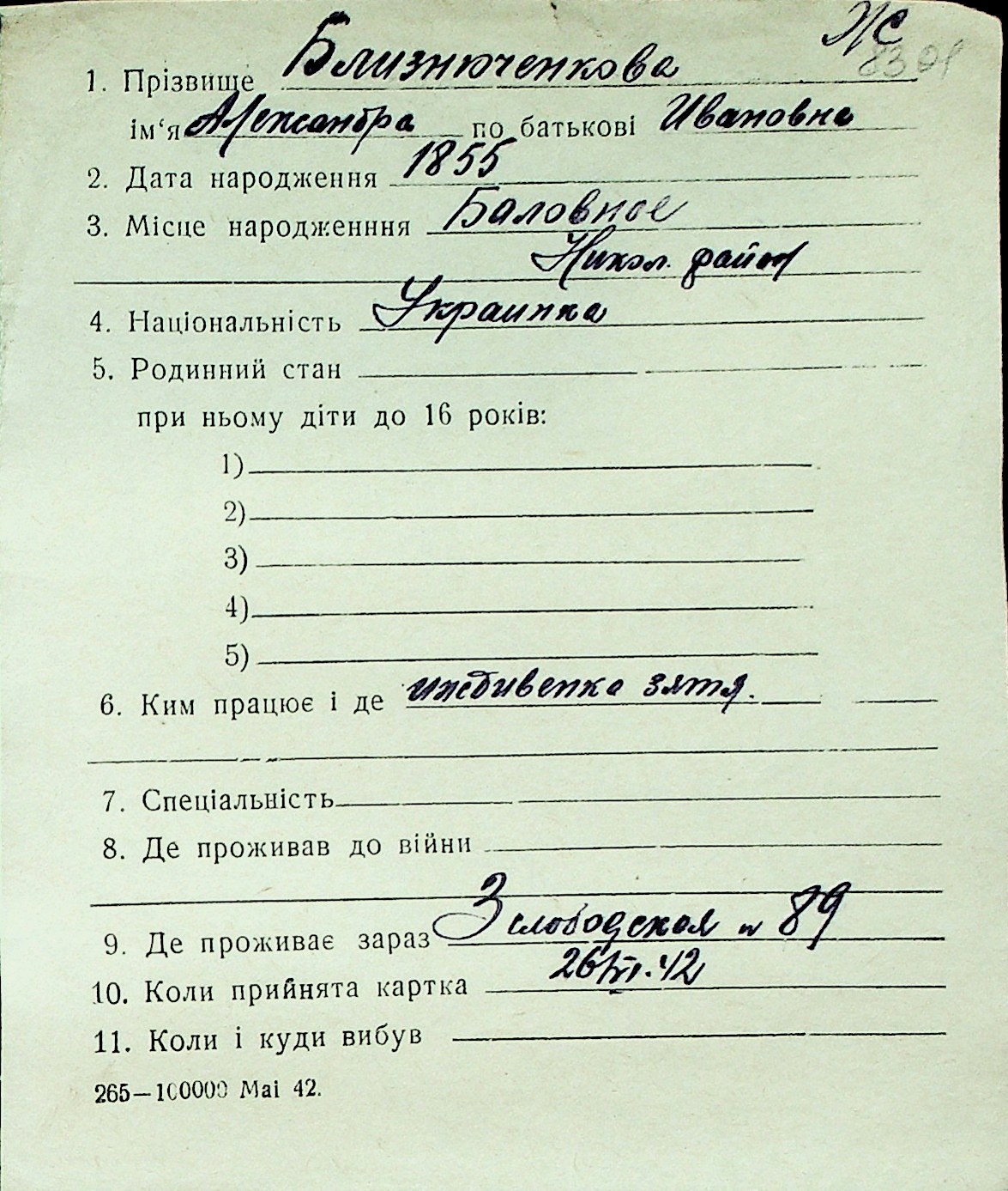 ◦ ◦ Перелік карток на осіб, які мешкали у м. Миколаїв у період окупації 1941–1944 років