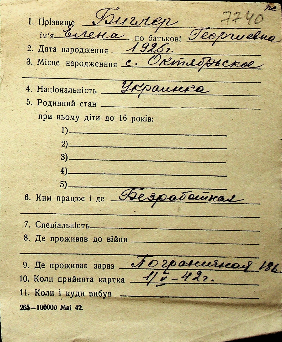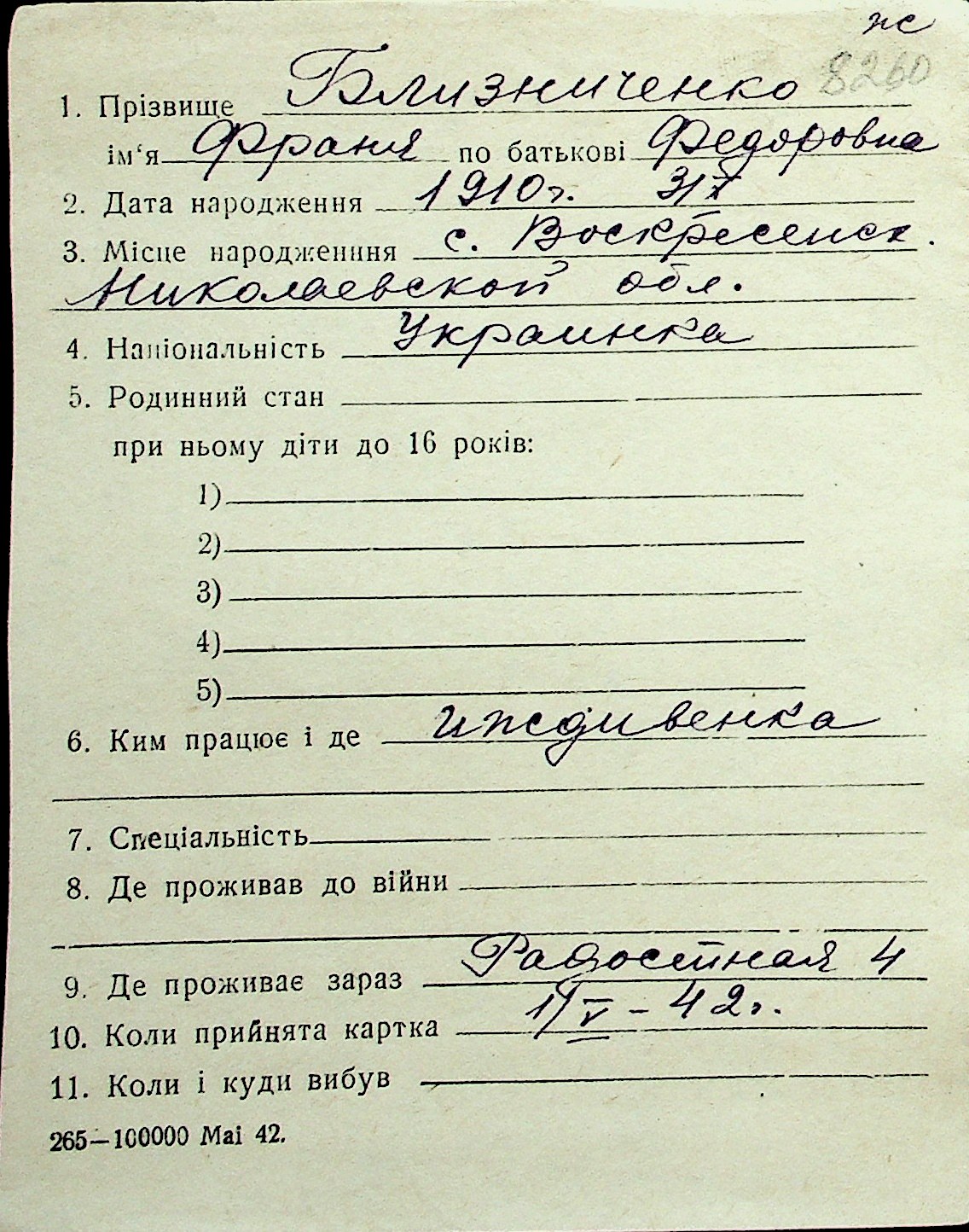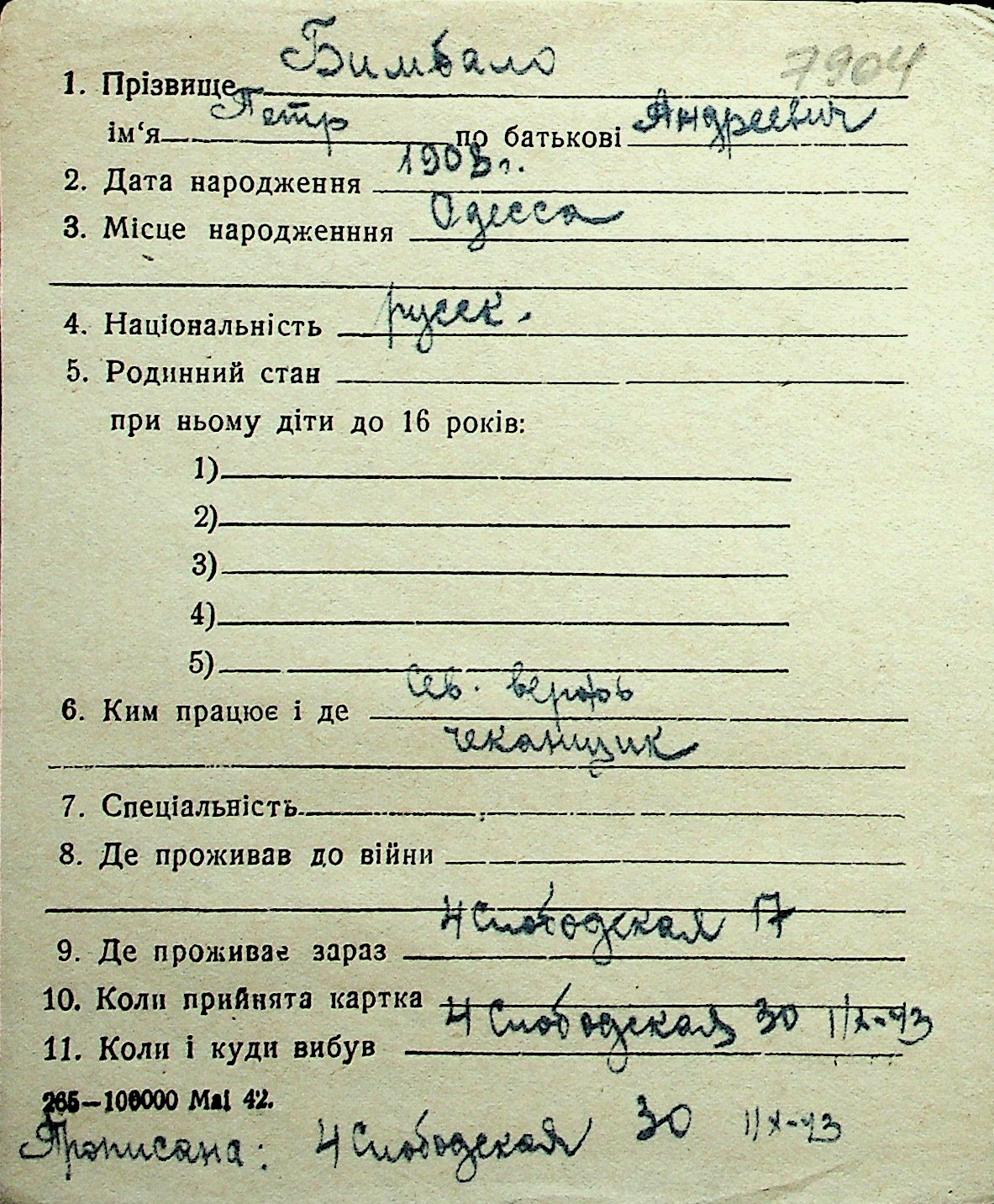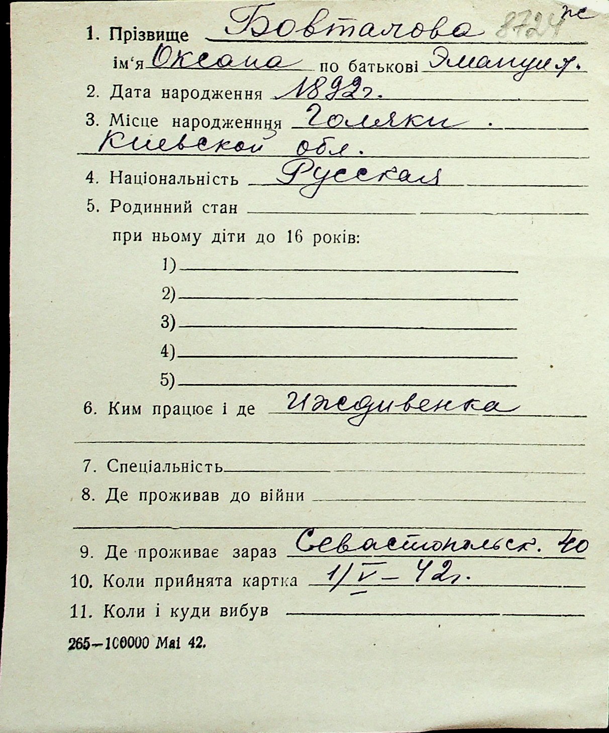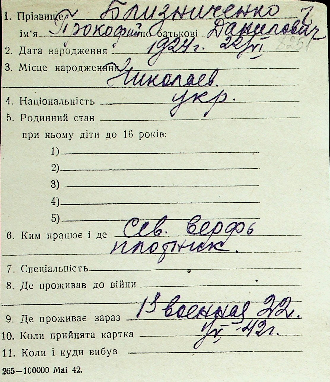 ◦ ◦ Перелік карток на осіб, які мешкали у м. Миколаїв у період окупації 1941–1944 років