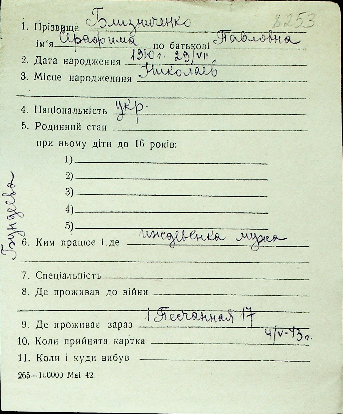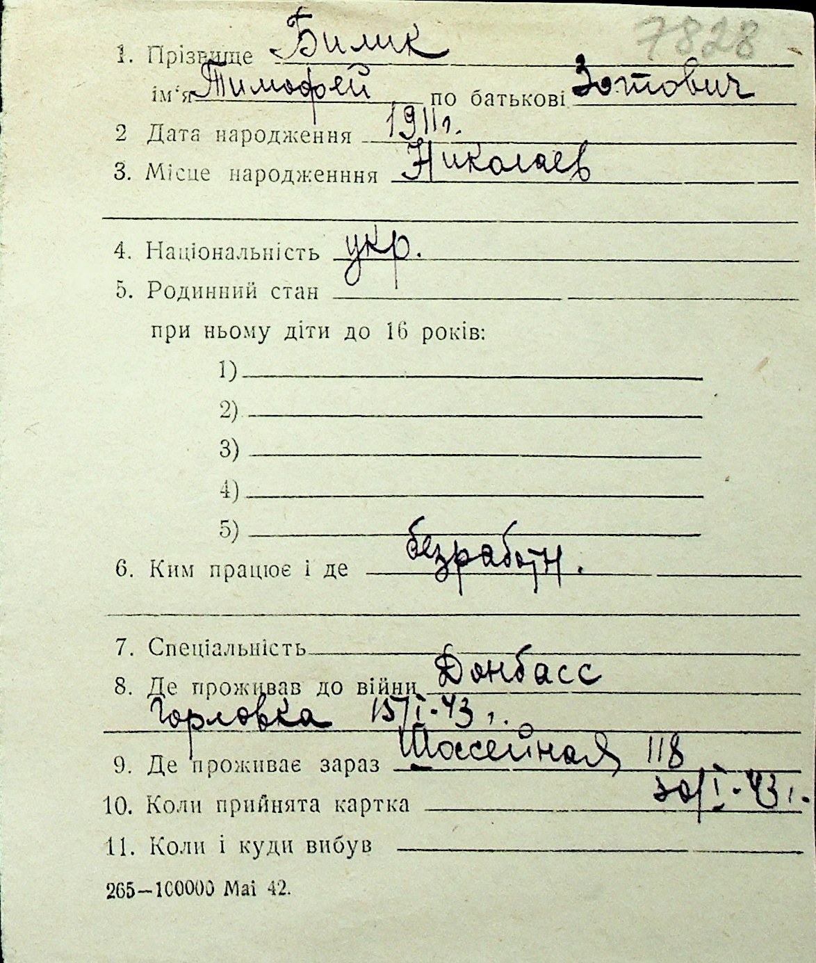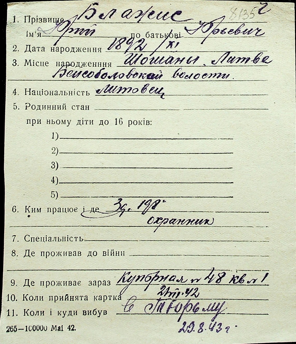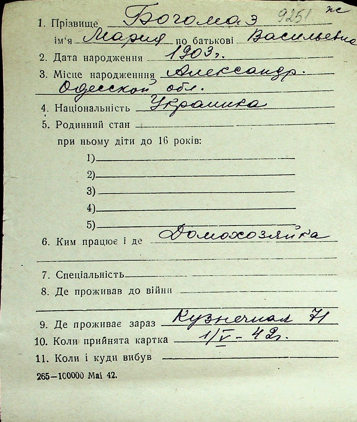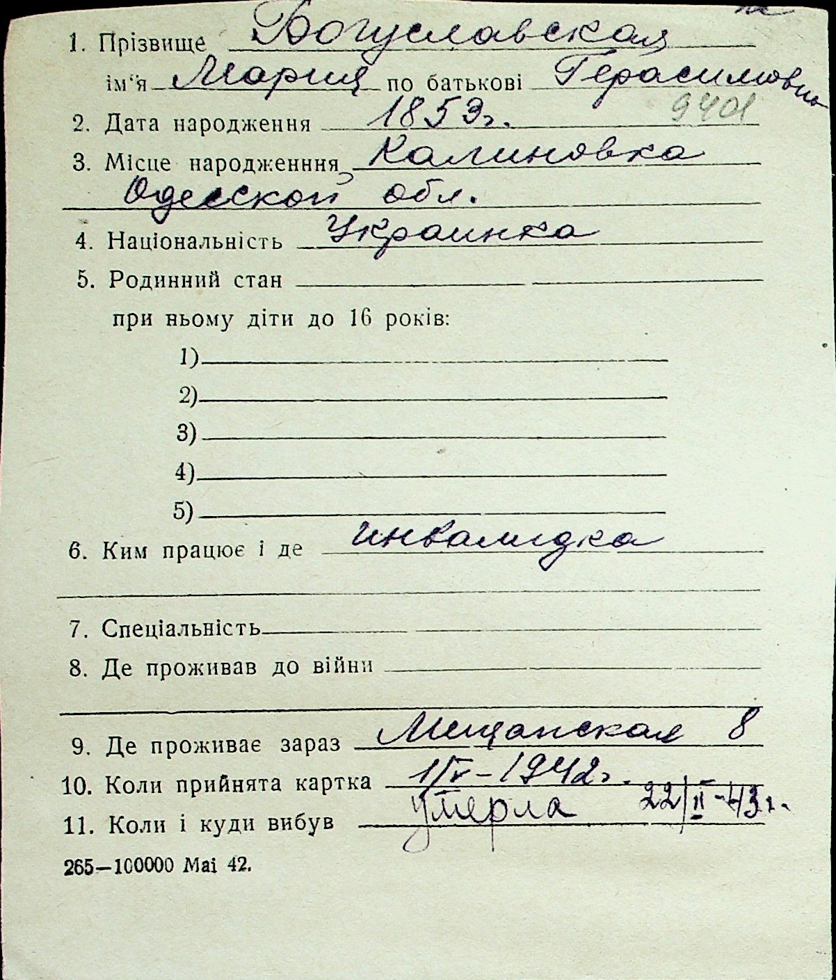 ◦ ◦ Перелік карток на осіб, які мешкали у м. Миколаїв у період окупації 1941–1944 років