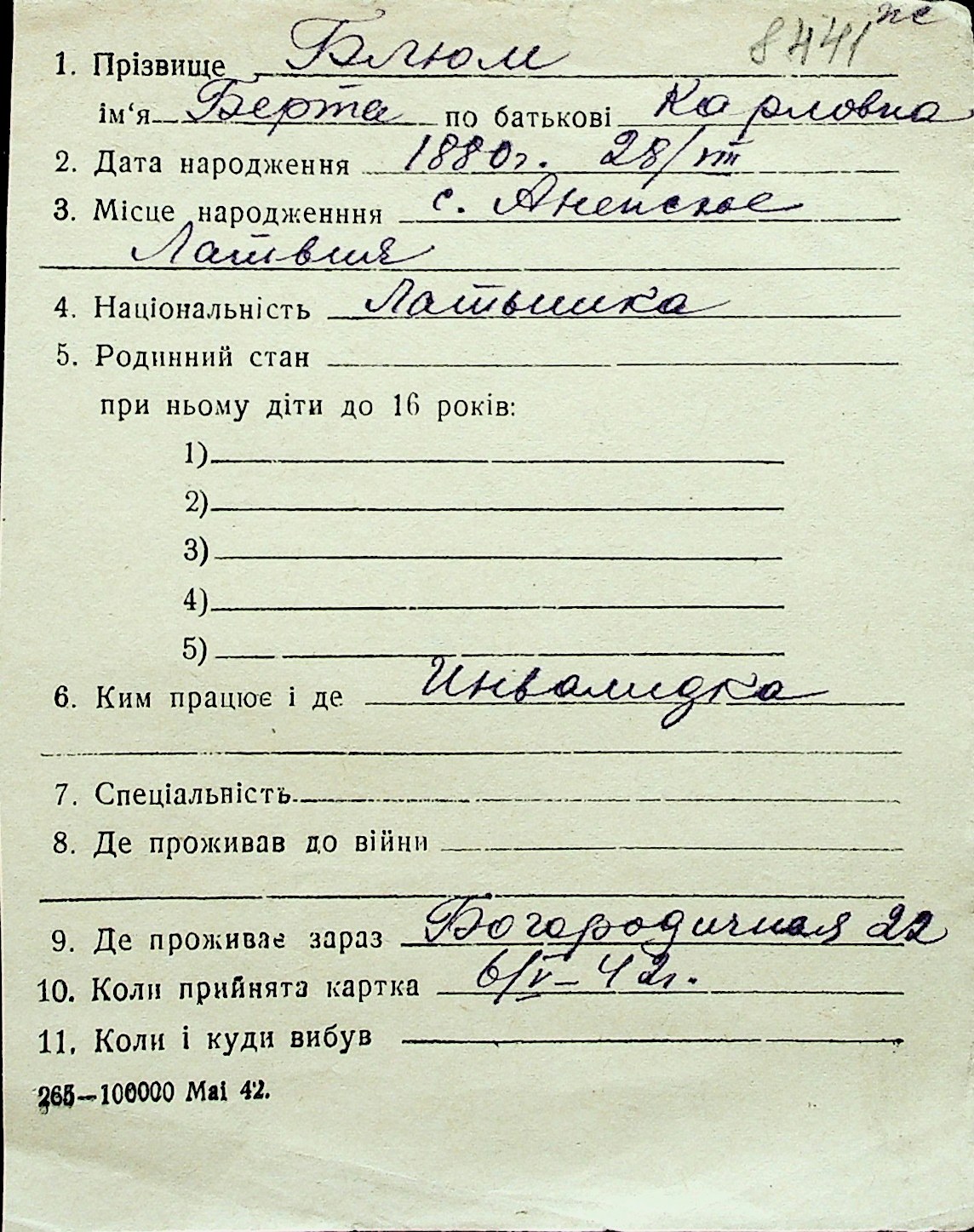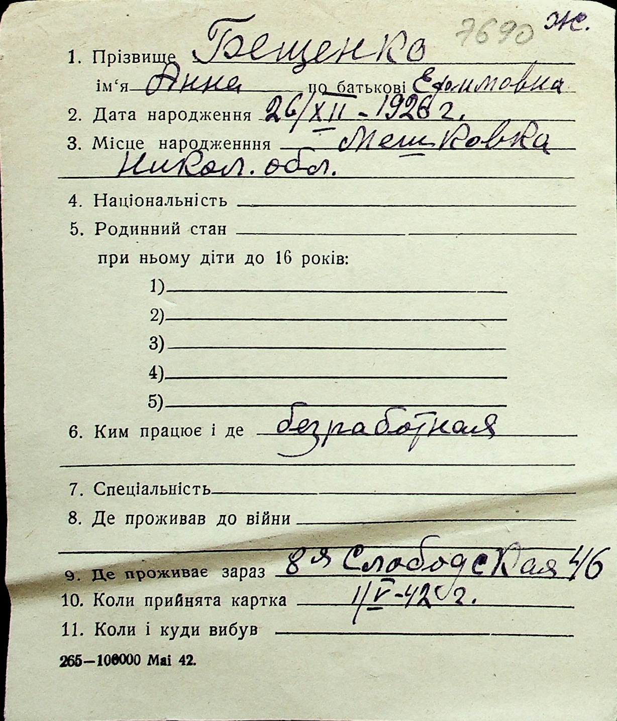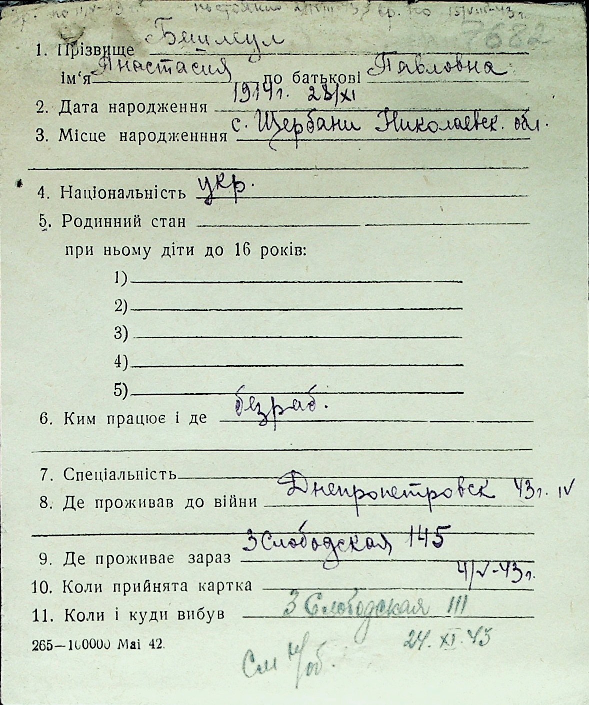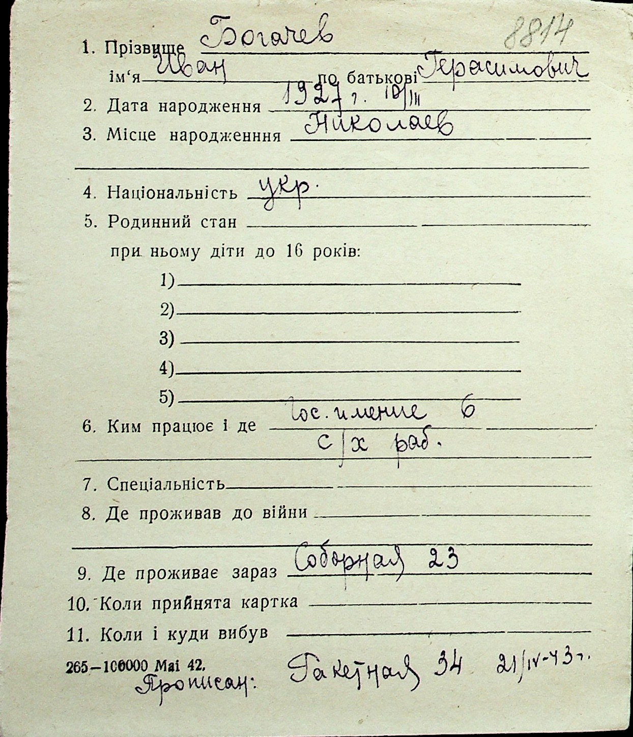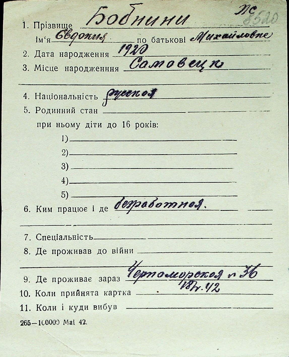 ◦ ◦ Перелік карток на осіб, які мешкали у м. Миколаїв у період окупації 1941–1944 років