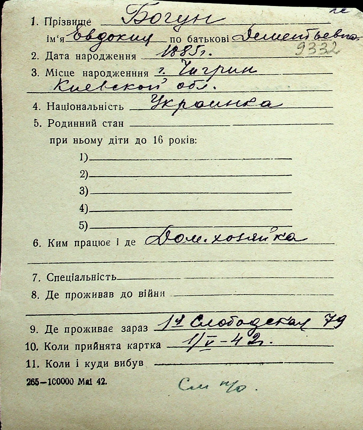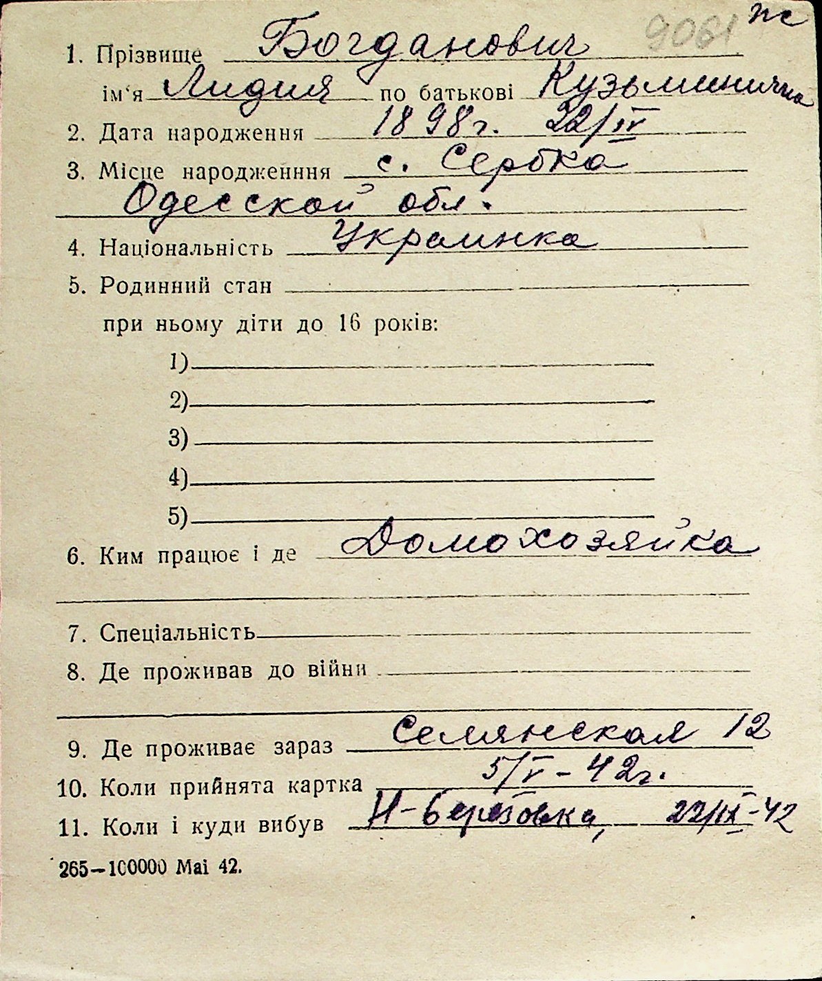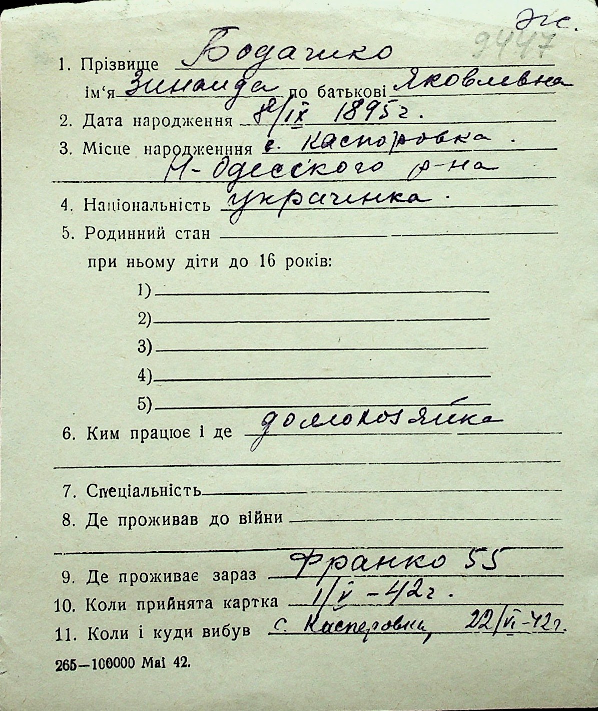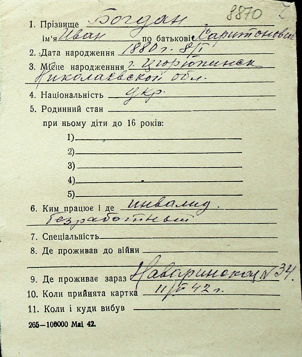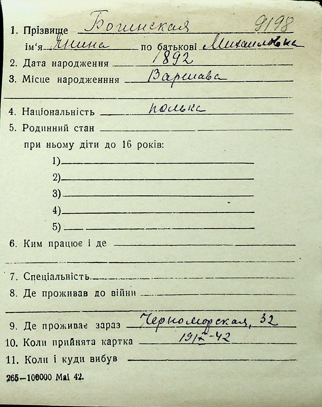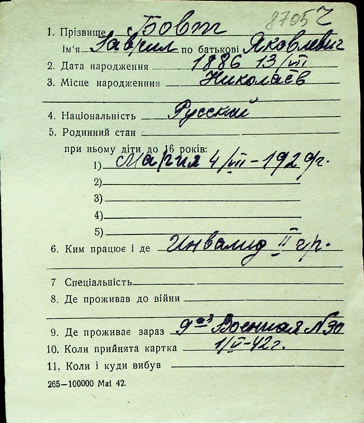◦ ◦ Перелік карток на осіб, які мешкали у м. Миколаїв у період окупації 1941–1944 років