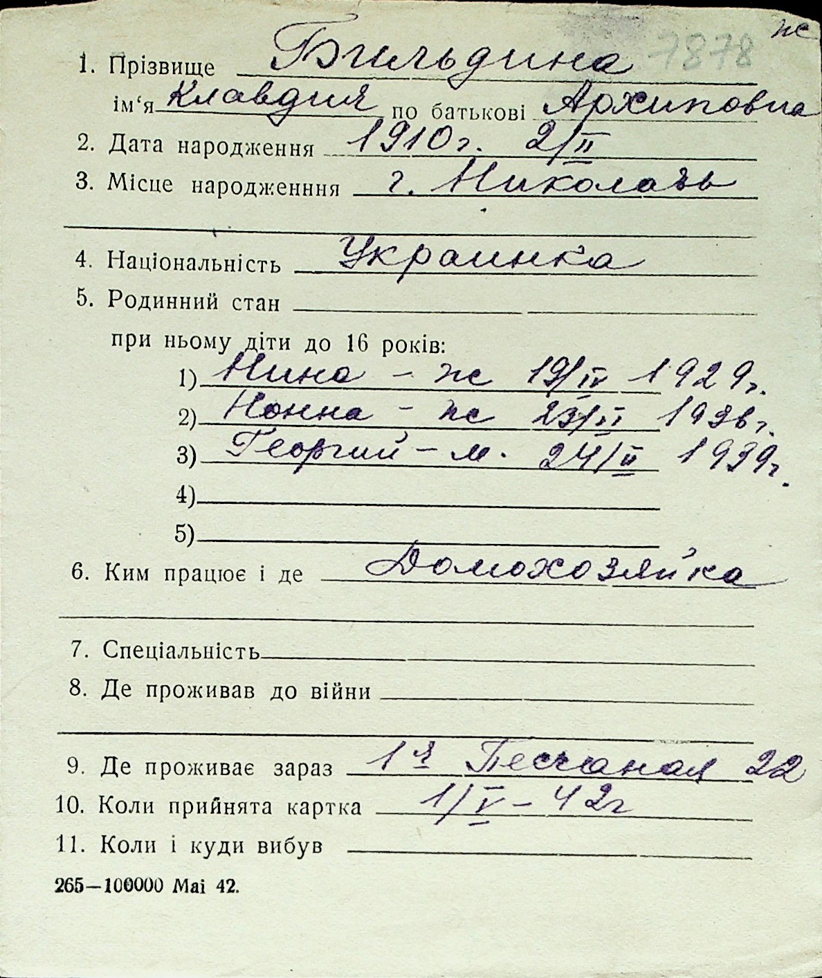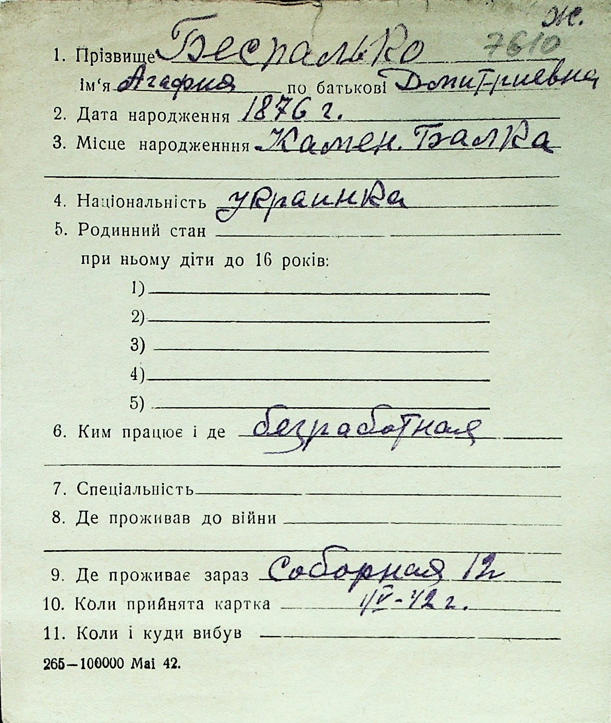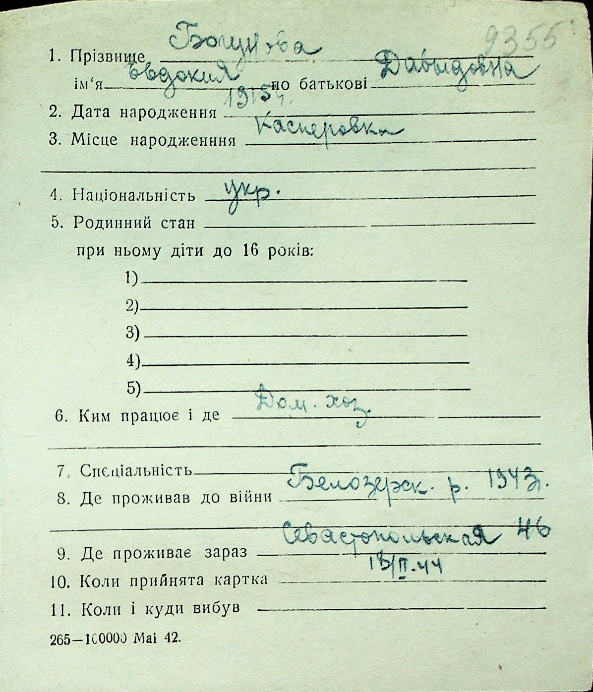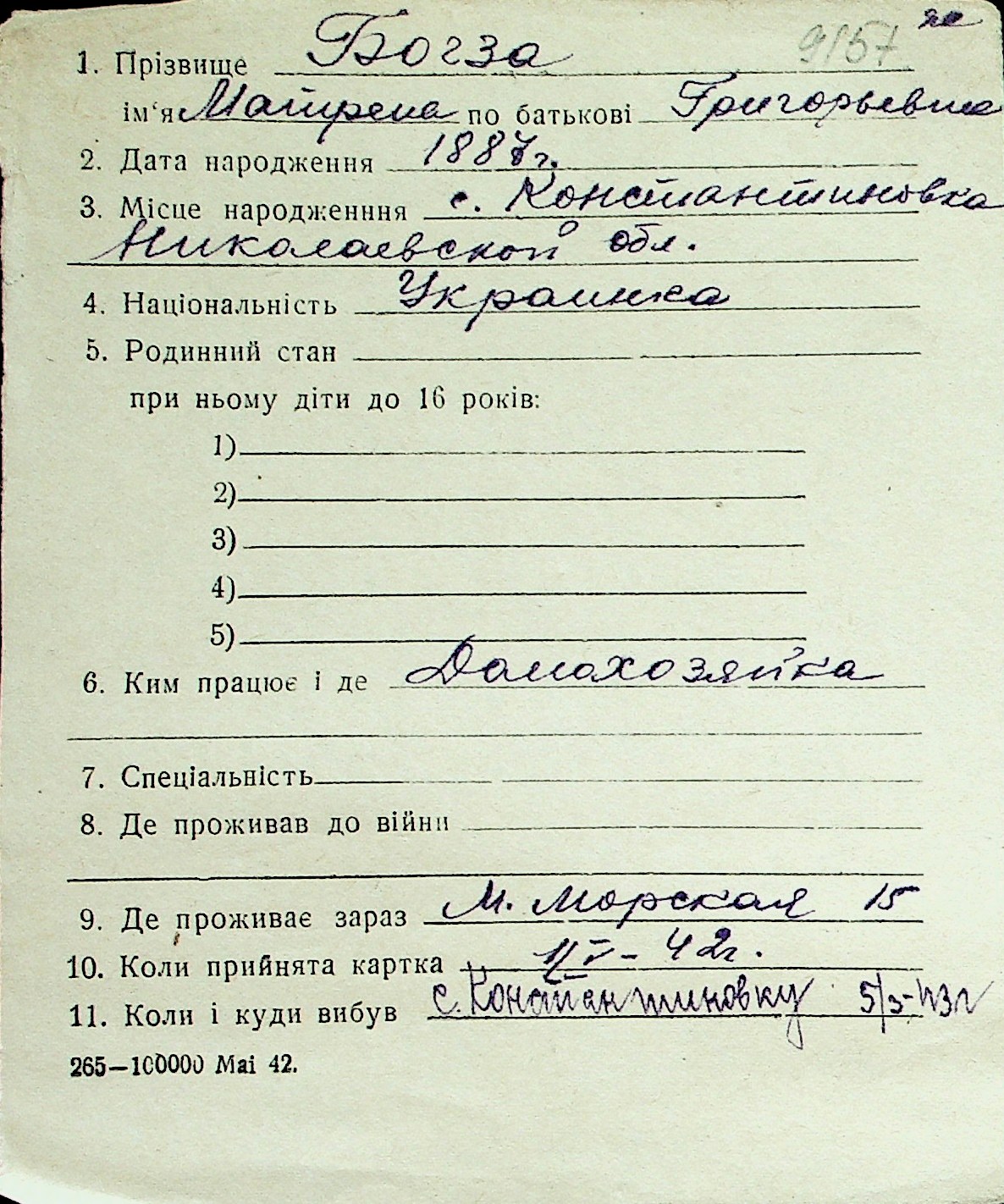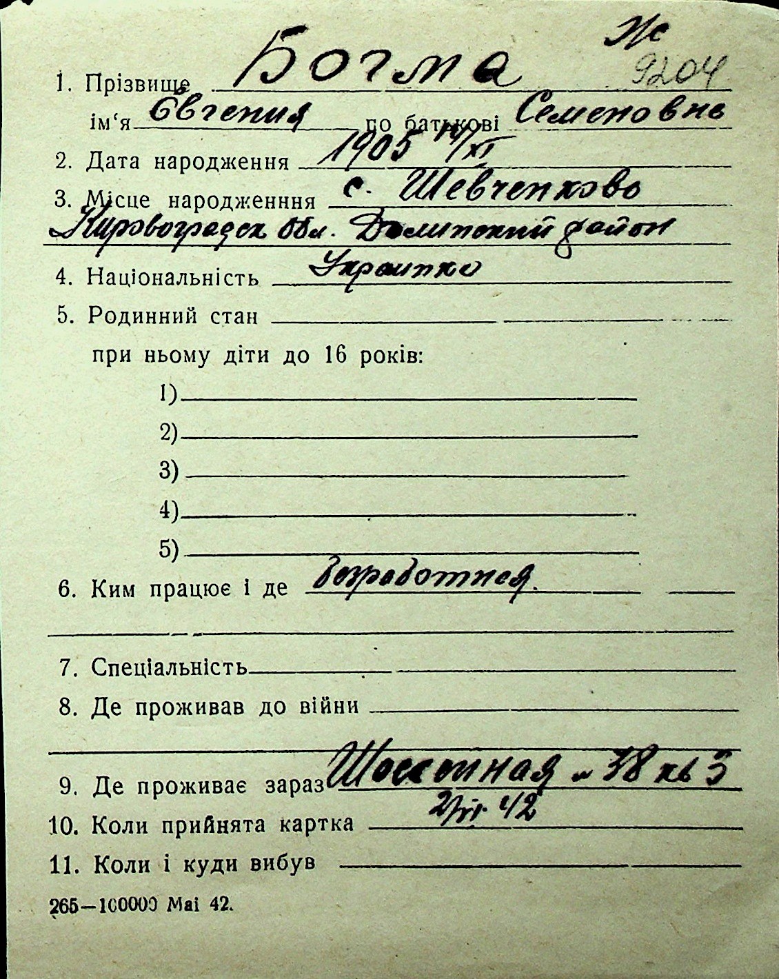 ◦ ◦ Перелік карток на осіб, які мешкали у м. Миколаїв у період окупації 1941–1944 років