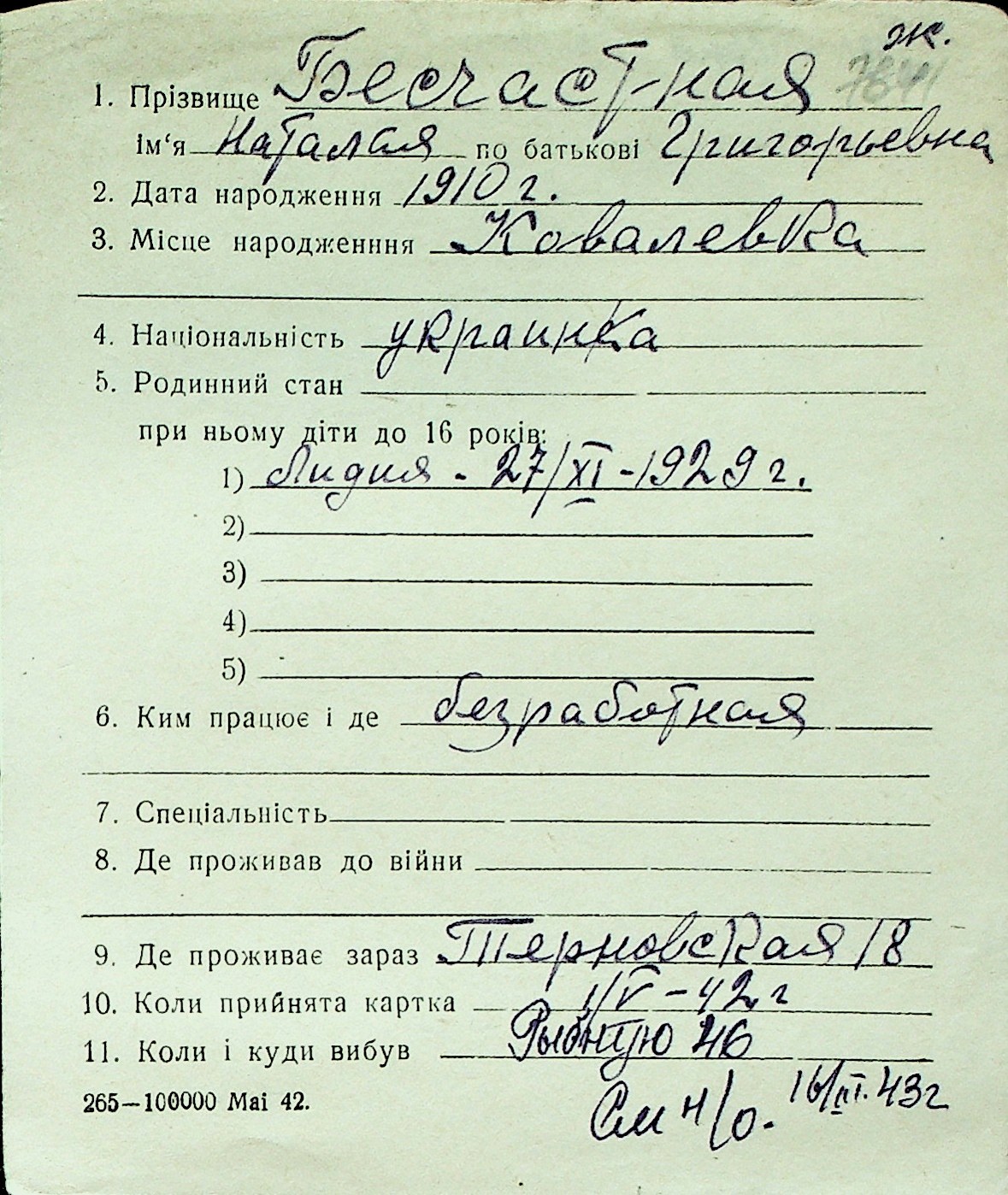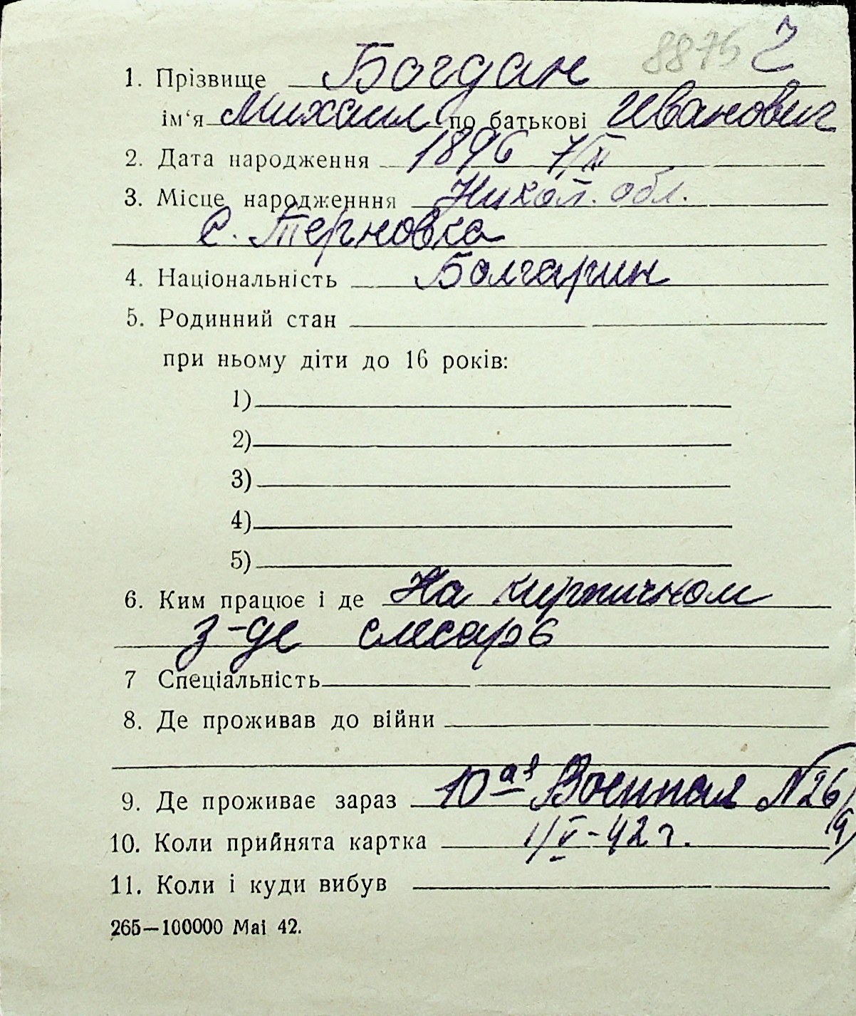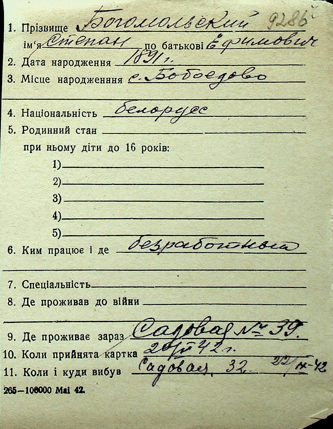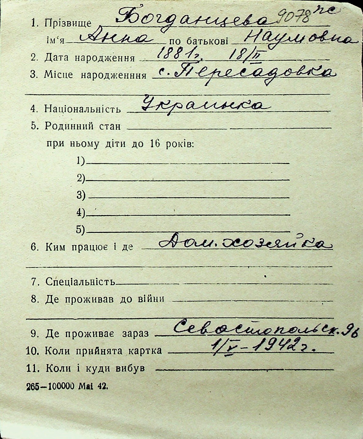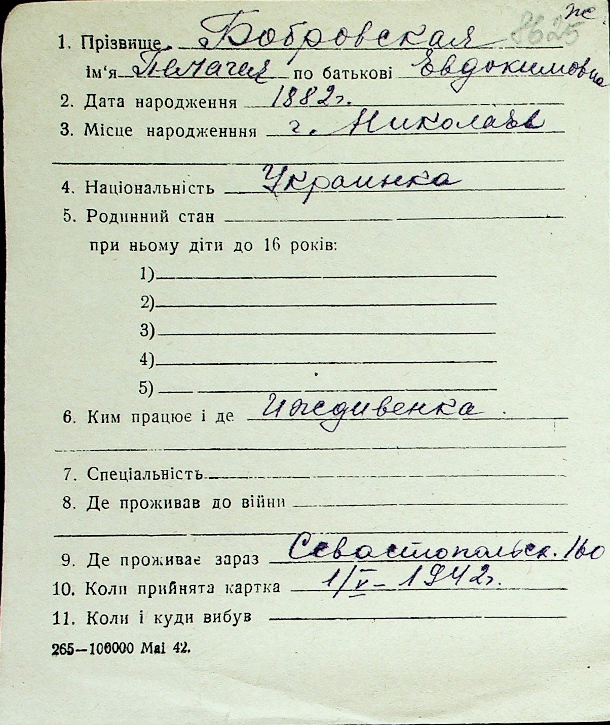 ◦ ◦ Перелік карток на осіб, які мешкали у м. Миколаїв у період окупації 1941–1944 років