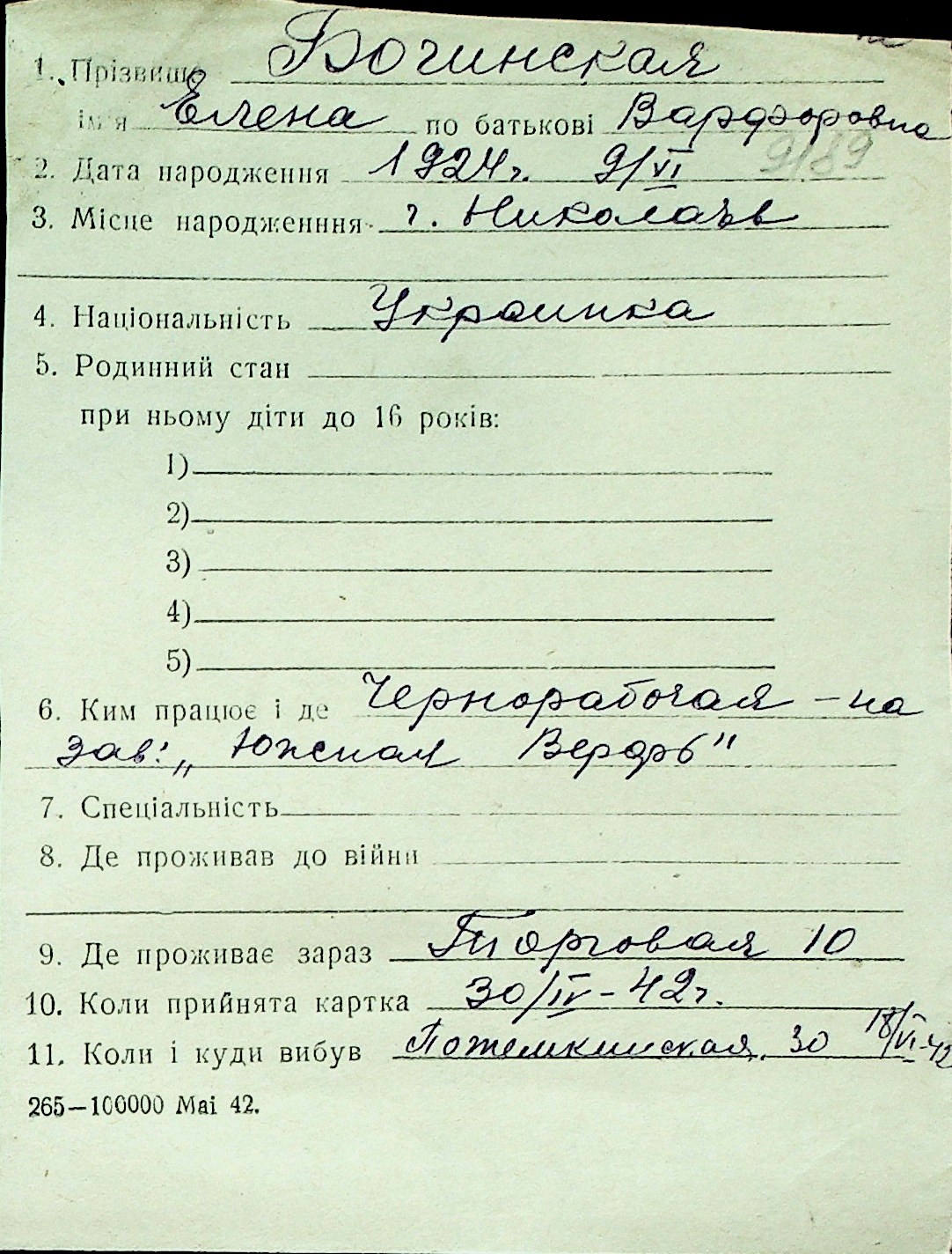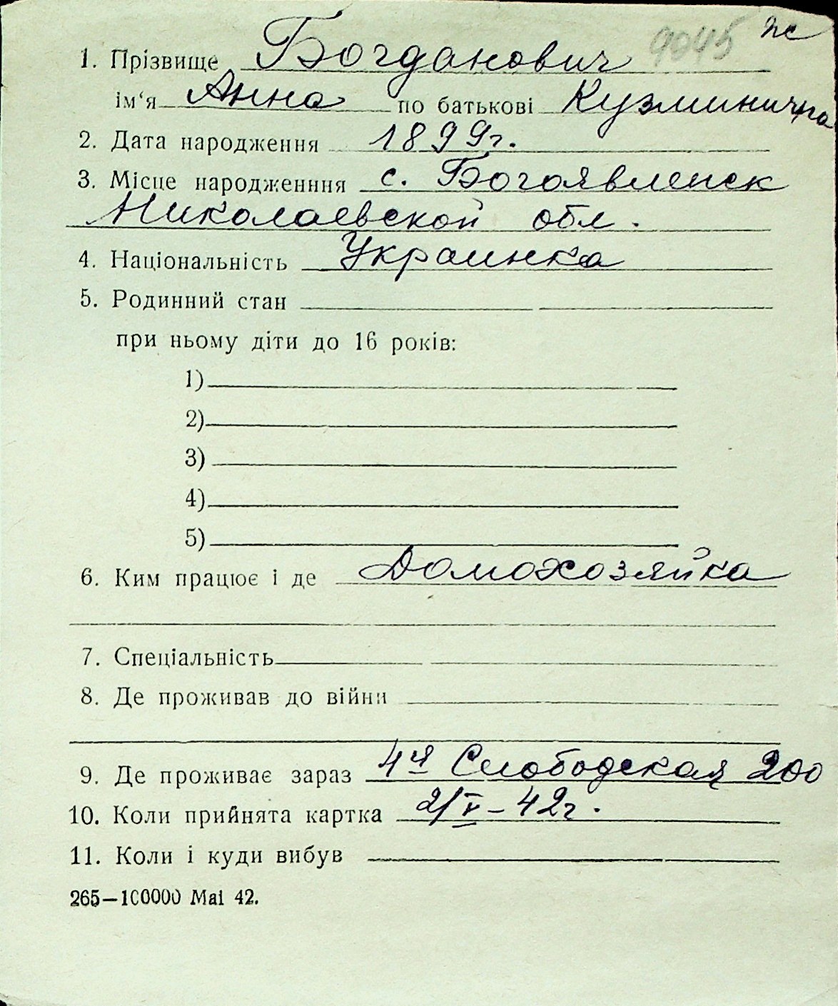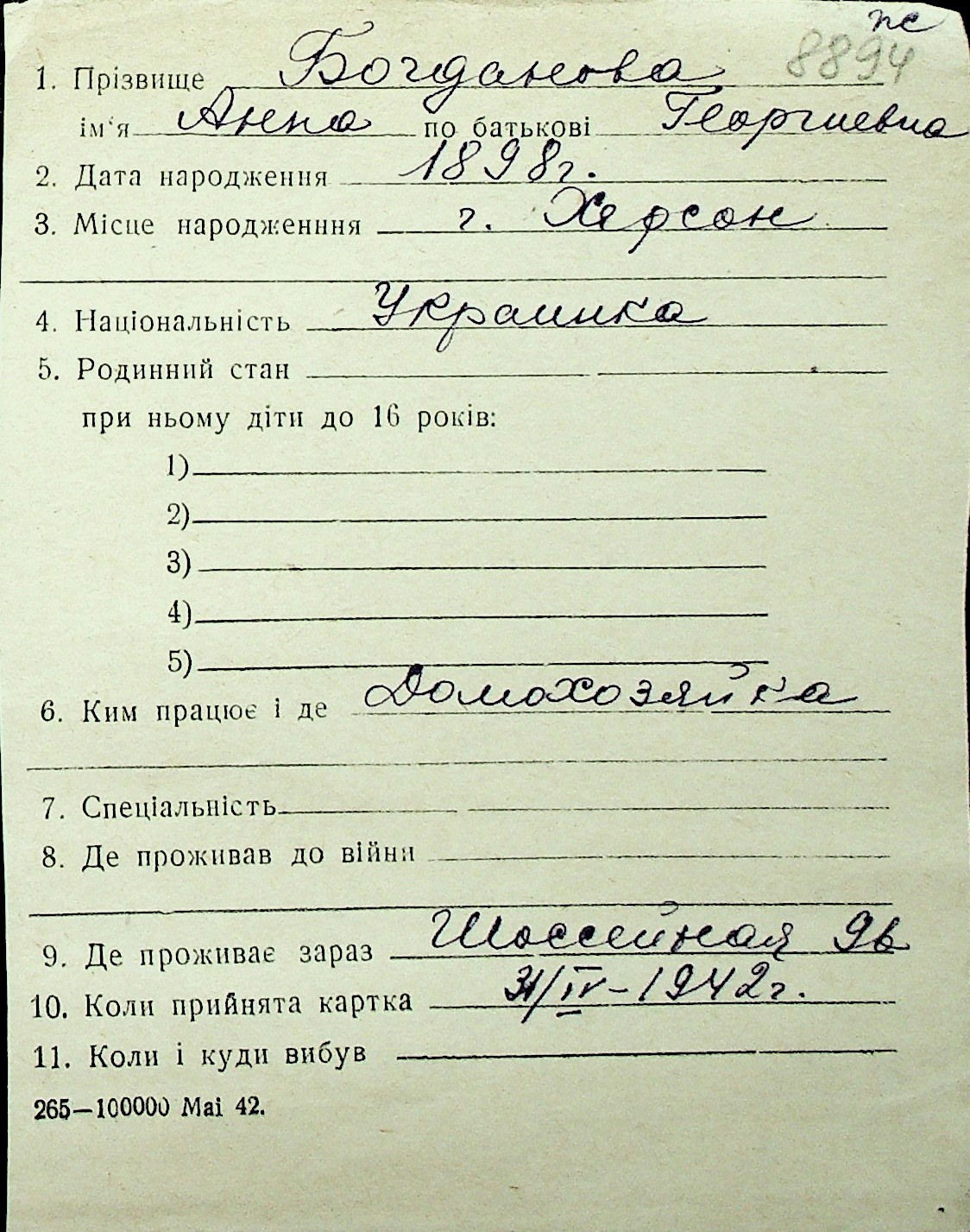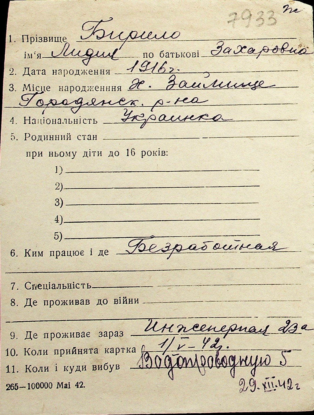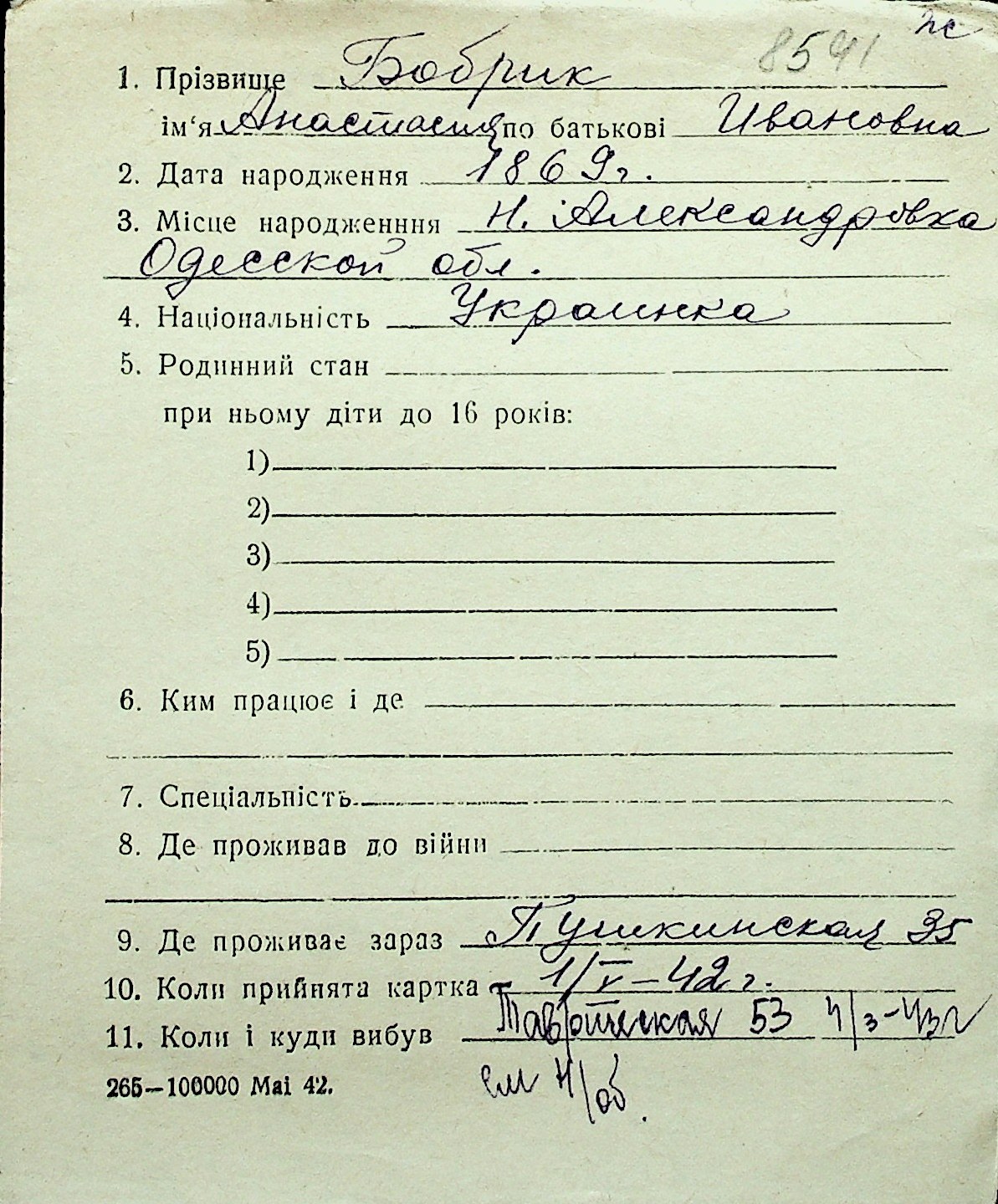 ◦ ◦ Перелік карток на осіб, які мешкали у м. Миколаїв у період окупації 1941–1944 років