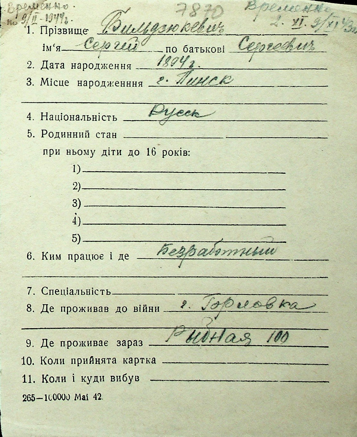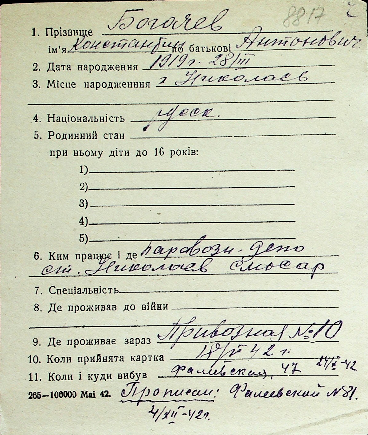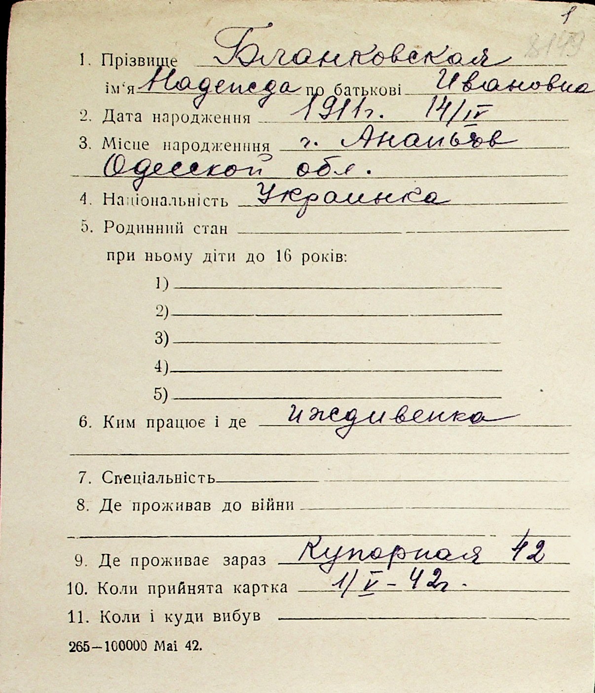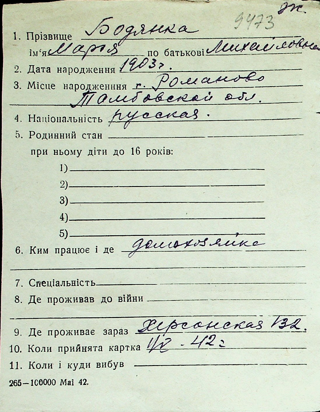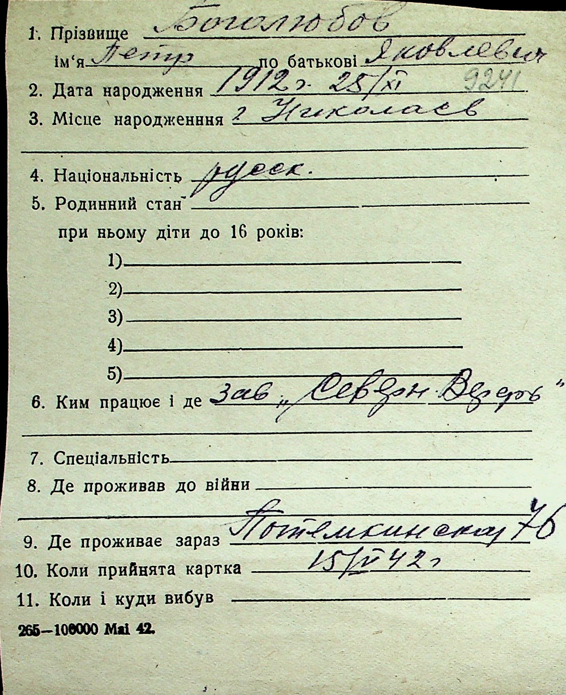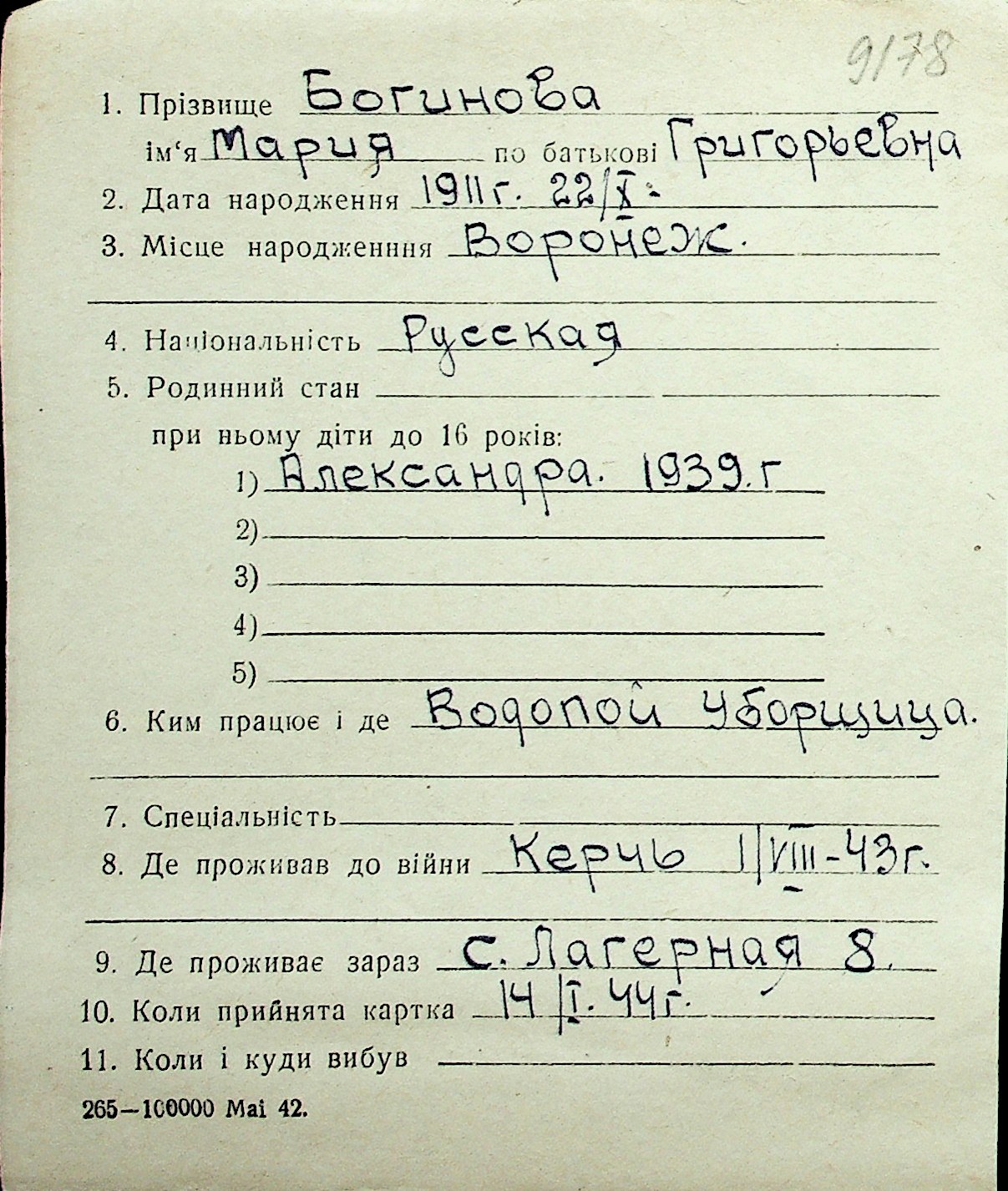◦ ◦ Перелік карток на осіб, які мешкали у м. Миколаїв у період окупації 1941–1944 років
