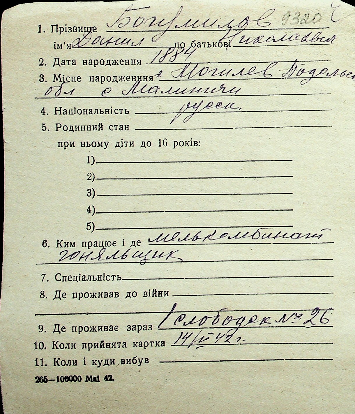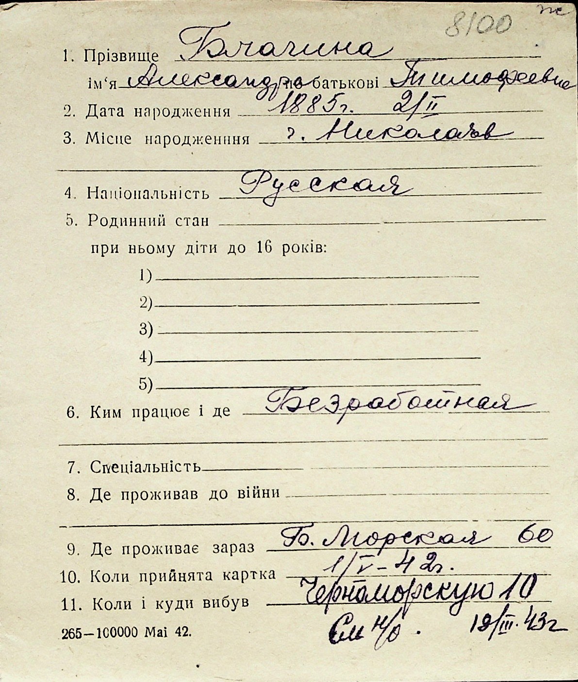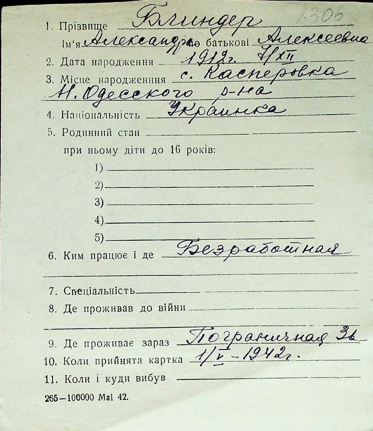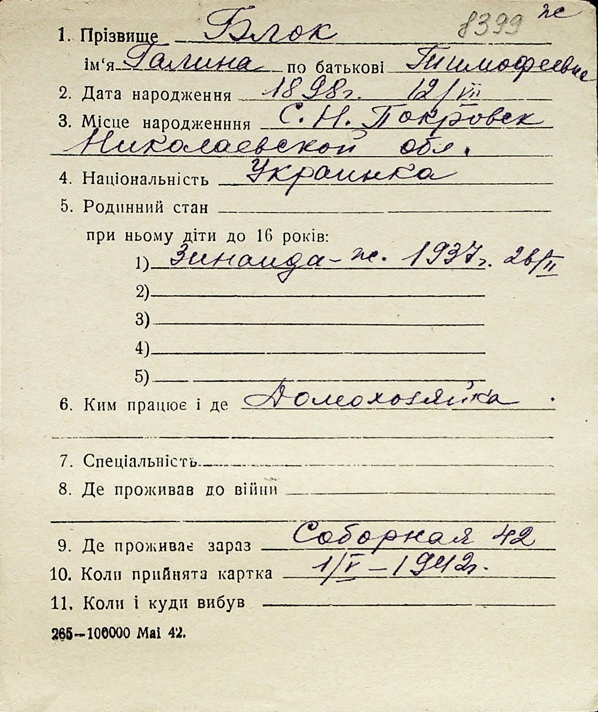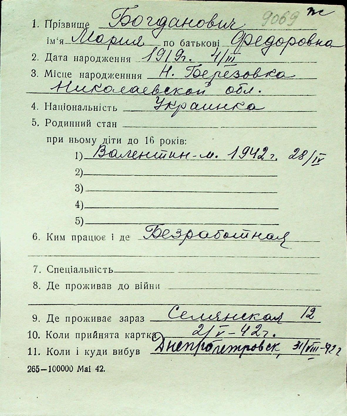◦ ◦ Перелік карток на осіб, які мешкали у м. Миколаїв у період окупації 1941–1944 років