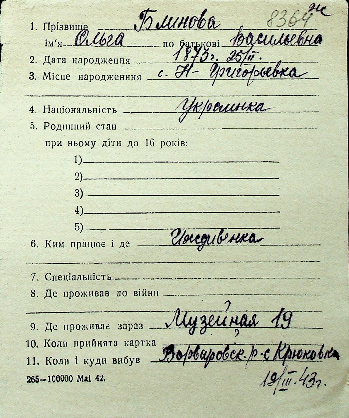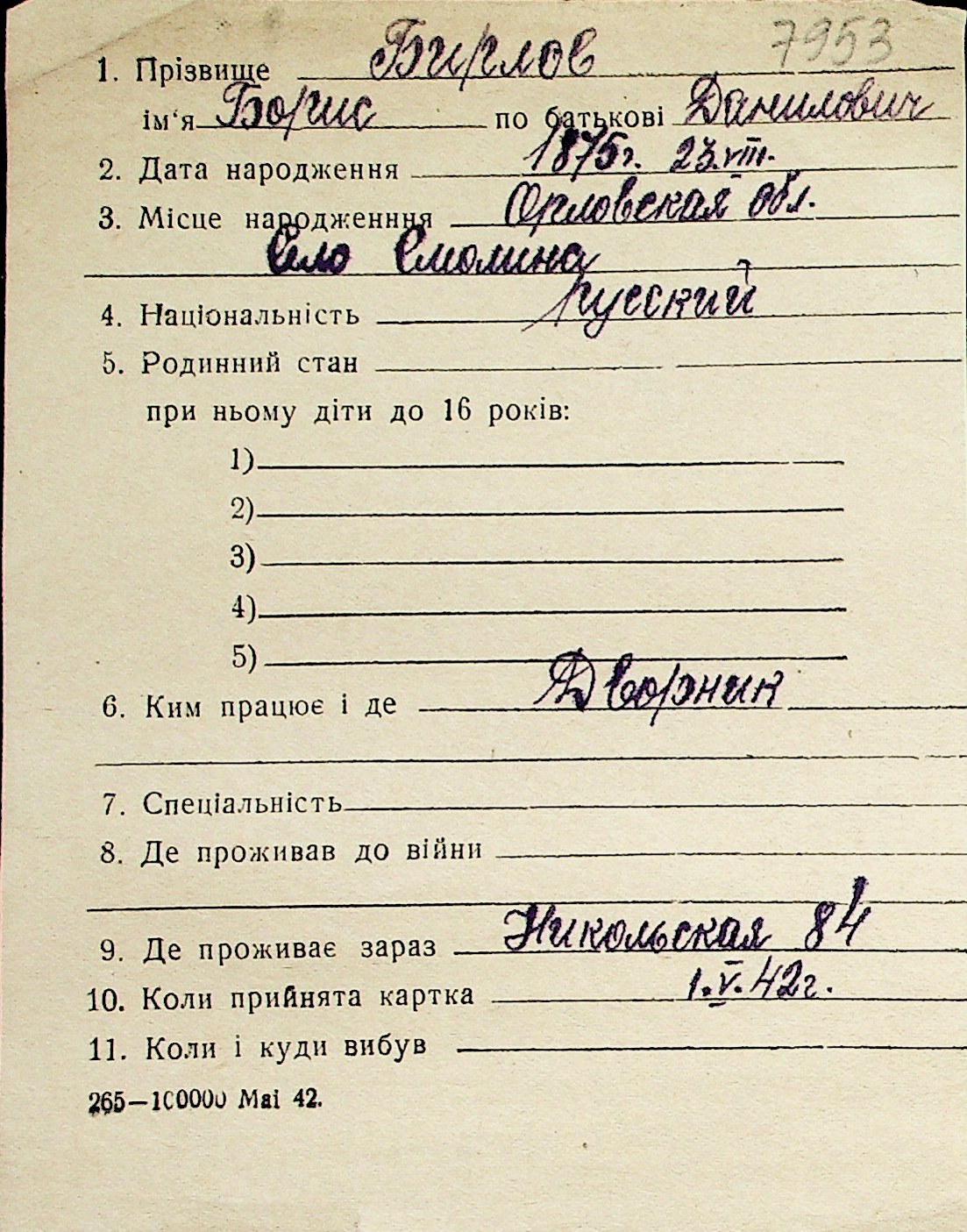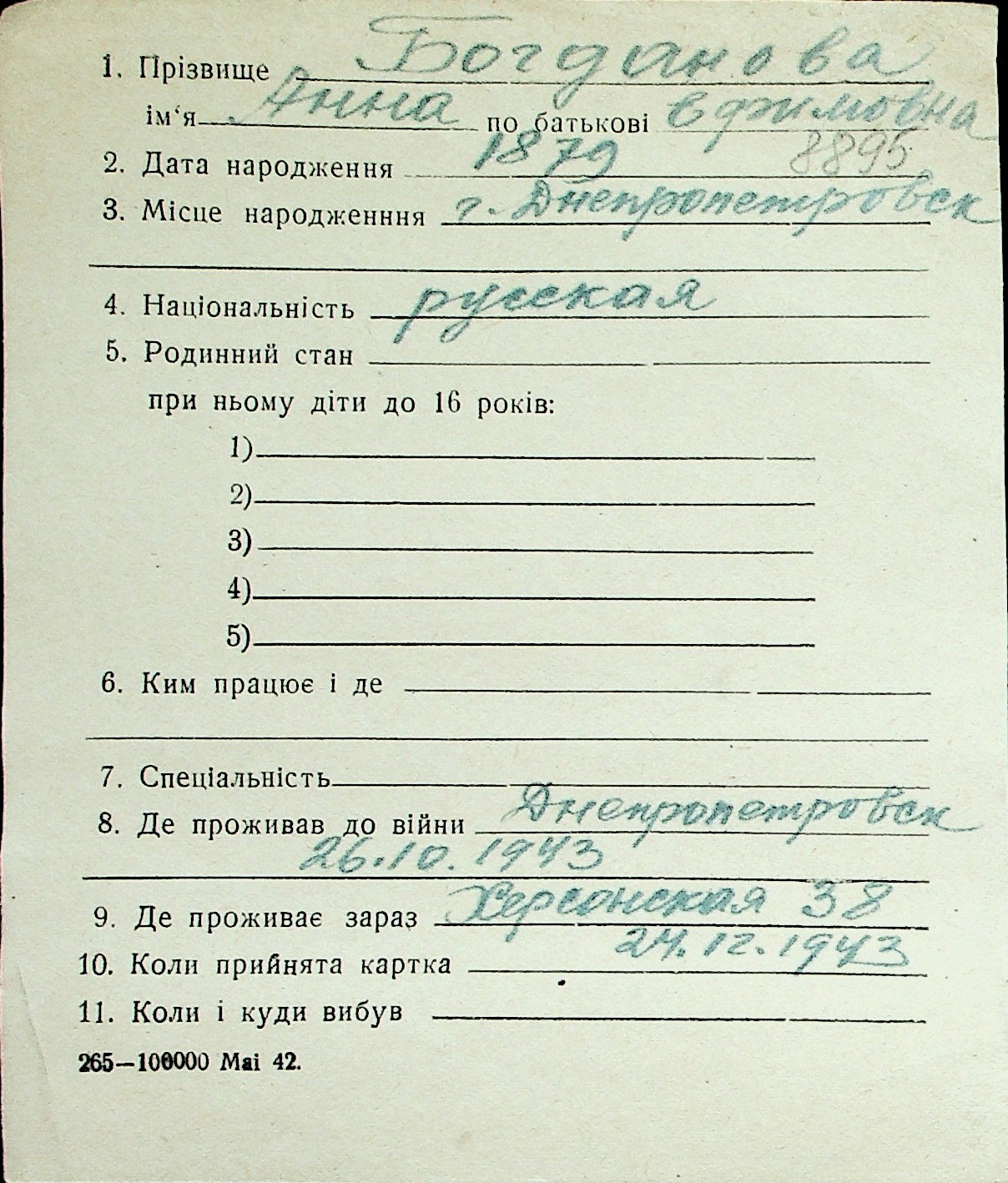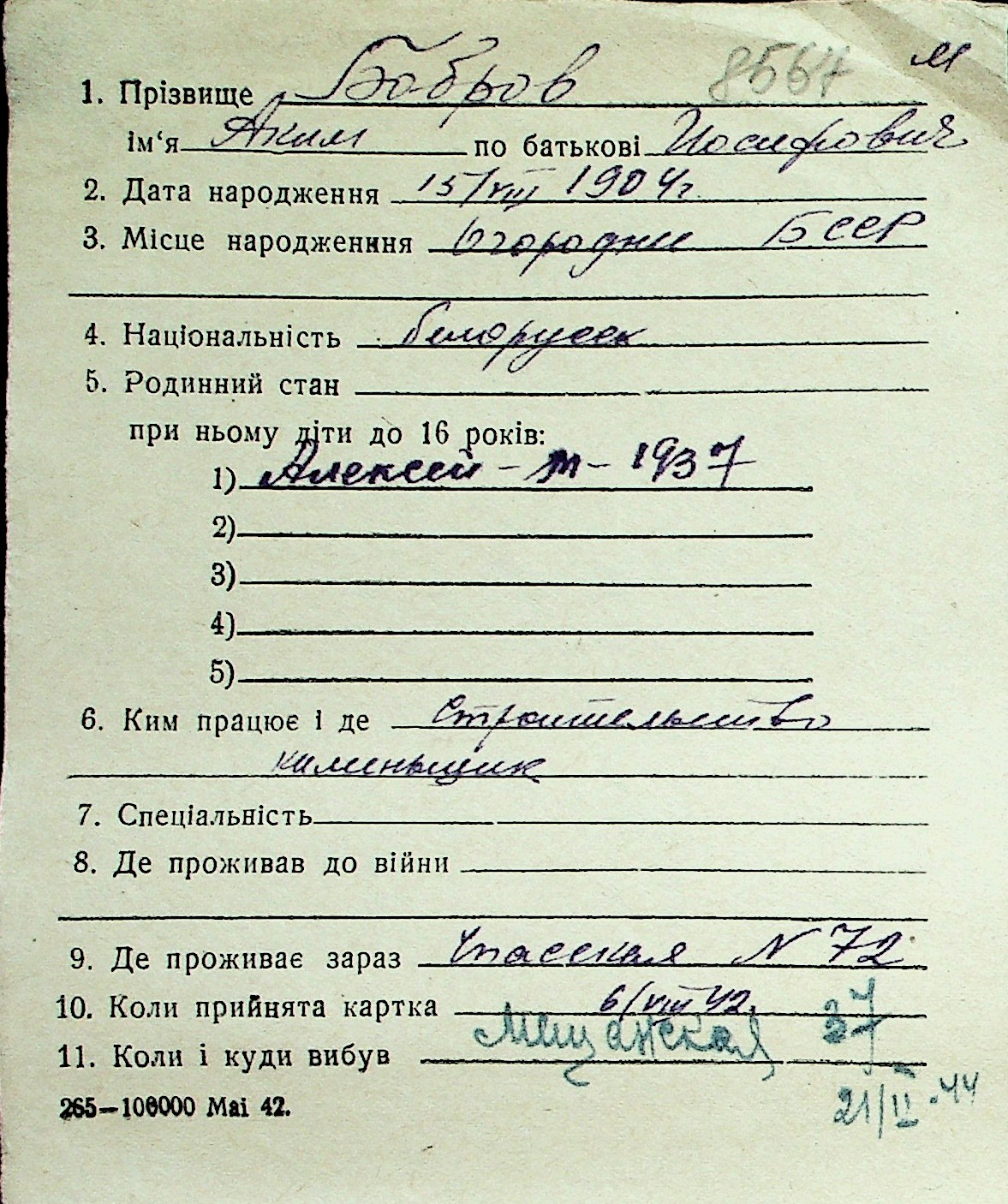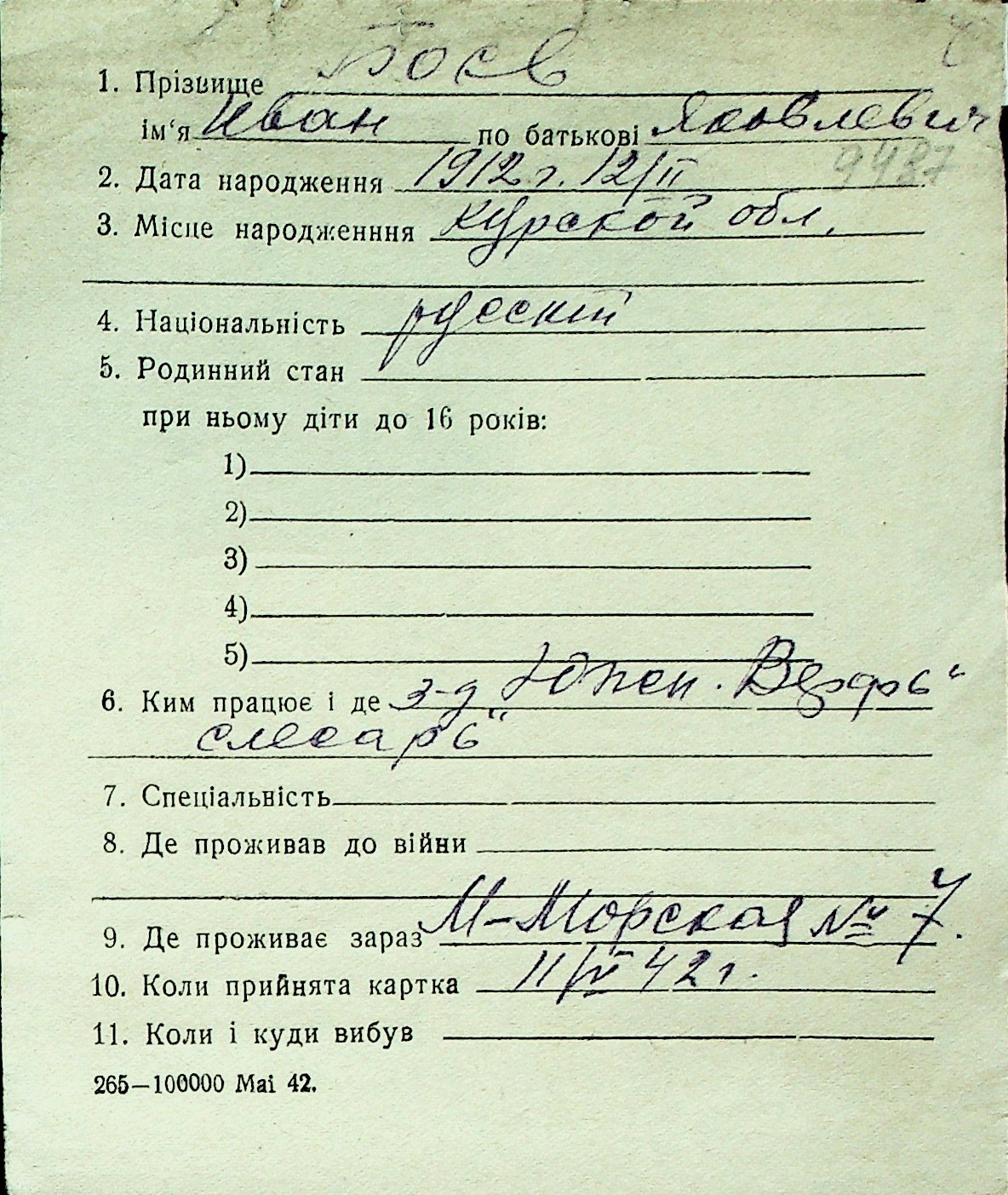 ◦ ◦ Перелік карток на осіб, які мешкали у м. Миколаїв у період окупації 1941–1944 років