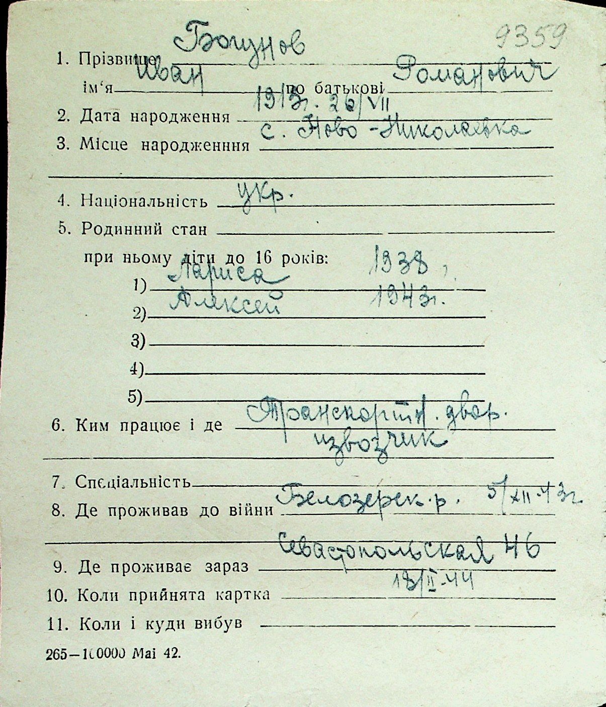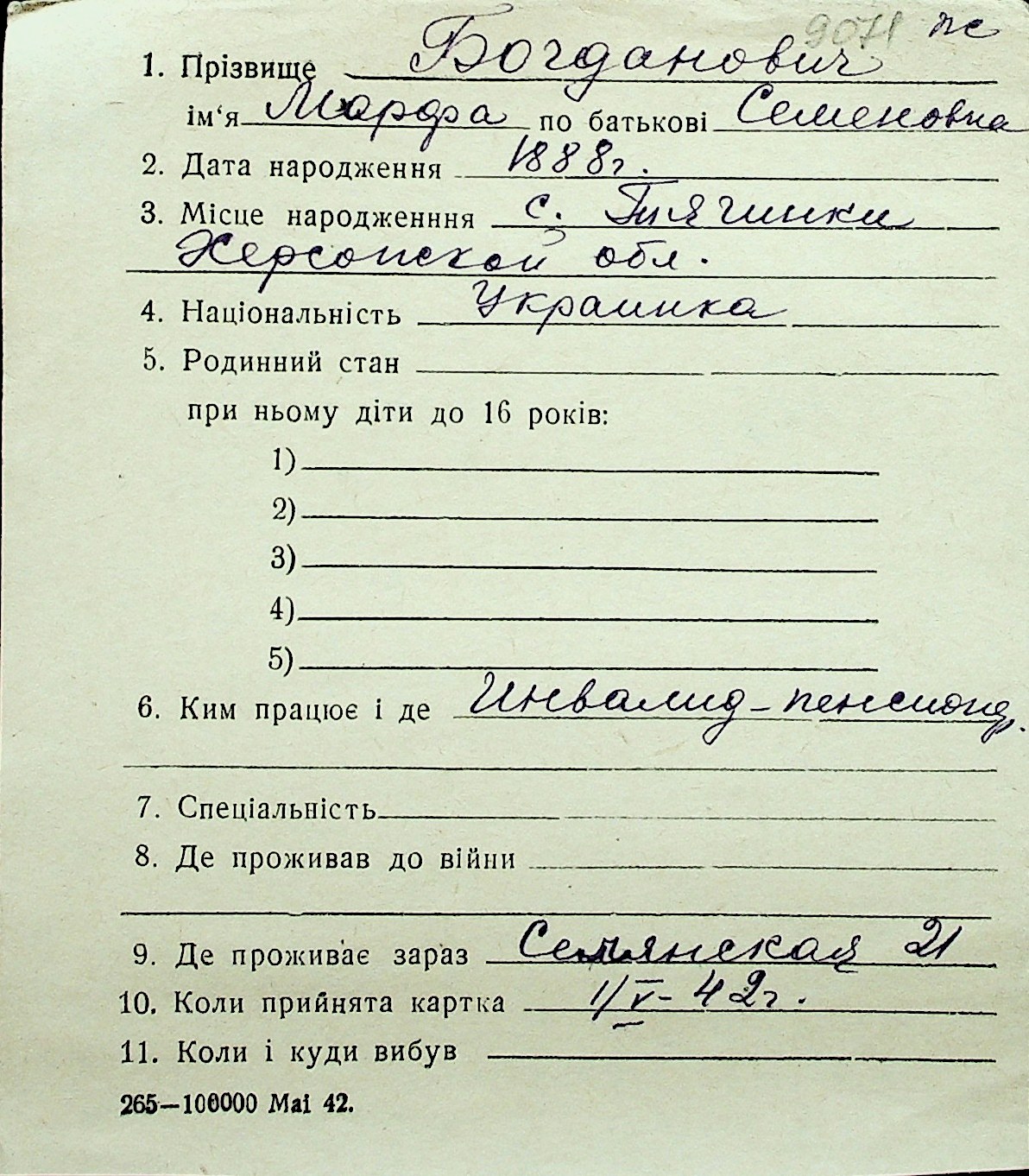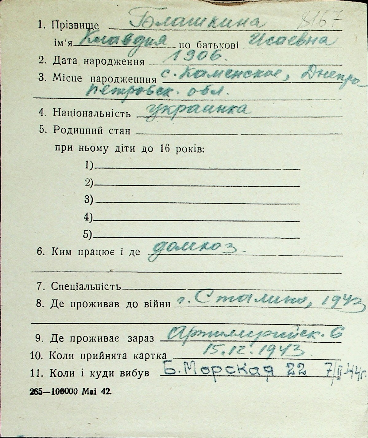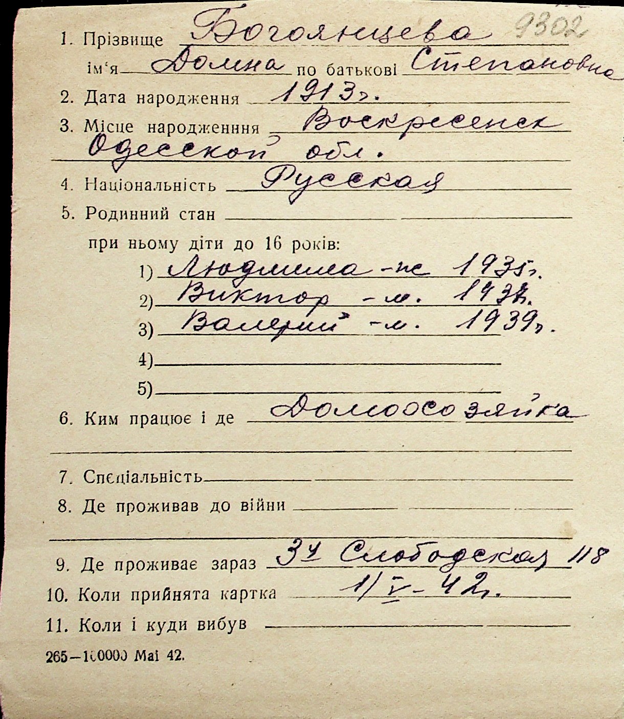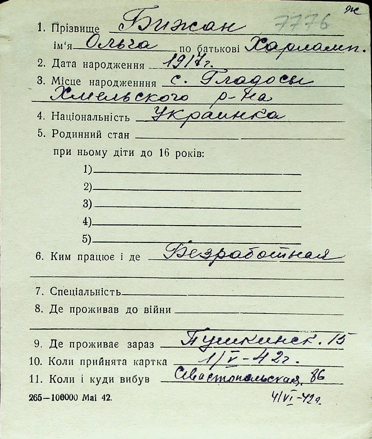 ◦ ◦ Перелік карток на осіб, які мешкали у м. Миколаїв у період окупації 1941–1944 років