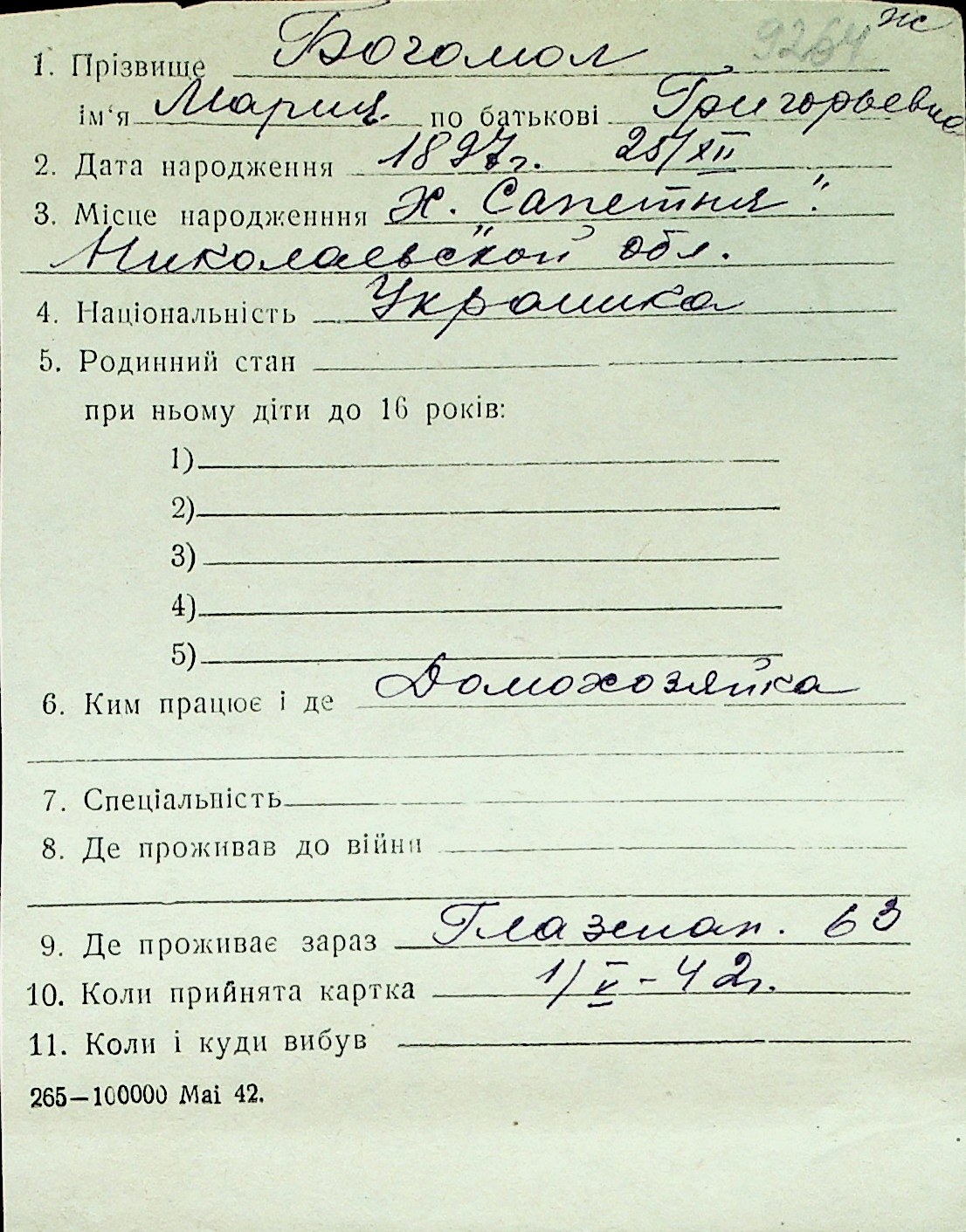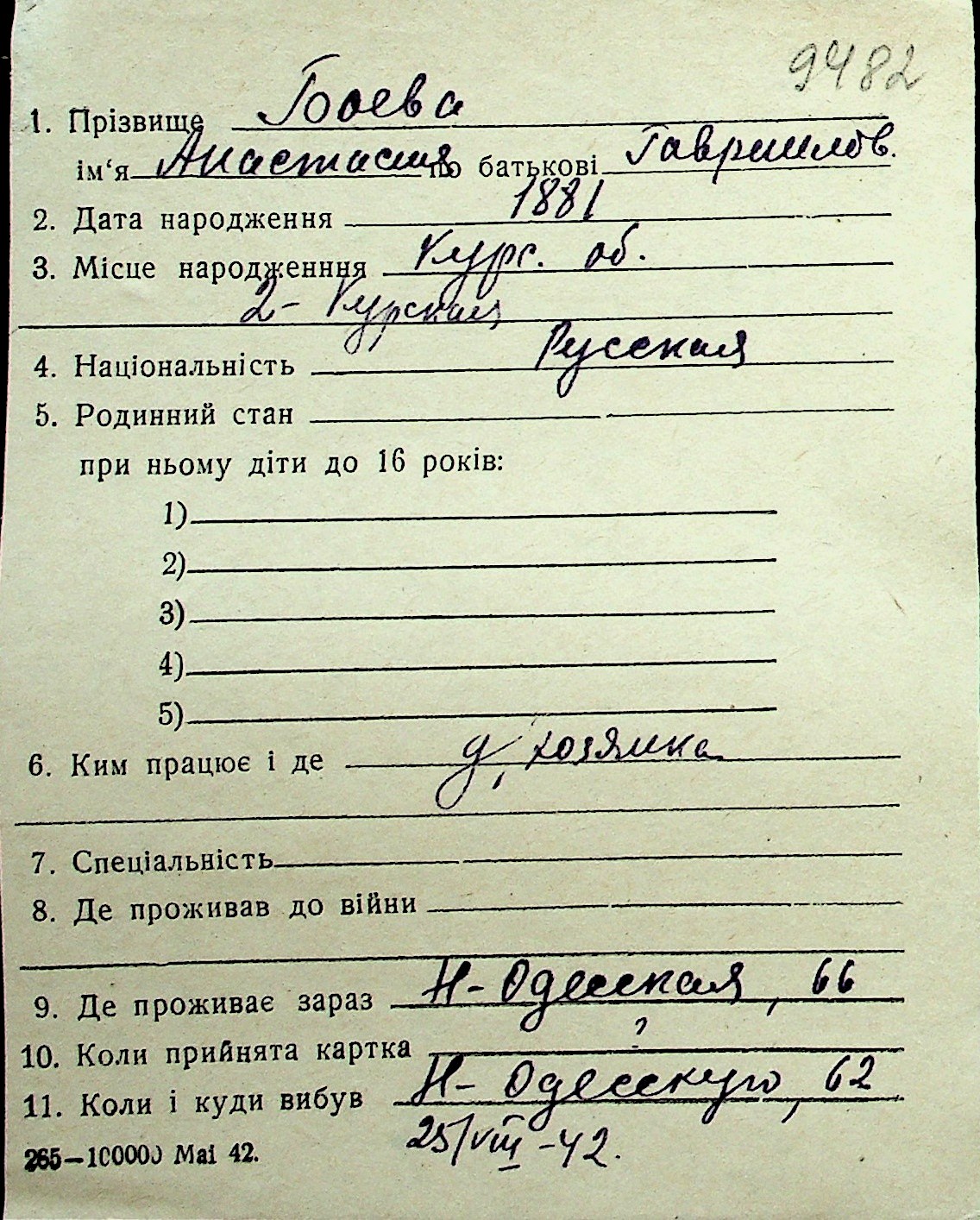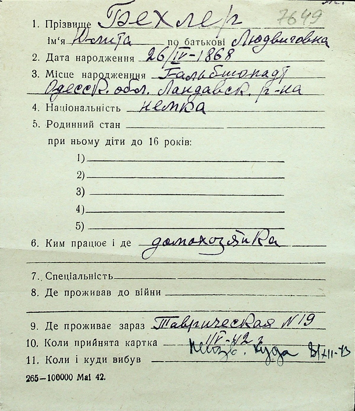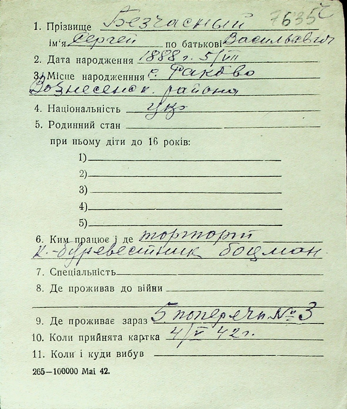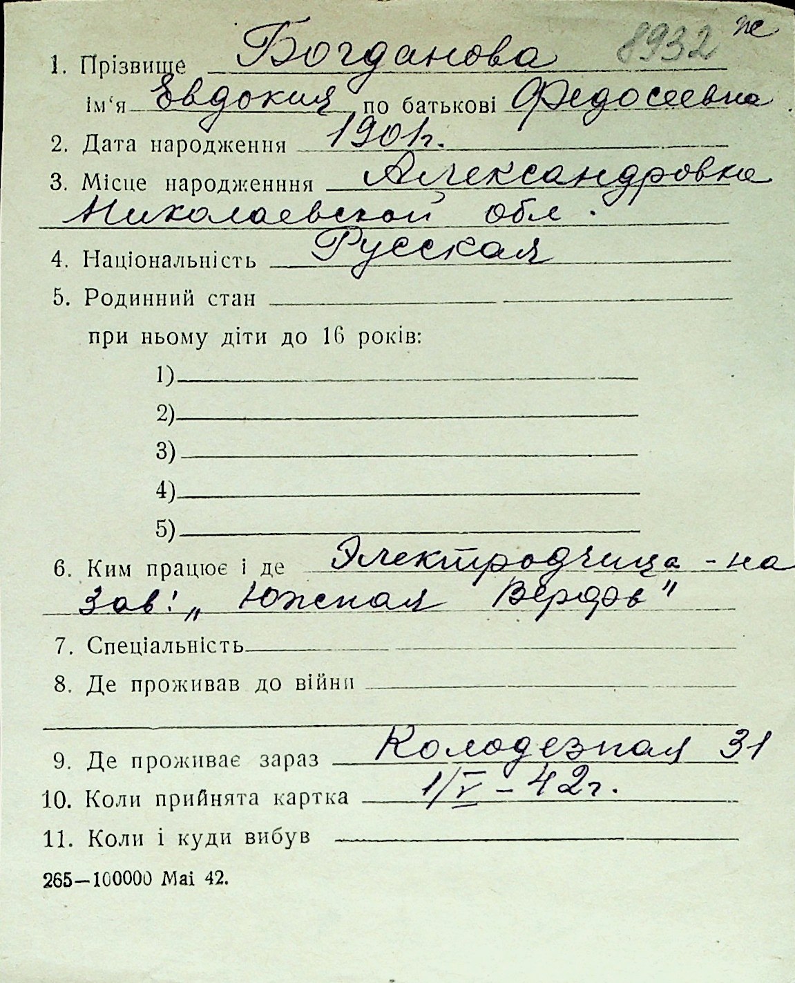 ◦ ◦ Перелік карток на осіб, які мешкали у м. Миколаїв у період окупації 1941–1944 років
