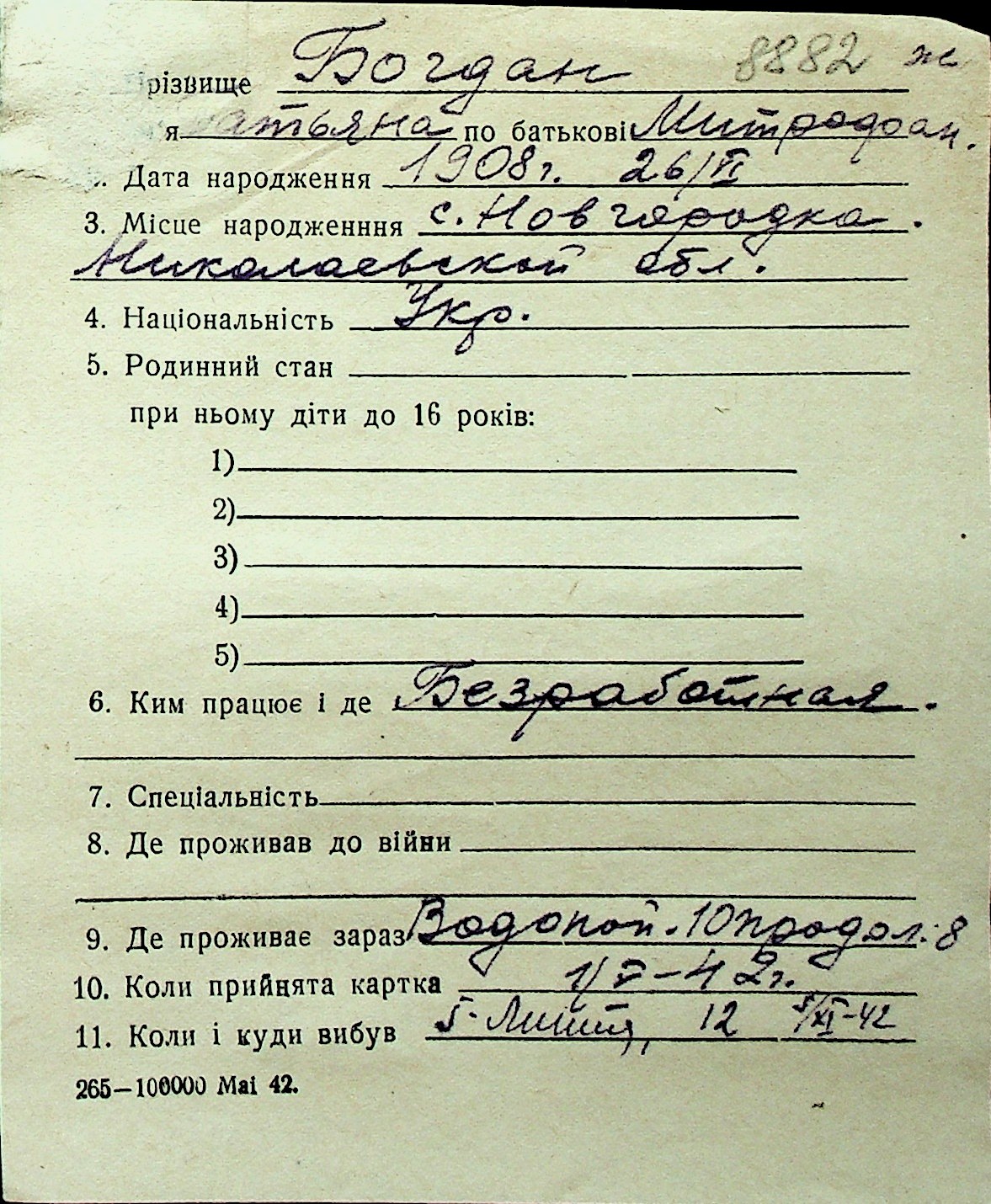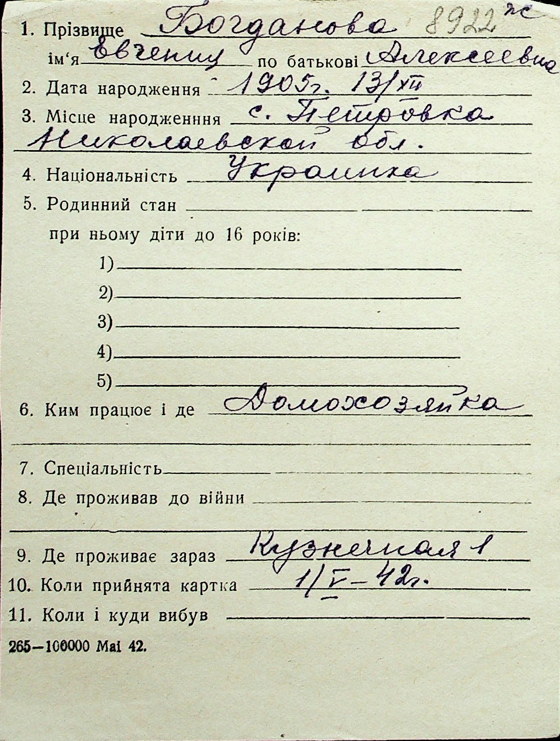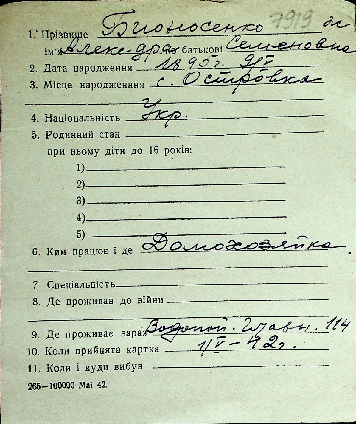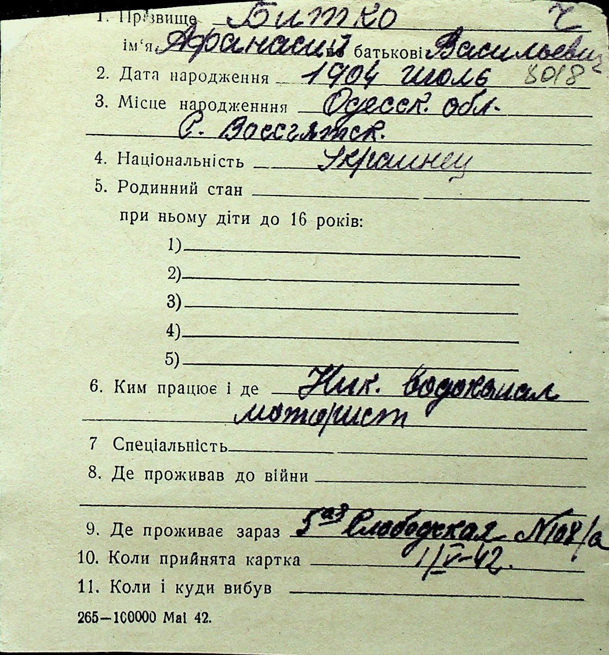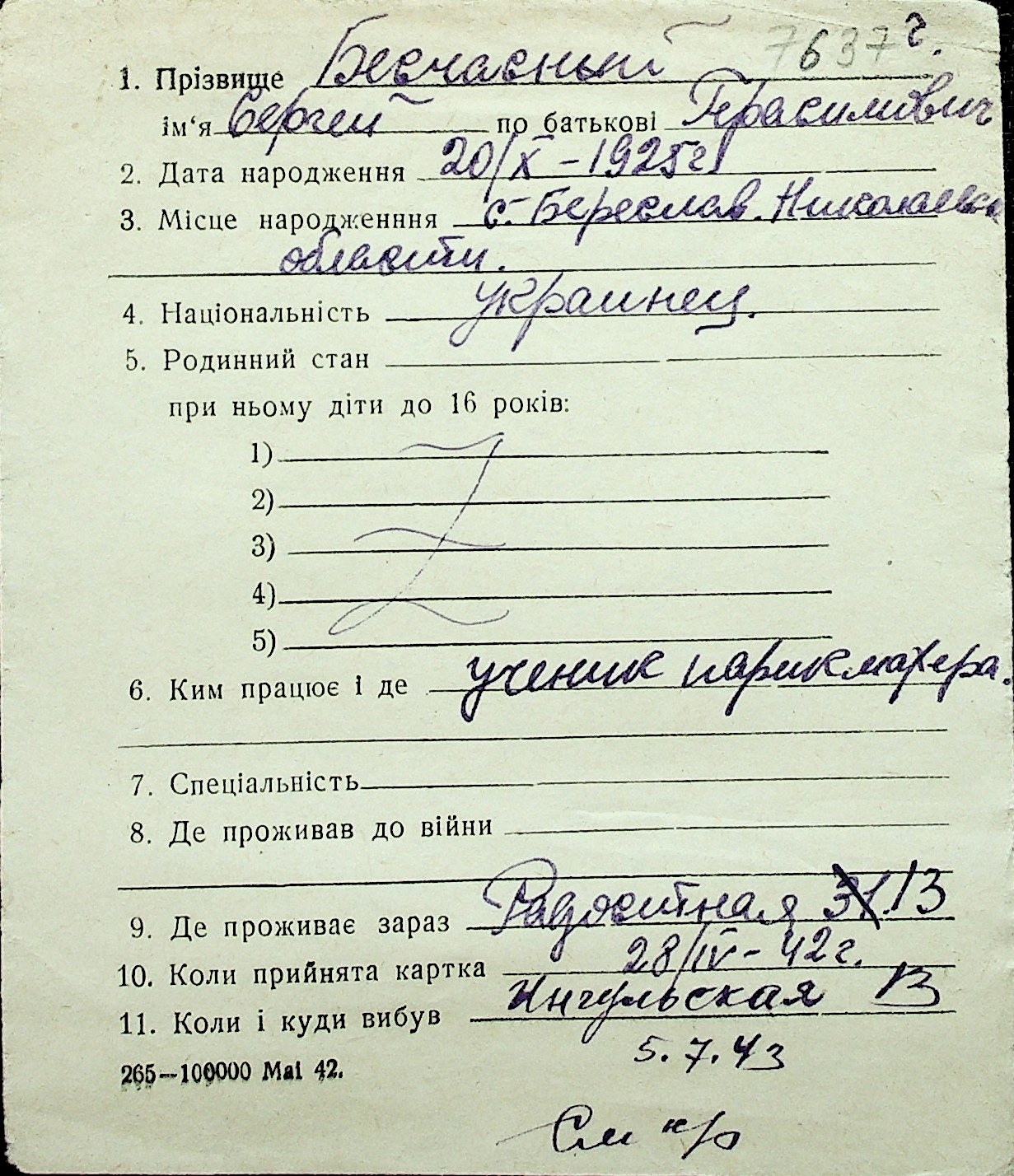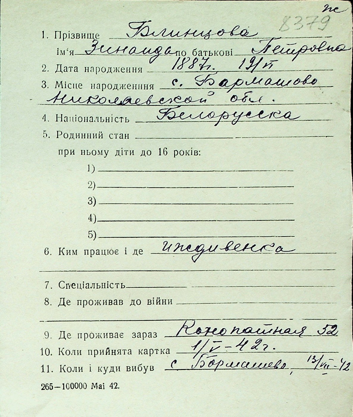 ◦ ◦ Перелік карток на осіб, які мешкали у м. Миколаїв у період окупації 1941–1944 років