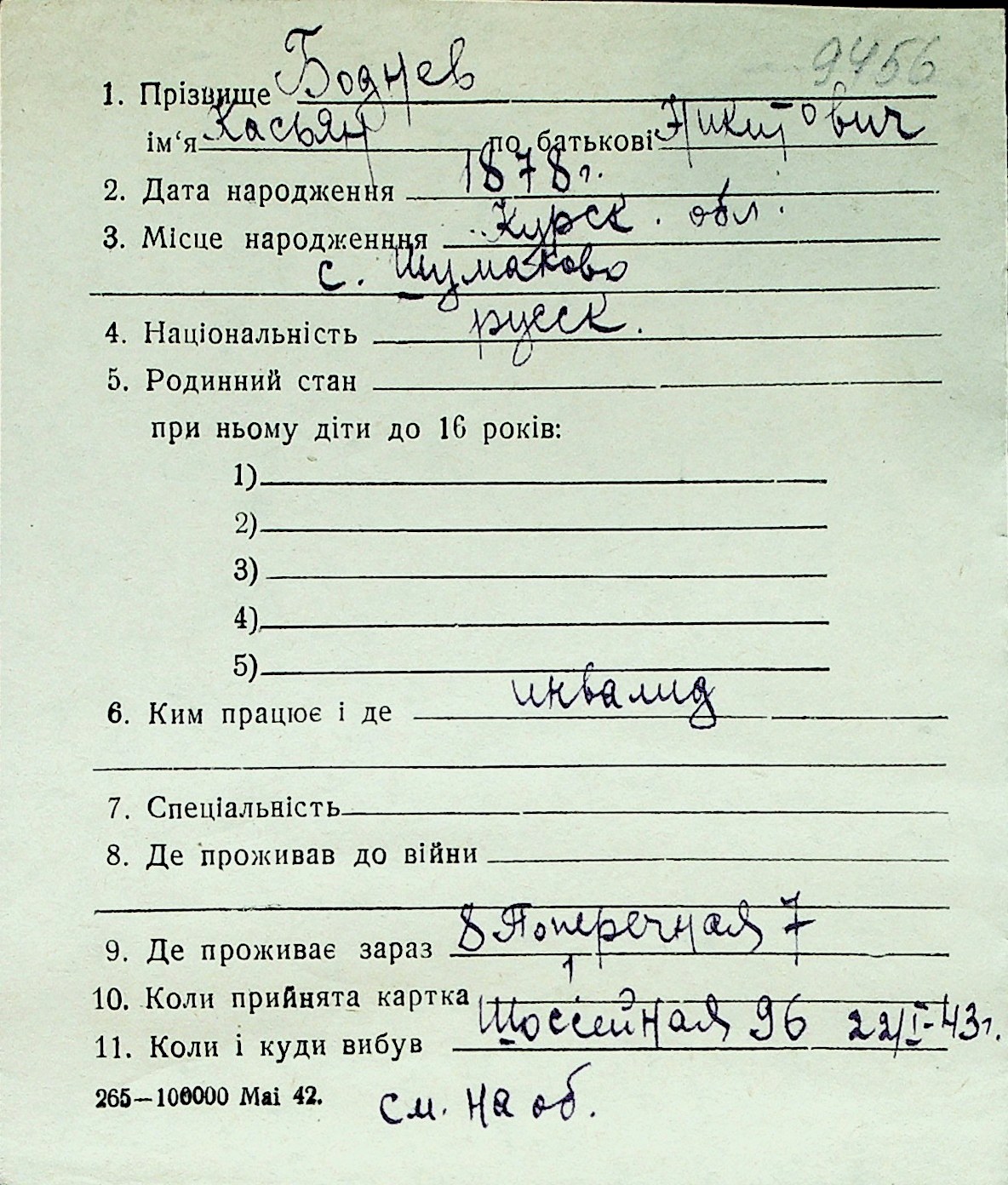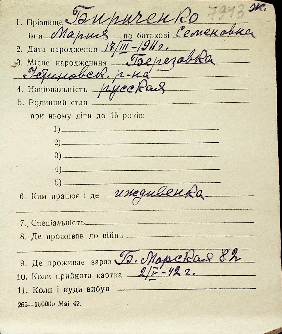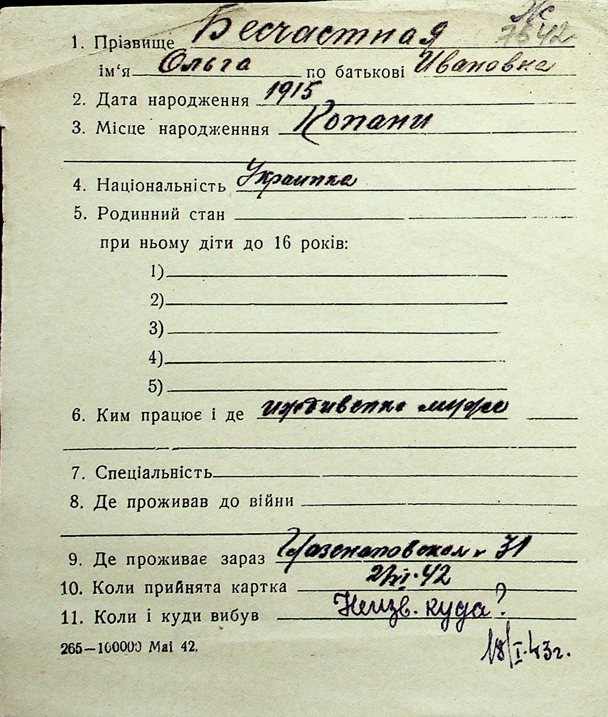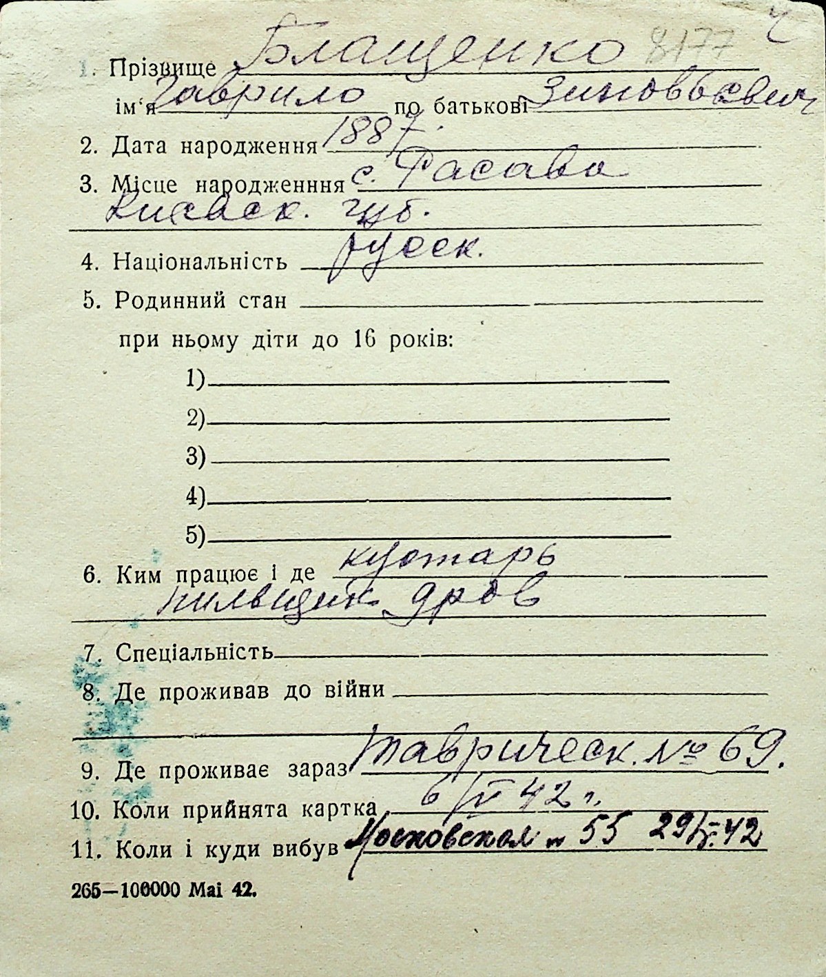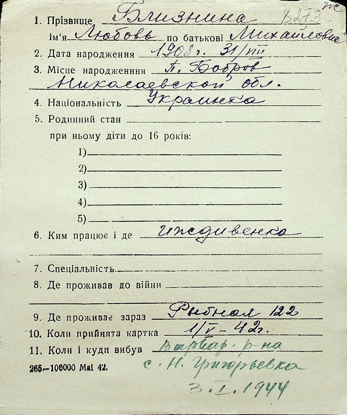◦ ◦ Перелік карток на осіб, які мешкали у м. Миколаїв у період окупації 1941–1944 років