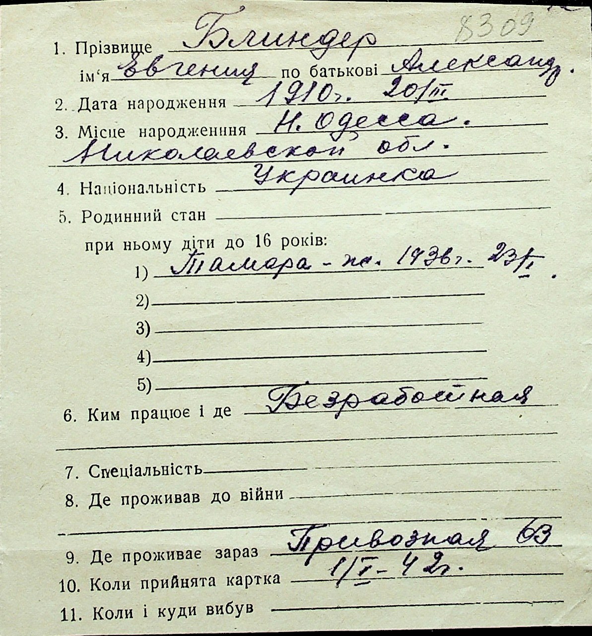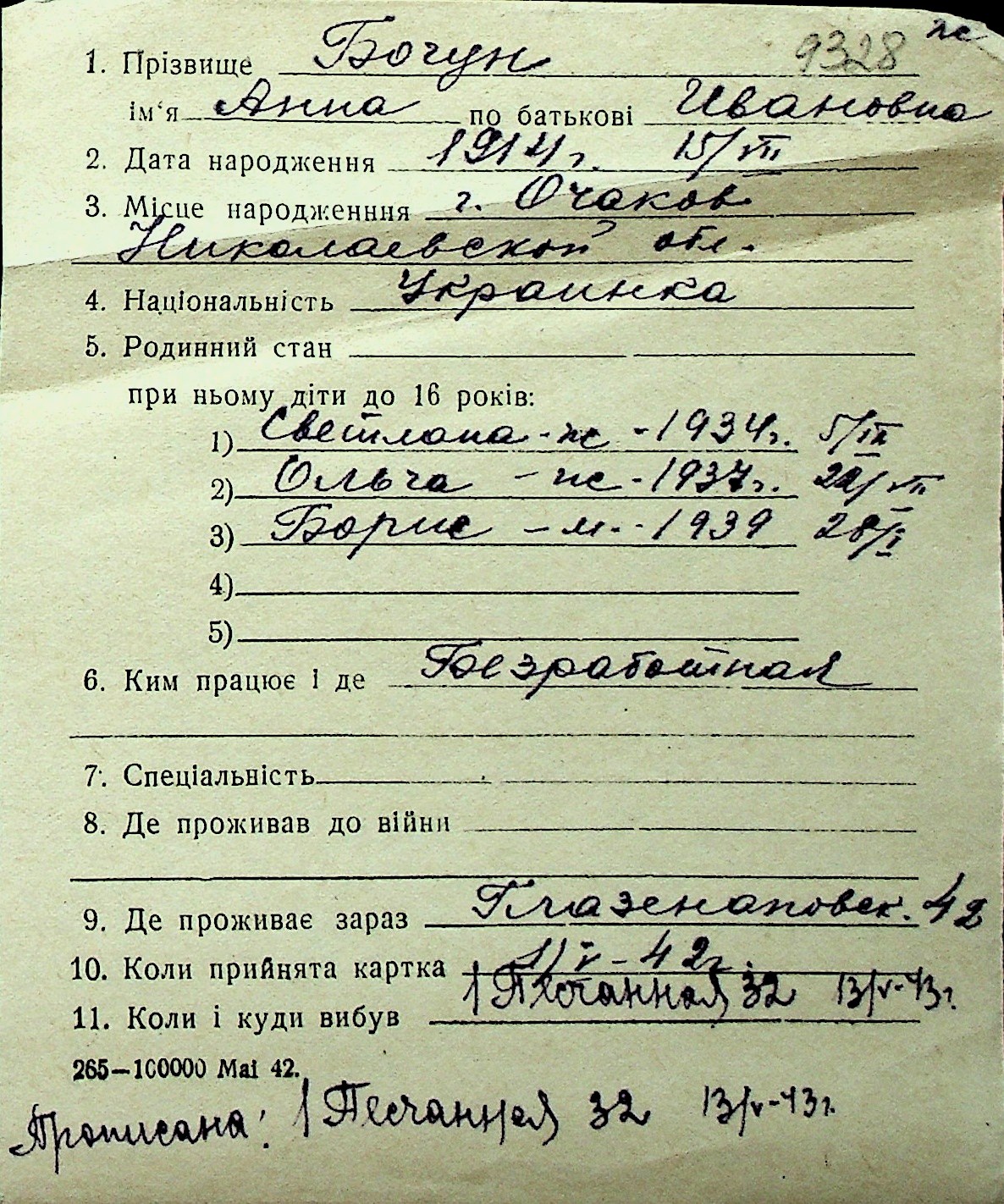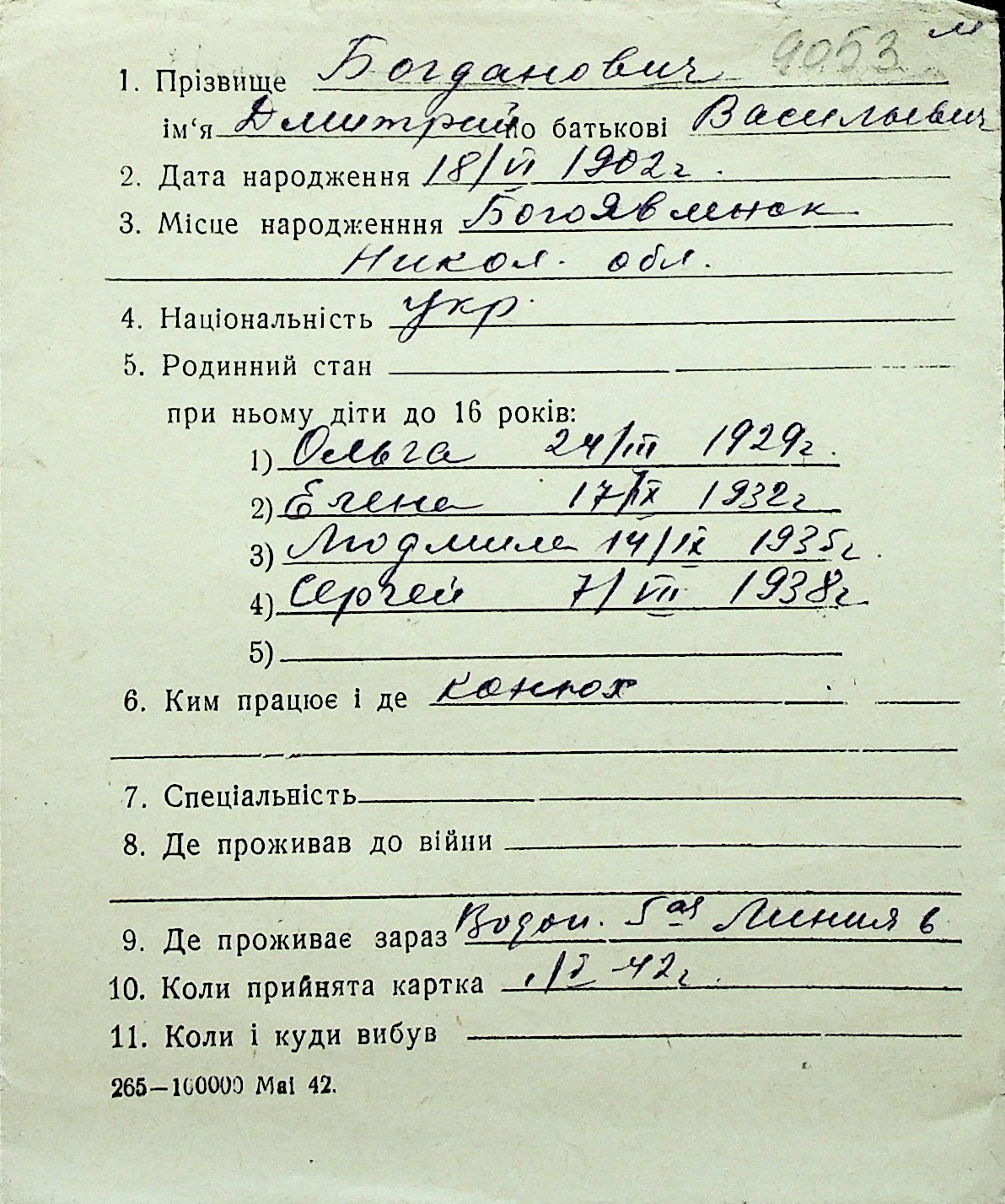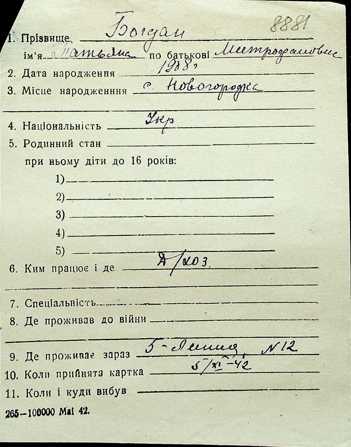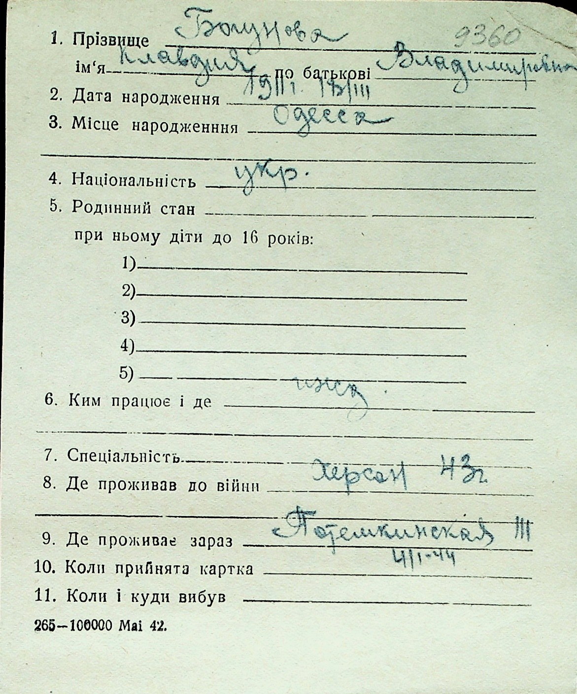 ◦ ◦ Перелік карток на осіб, які мешкали у м. Миколаїв у період окупації 1941–1944 років