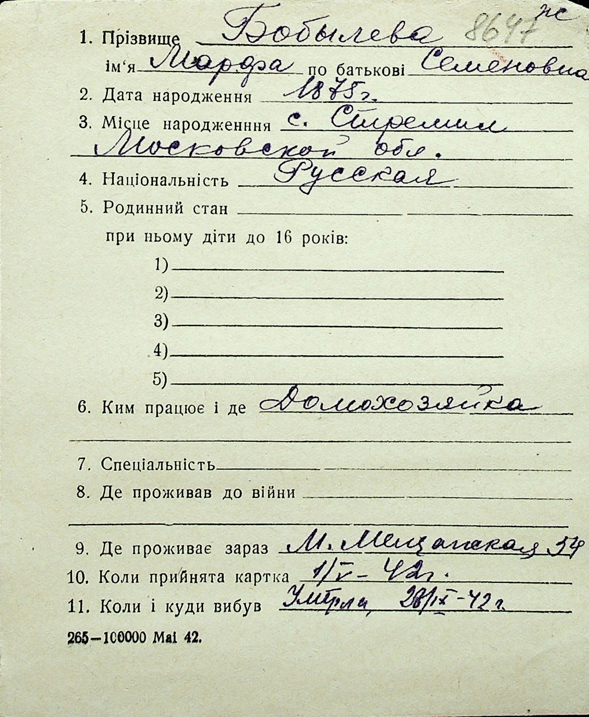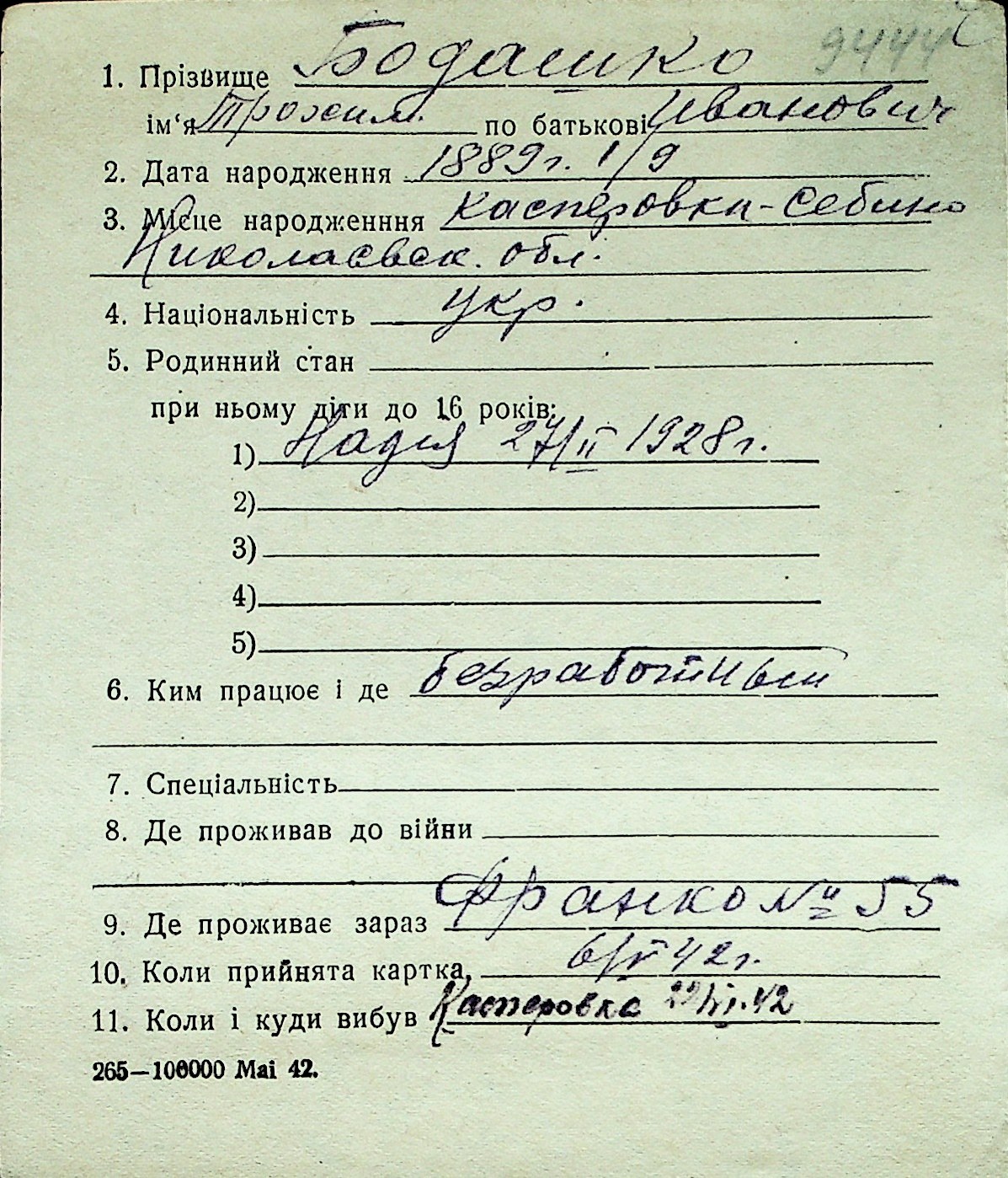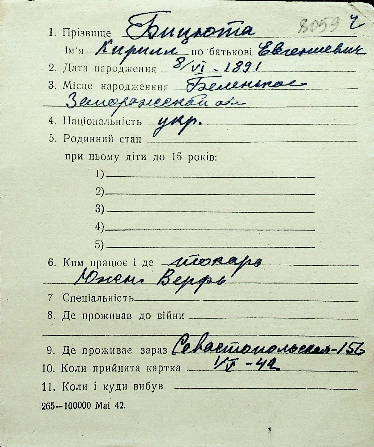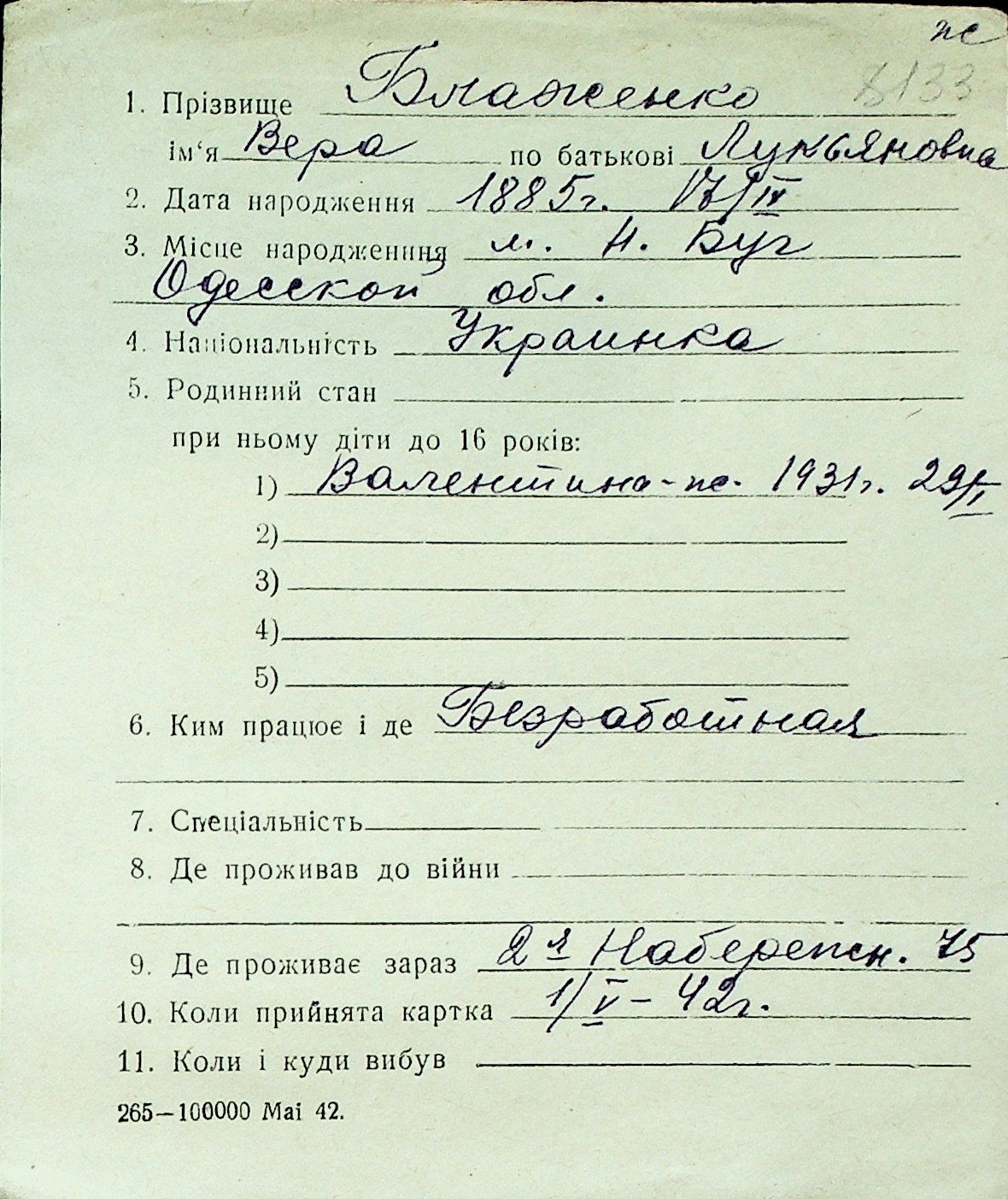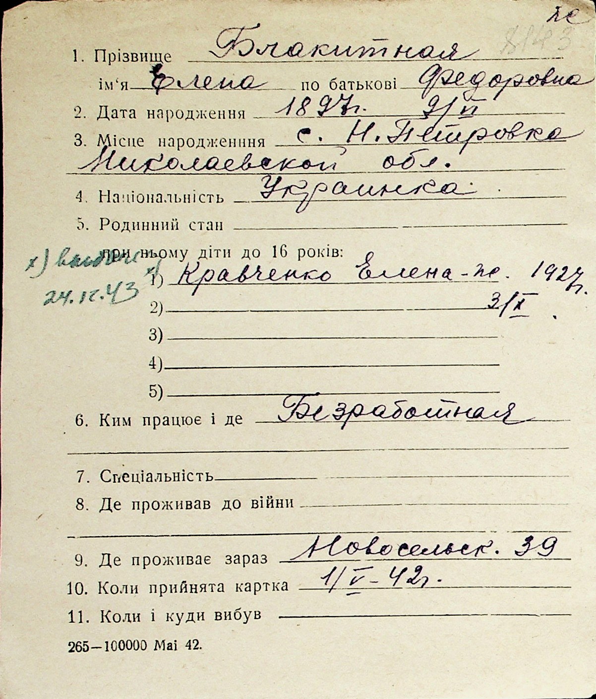 ◦ ◦ Перелік карток на осіб, які мешкали у м. Миколаїв у період окупації 1941–1944 років