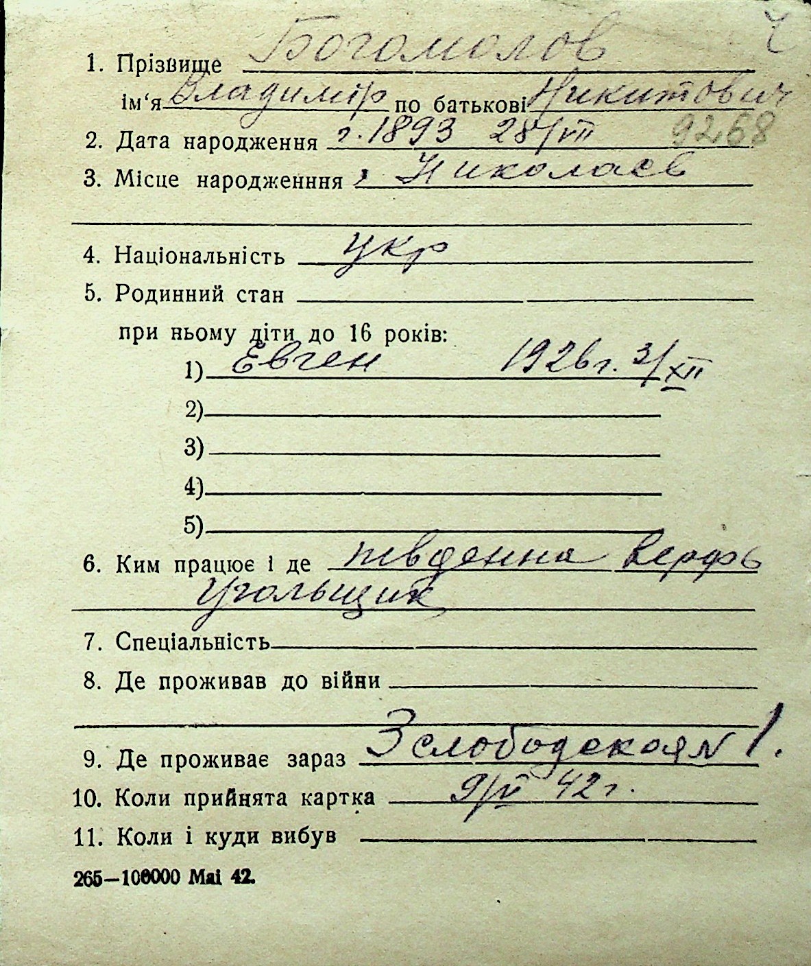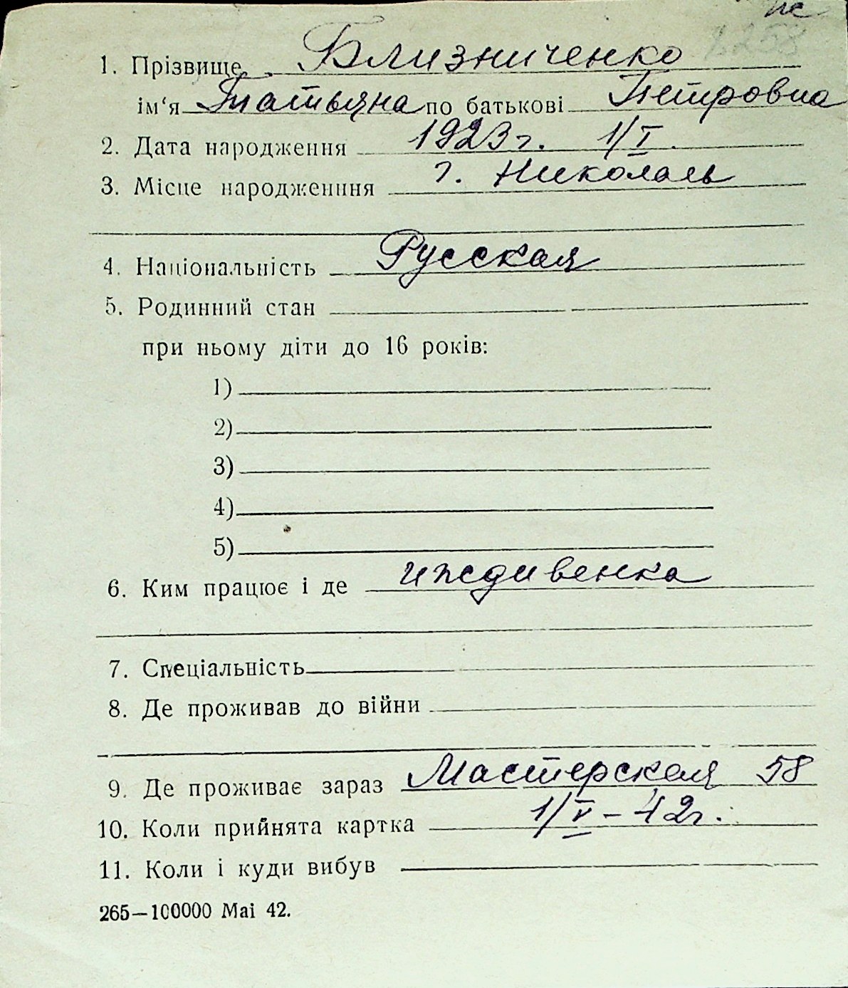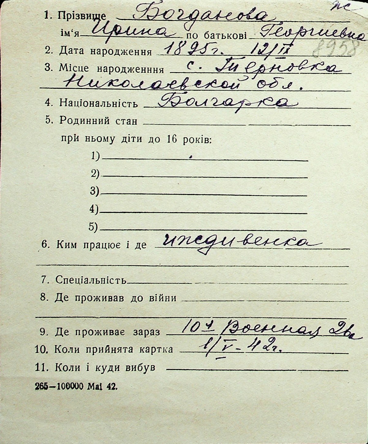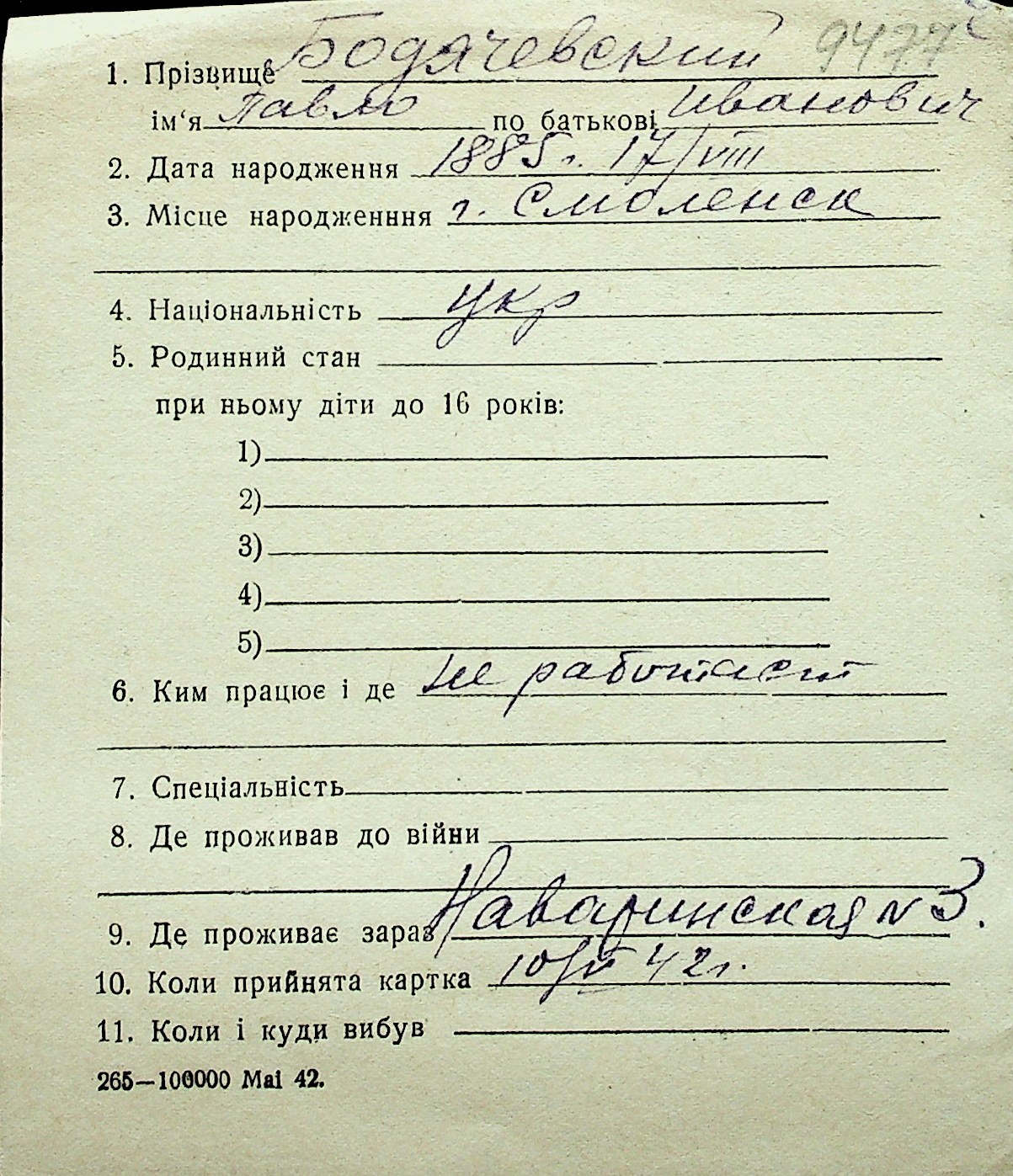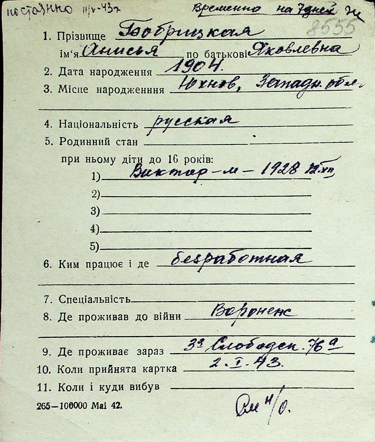 ◦ ◦ Перелік карток на осіб, які мешкали у м. Миколаїв у період окупації 1941–1944 років