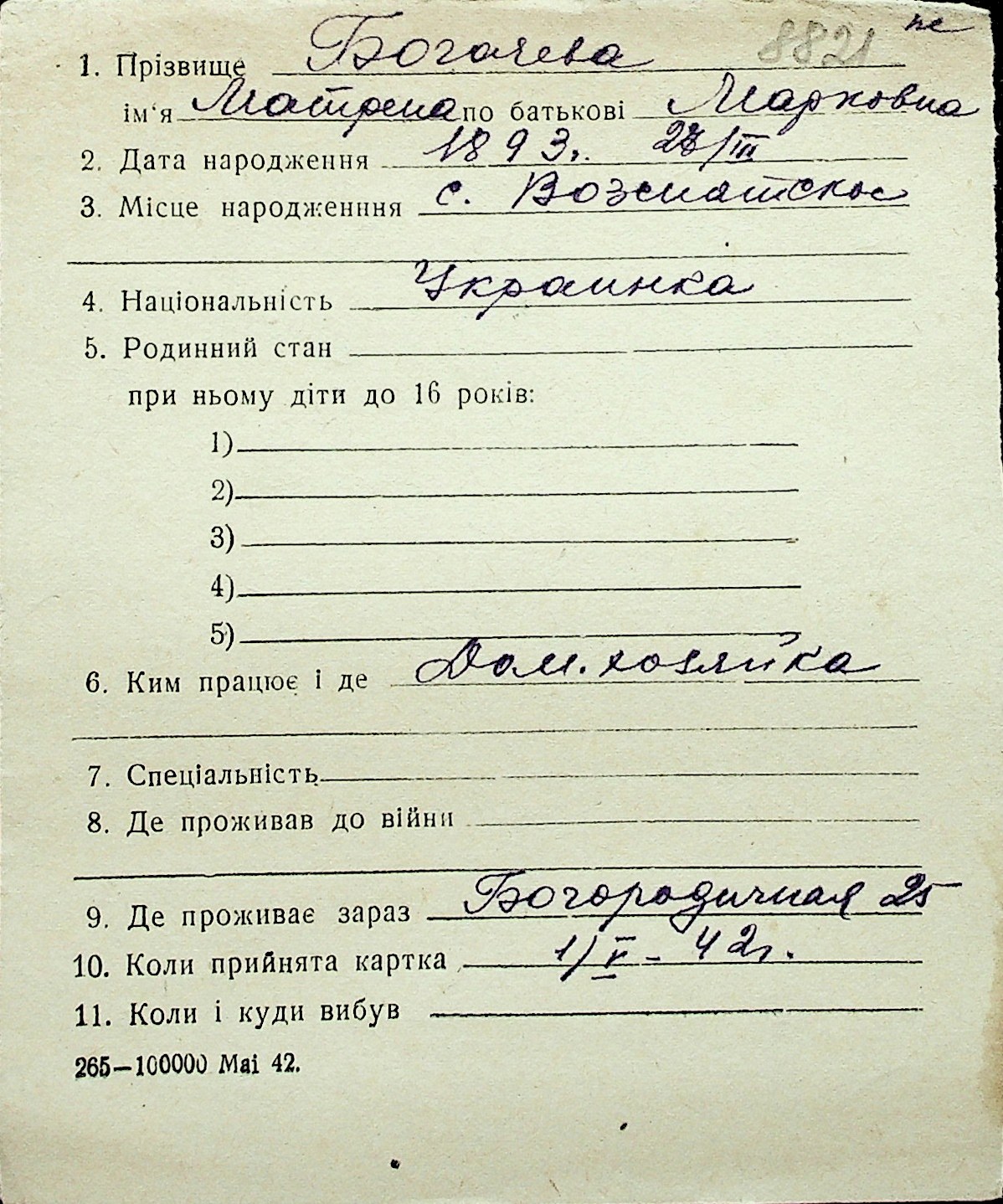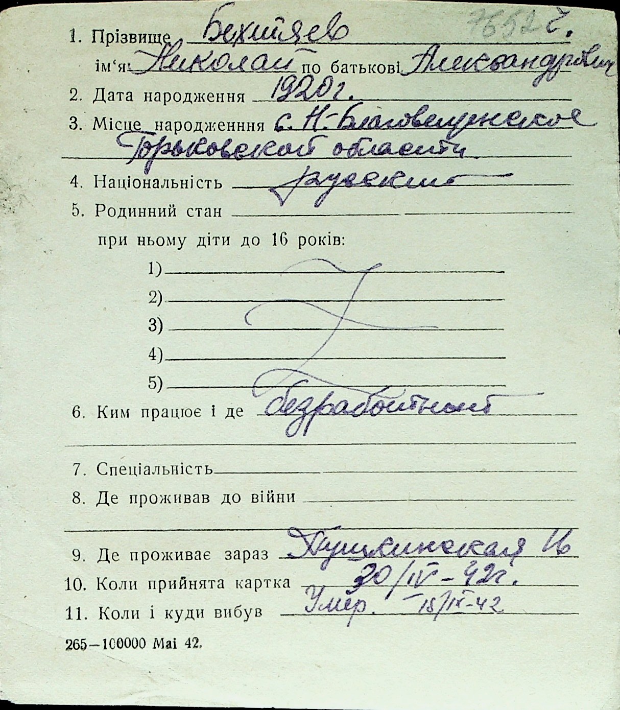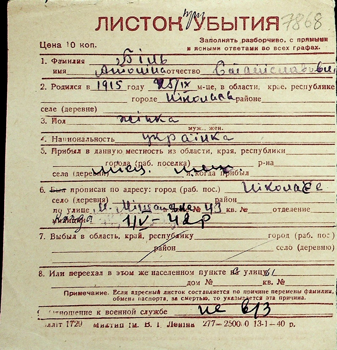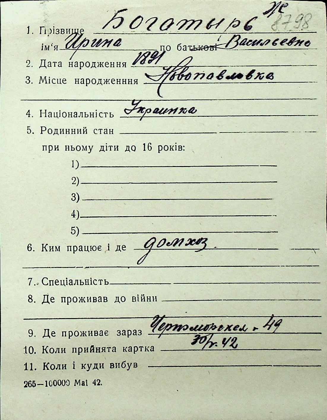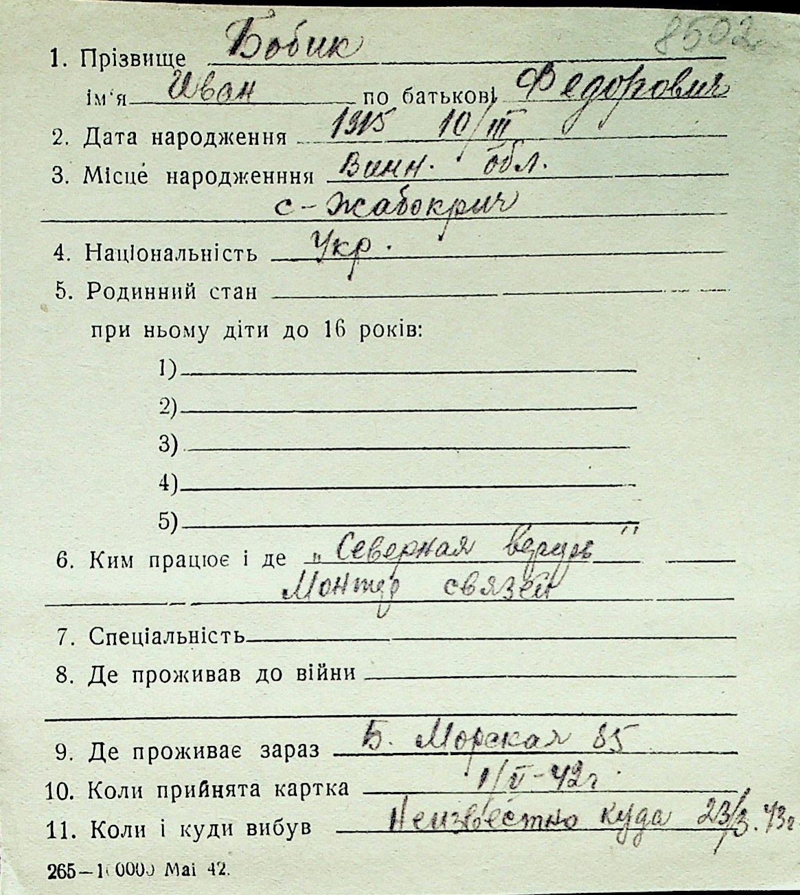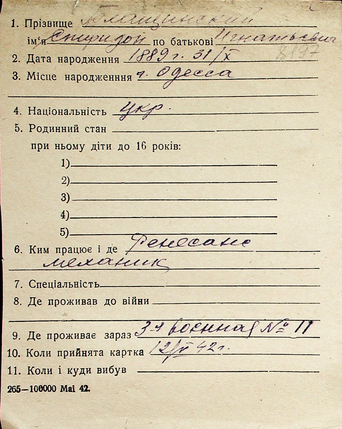 ◦ ◦ Перелік карток на осіб, які мешкали у м. Миколаїв у період окупації 1941–1944 років