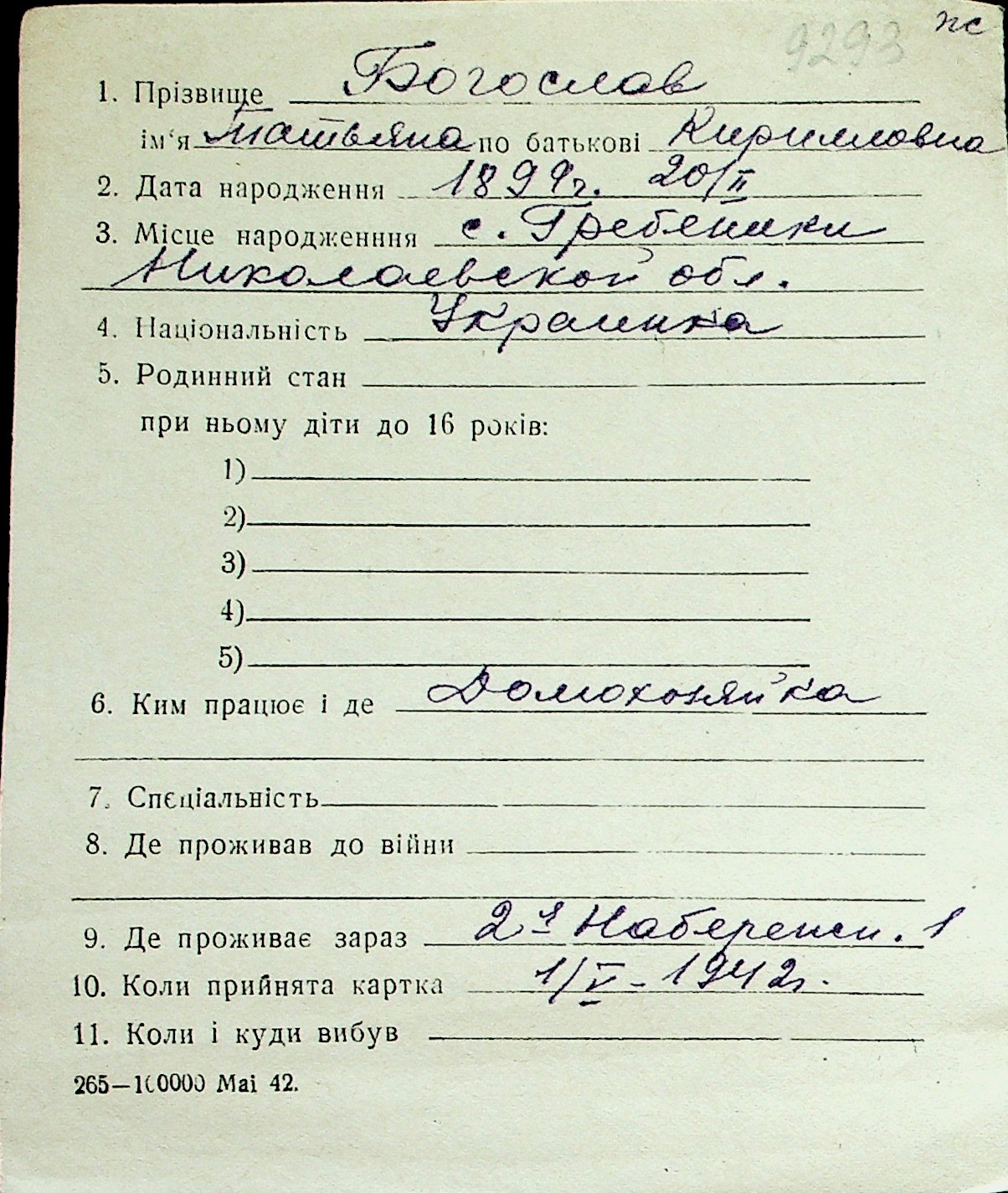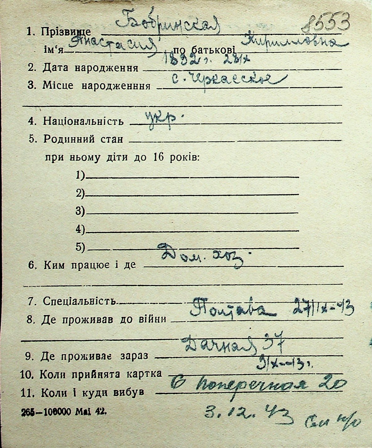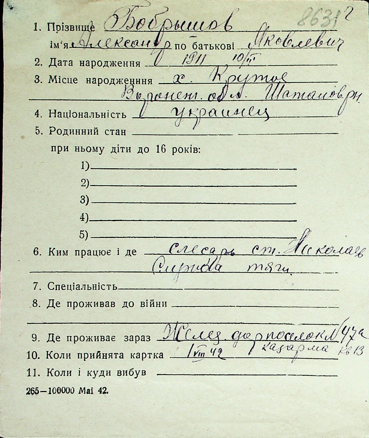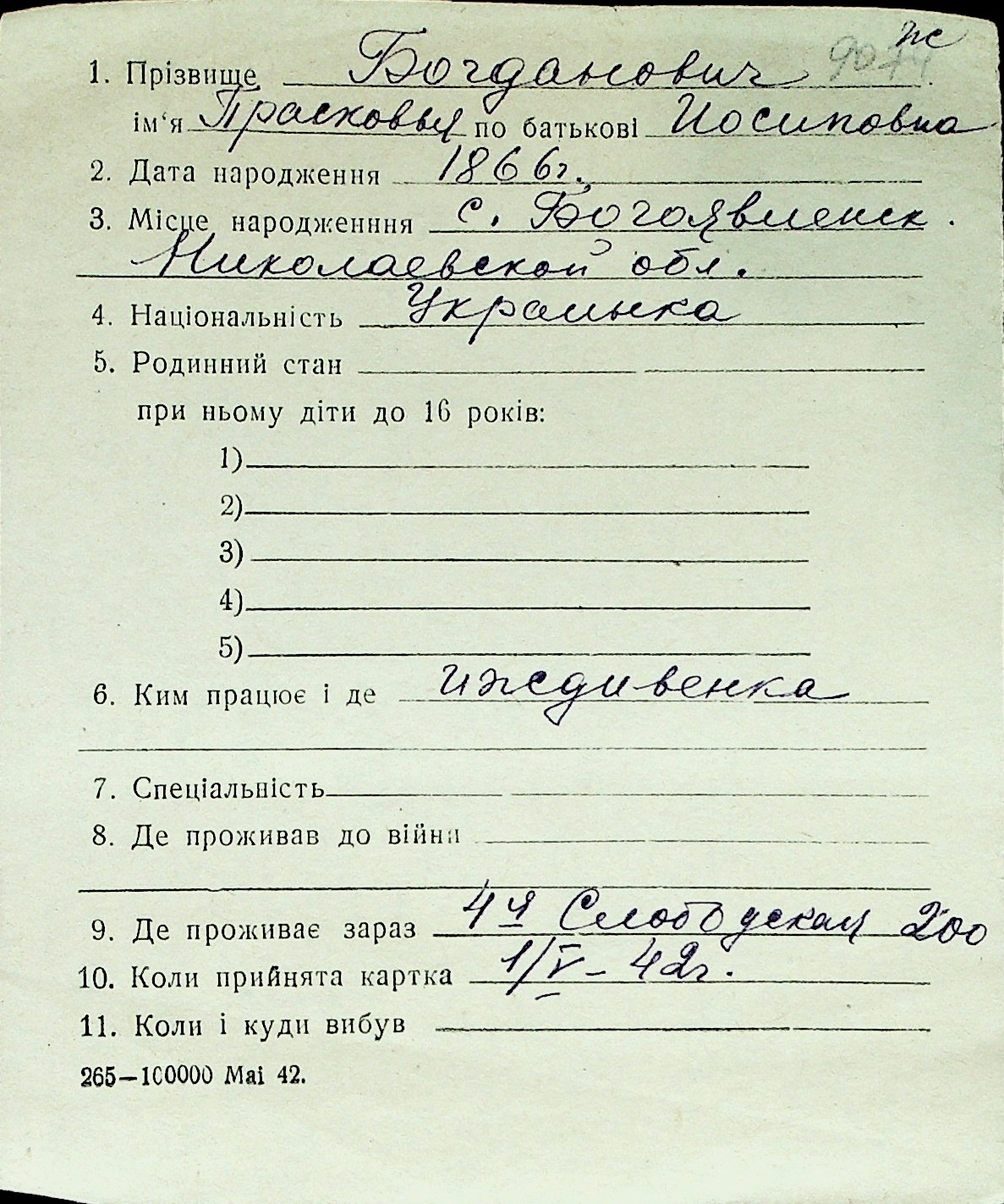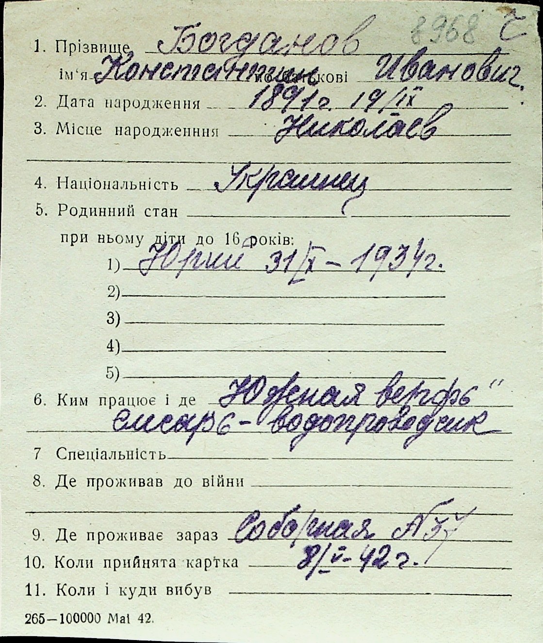 ◦ ◦ Перелік карток на осіб, які мешкали у м. Миколаїв у період окупації 1941–1944 років