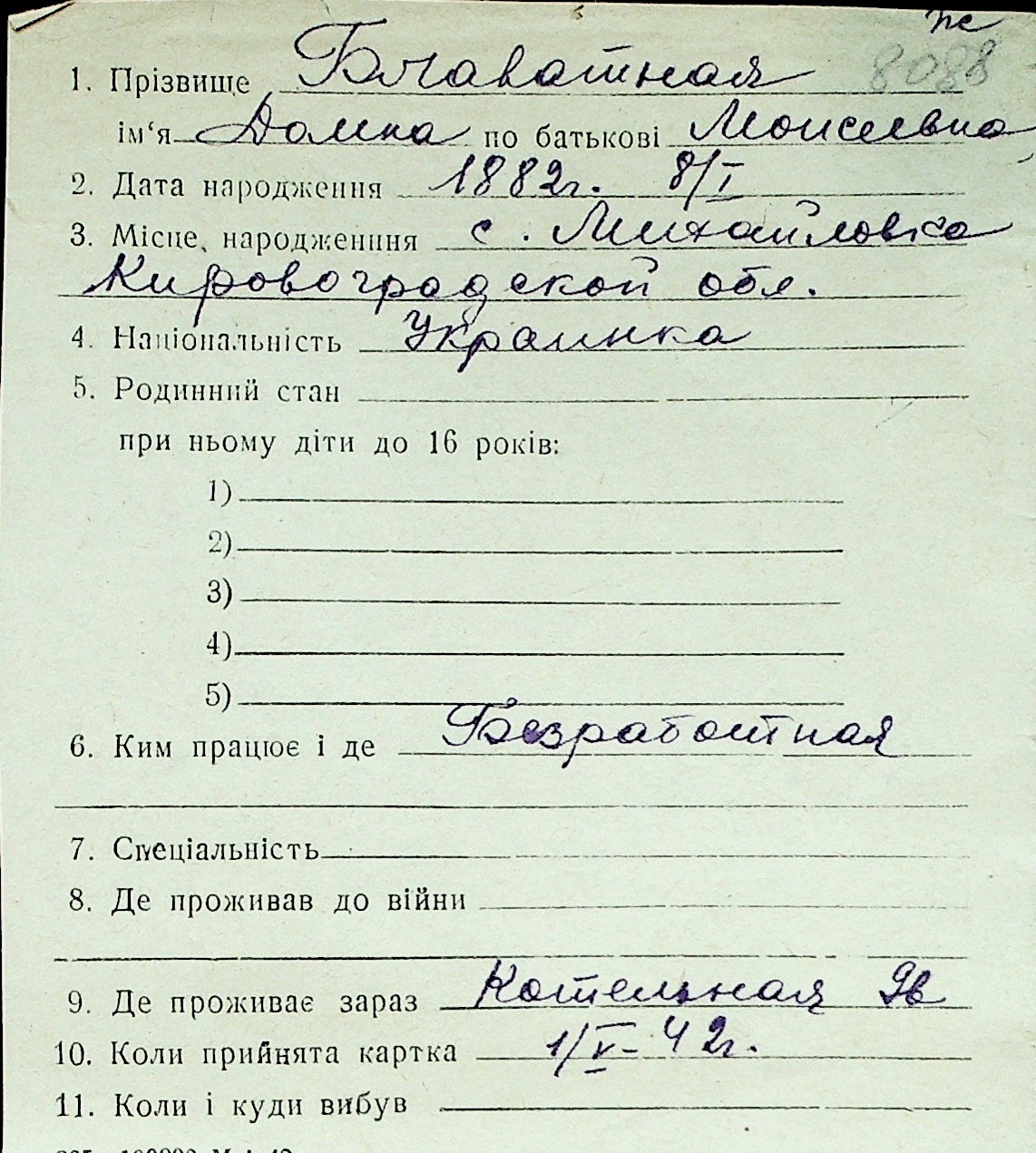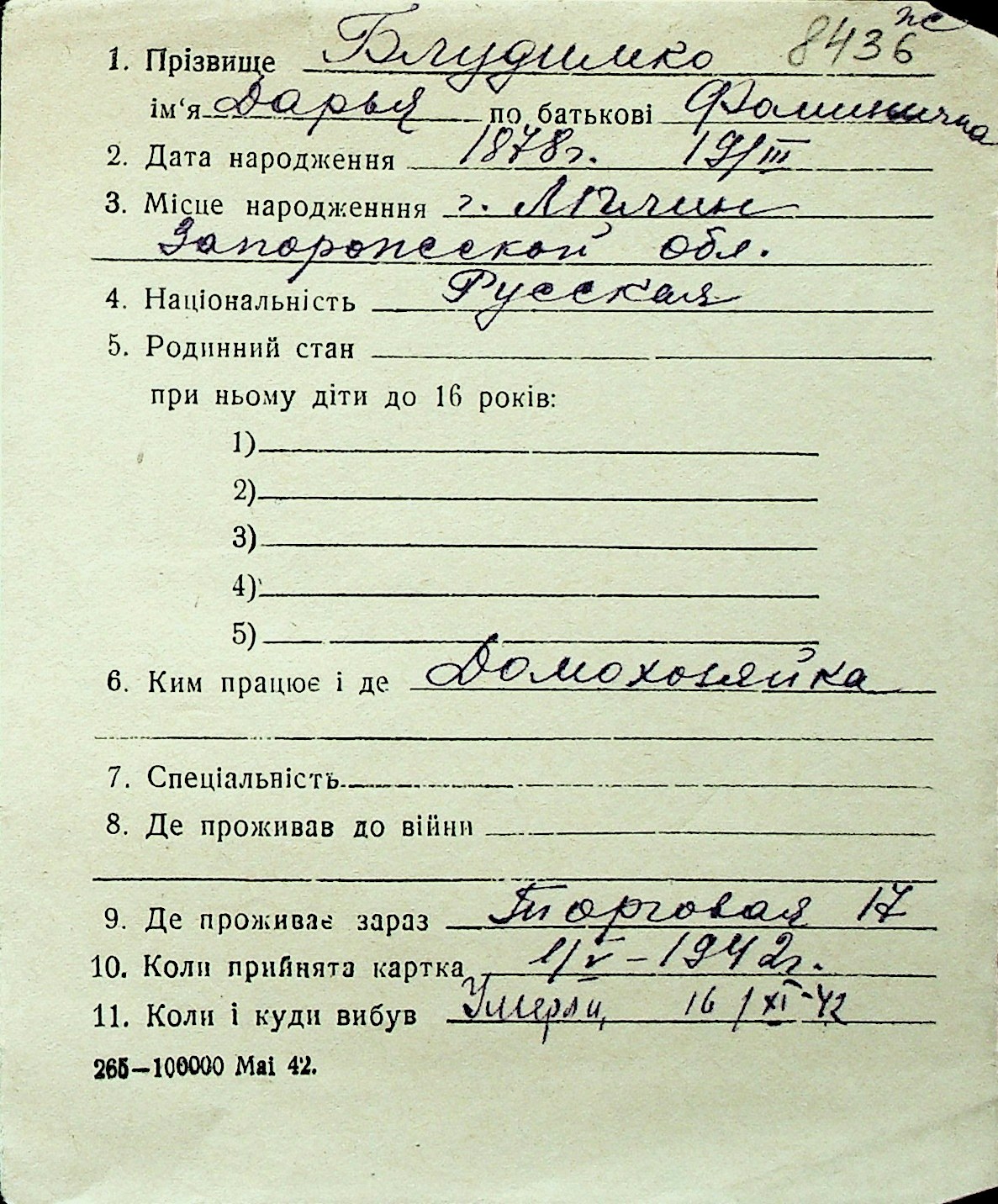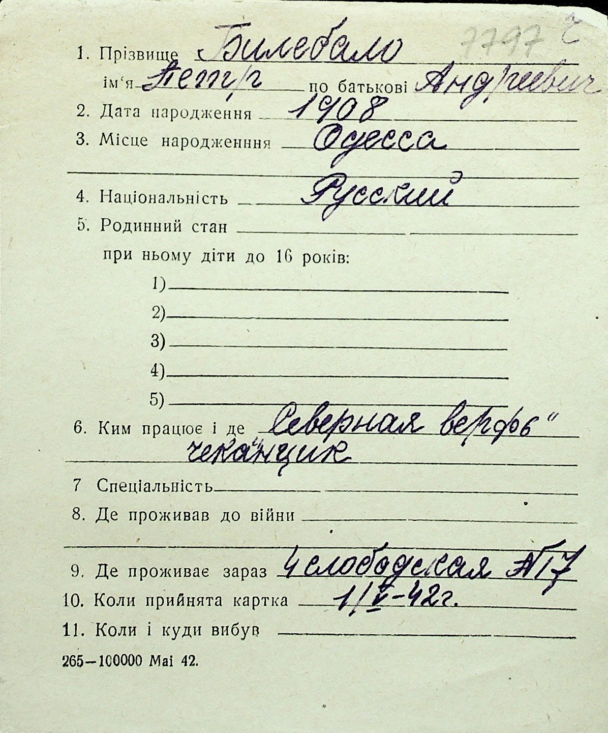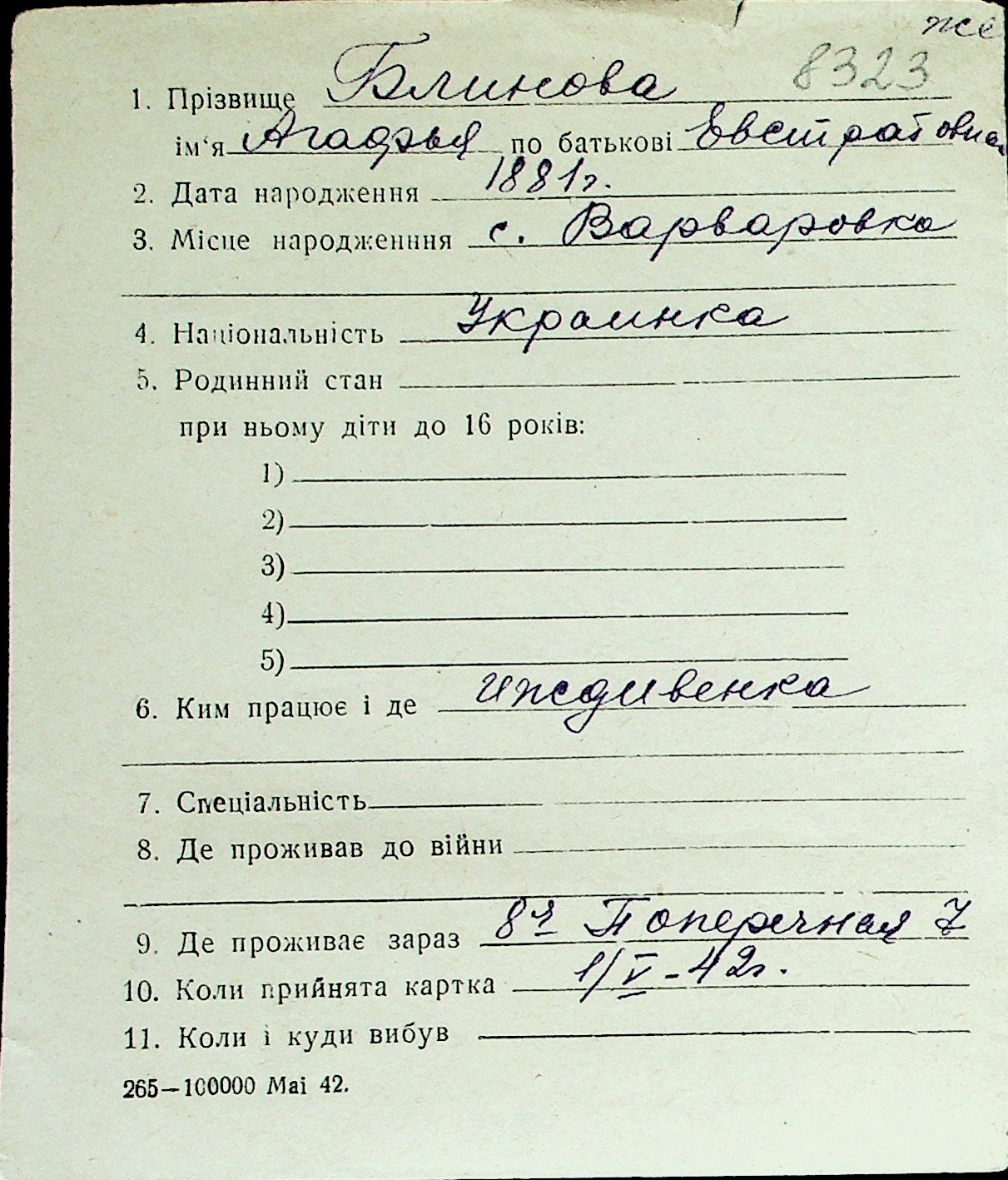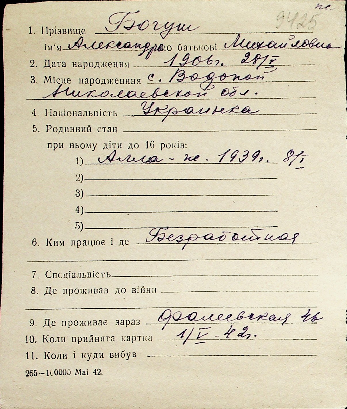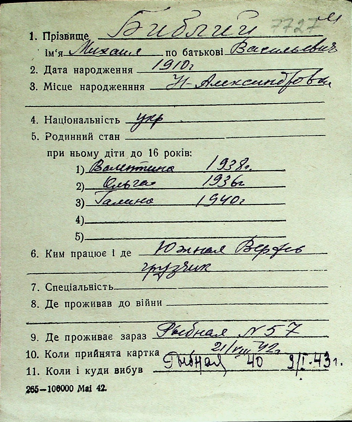 ◦ ◦ Перелік карток на осіб, які мешкали у м. Миколаїв у період окупації 1941–1944 років