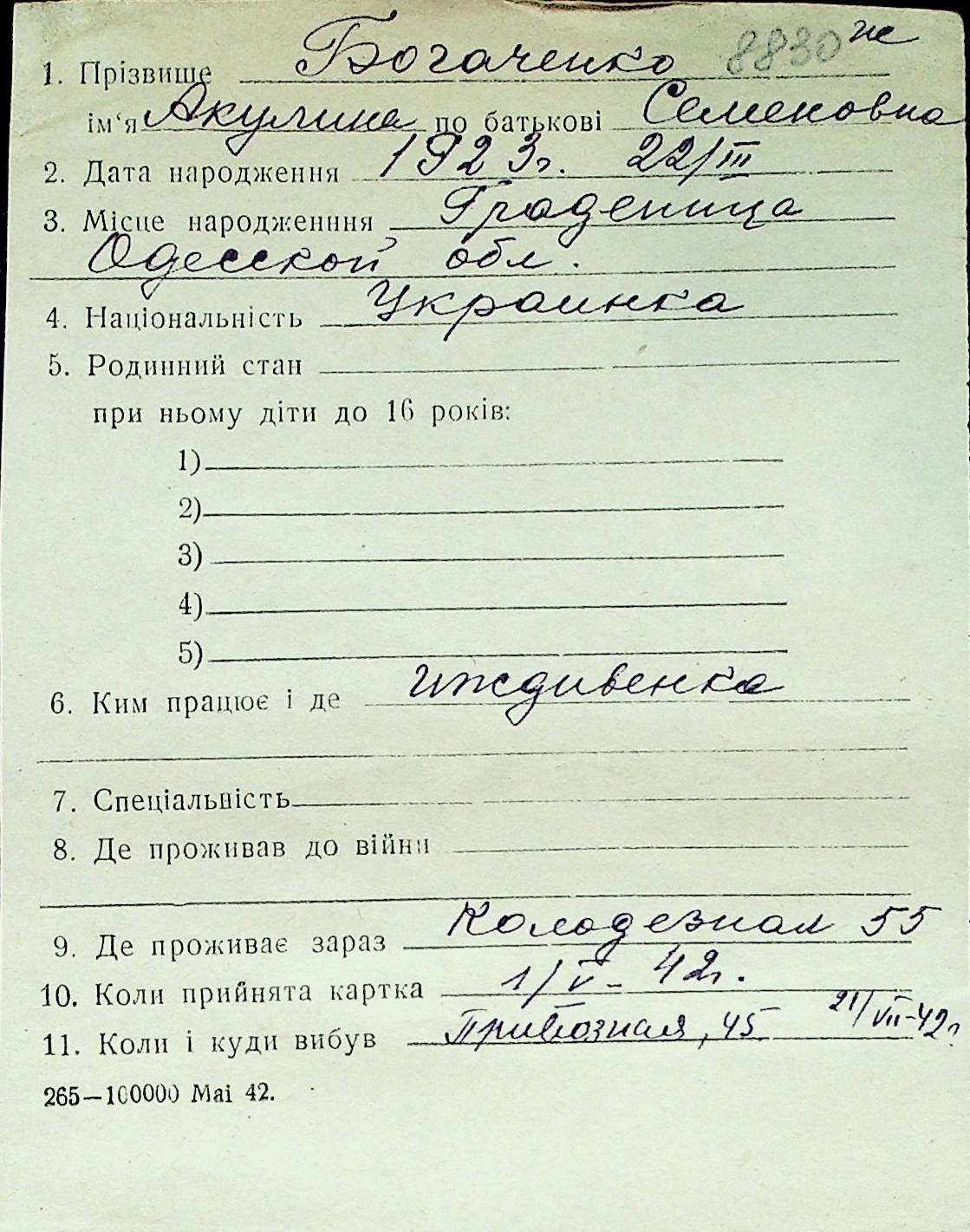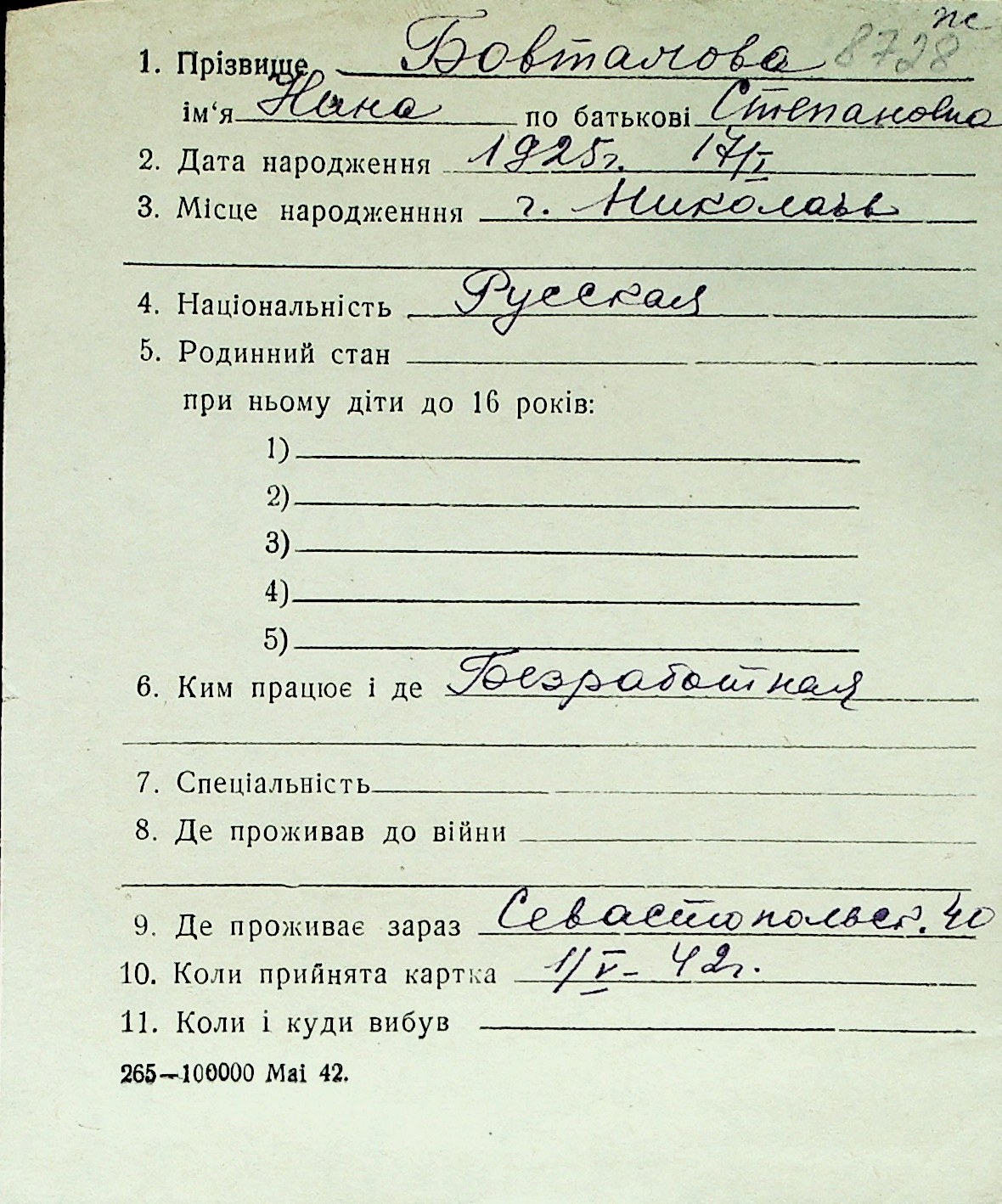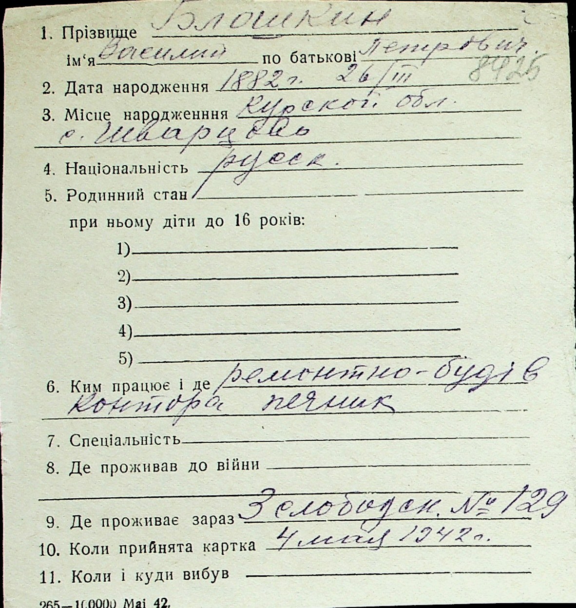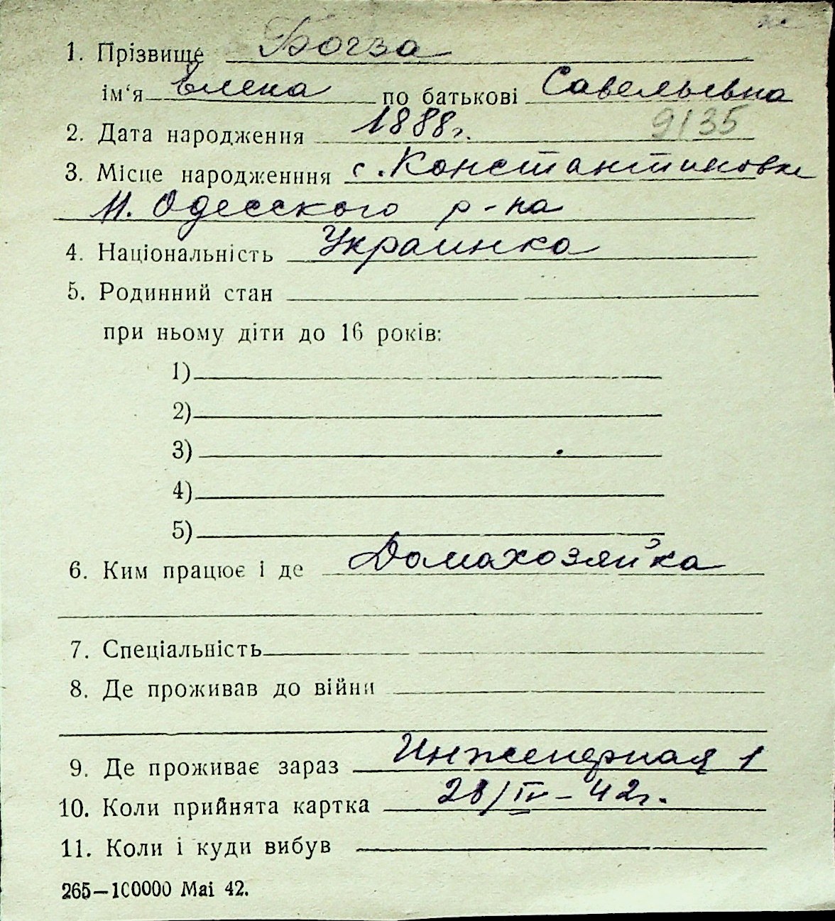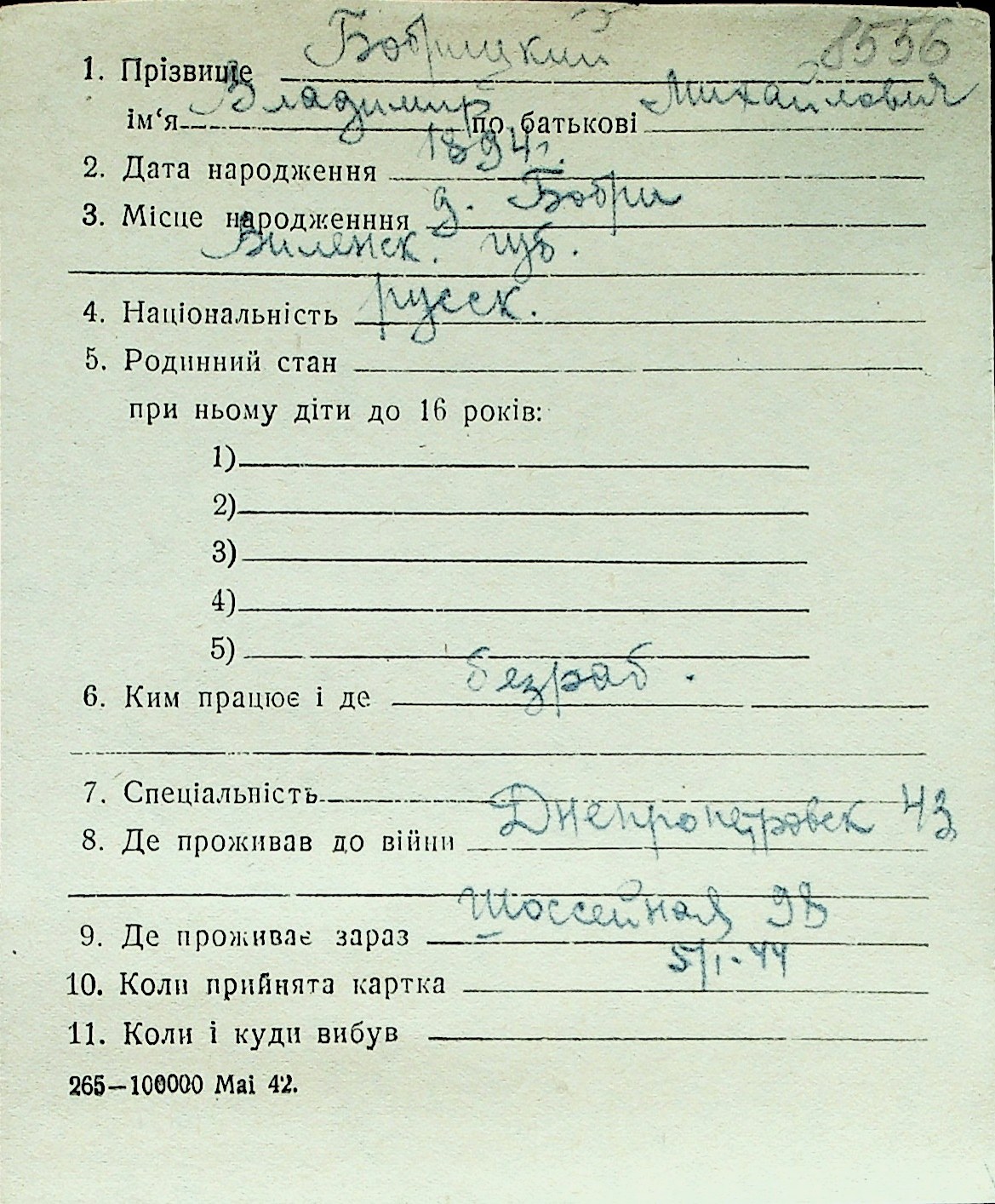◦ ◦ Перелік карток на осіб, які мешкали у м. Миколаїв у період окупації 1941–1944 років