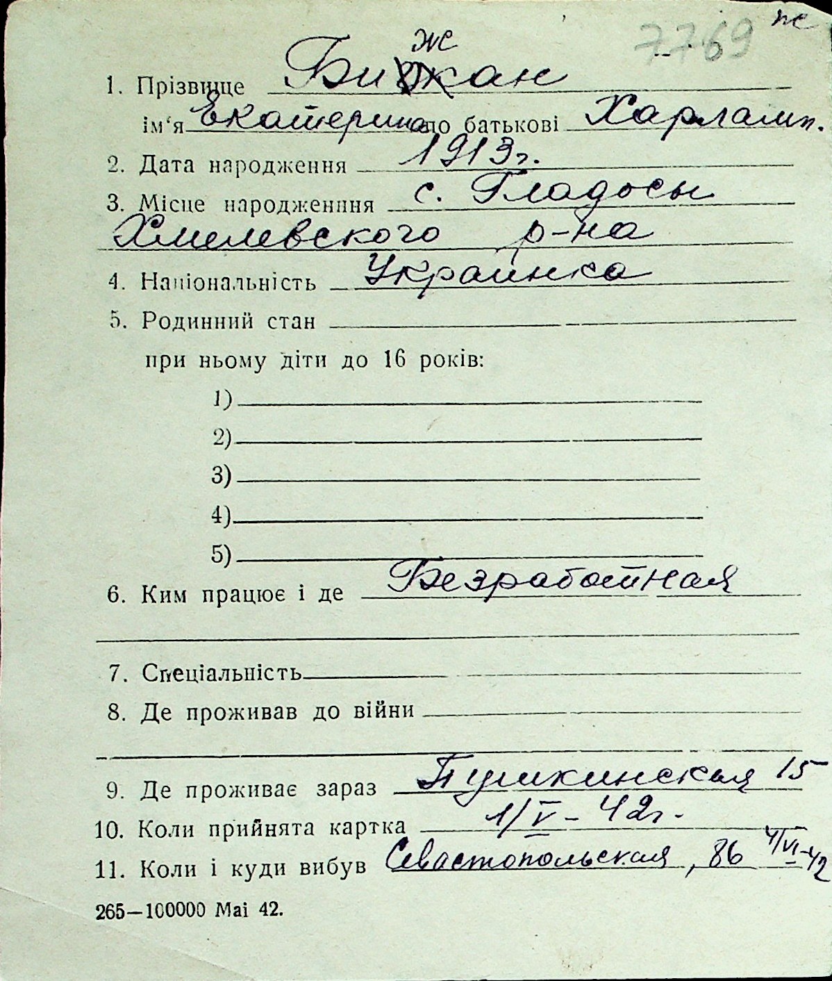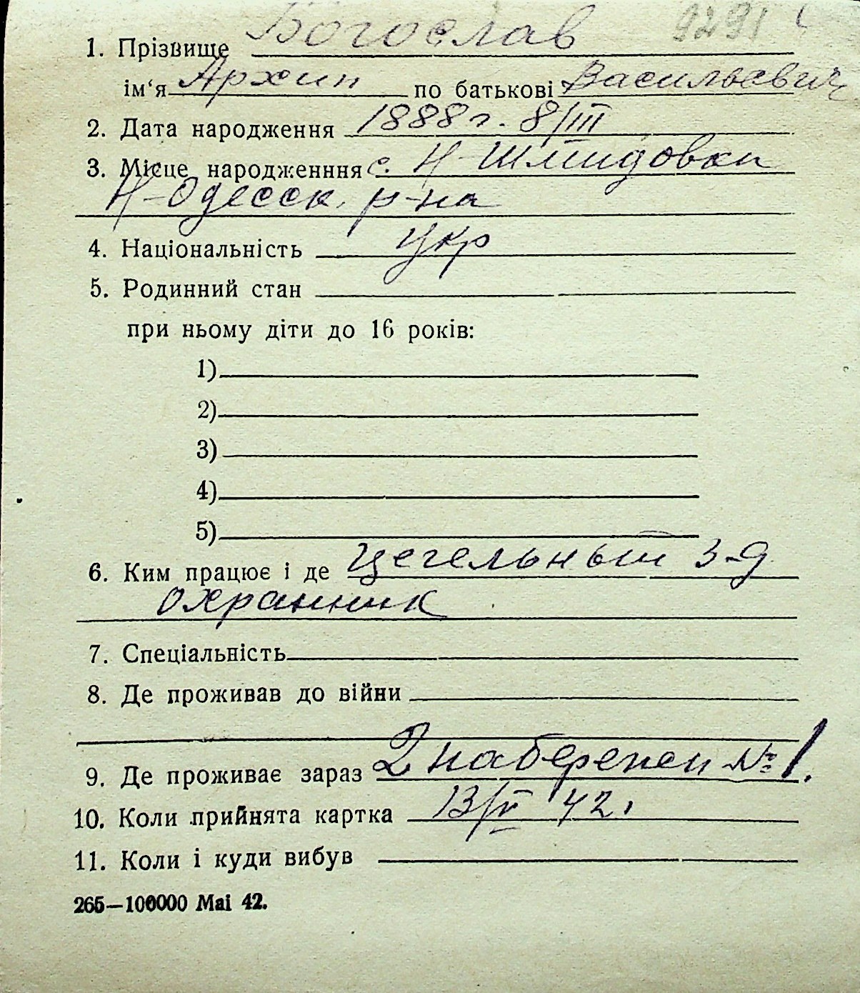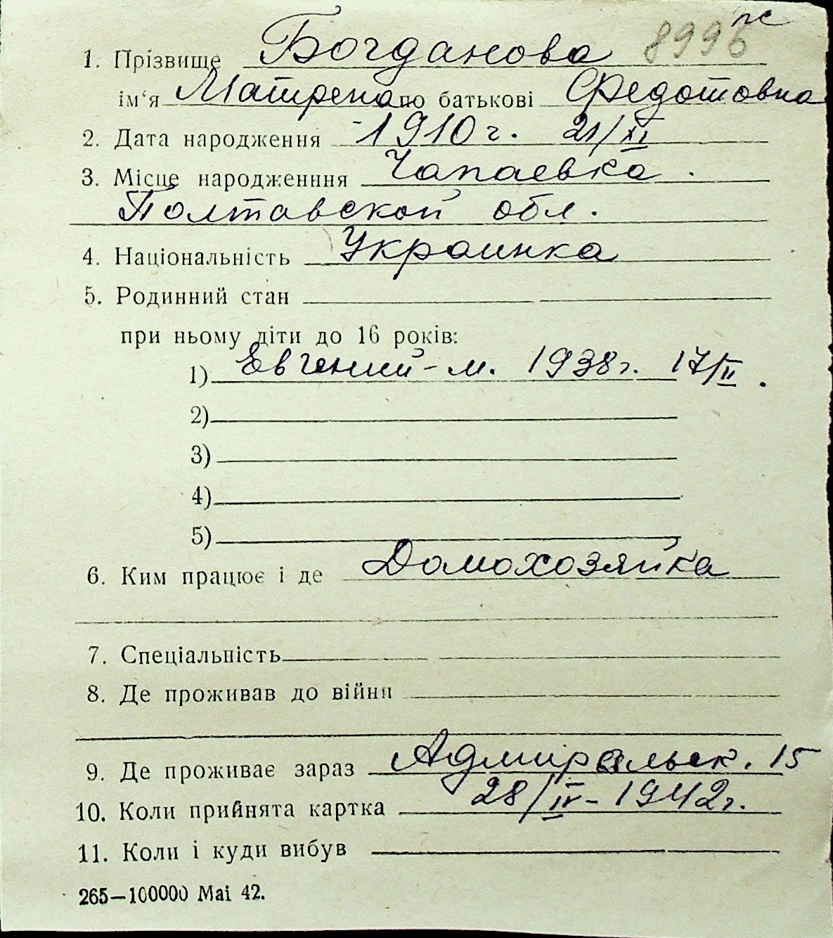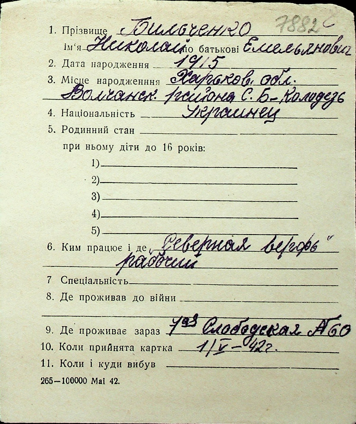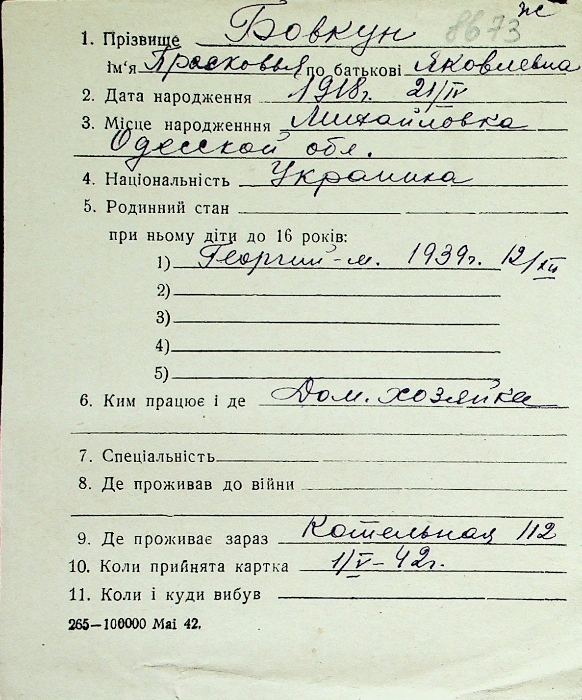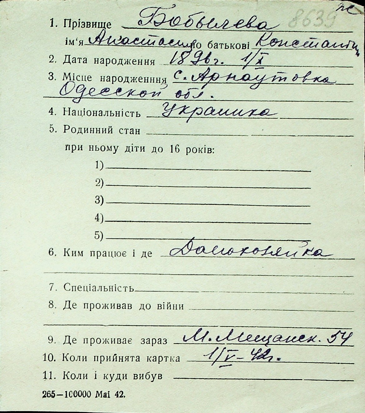 ◦ ◦ Перелік карток на осіб, які мешкали у м. Миколаїв у період окупації 1941–1944 років