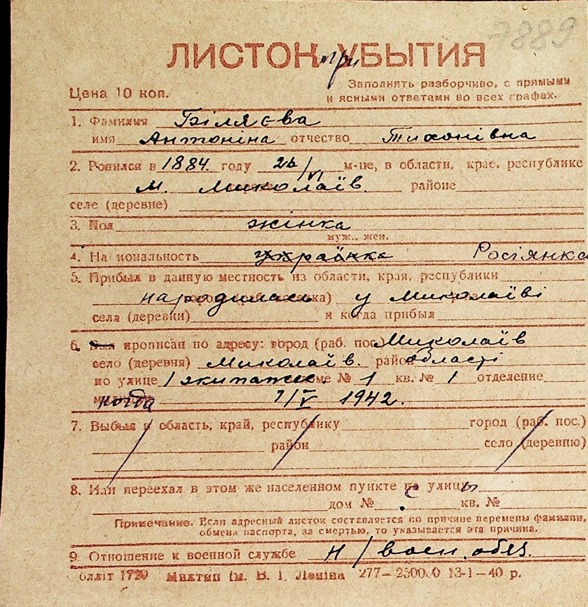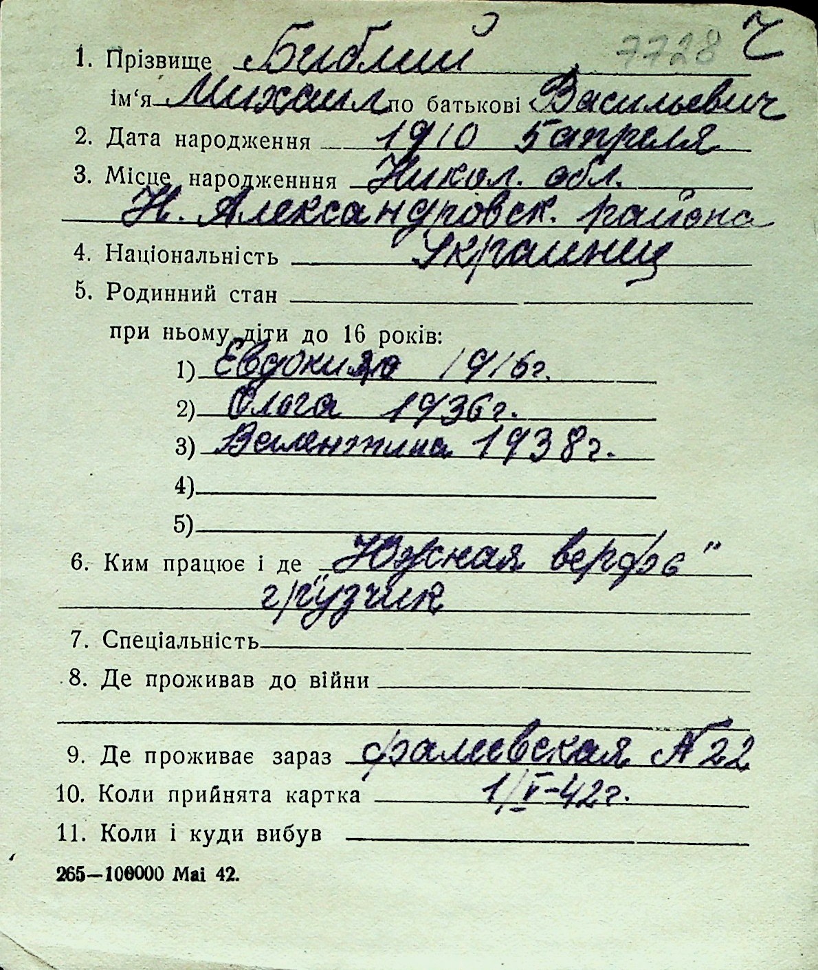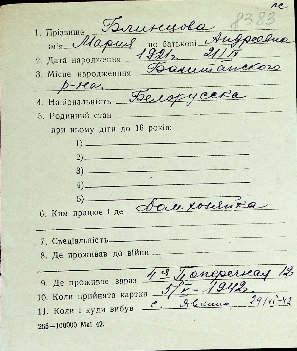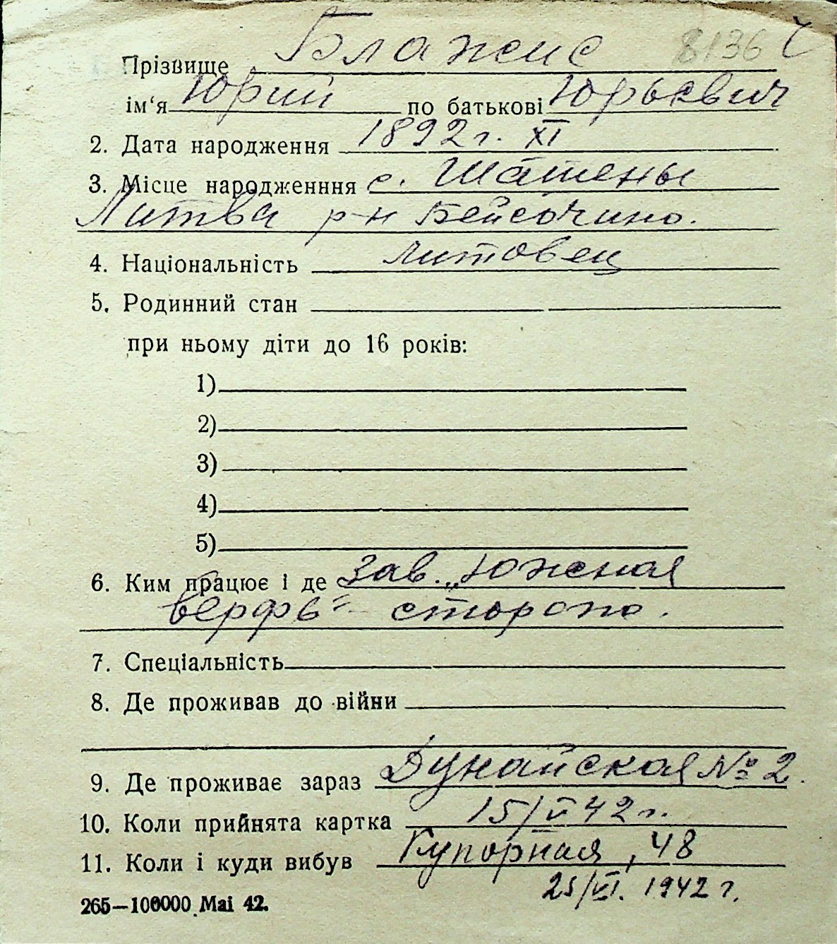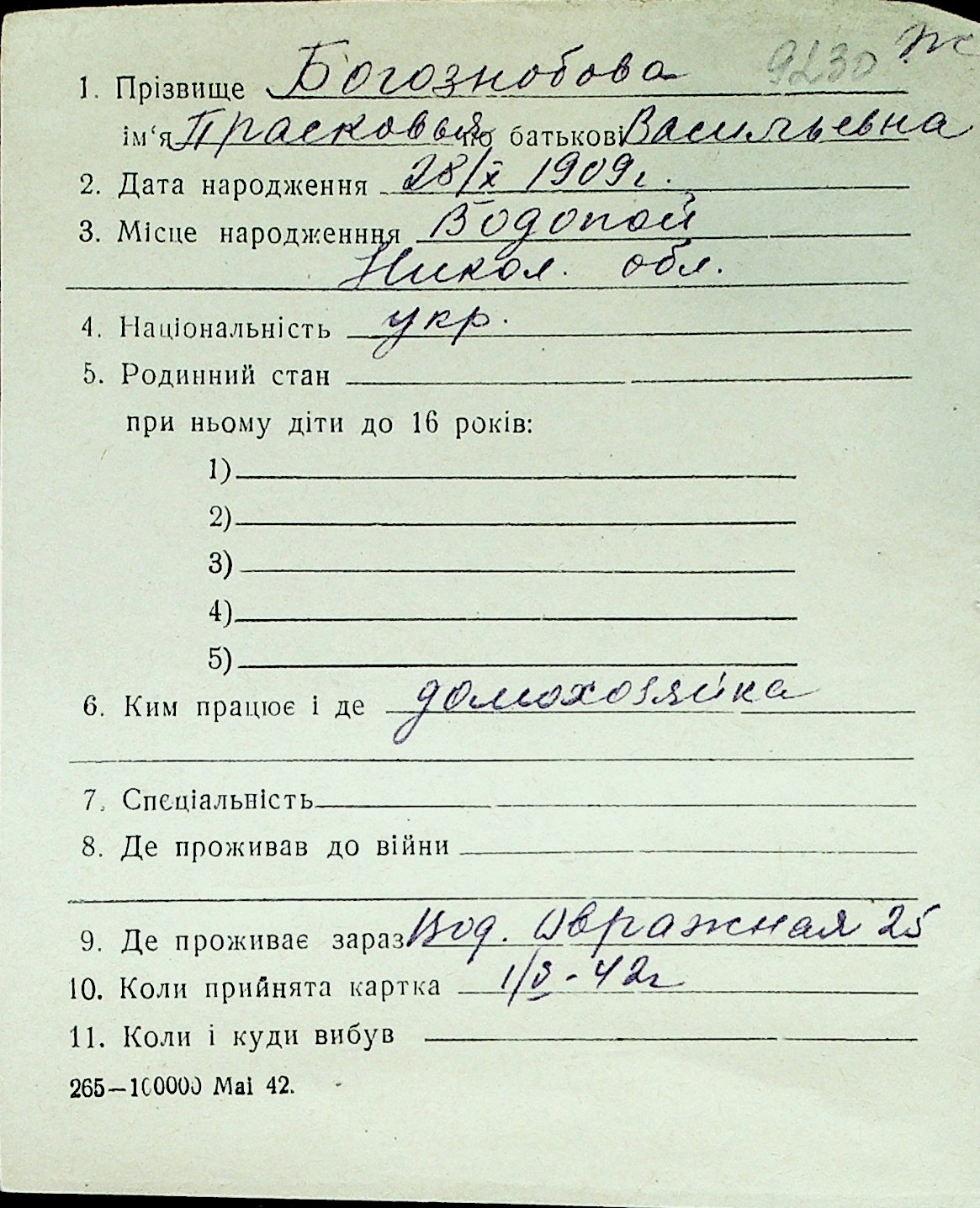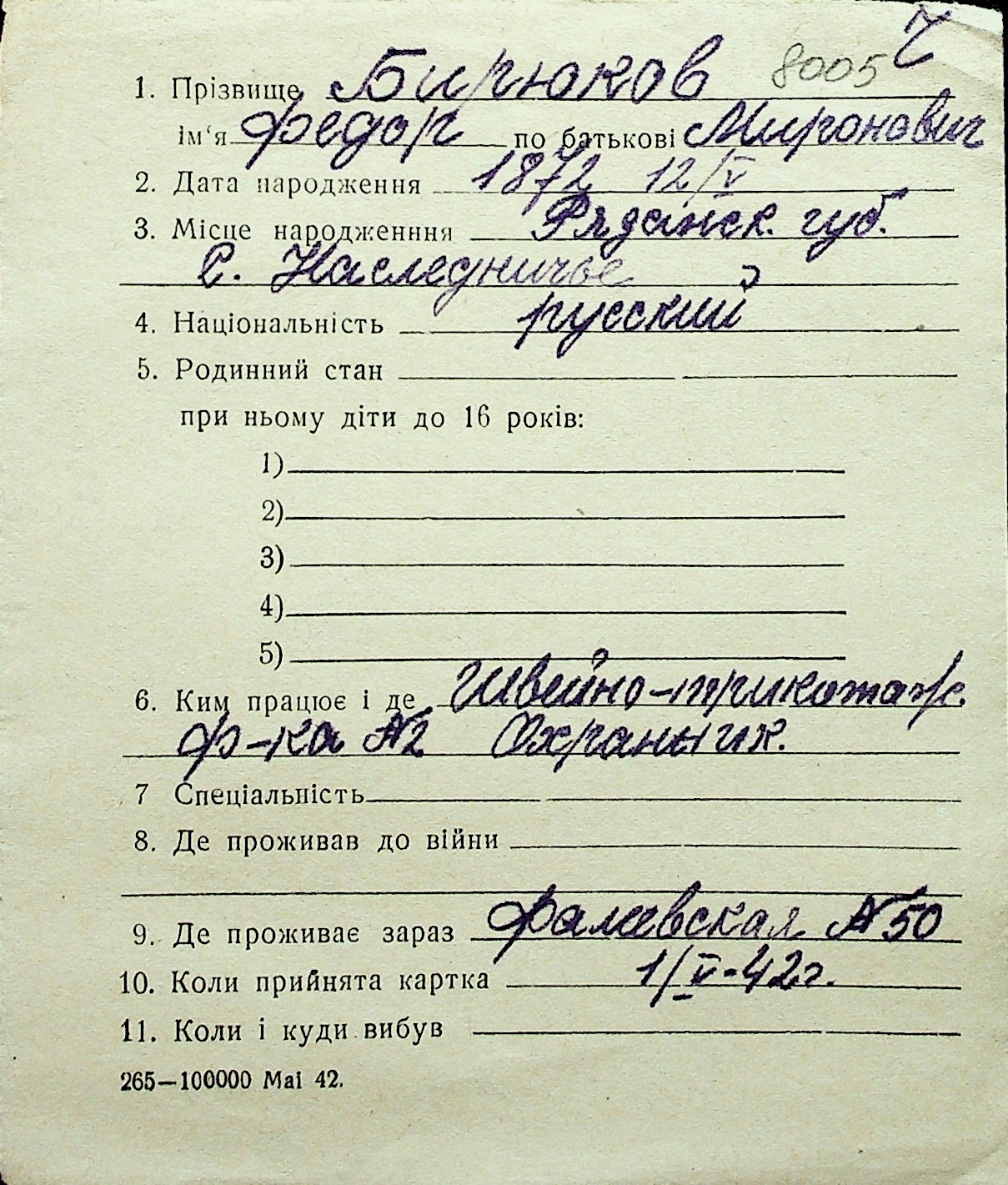 ◦ ◦ Перелік карток на осіб, які мешкали у м. Миколаїв у період окупації 1941–1944 років