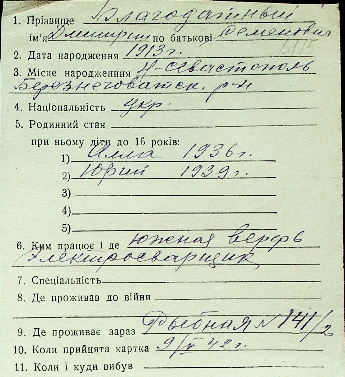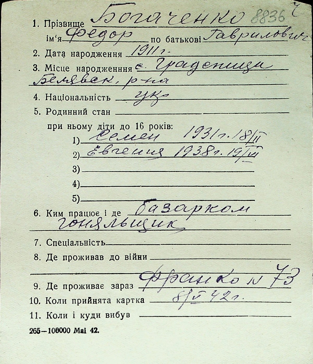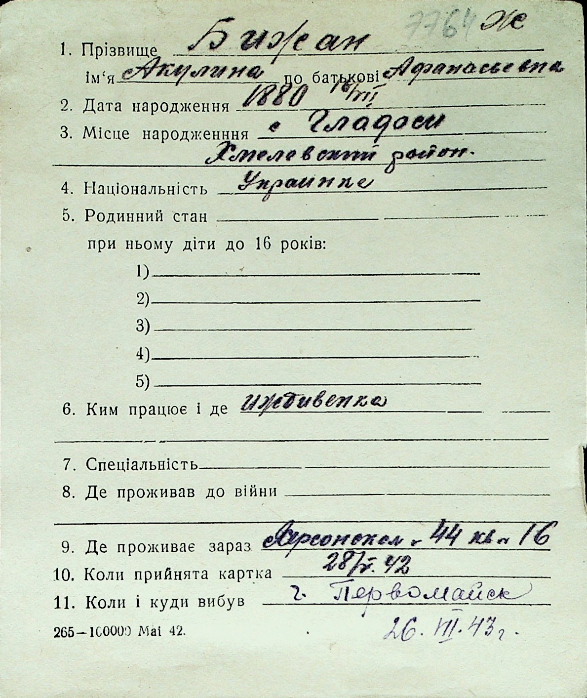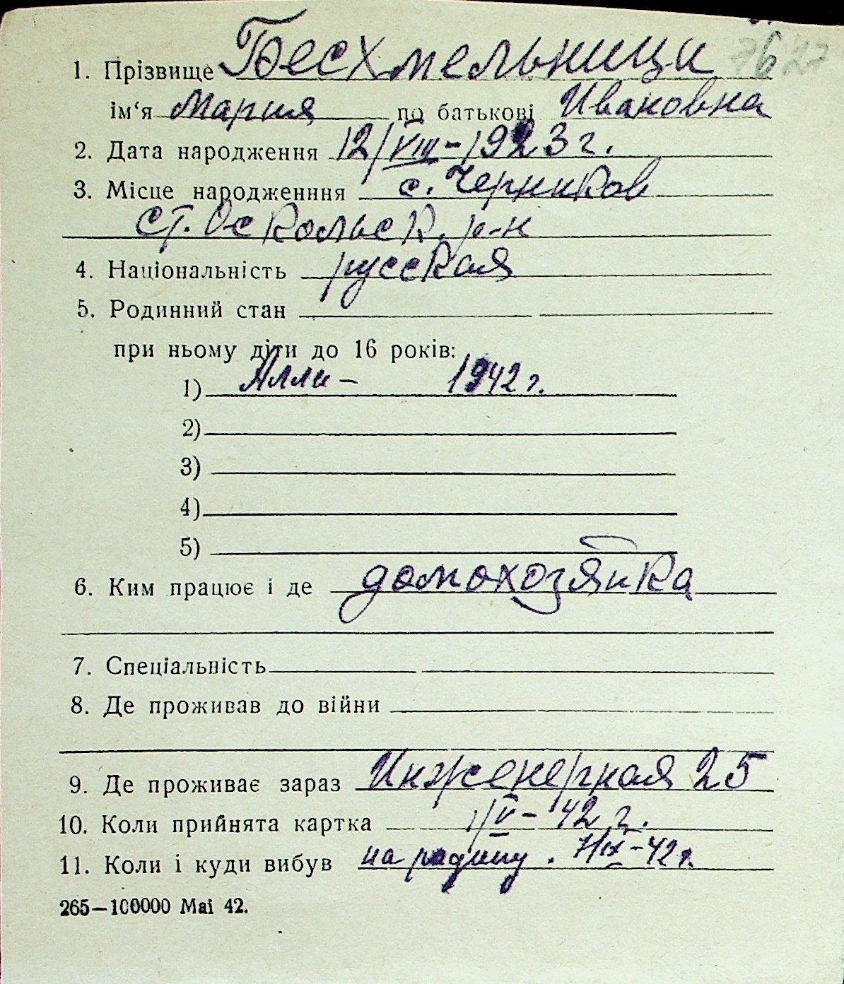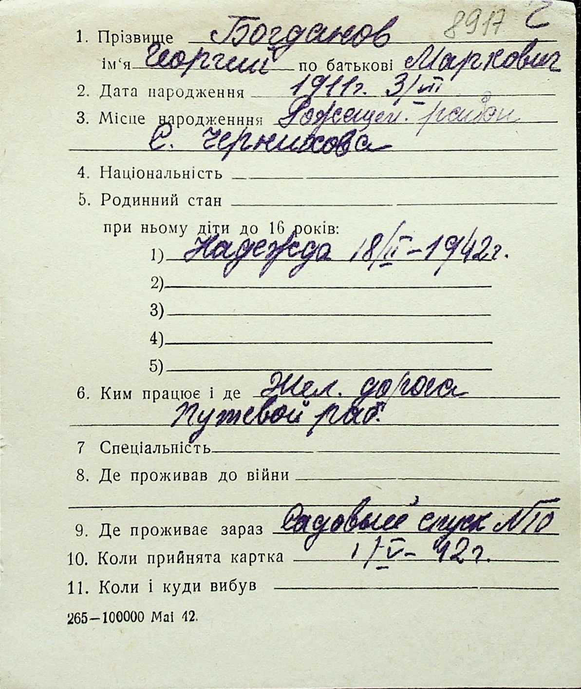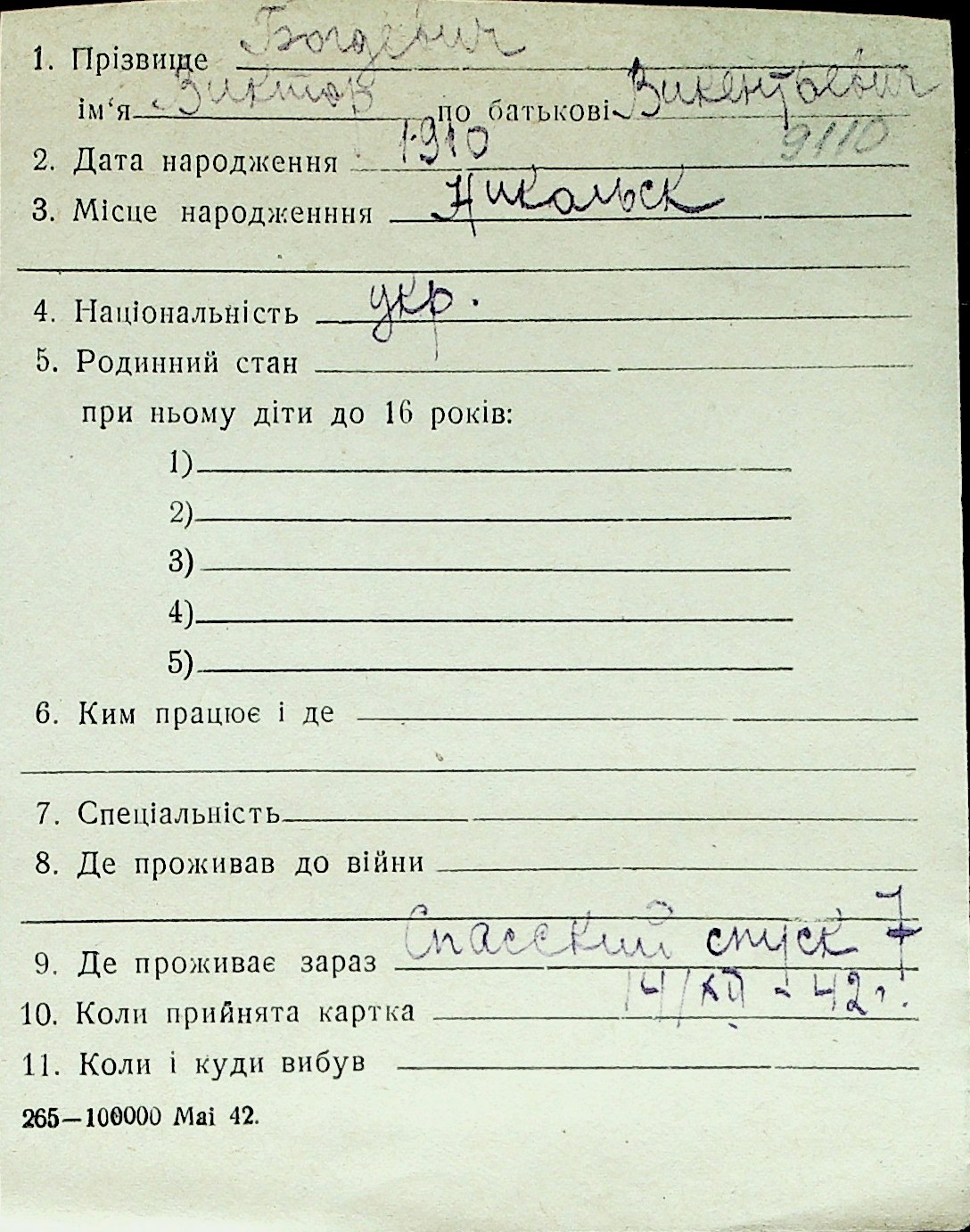◦ ◦ Перелік карток на осіб, які мешкали у м. Миколаїв у період окупації 1941–1944 років