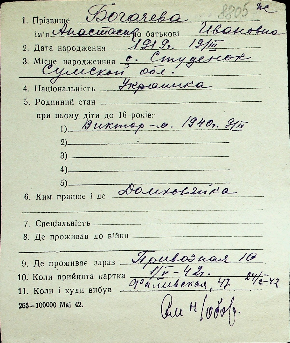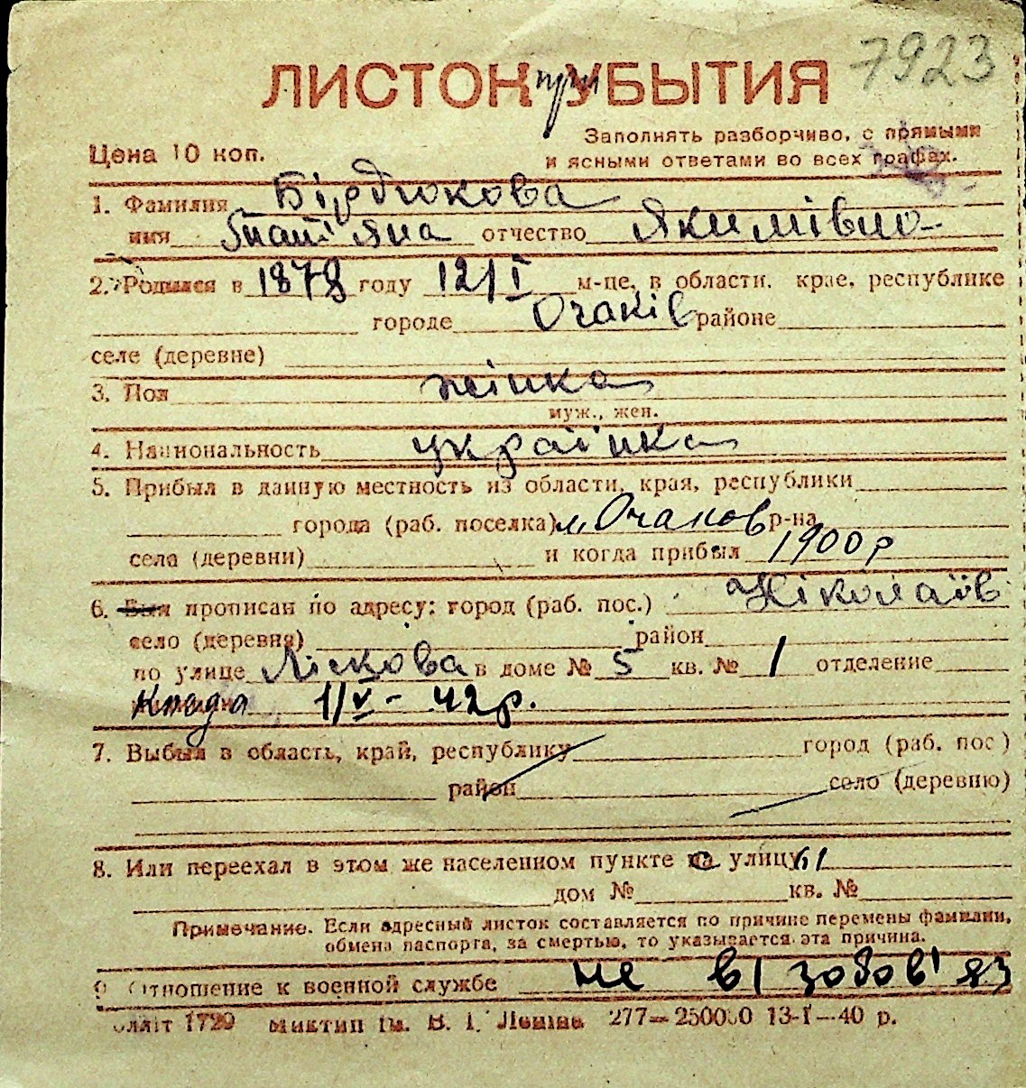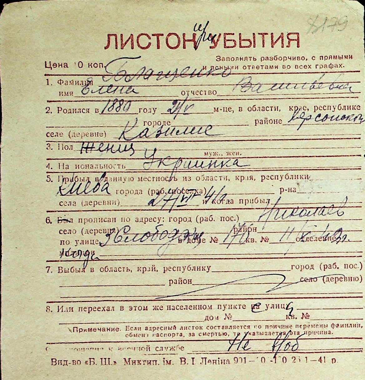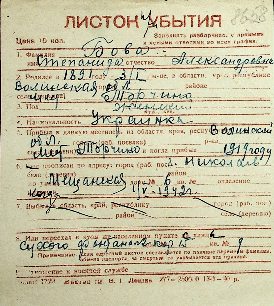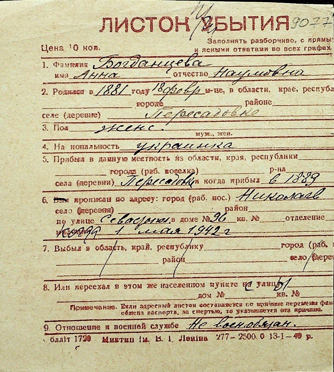 ◦ ◦ Перелік карток на осіб, які мешкали у м. Миколаїв у період окупації 1941–1944 років