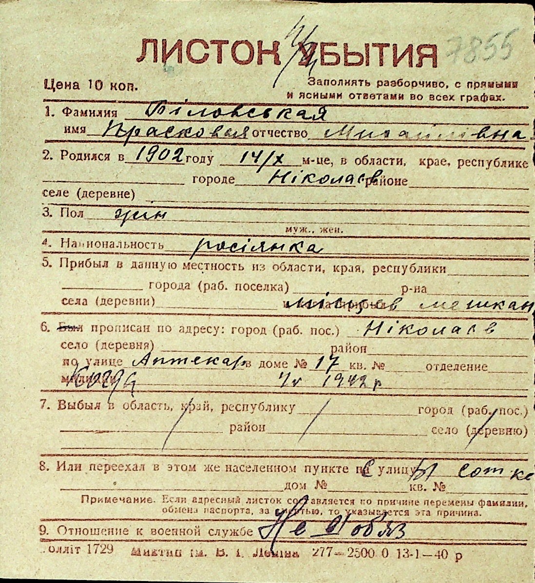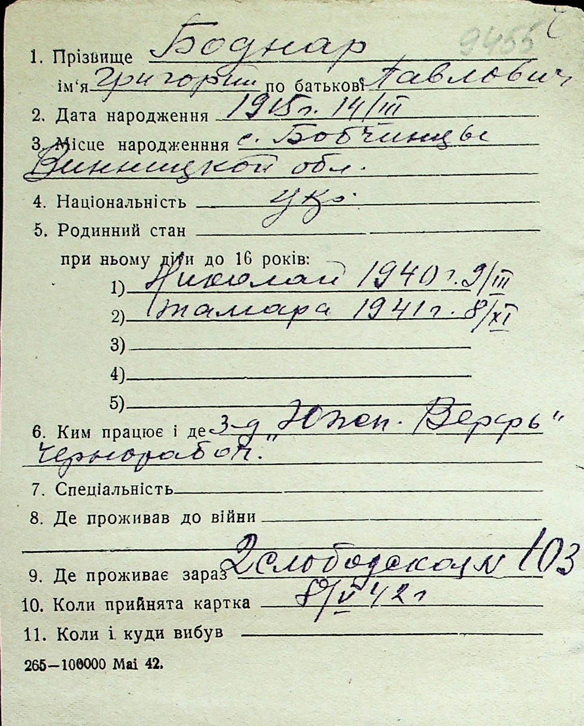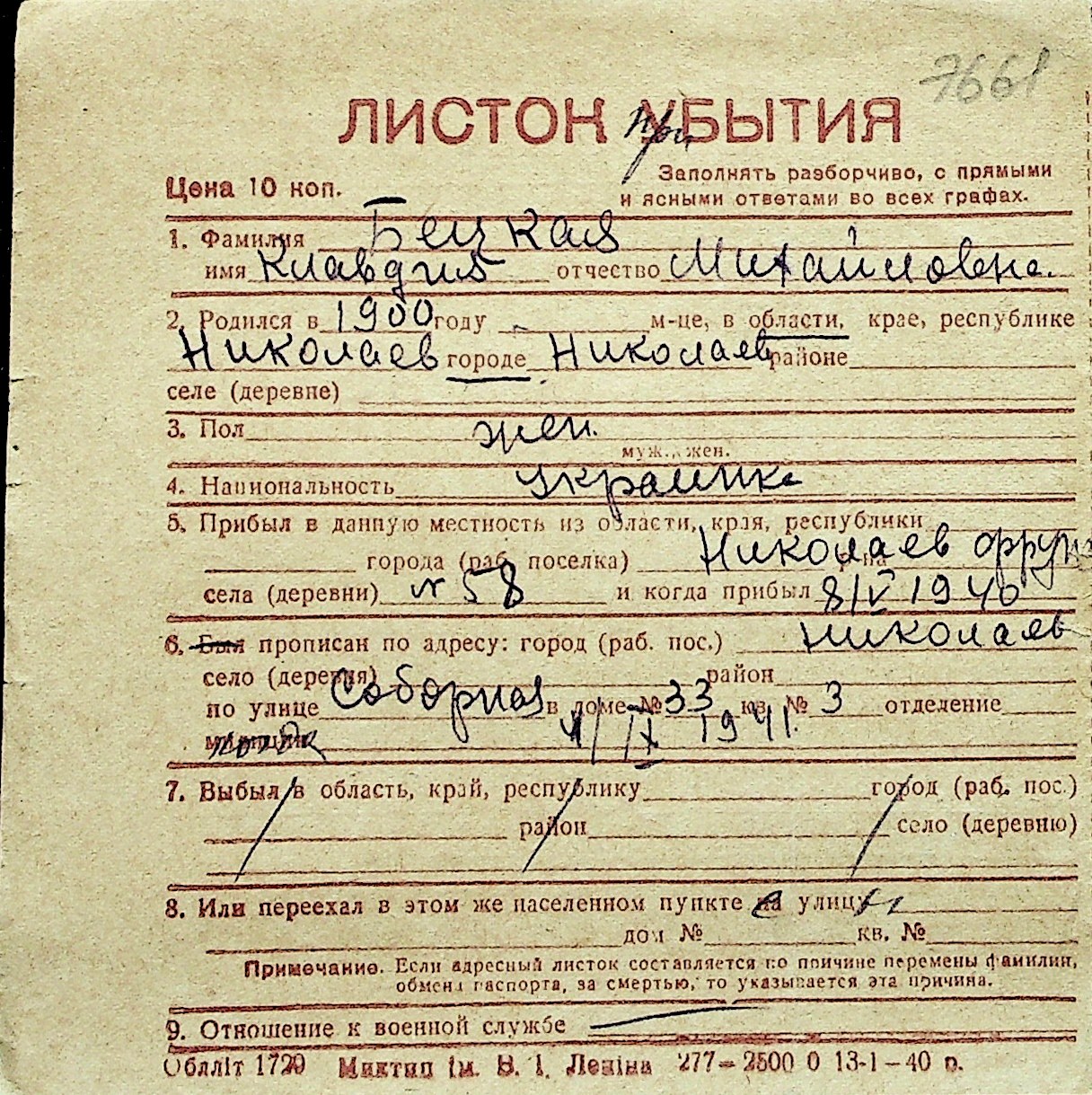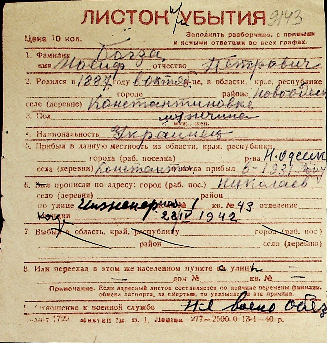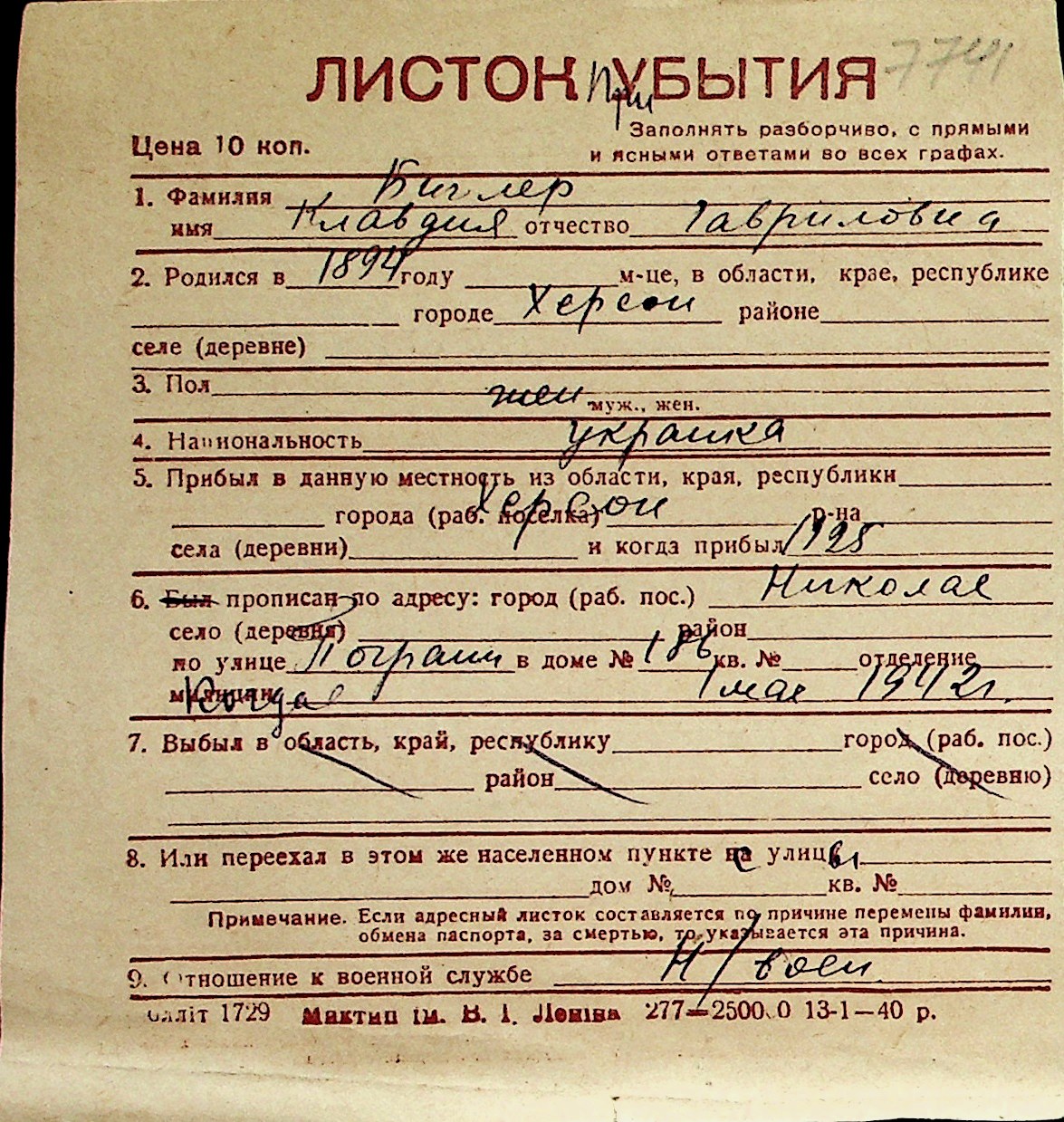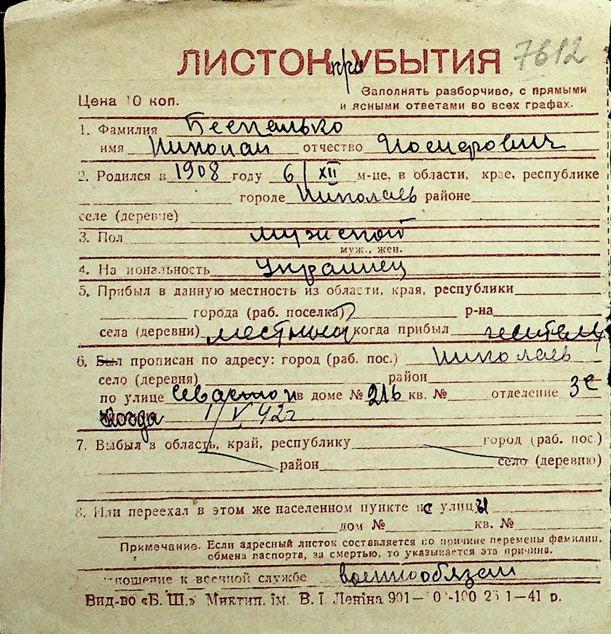 ◦ ◦ Перелік карток на осіб, які мешкали у м. Миколаїв у період окупації 1941–1944 років