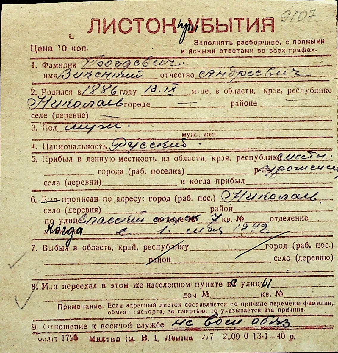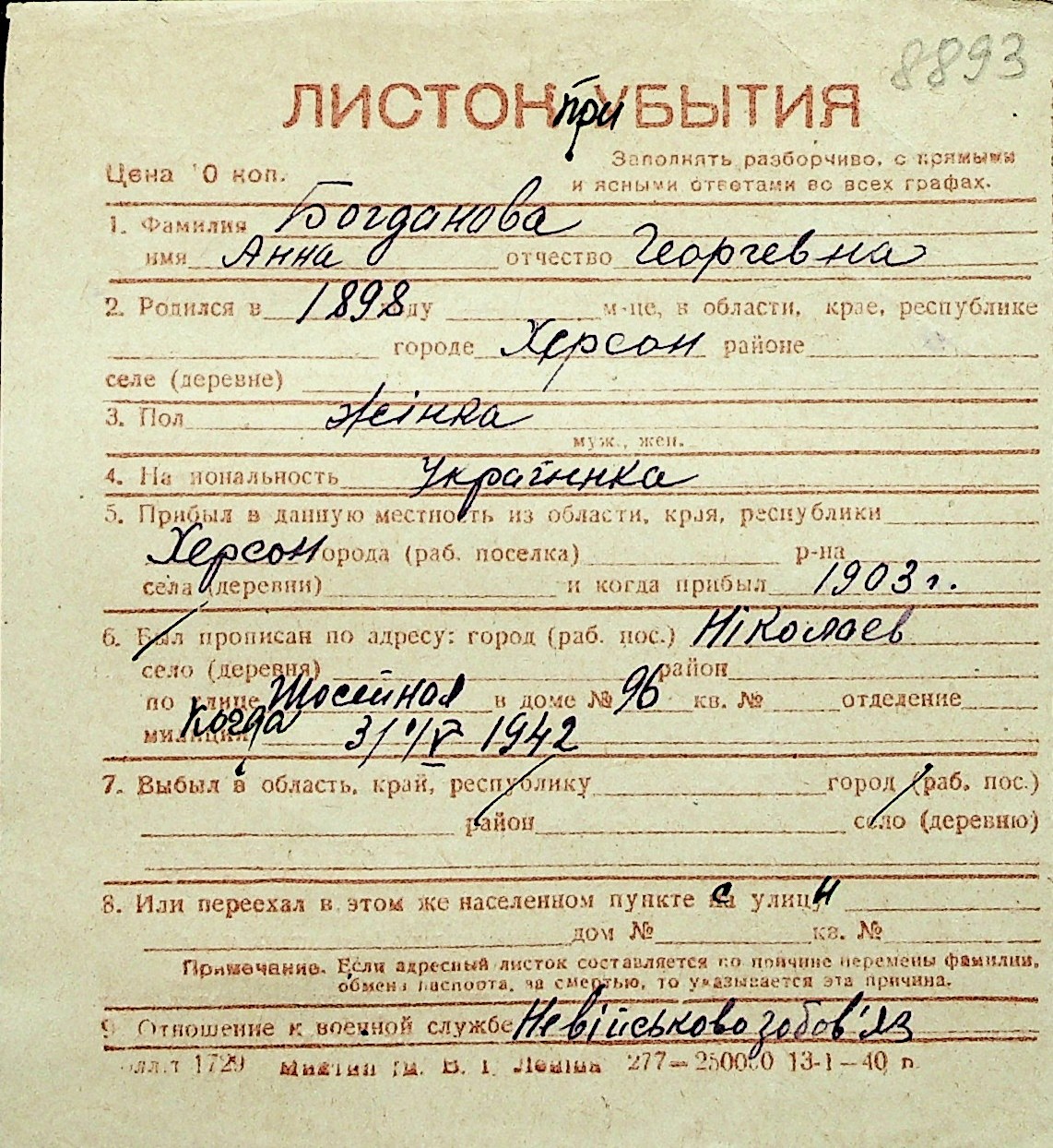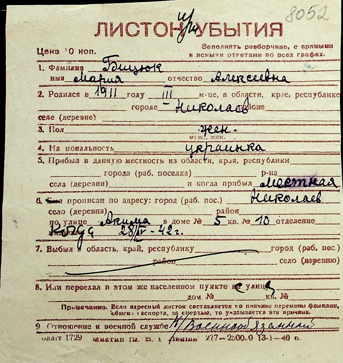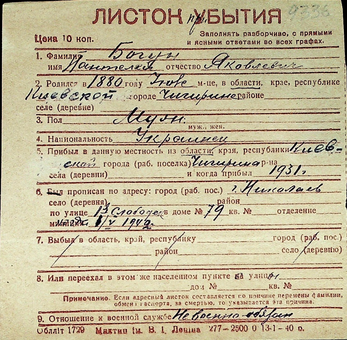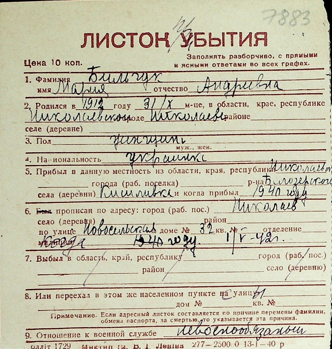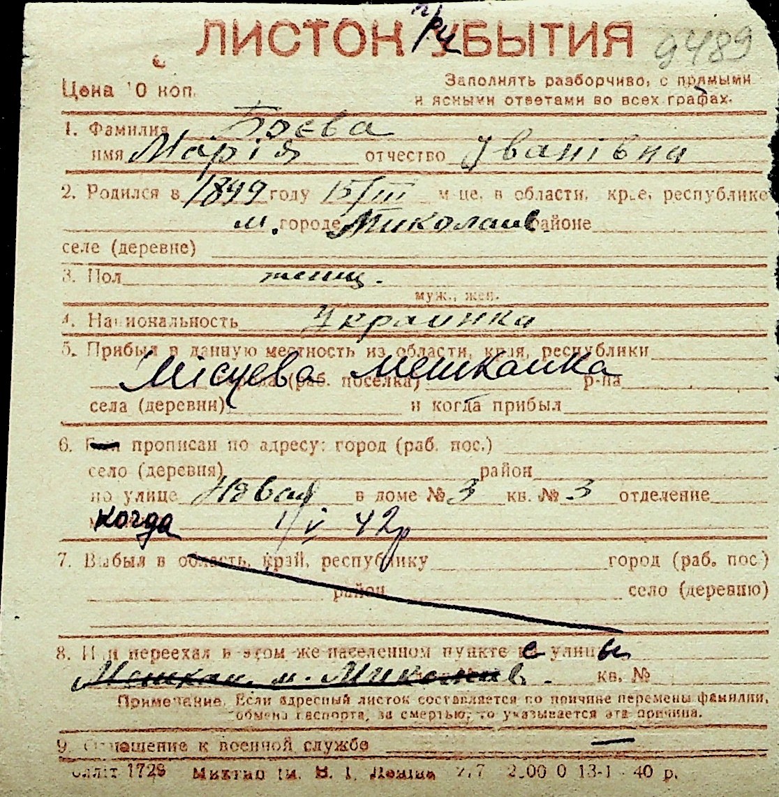 ◦ ◦ Перелік карток на осіб, які мешкали у м. Миколаїв у період окупації 1941–1944 років