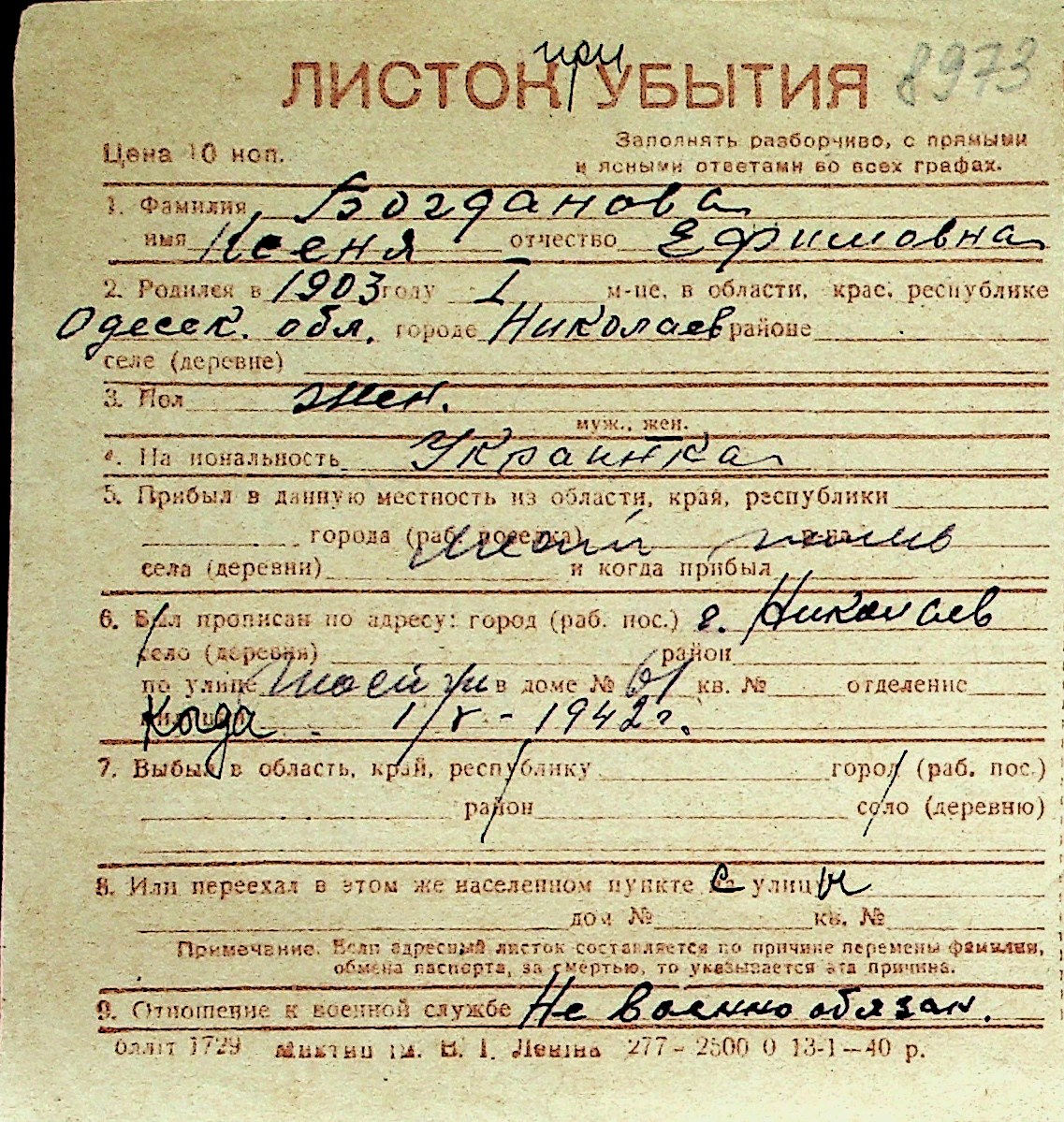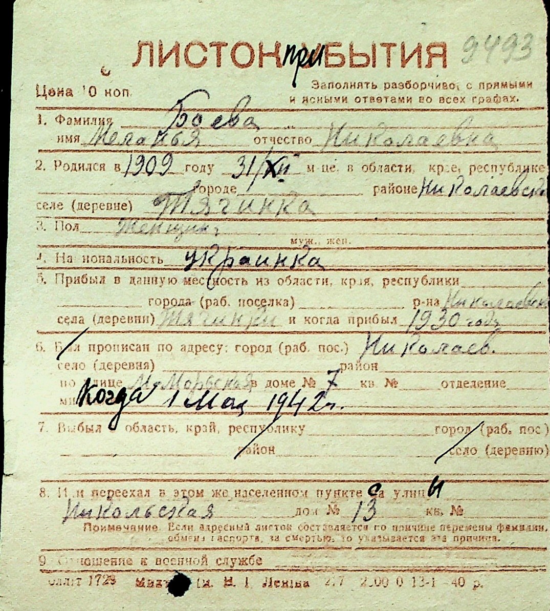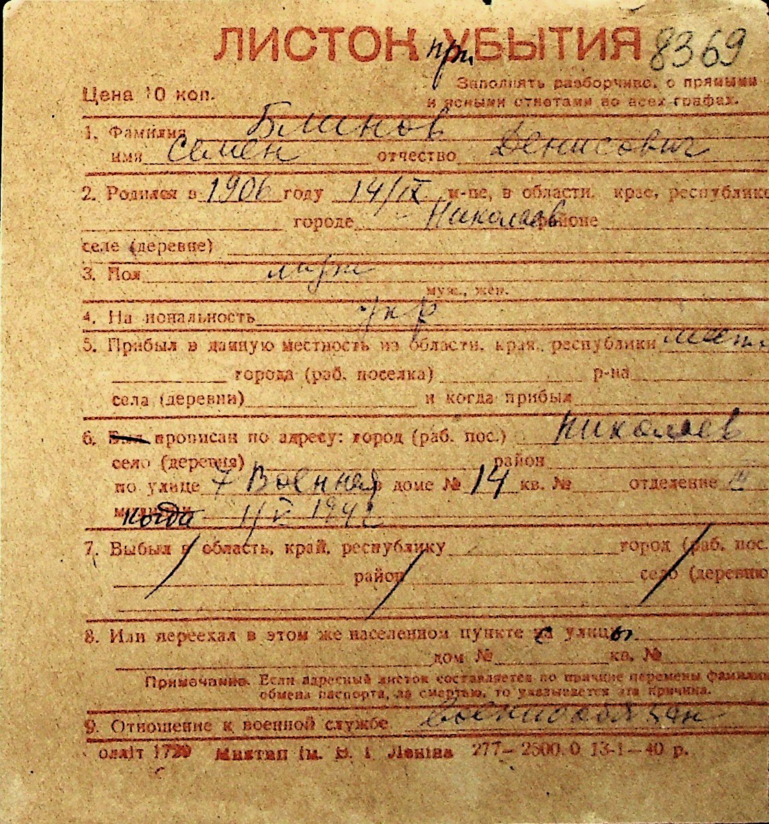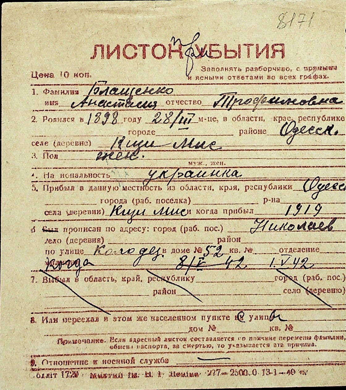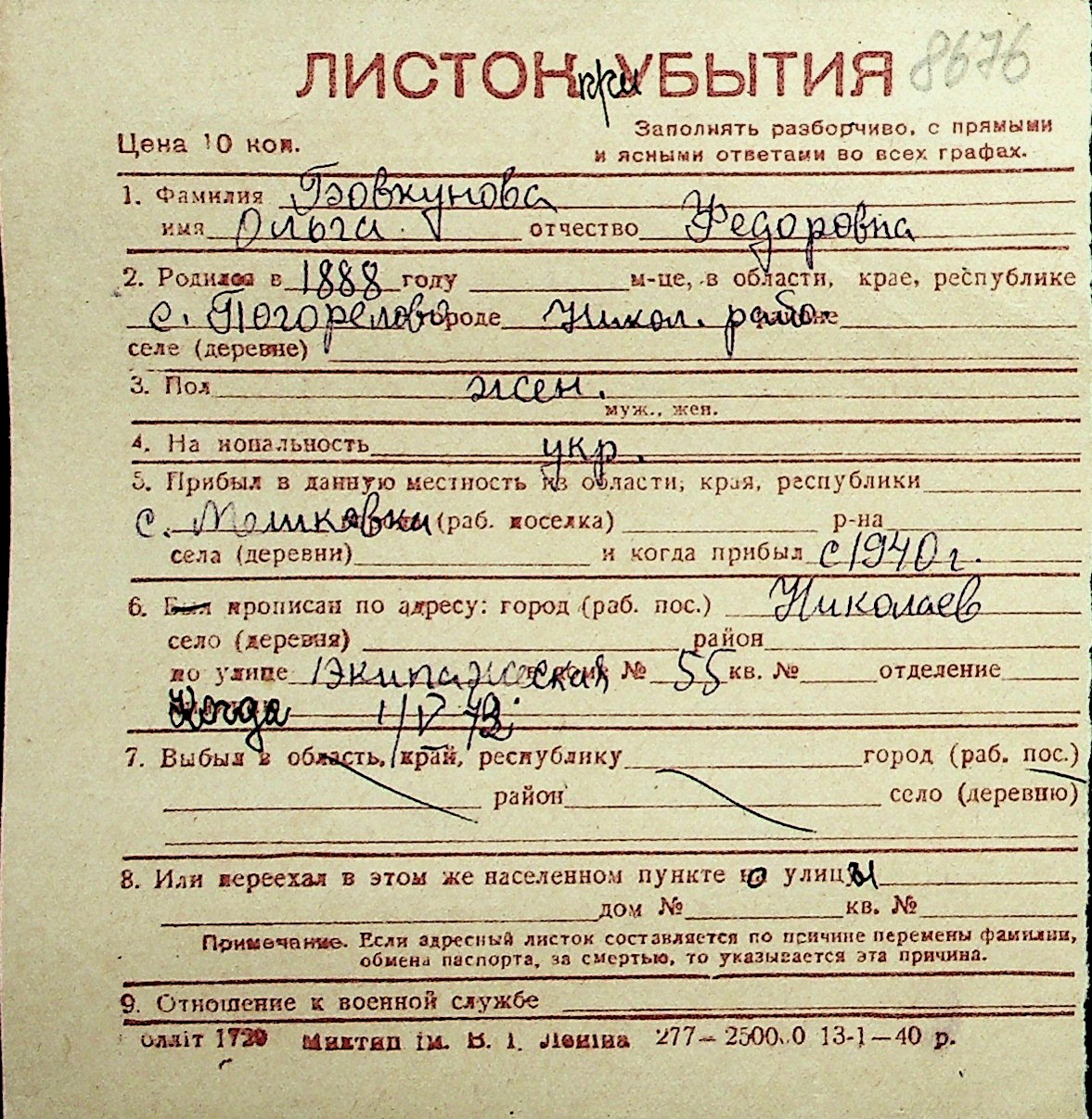 ◦ ◦ Перелік карток на осіб, які мешкали у м. Миколаїв у період окупації 1941–1944 років